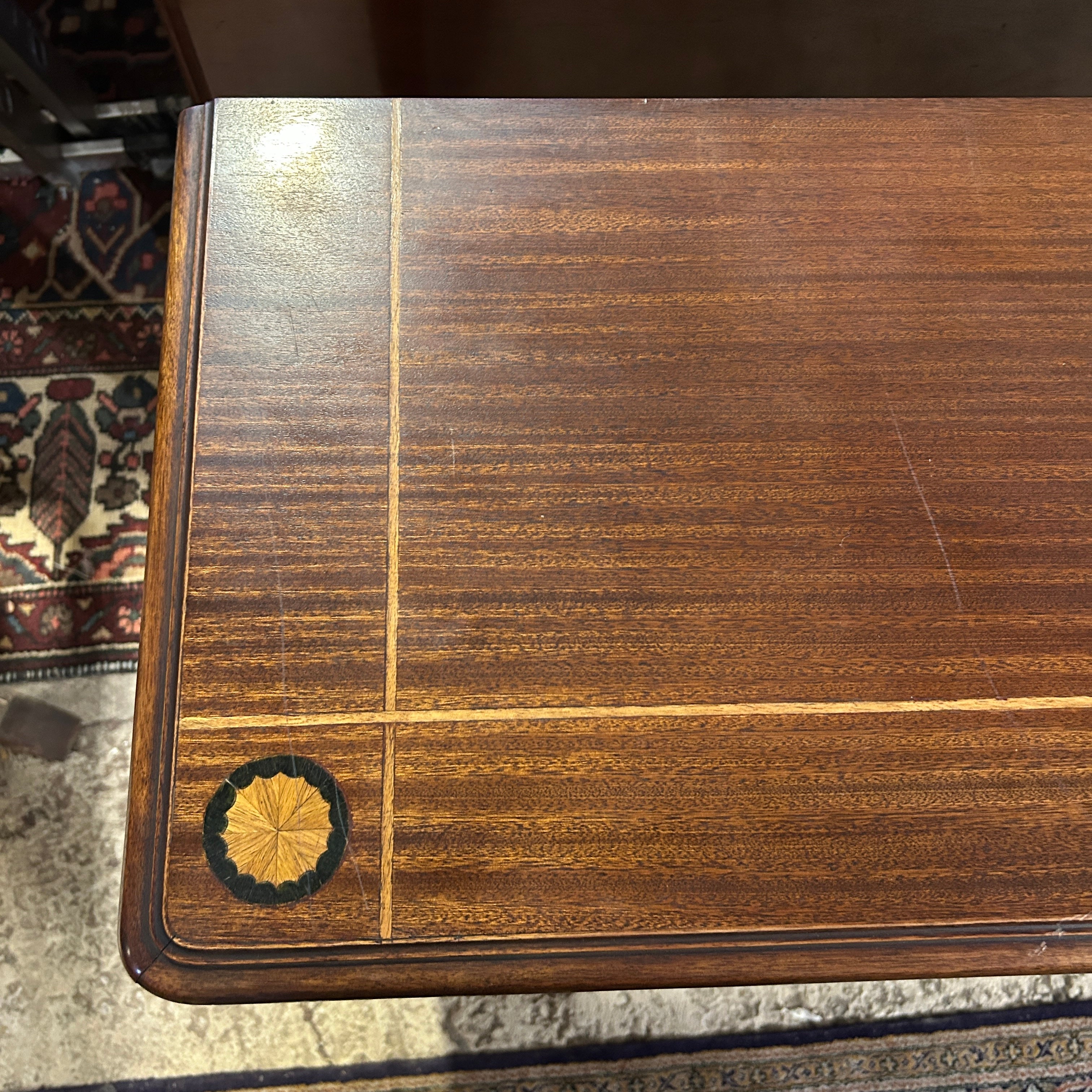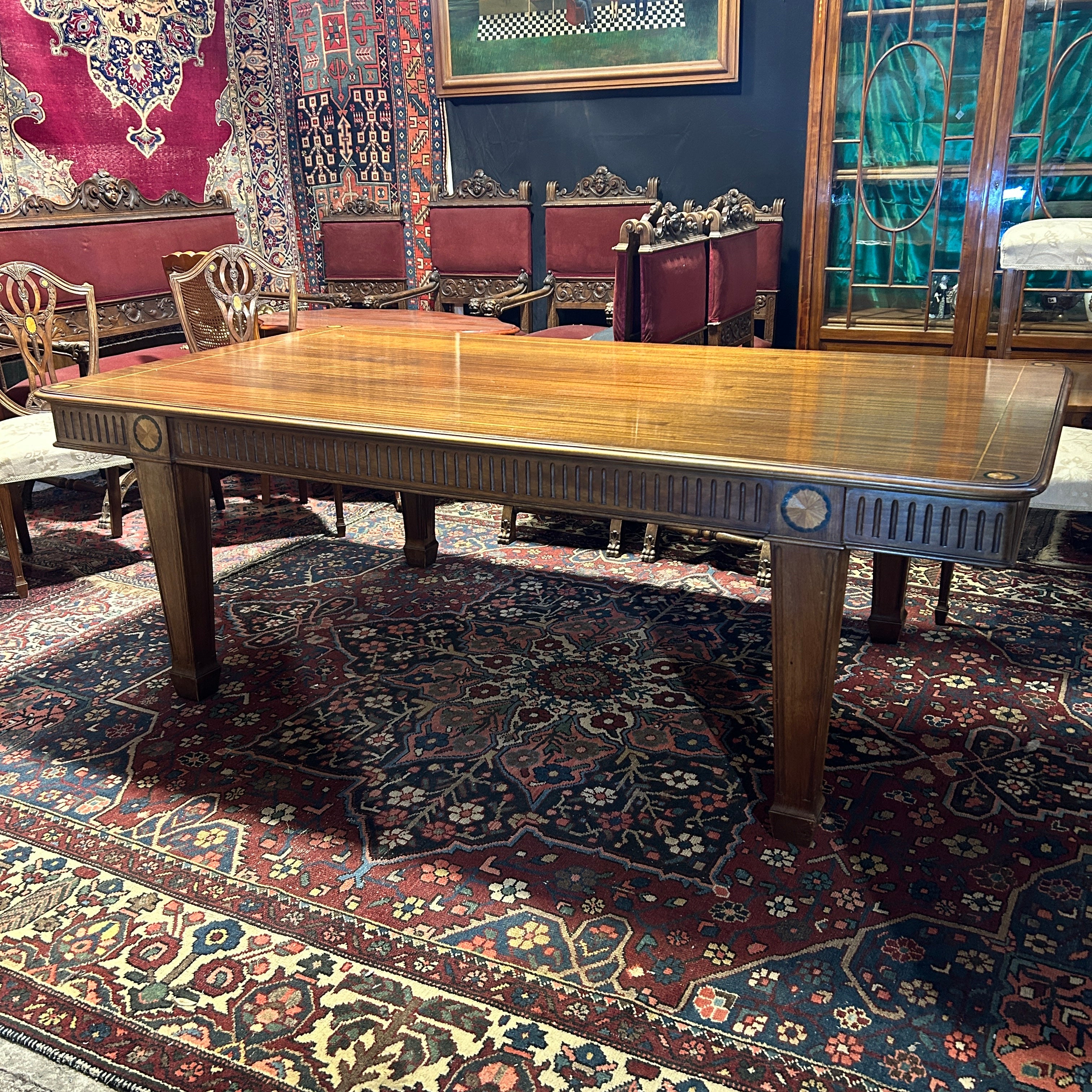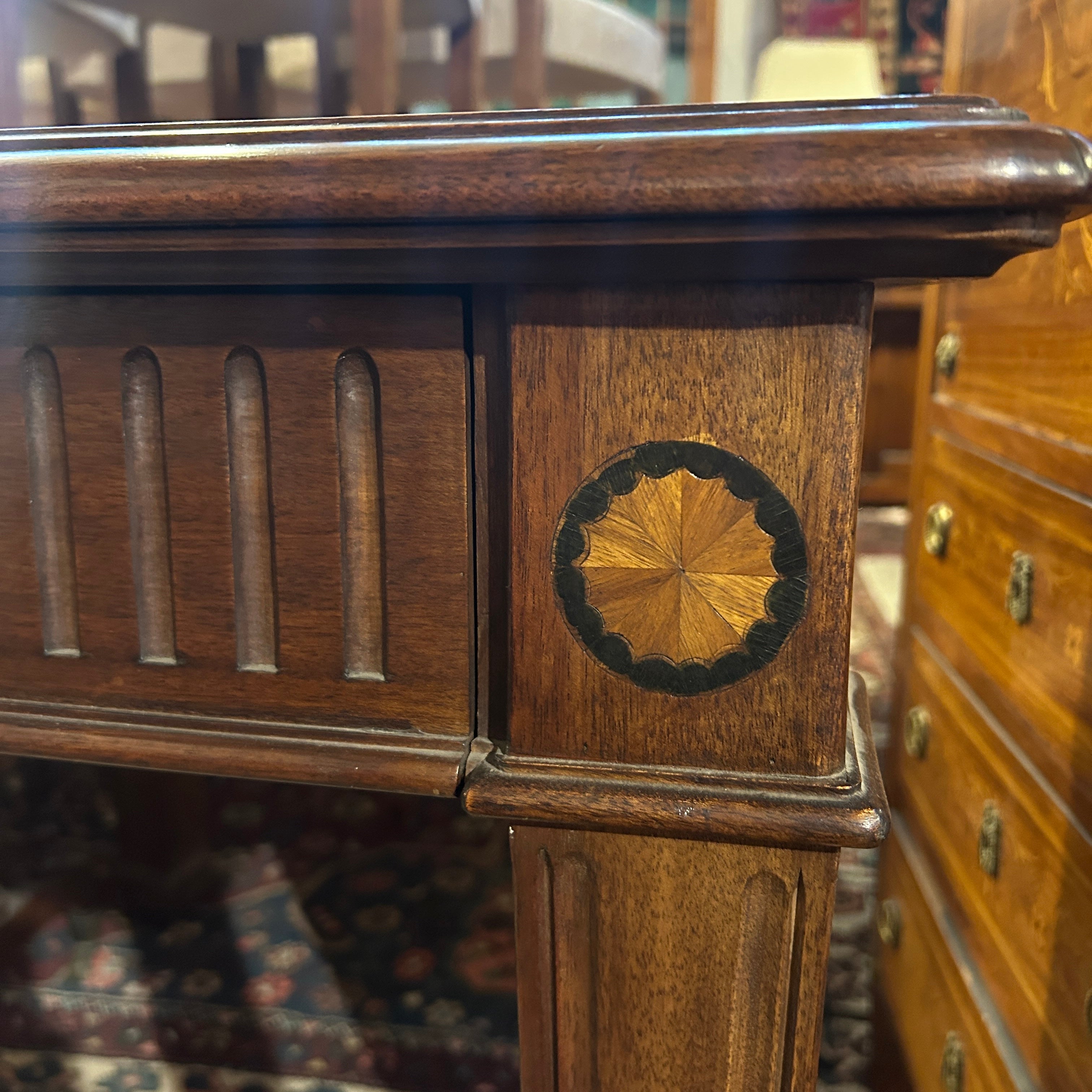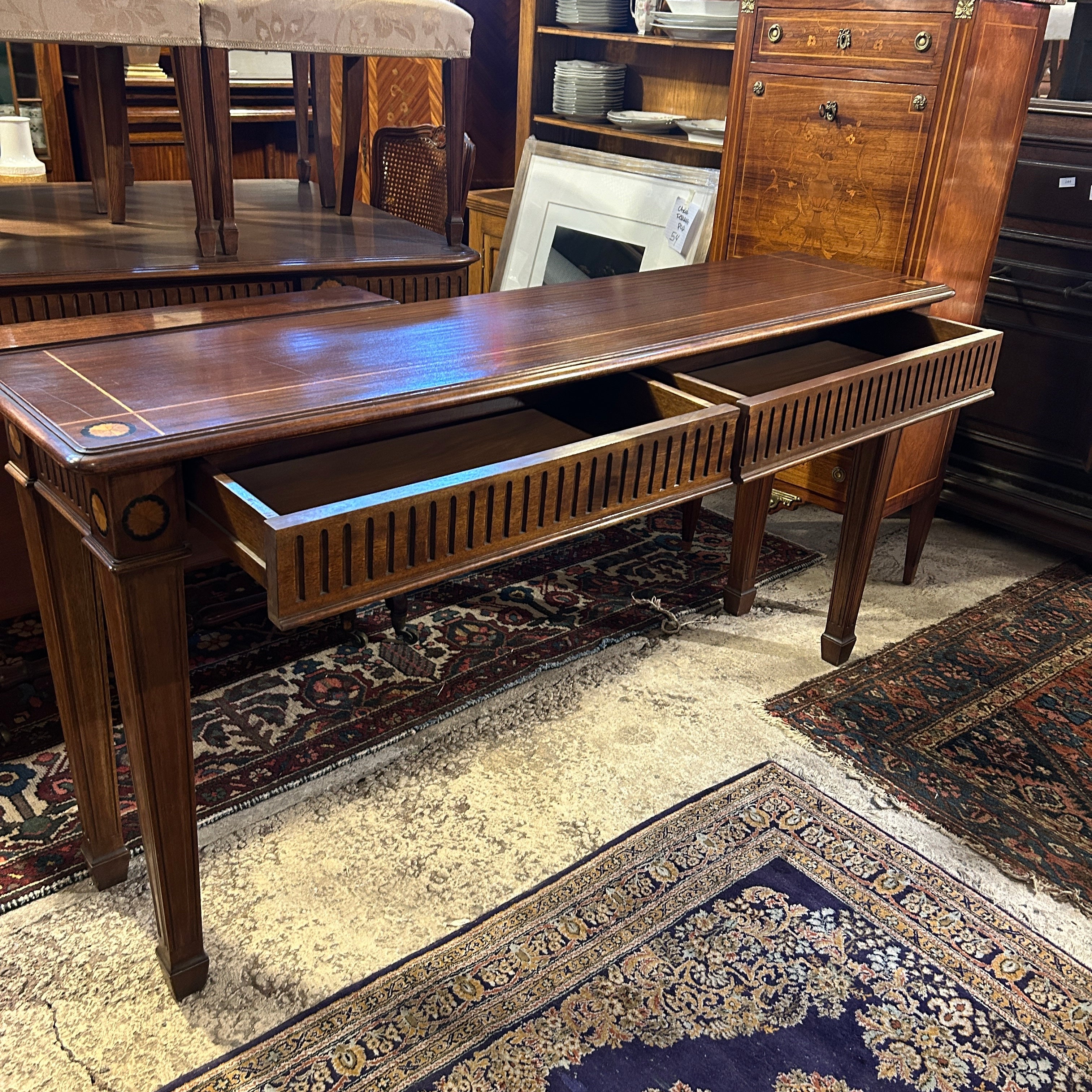 Bello amoblado compuesto de amplia mesa de comedor estilo inglés, Hepplwhite, en caoba rubia satinada, barniz original, con filetes y marqueteria, tallado a mano. Trae ocho sillas con respaldo tallado y asiento tapizado en tono crudo y motivos florales y además una mesa arrimo estilo inglés, Hepplwhite, en caoba satinada con dos amplios cajones.