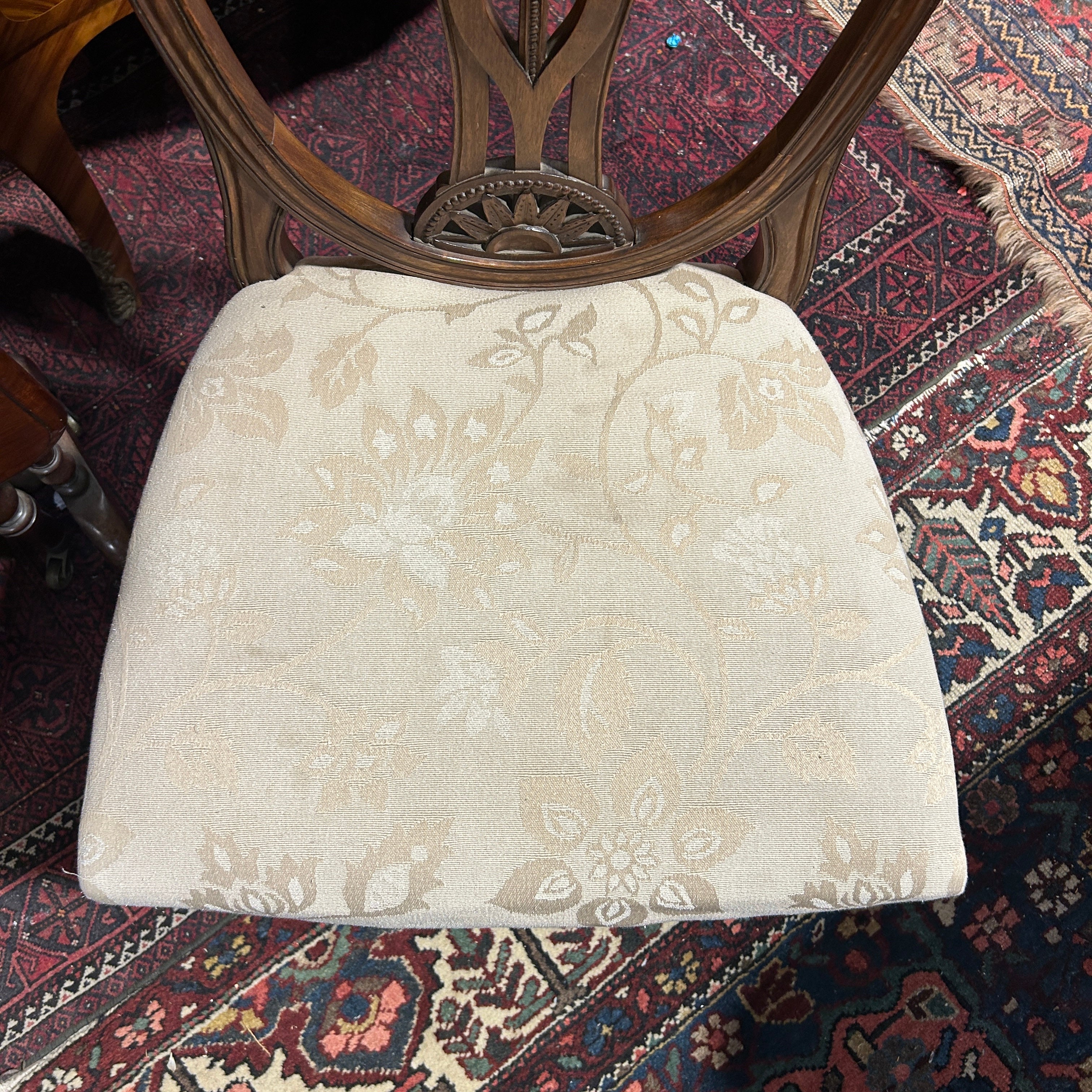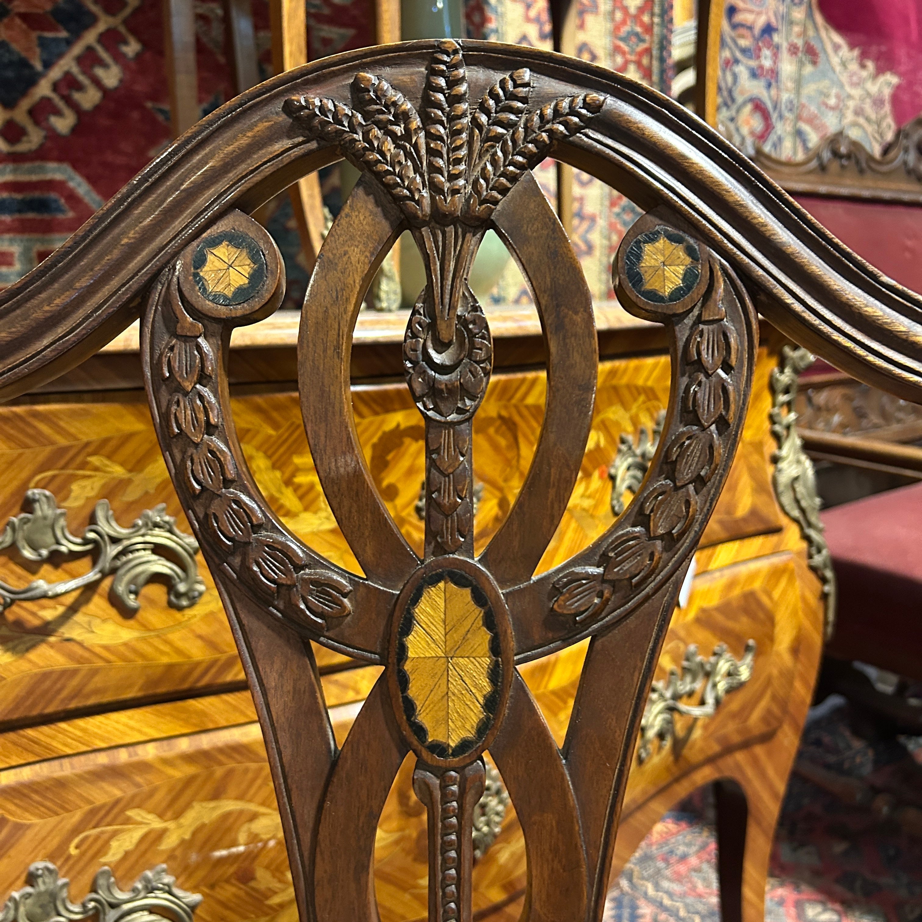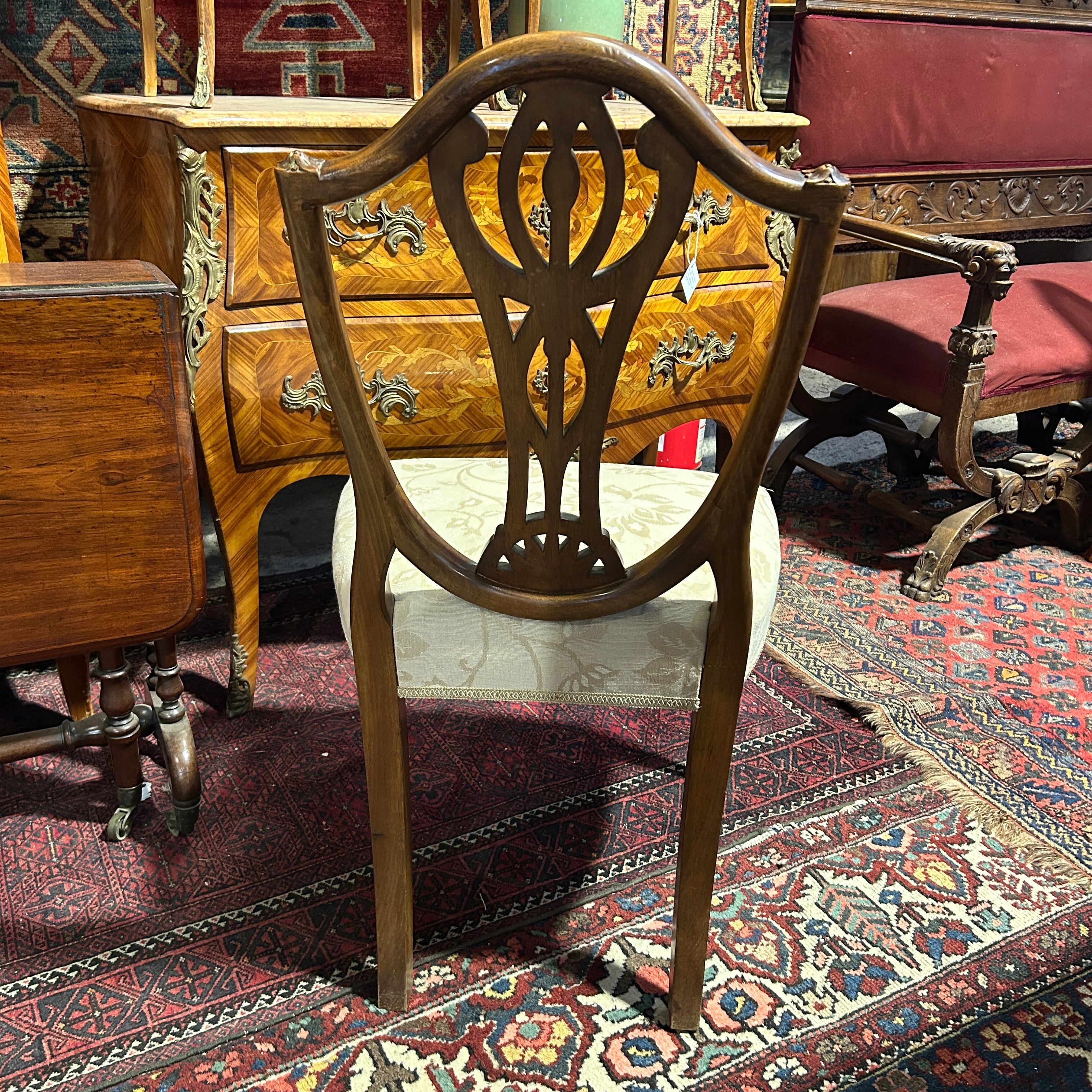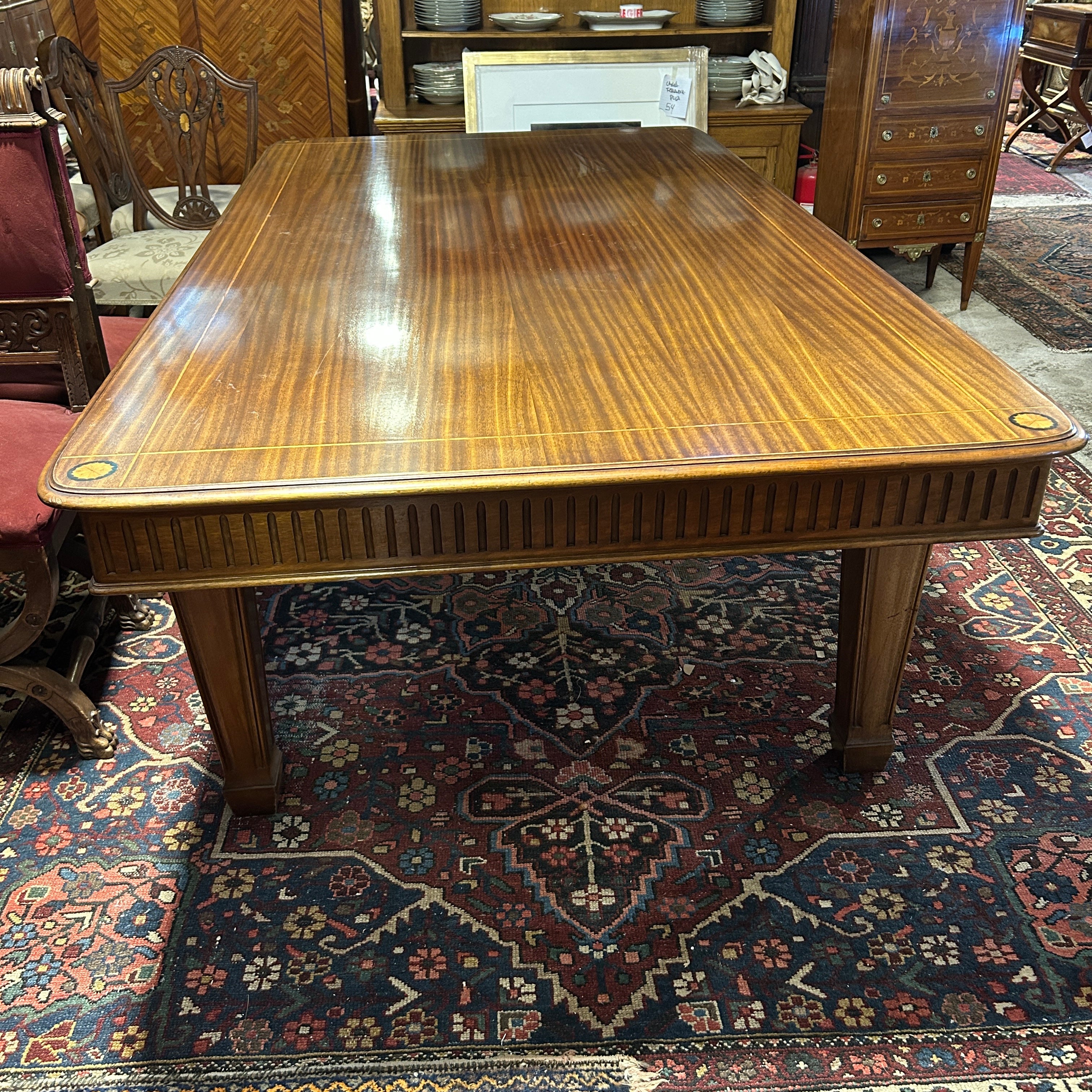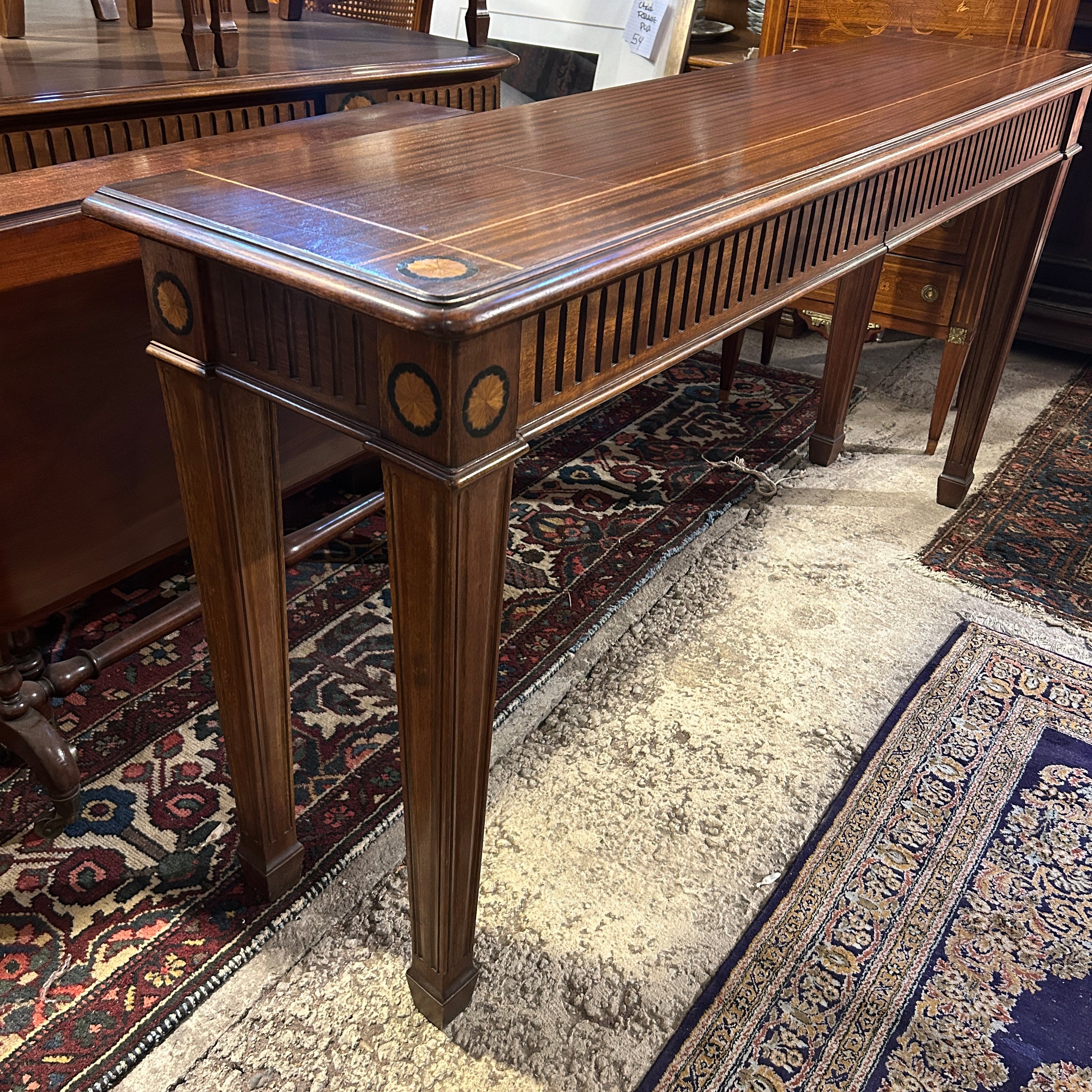 Bello amoblado compuesto de amplia mesa de comedor estilo inglés, Hepplwhite, en caoba rubia satinada, barniz original, con filetes y marqueteria, tallado a mano. Trae ocho sillas con respaldo tallado y asiento tapizado en tono crudo y motivos florales y además una mesa arrimo estilo inglés, Hepplwhite, en caoba satinada con dos amplios cajones.