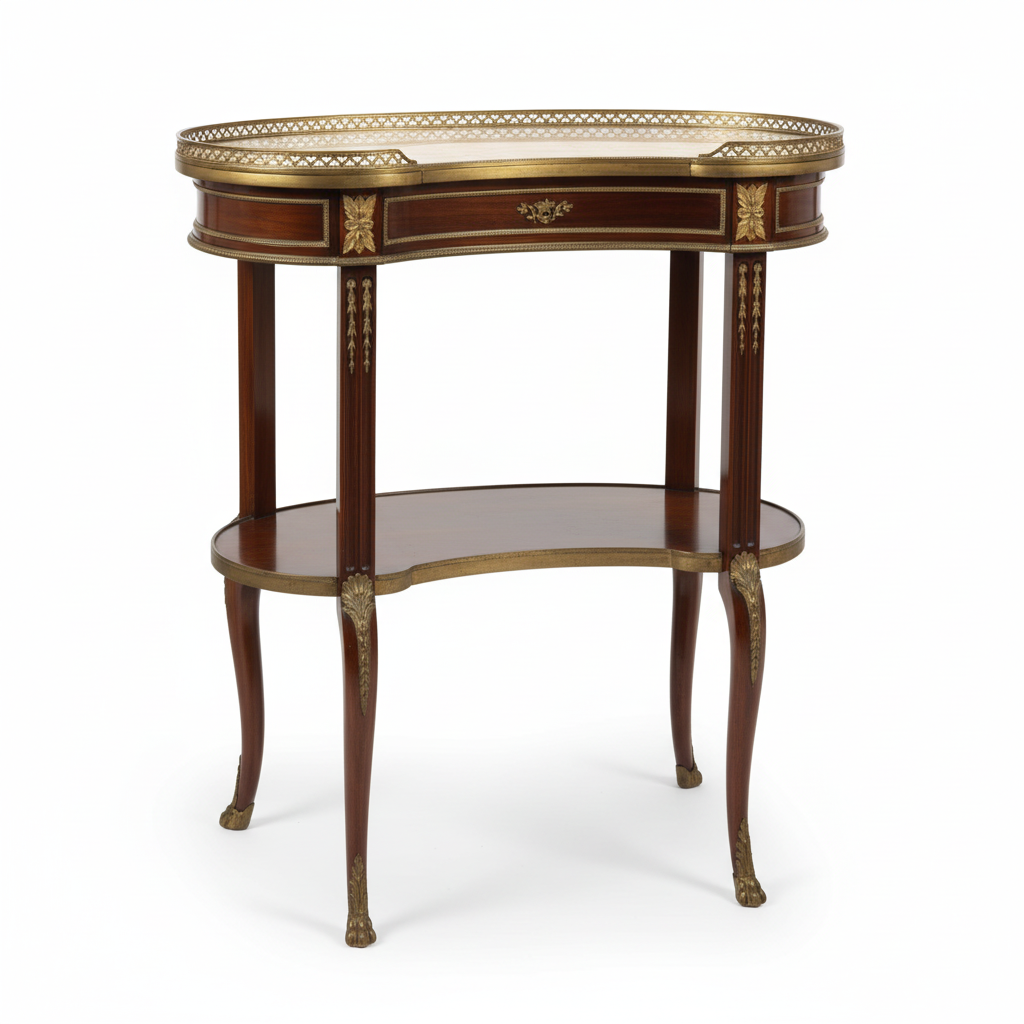 Mesa de salón con tapa de mármol gris Sainte Anne, galería en bronce, ornamentación en bronce dorado; patas curvadas, acanaladas, unidas por entrepaño; un cajón en cintura. Estilo Napoleón III.