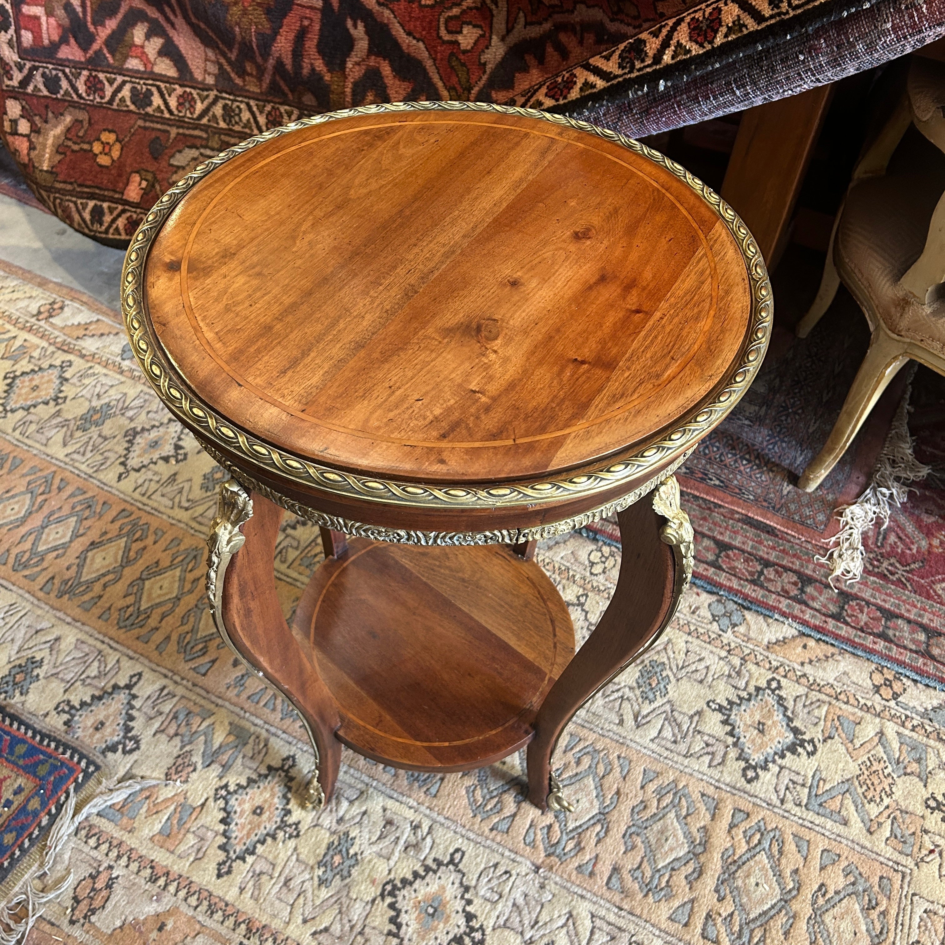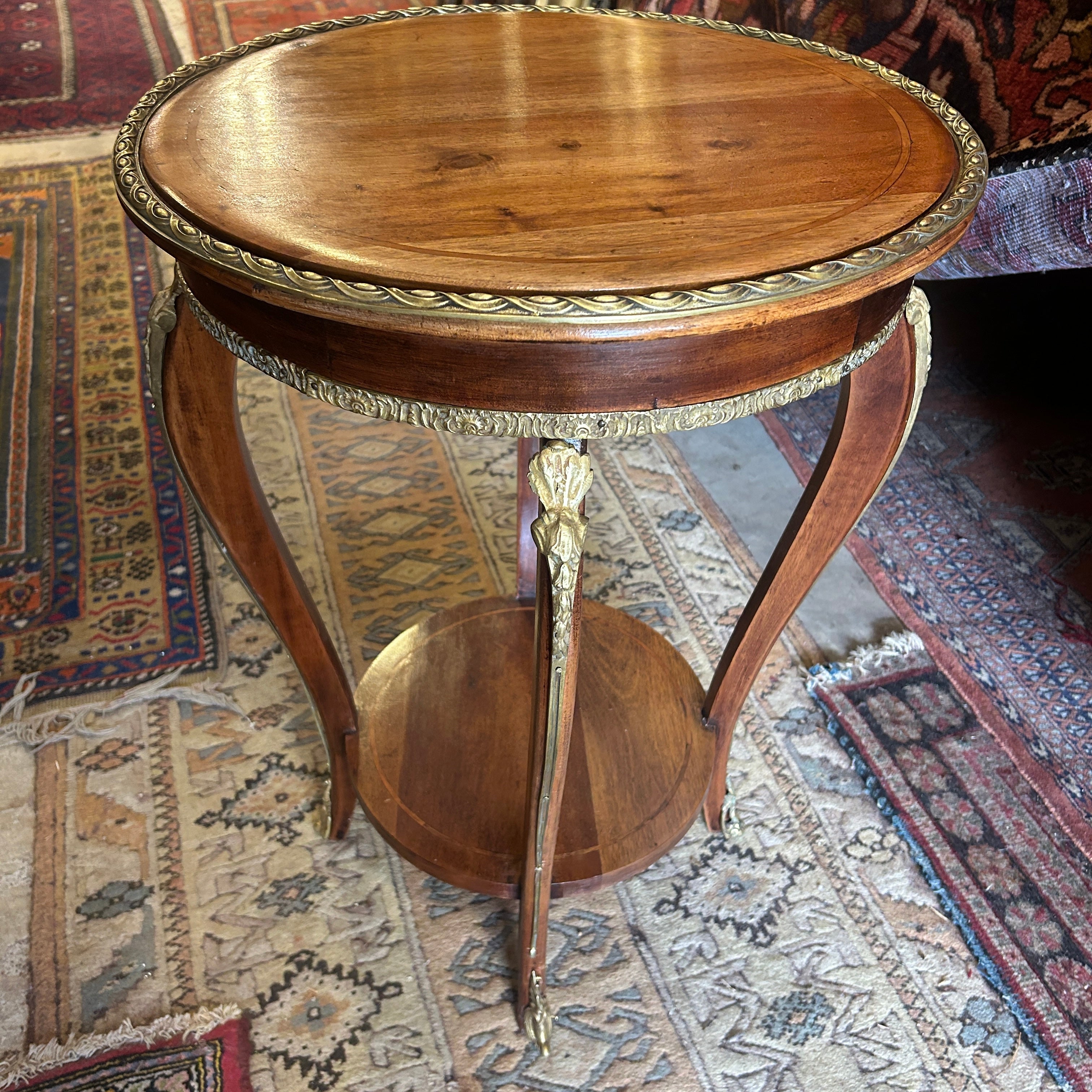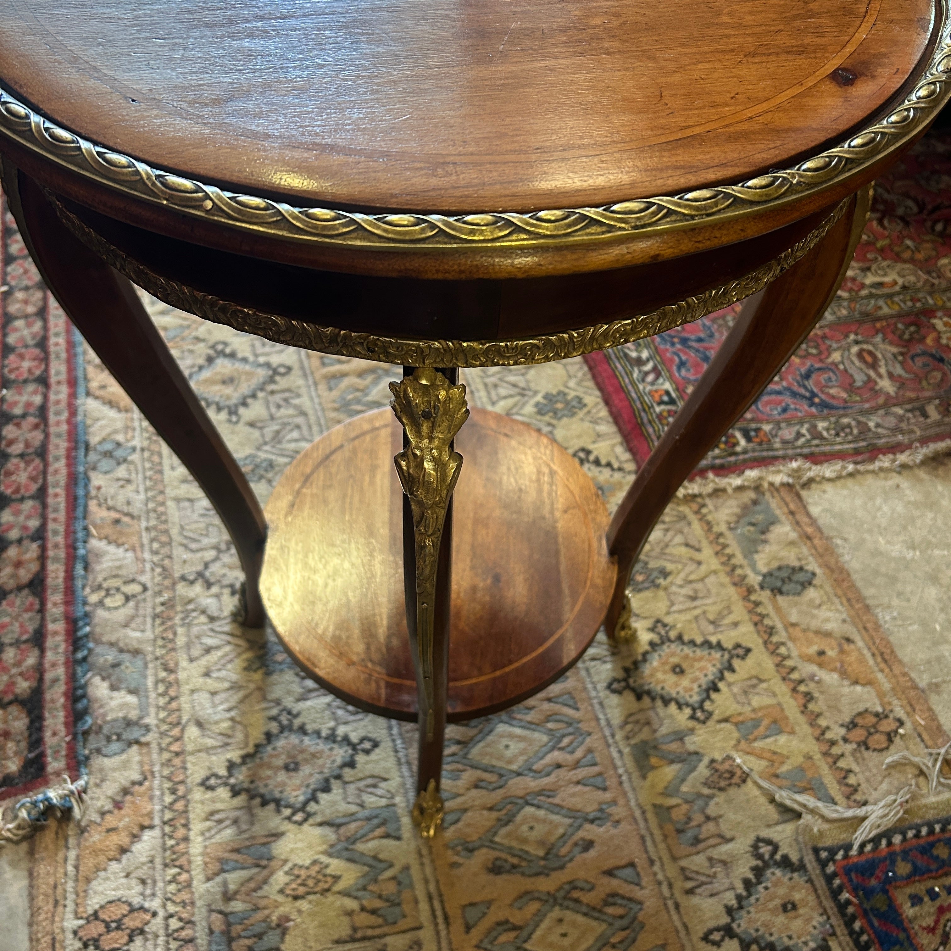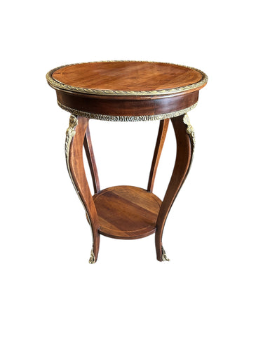 Preciosa mesita lateral gueridón de dos cubiertas con cintillos y aplicaciones de bronce. El cintillo superior es de bronce masiso y los bronces de las patas van hermosamente de pies a cabeza en forma curva.