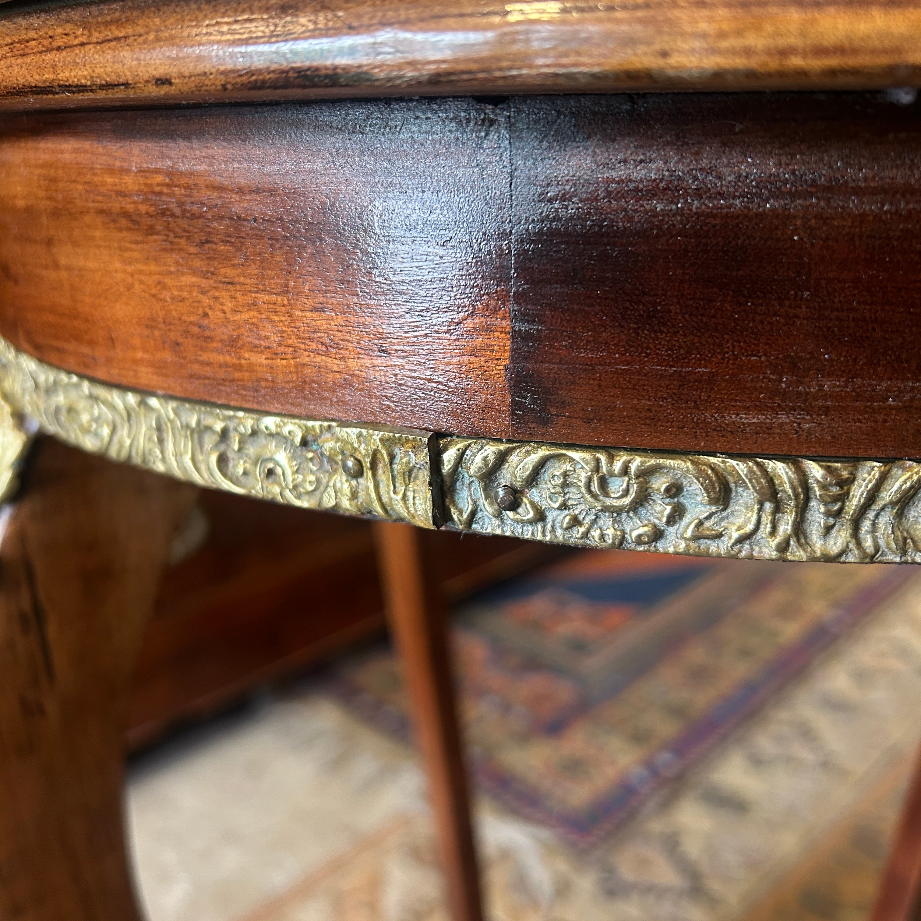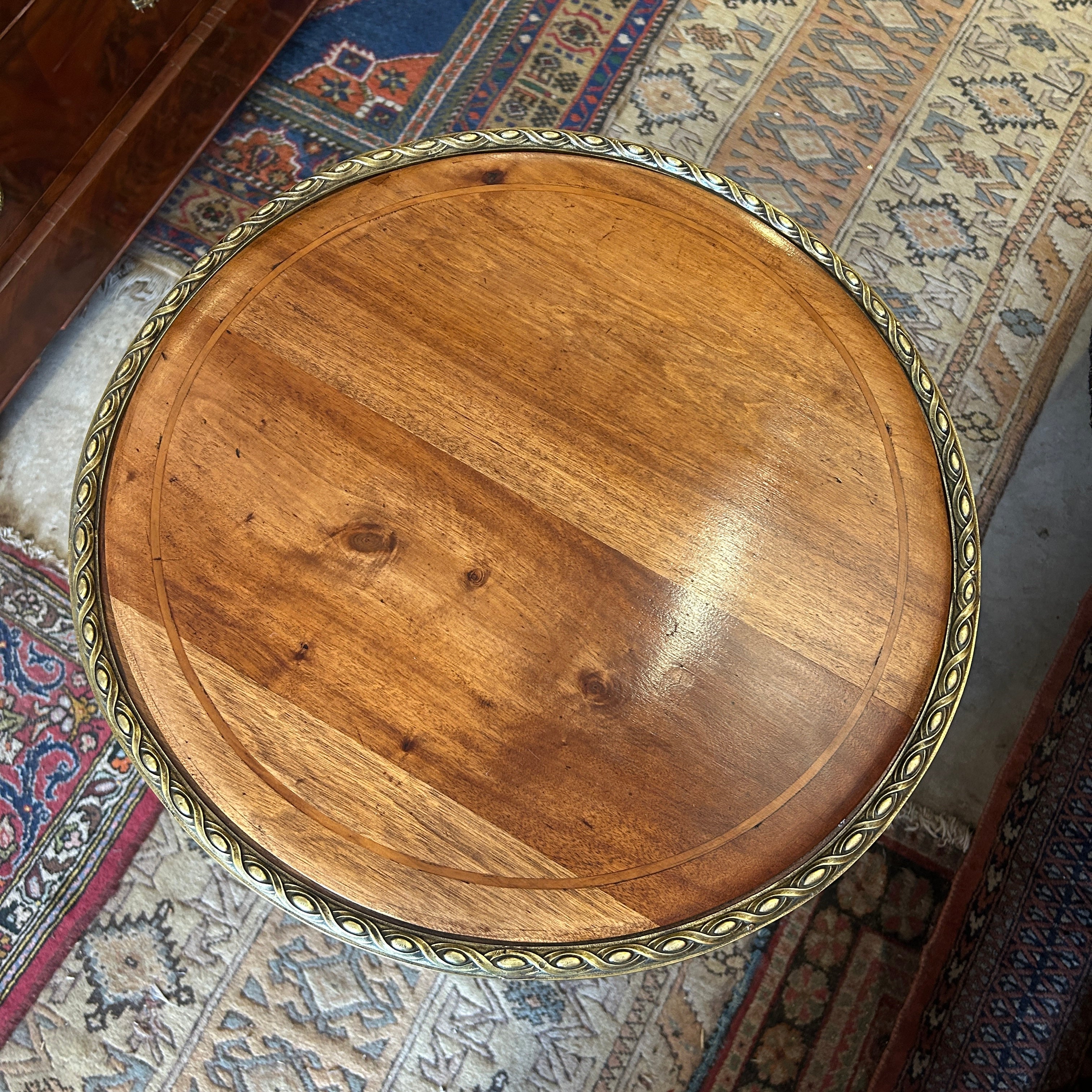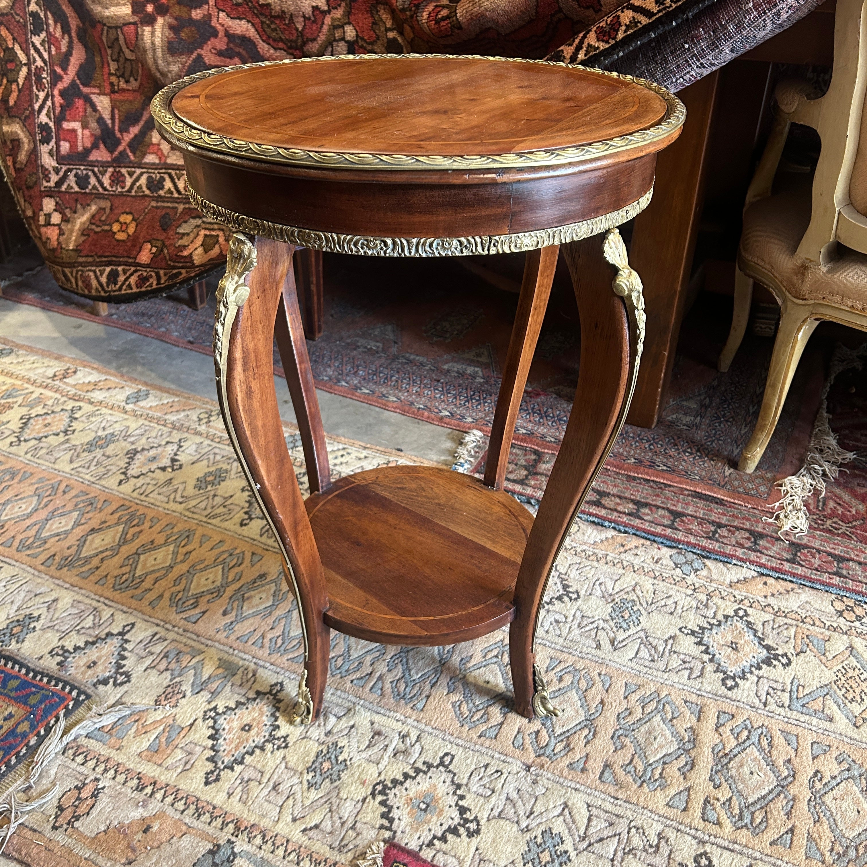 Preciosa mesita lateral gueridón de dos cubiertas con cintillos y aplicaciones de bronce. El cintillo superior es de bronce masiso y los bronces de las patas van hermosamente de pies a cabeza en forma curva.