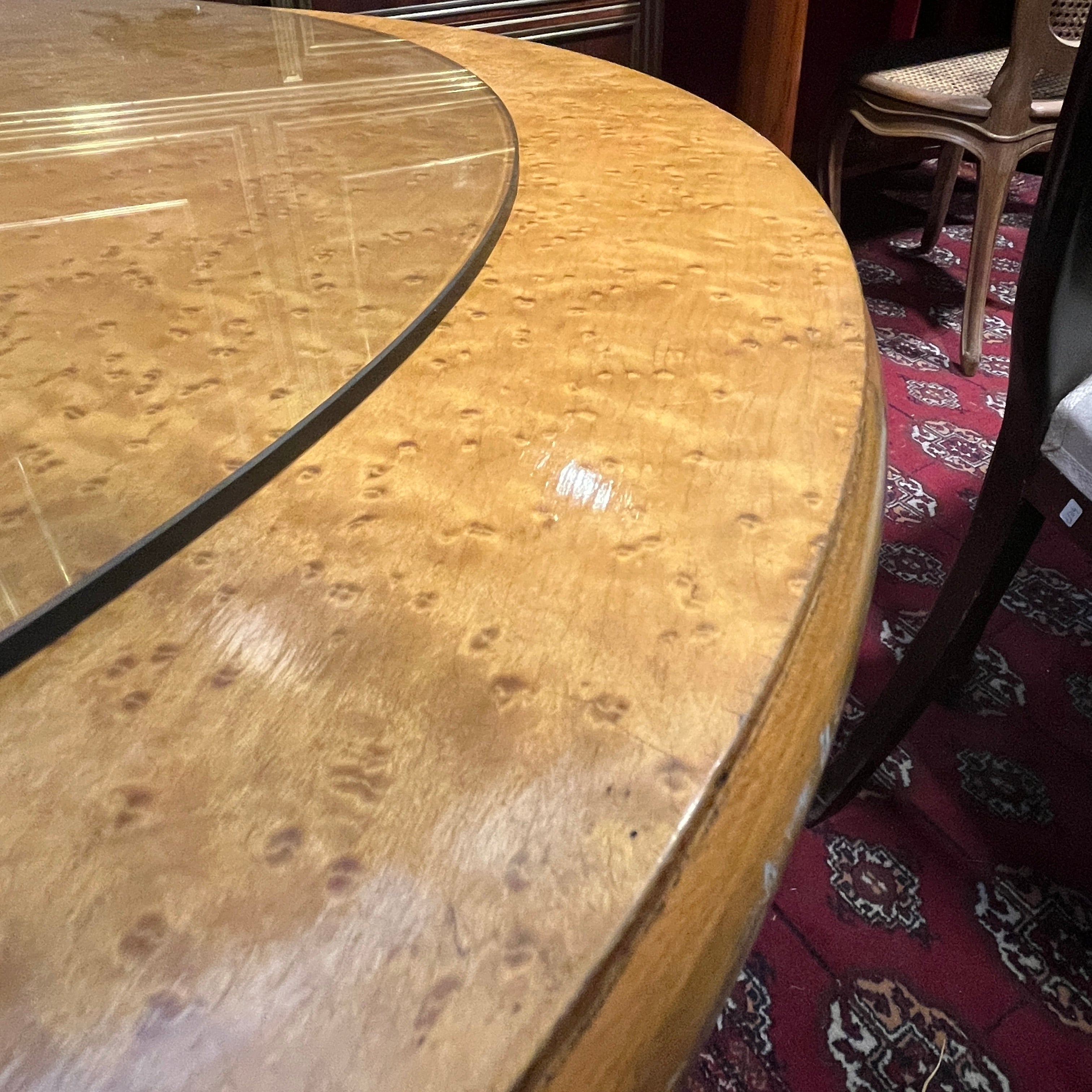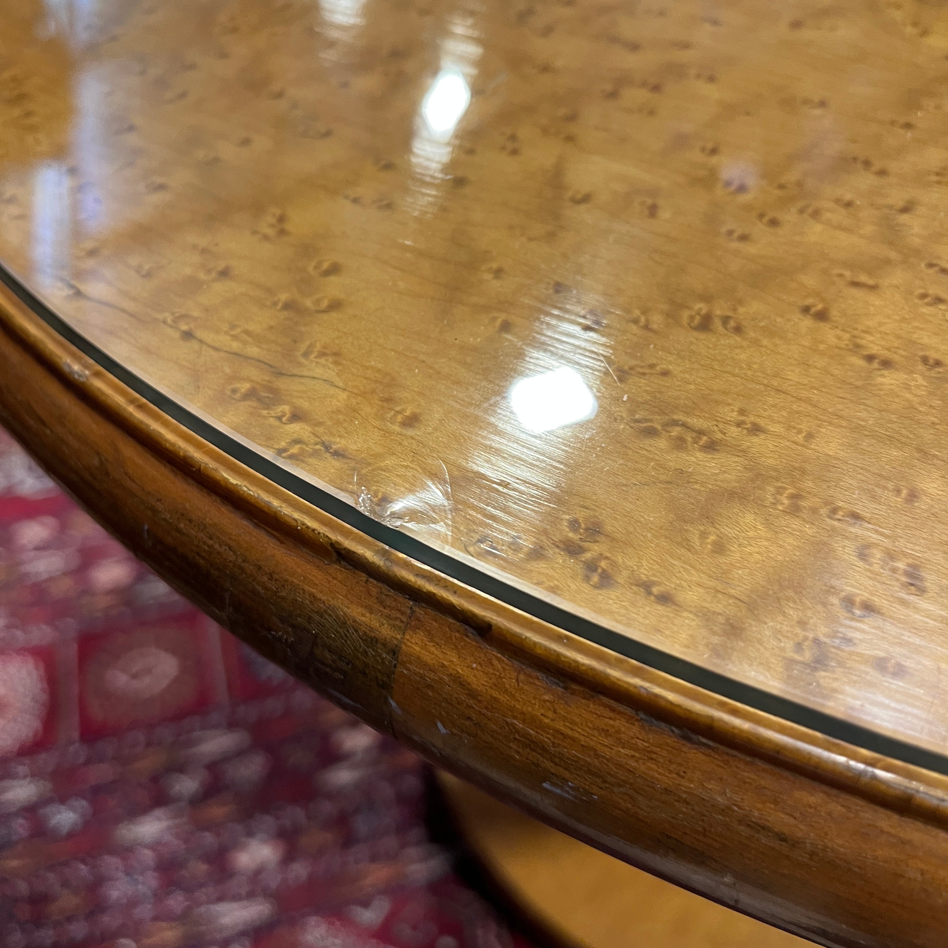 Bella mesa de pedestal francesa estilo Art Deco, en madera Lupe D'Avoine con cubierta de vidrio cortado a la medida de la mesa.