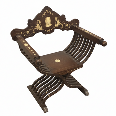 Sitial español en madera marqueteada con una cabeza de Savonarola en hueso.