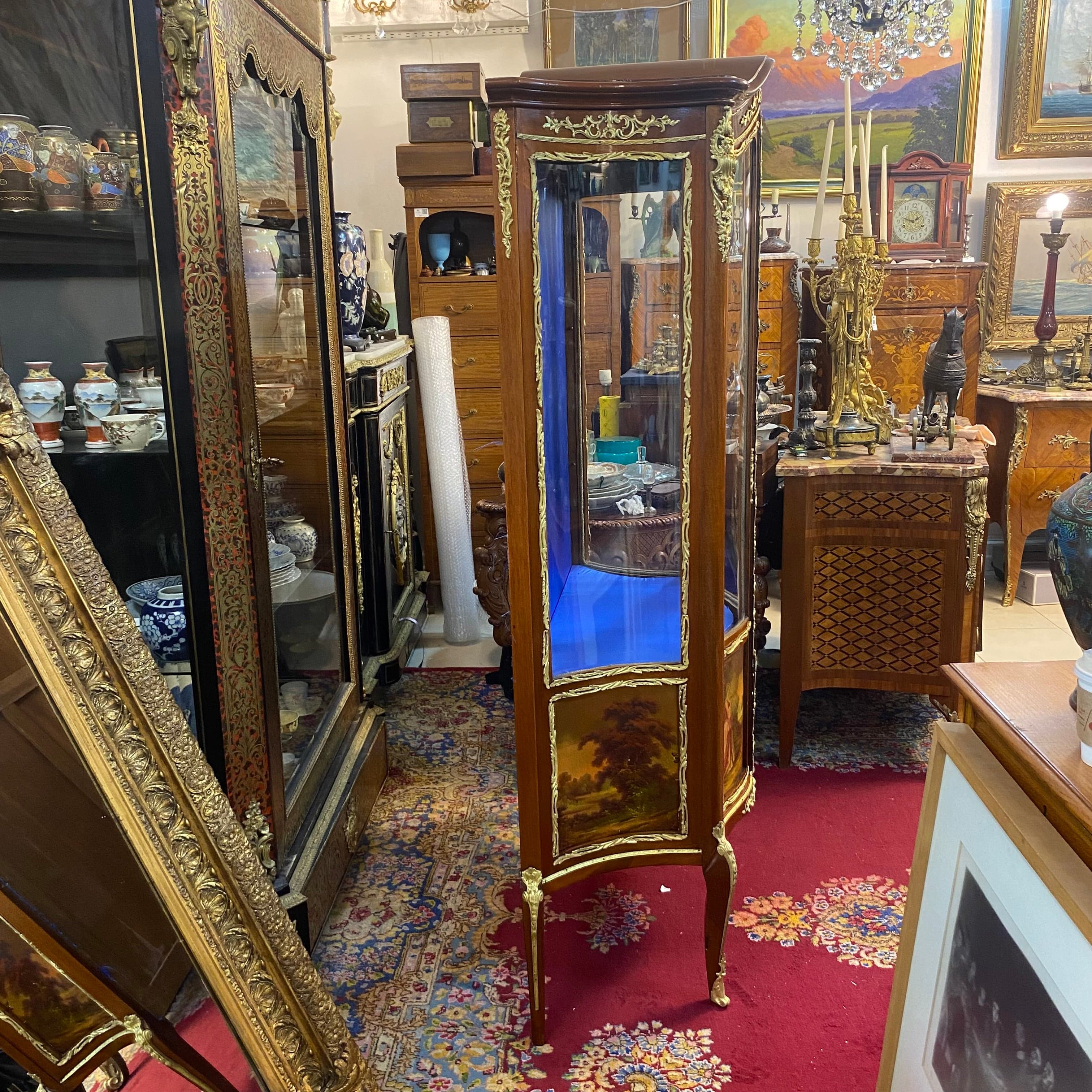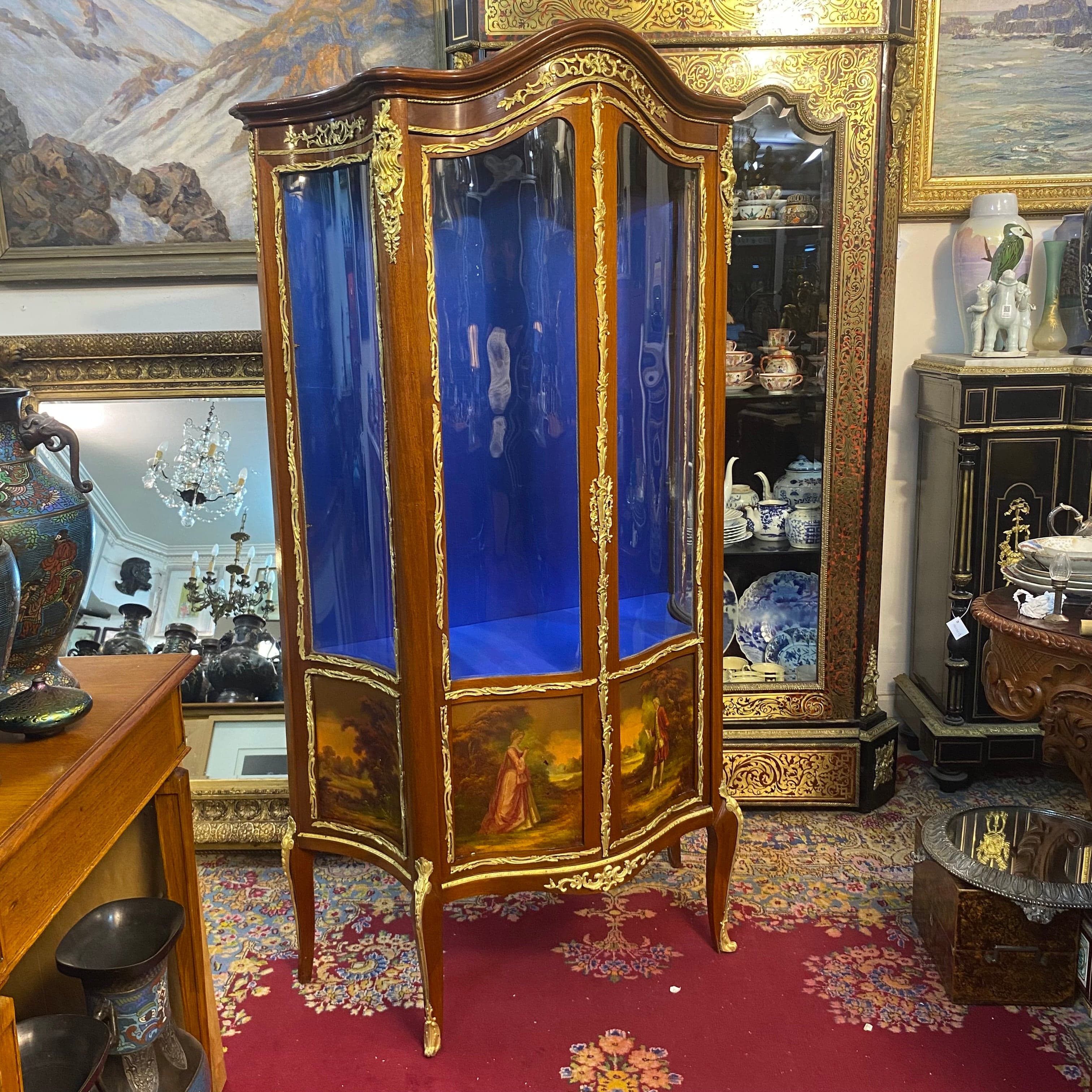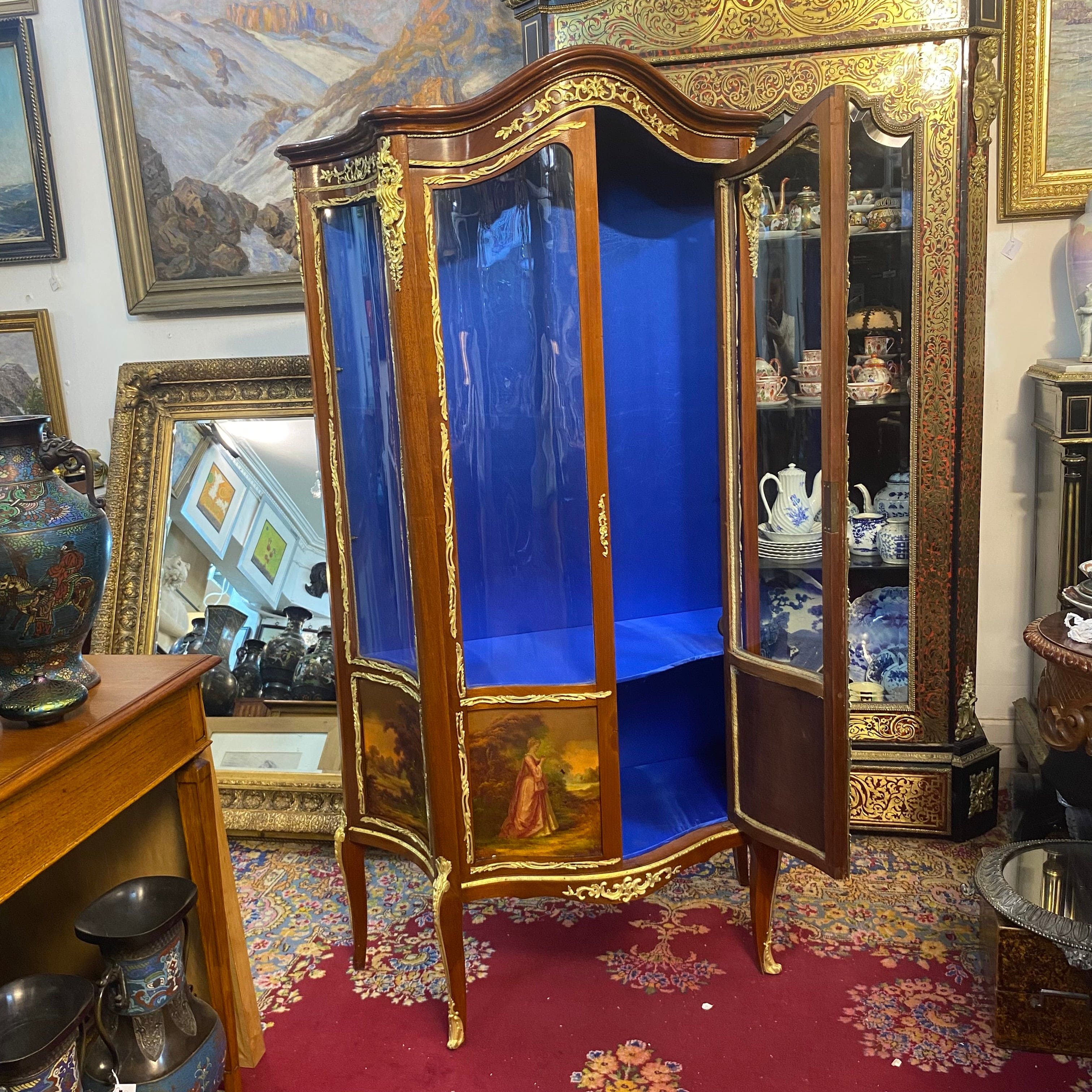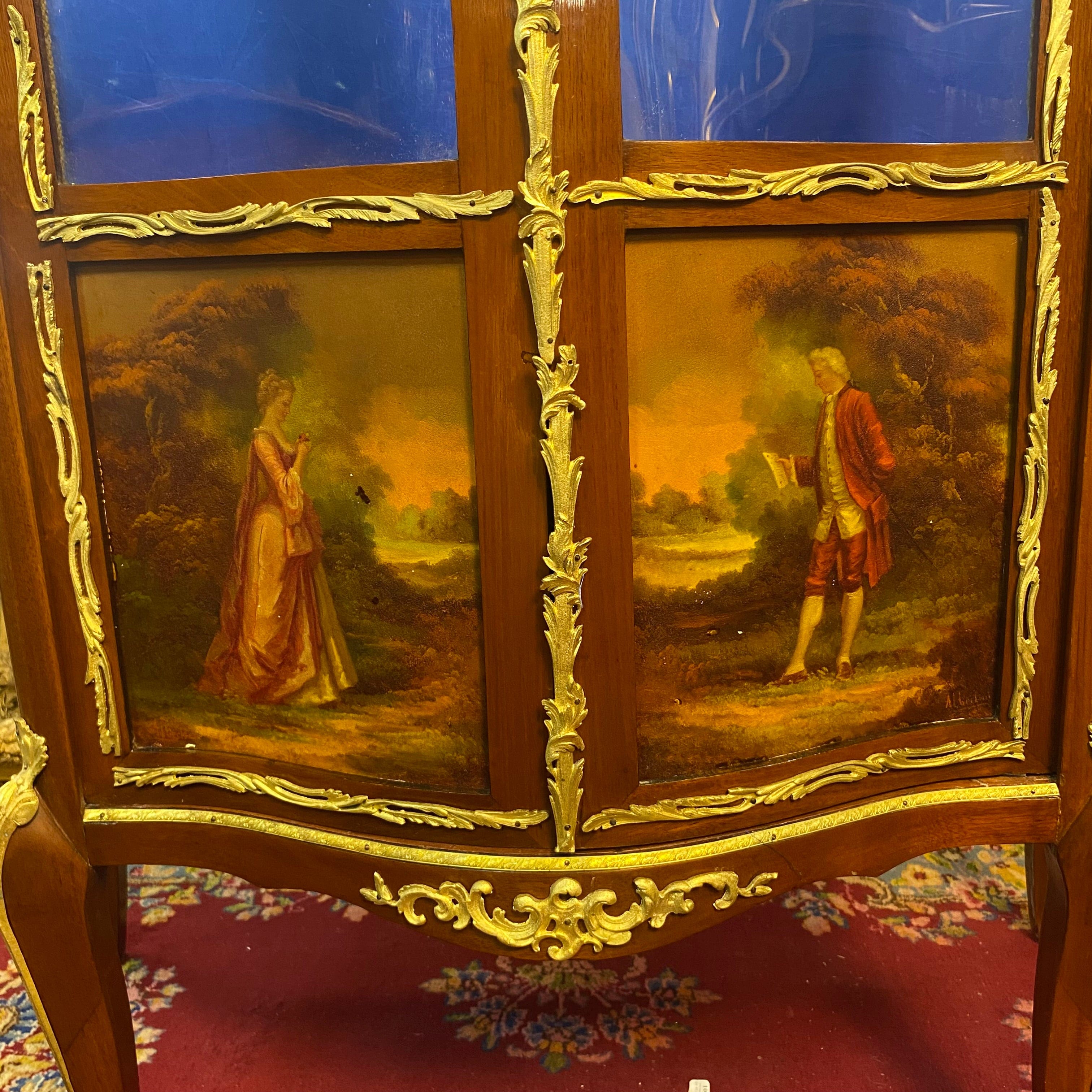 Hermosa vitrina francesa, estilo Vernis Martin en madera caoba y aplicaciones de bronce. Acondicionada con tres repisas, forrada de género azul en su interior y con verdaderos cuadros en óleo en su diseño, una pareja en su puerta principal y árboles en ambos costados. Francia, 1920s.
