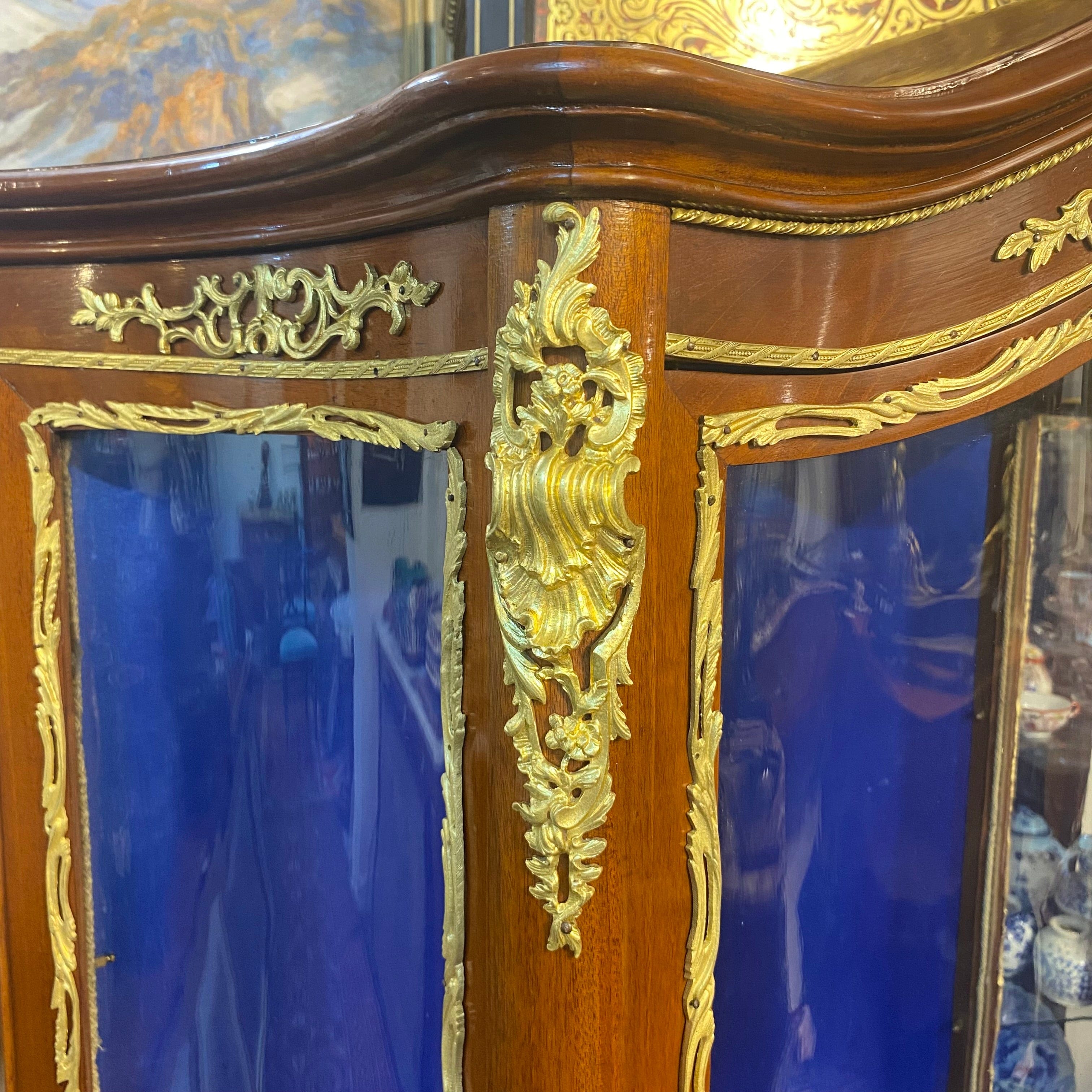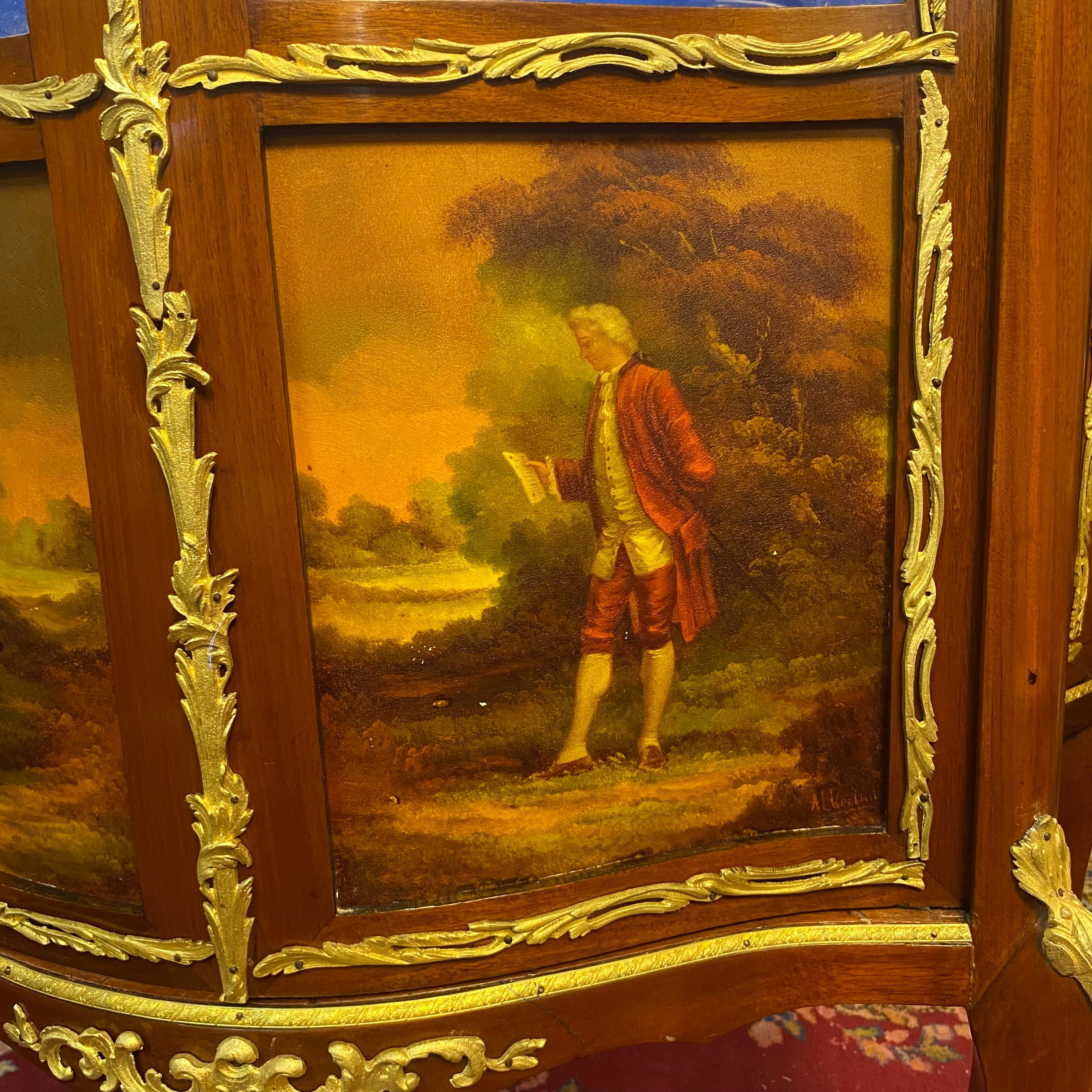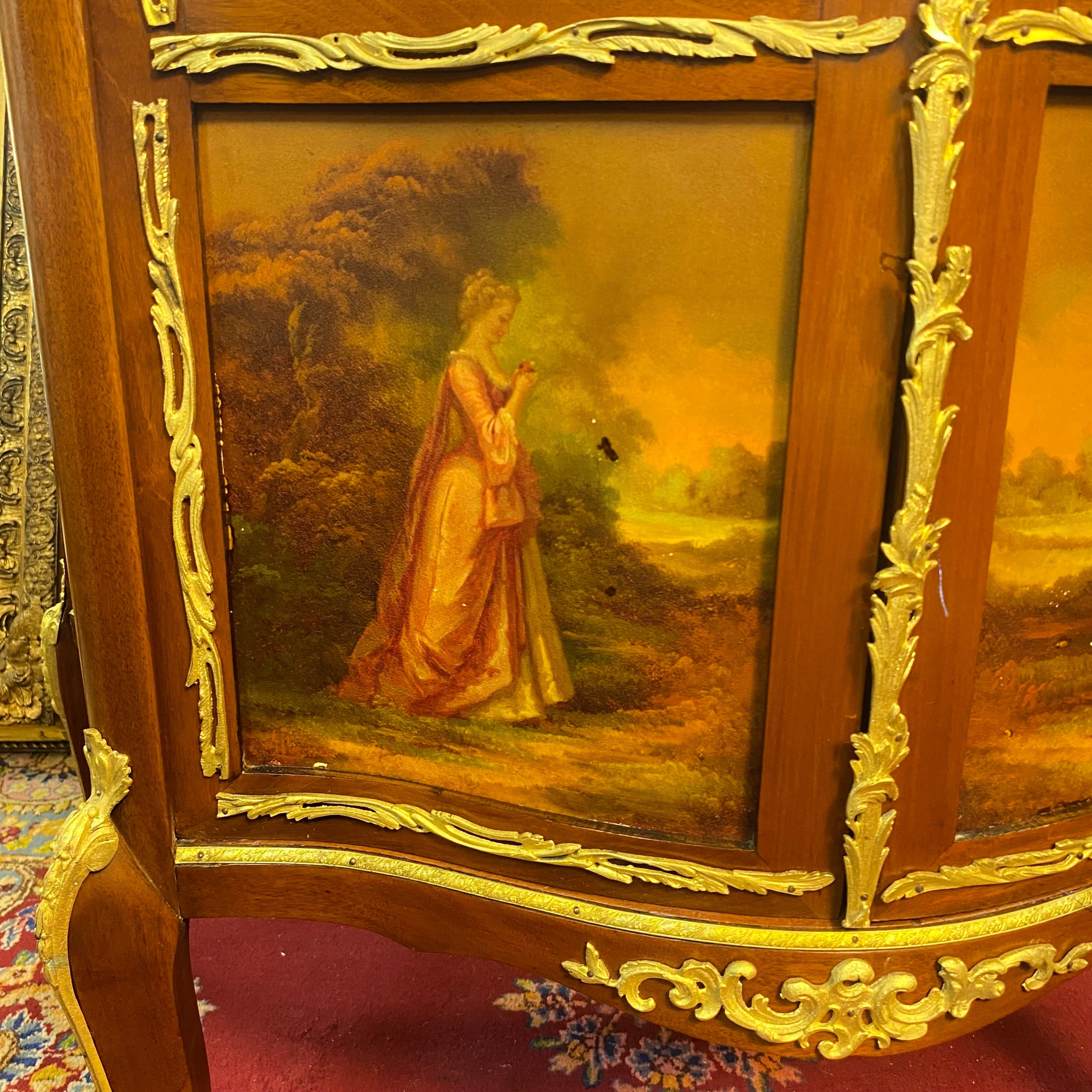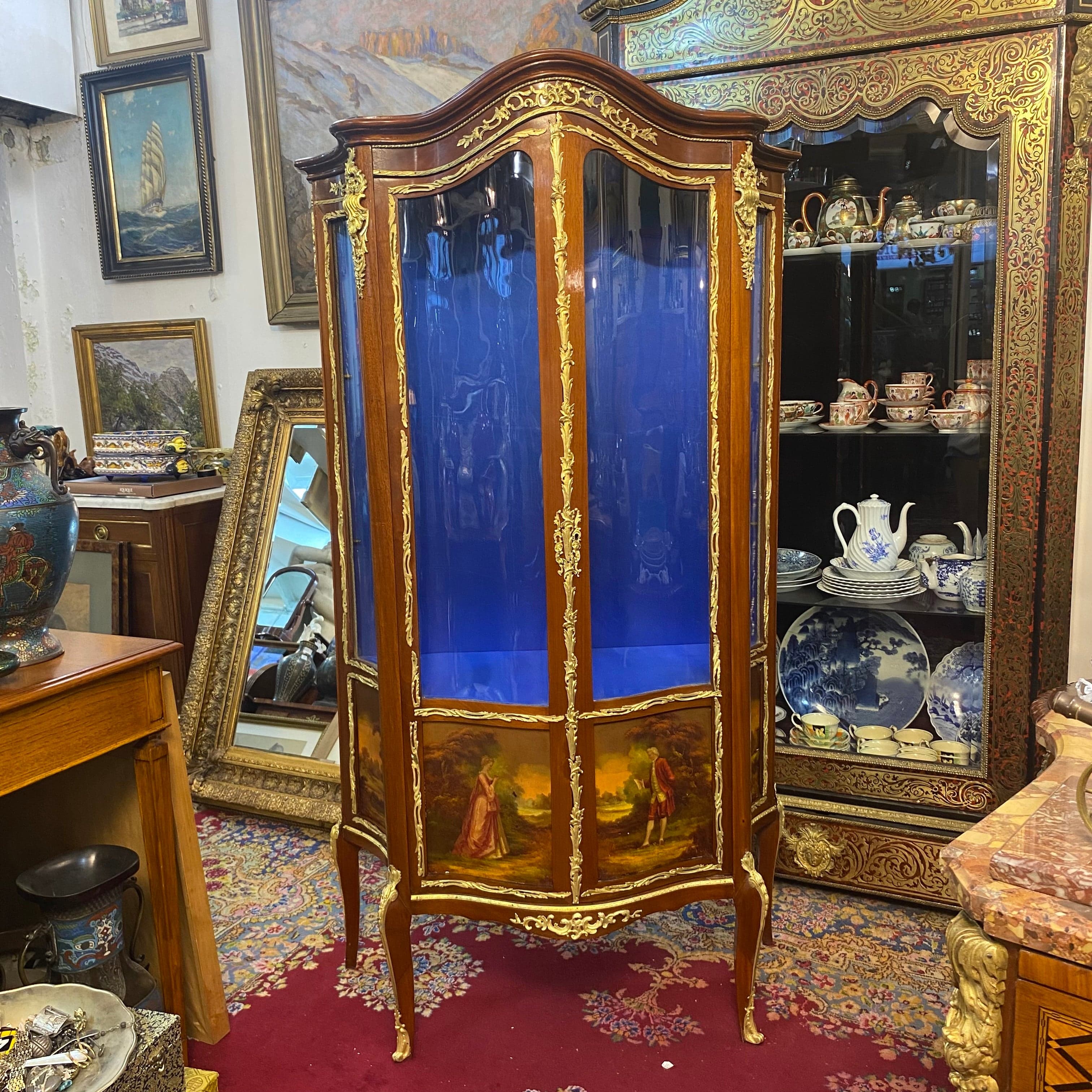 Hermosa vitrina francesa, estilo Vernis Martin en madera caoba y aplicaciones de bronce. Acondicionada con tres repisas, forrada de género azul en su interior y con verdaderos cuadros en óleo en su diseño, una pareja en su puerta principal y árboles en ambos costados. Francia, 1920s.