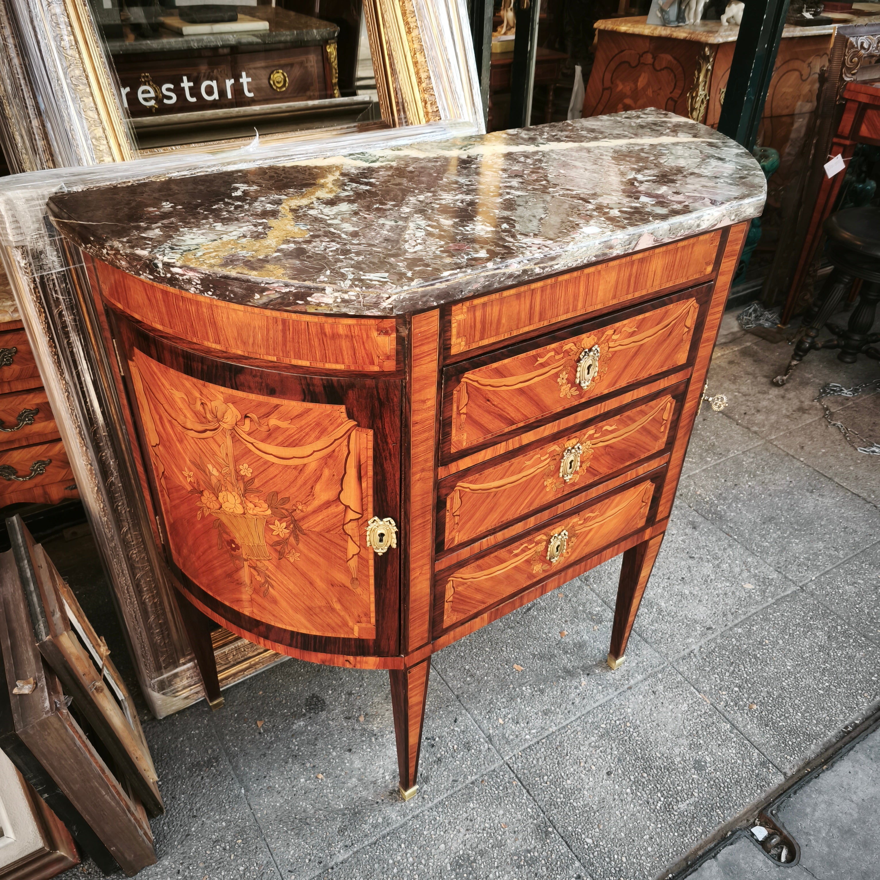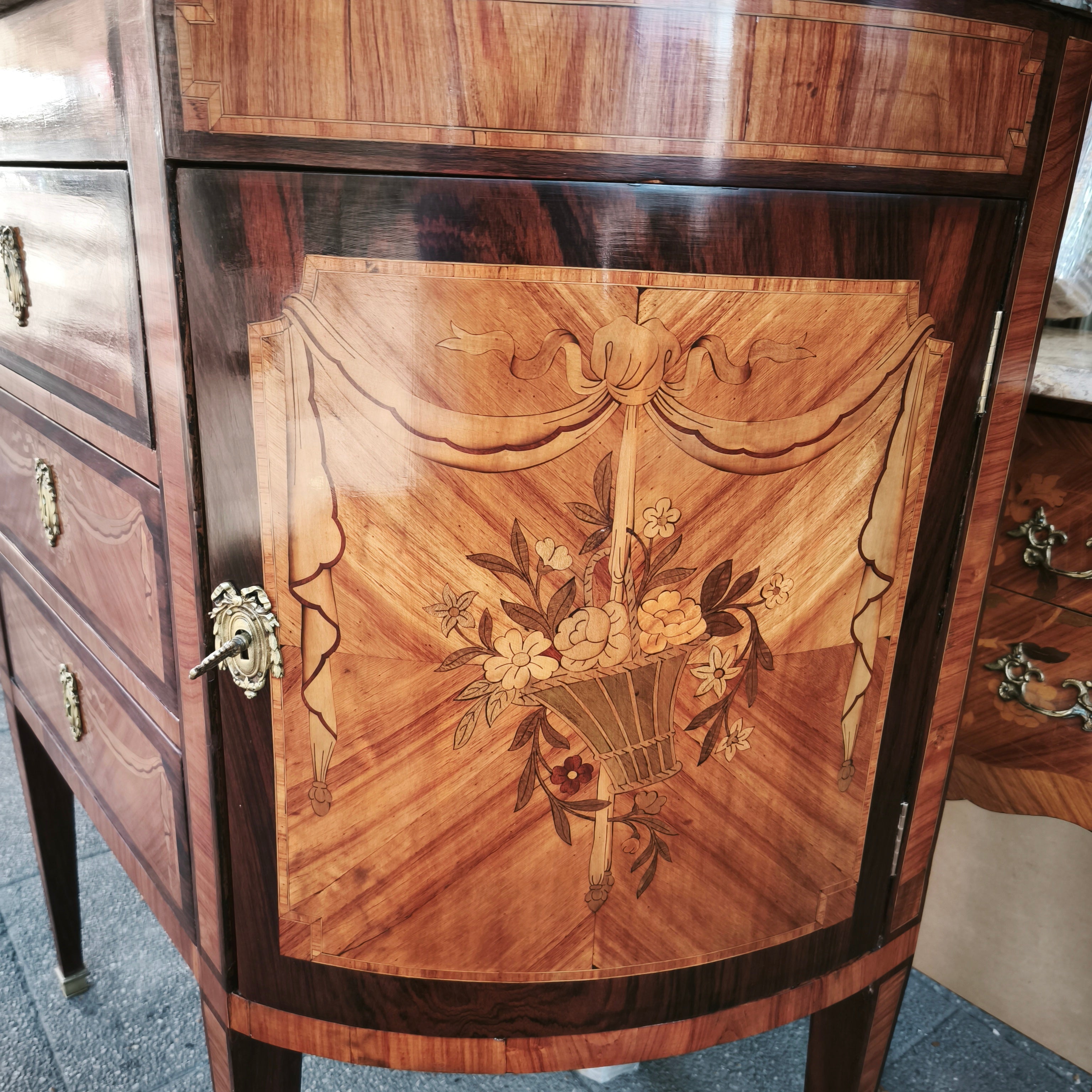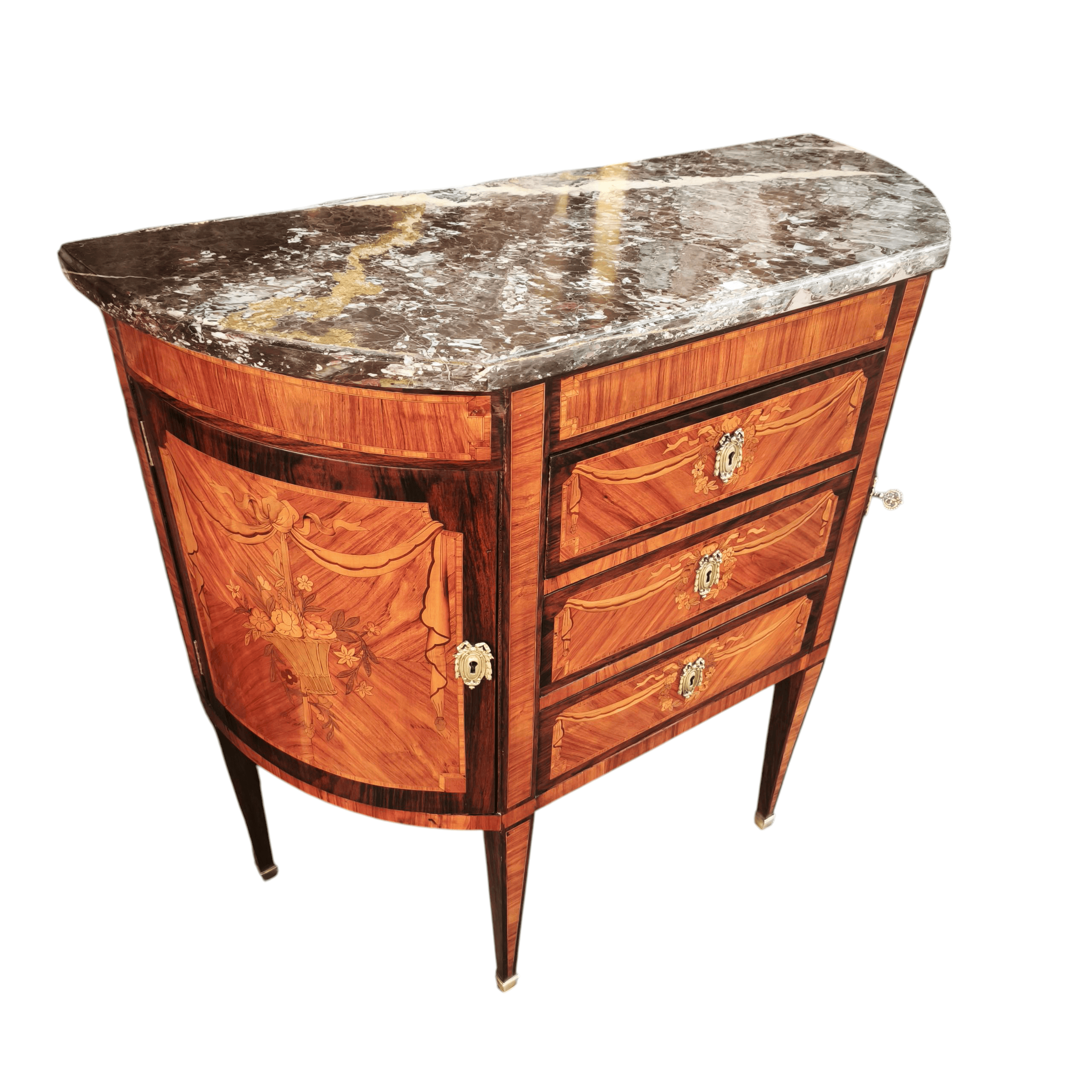 Hermosa cómoda estilo Luis XVI, modelo Demi-Lune, con tres cajones con tiradores de bronce, y repisas a los lados, cubiertas por una puerta, lo que la hace un mueble de almacenamiento util, pudiendo ser ubicado en espacios no tan amplios. En su diseño tiene una marquetería de flores, marmol y incrustaciones de bronce
