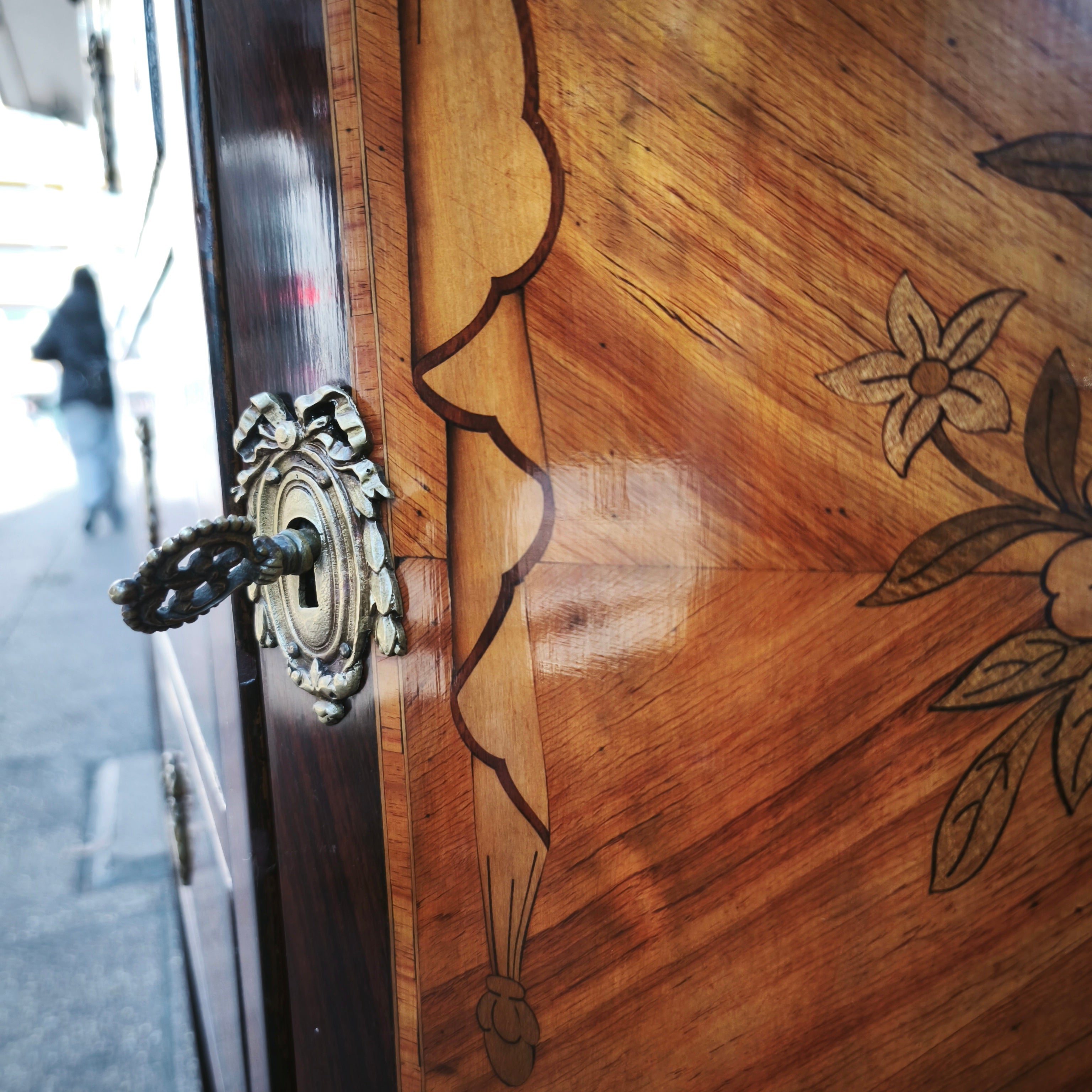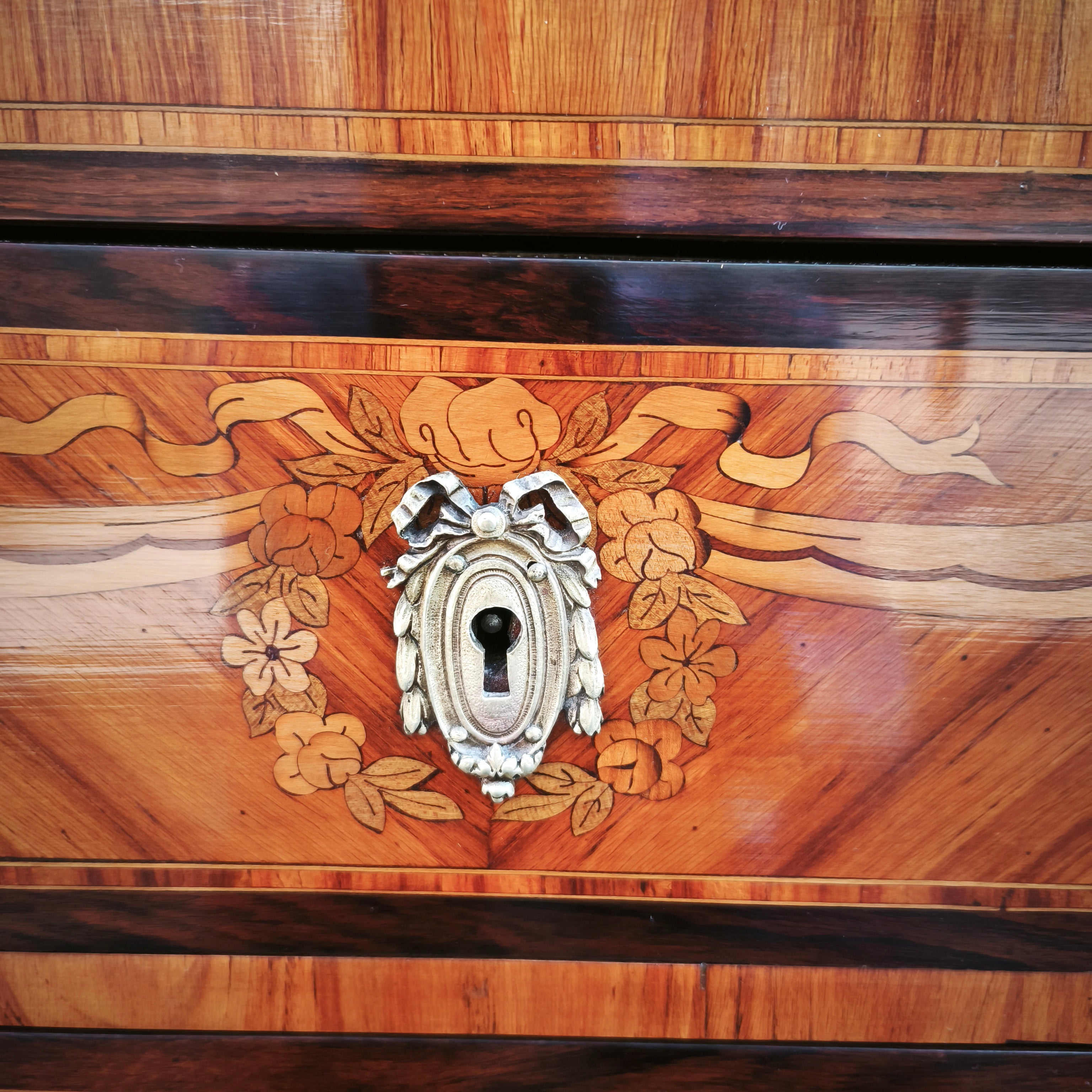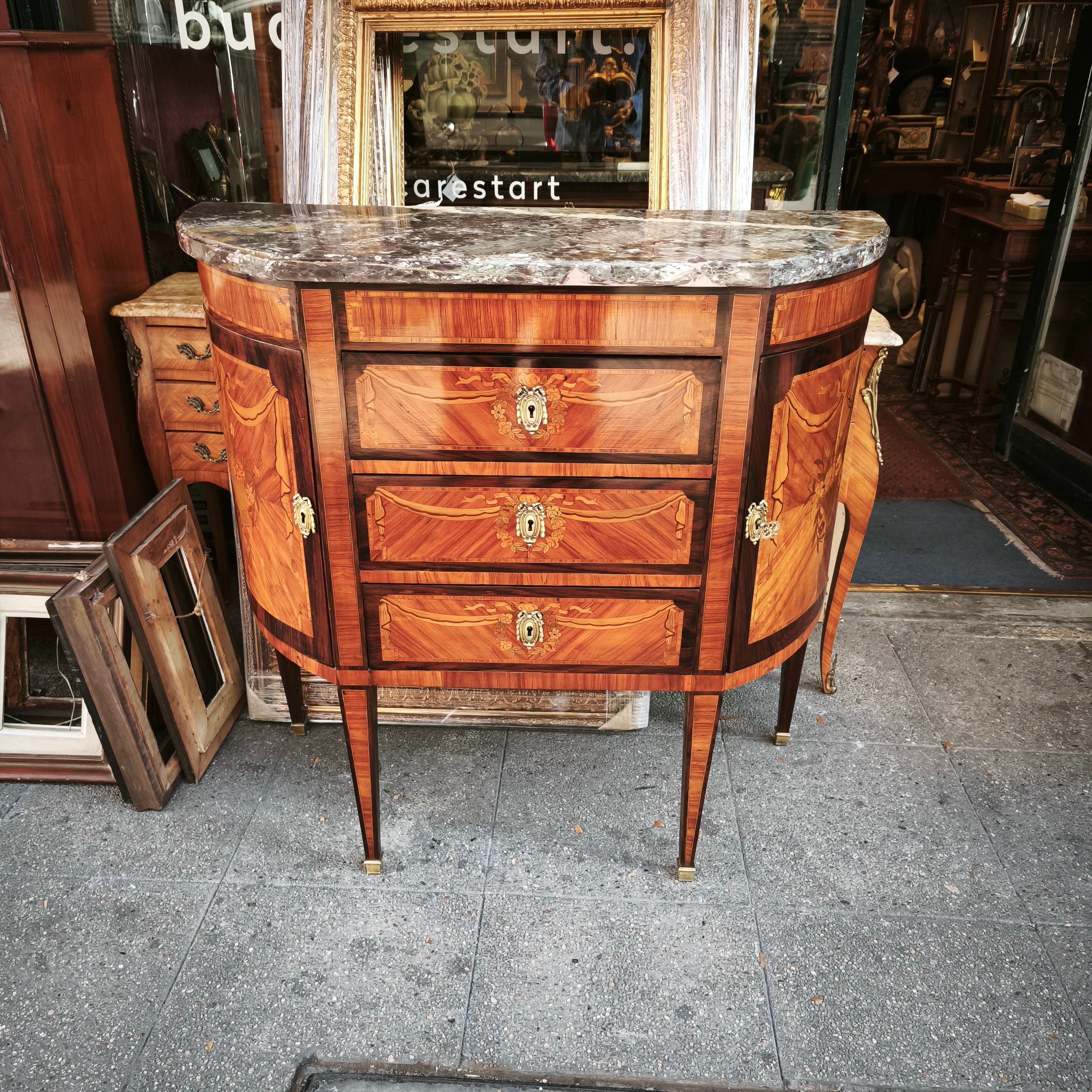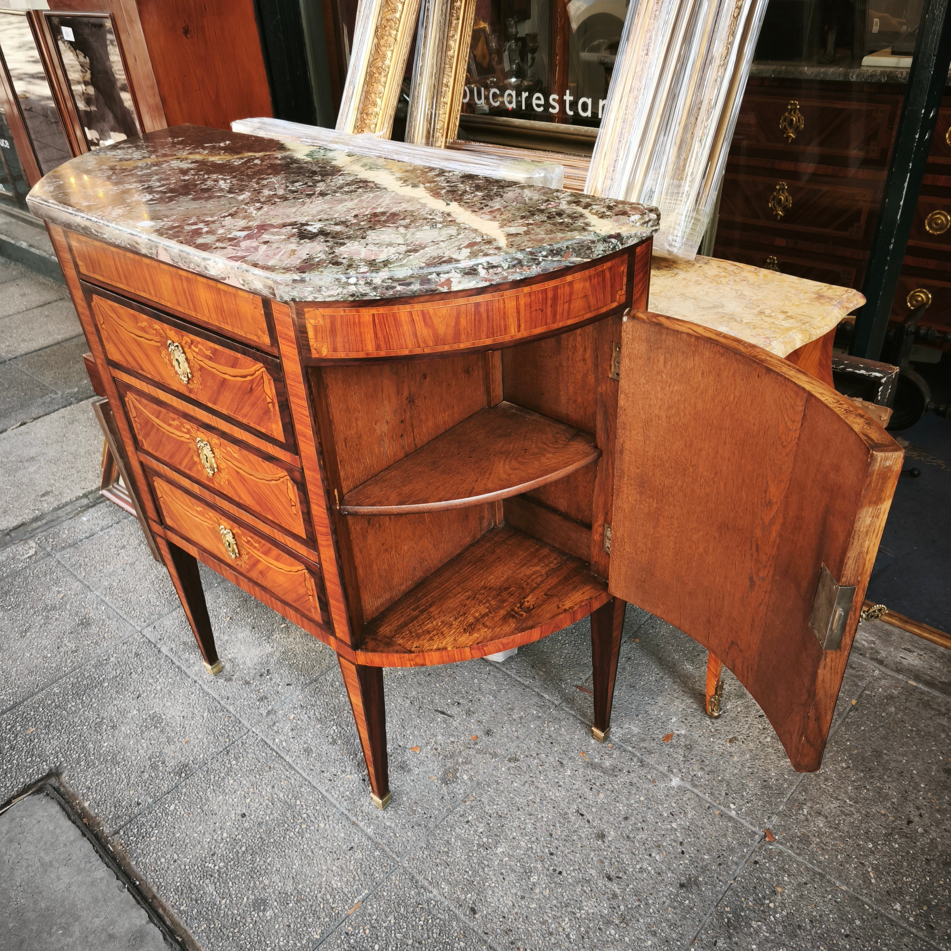 Hermosa cómoda estilo Luis XVI, modelo Demi-Lune, con tres cajones con tiradores de bronce, y repisas a los lados, cubiertas por una puerta, lo que la hace un mueble de almacenamiento util, pudiendo ser ubicado en espacios no tan amplios. En su diseño tiene una marquetería de flores, marmol y incrustaciones de bronce