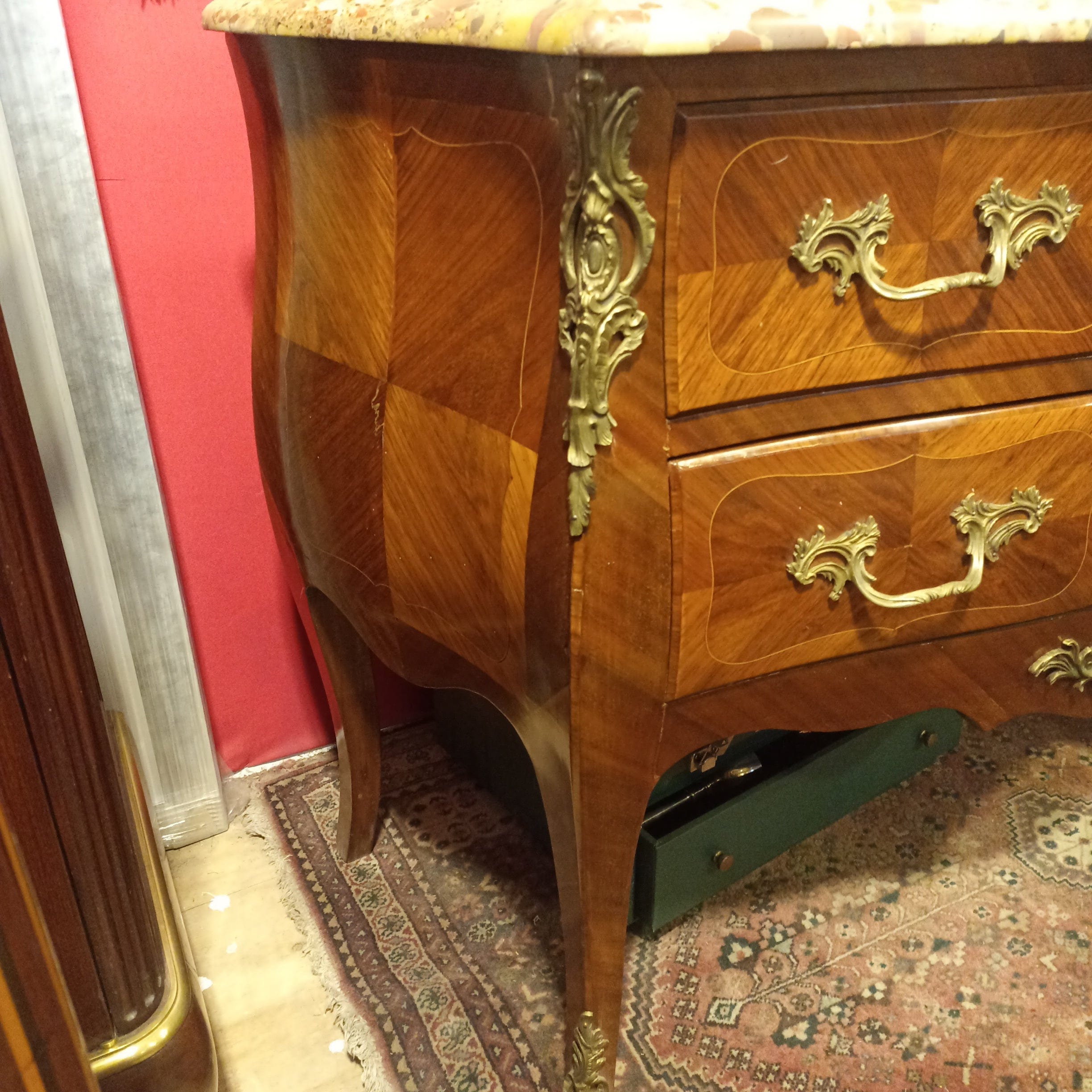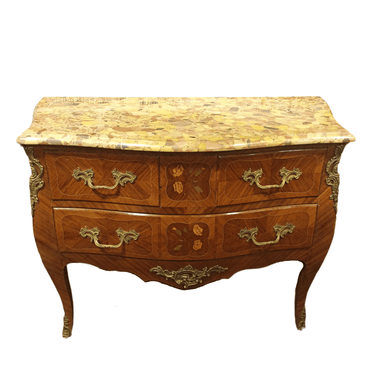 Preciosa cómoda Luis XV con cubierta de mármol, aplicaciones de bronce y detalles en marquetería. Cuenta con dos amplios cajones, tiradores de bronce, y detalles florales en la marquetería de los cajones.