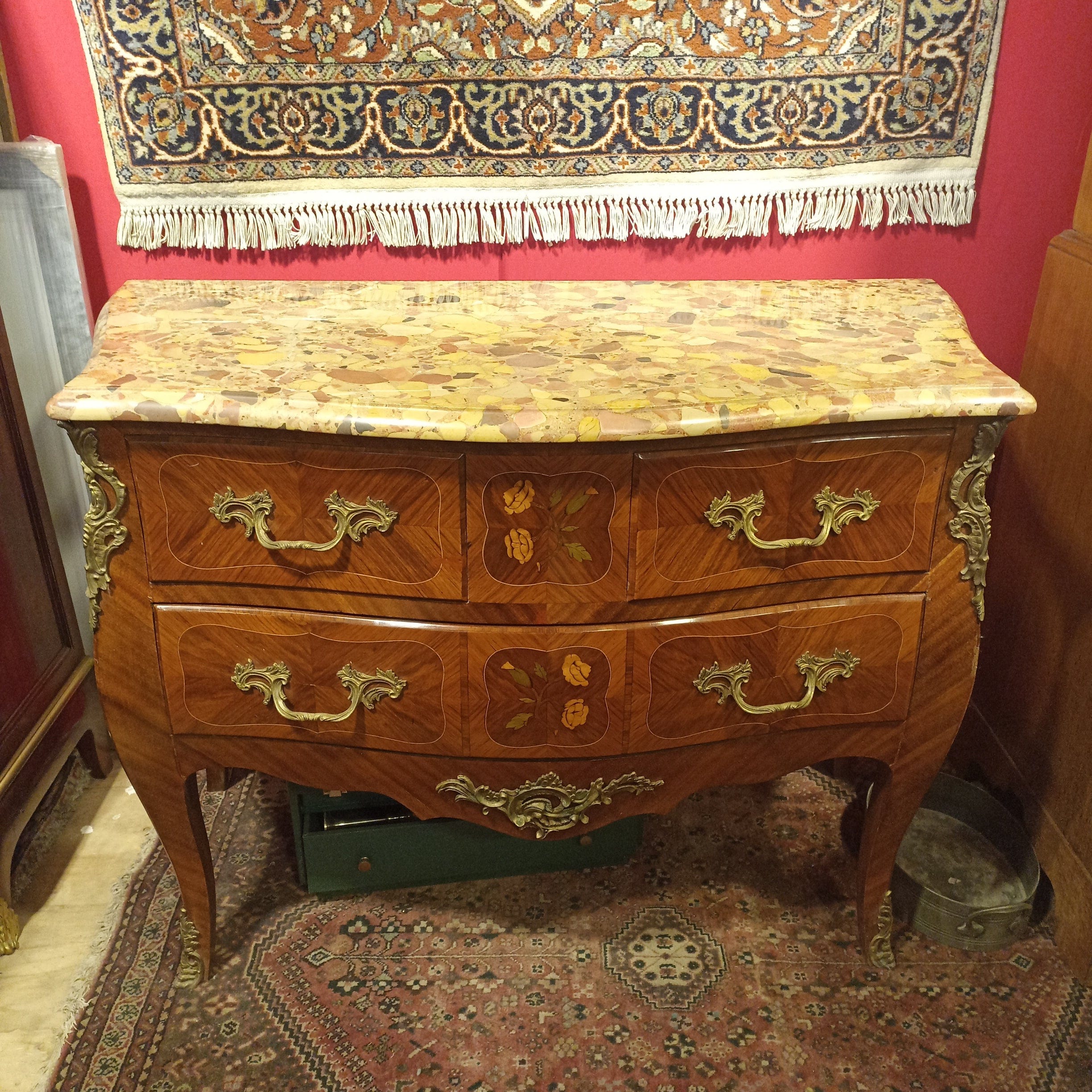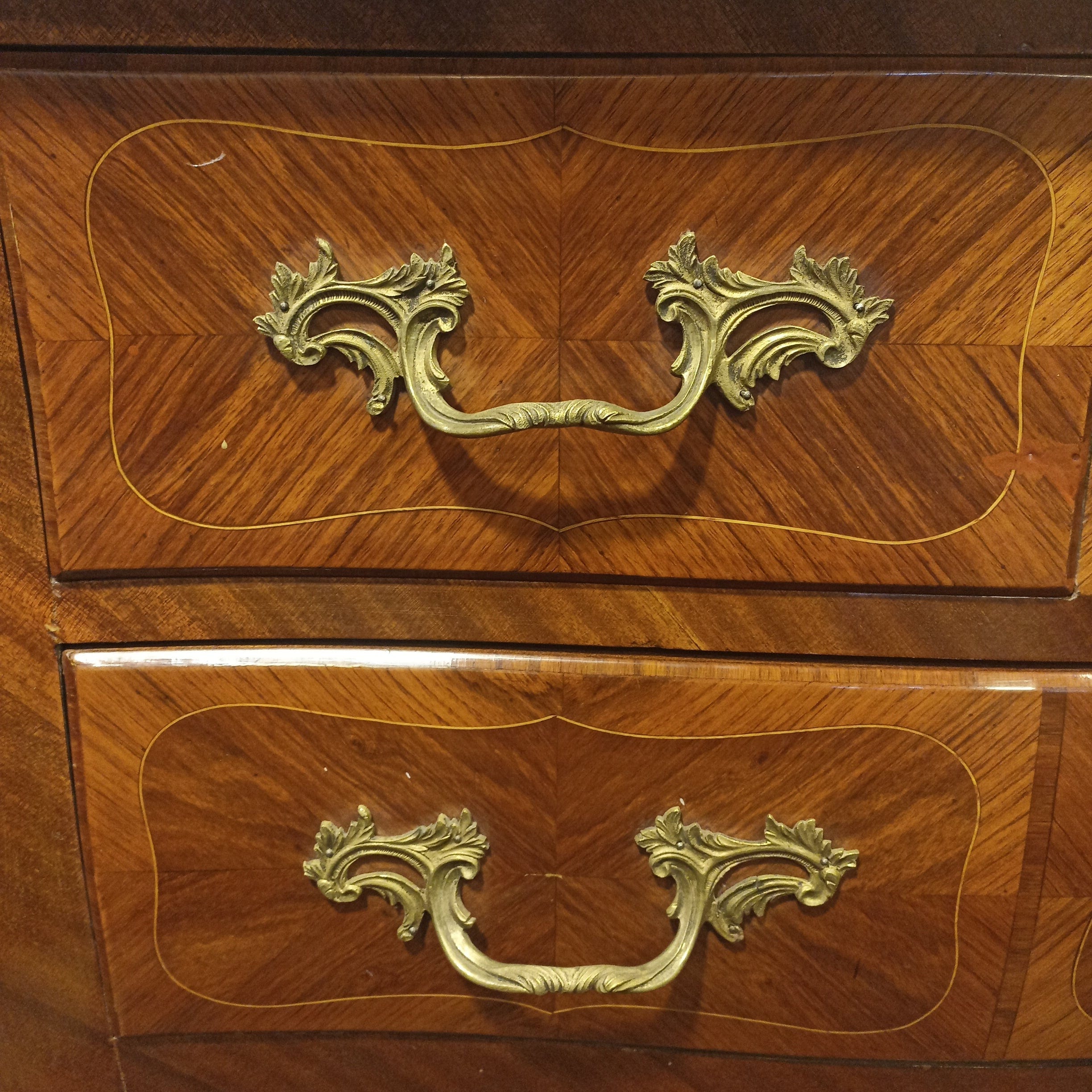 Cómoda Luis XV dos cajones mármol marquetería y aplicaciones en bronce