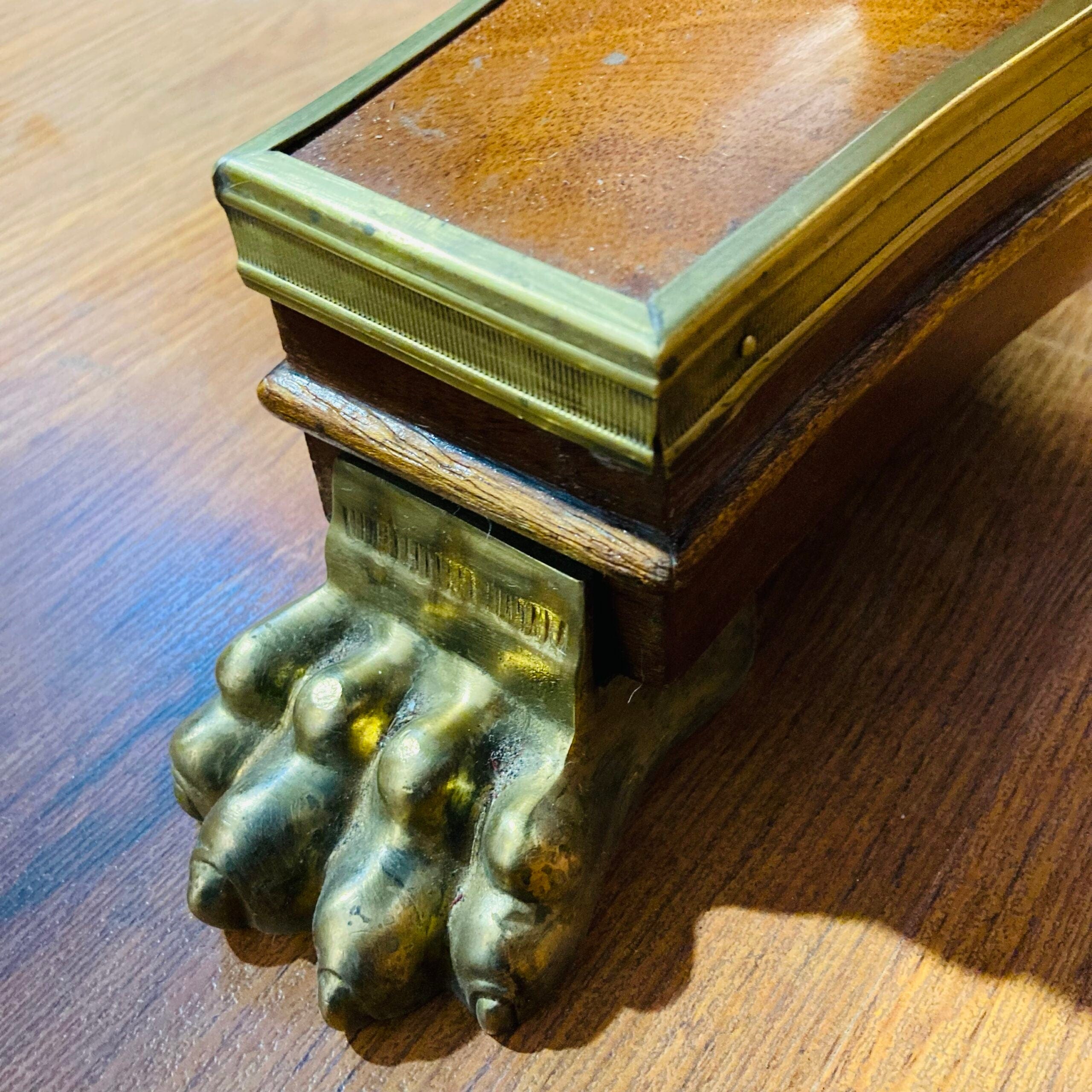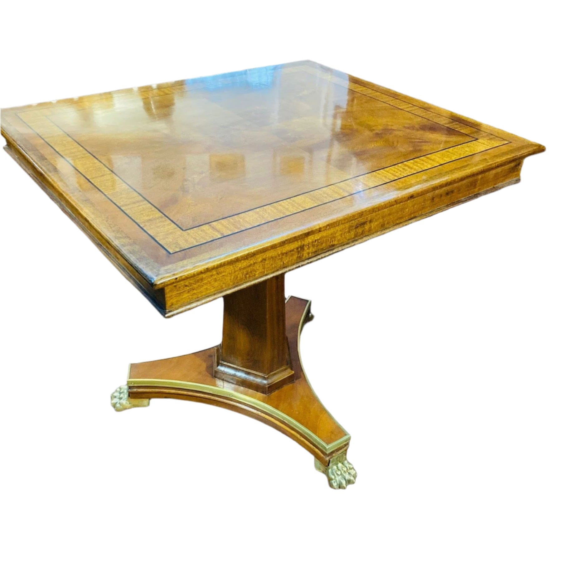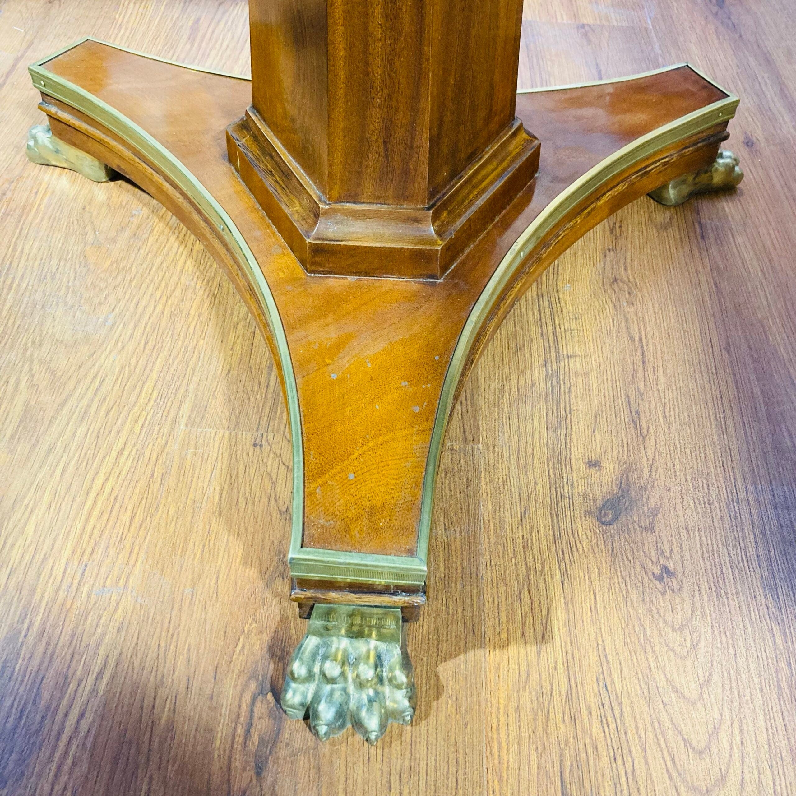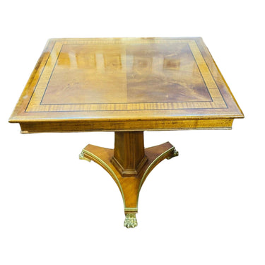 Mesa cuadrada estilo Imperio. Elegante mesa en madera de caoba con detalle en patas con forma de garra de león y aplicaciones en bronce.