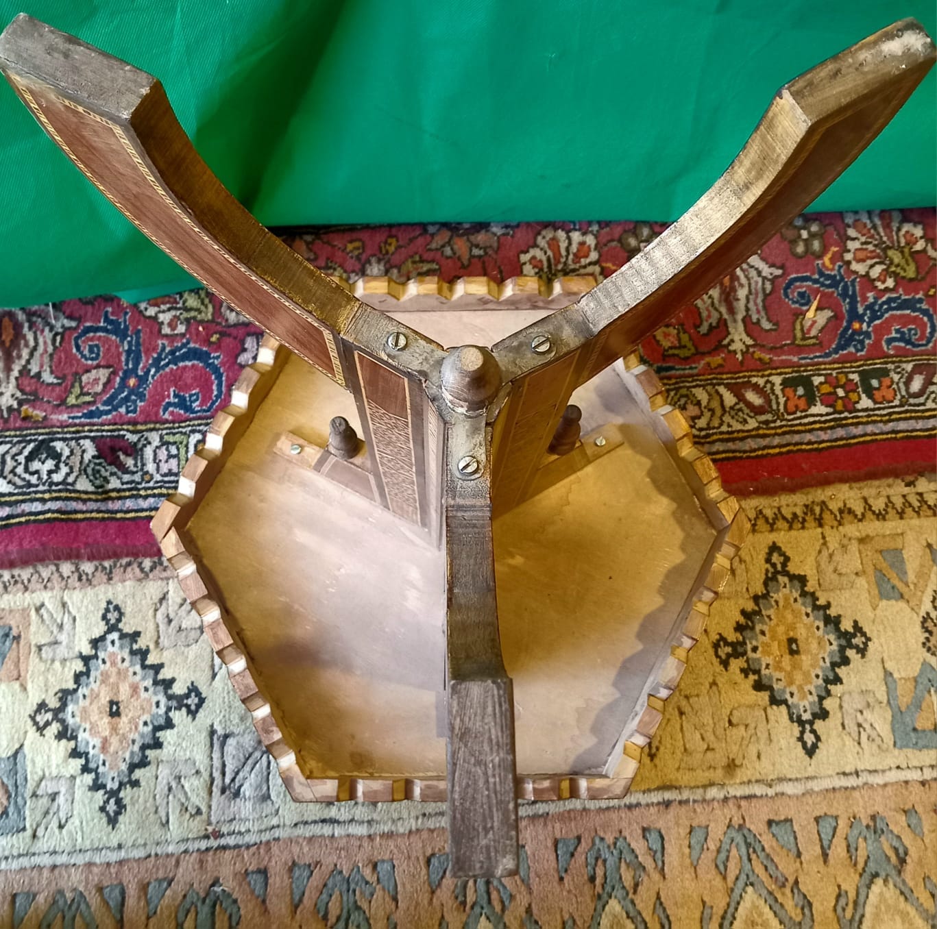 Preciosa mesita tripode de apoyo en estilo árabe, con cubierta hexagonal, con detalles de marquetería en nácar.