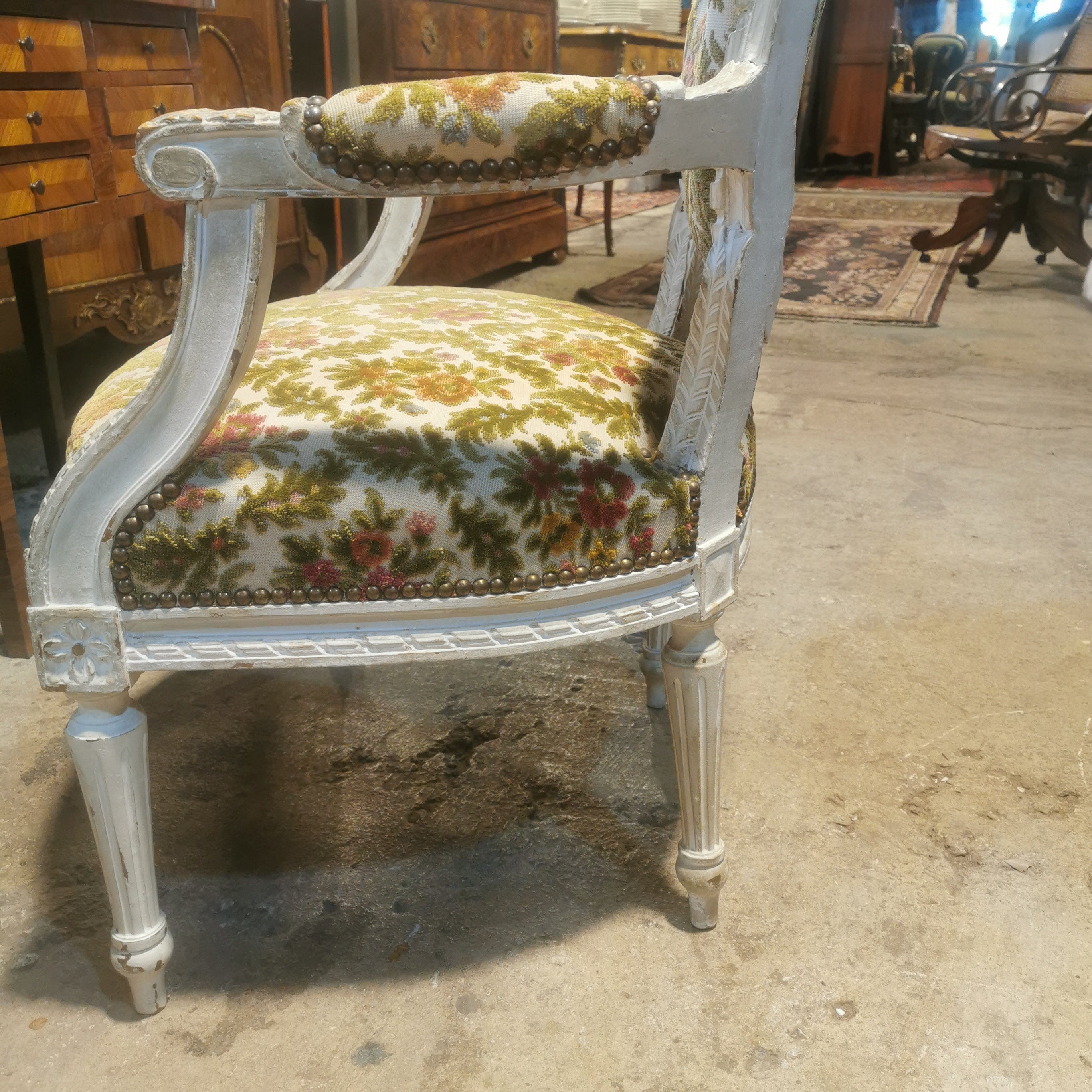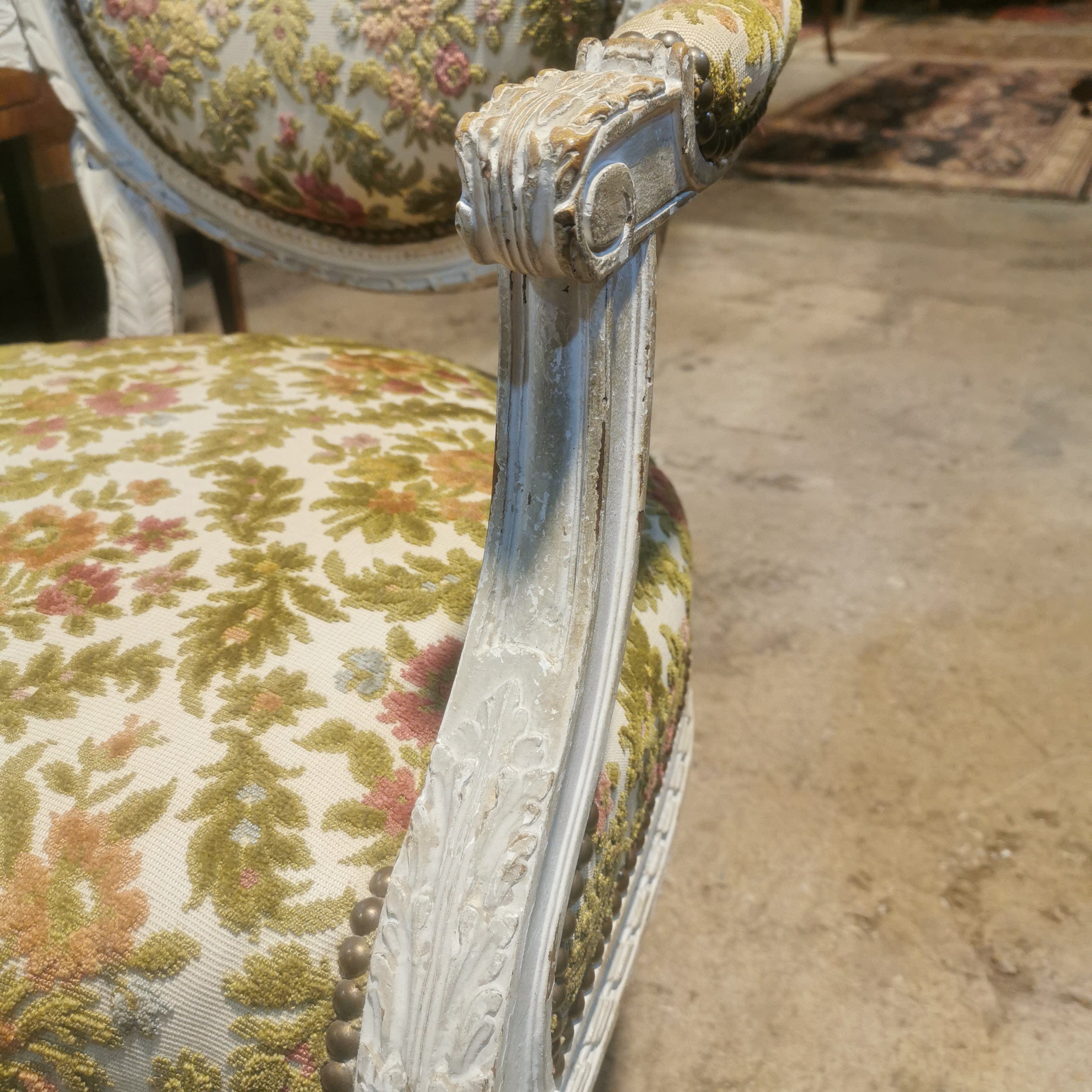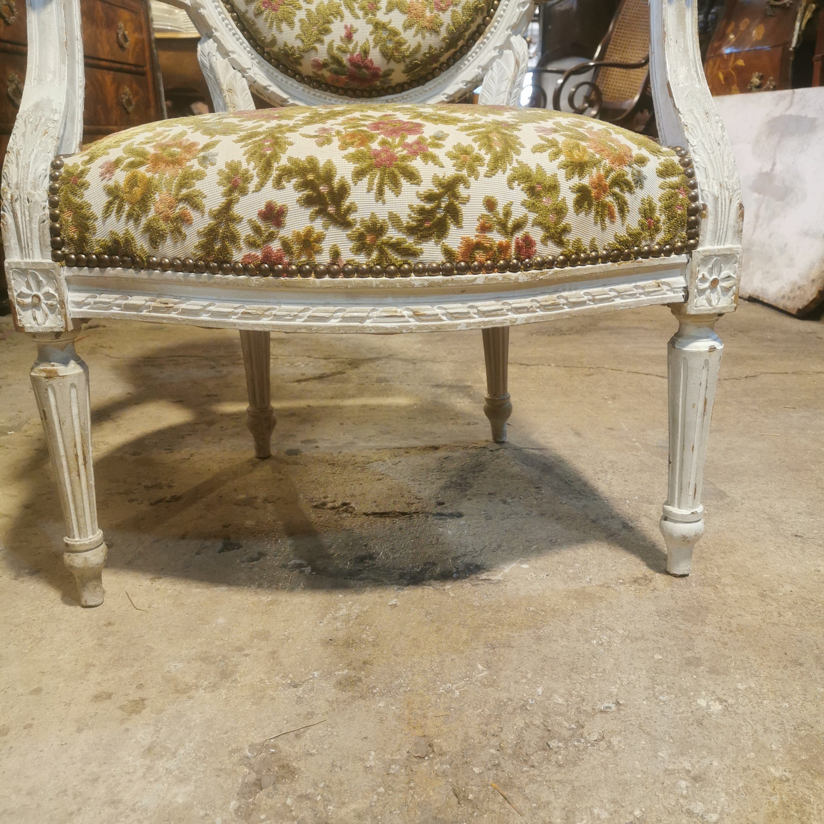 Preciosa pareja de sillones estilo Luis XVI, con respaldo de medallón y tapiz bordado, clavetones de bronce en todo su contorno. Pátina en color blanco y lindos tallados Florales.