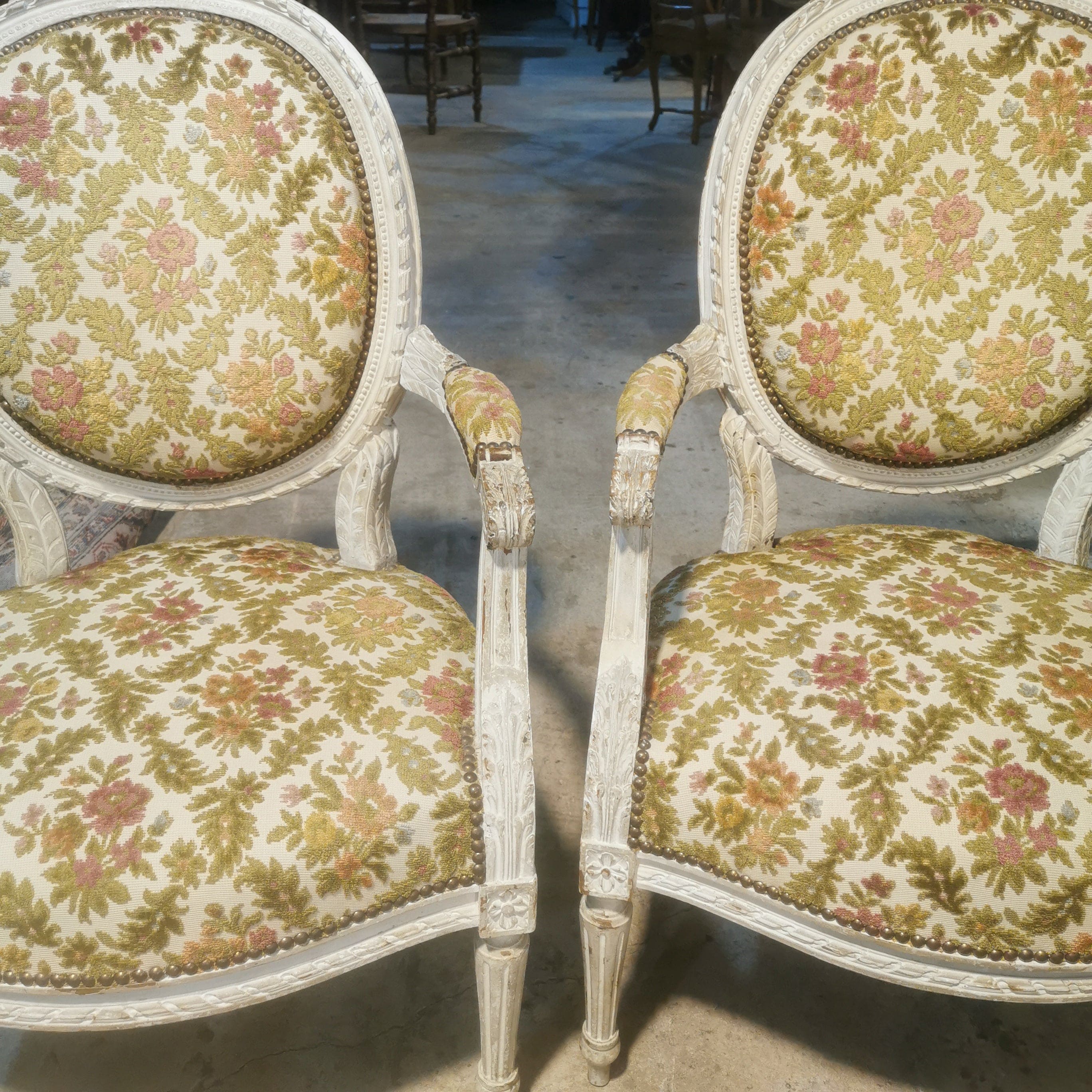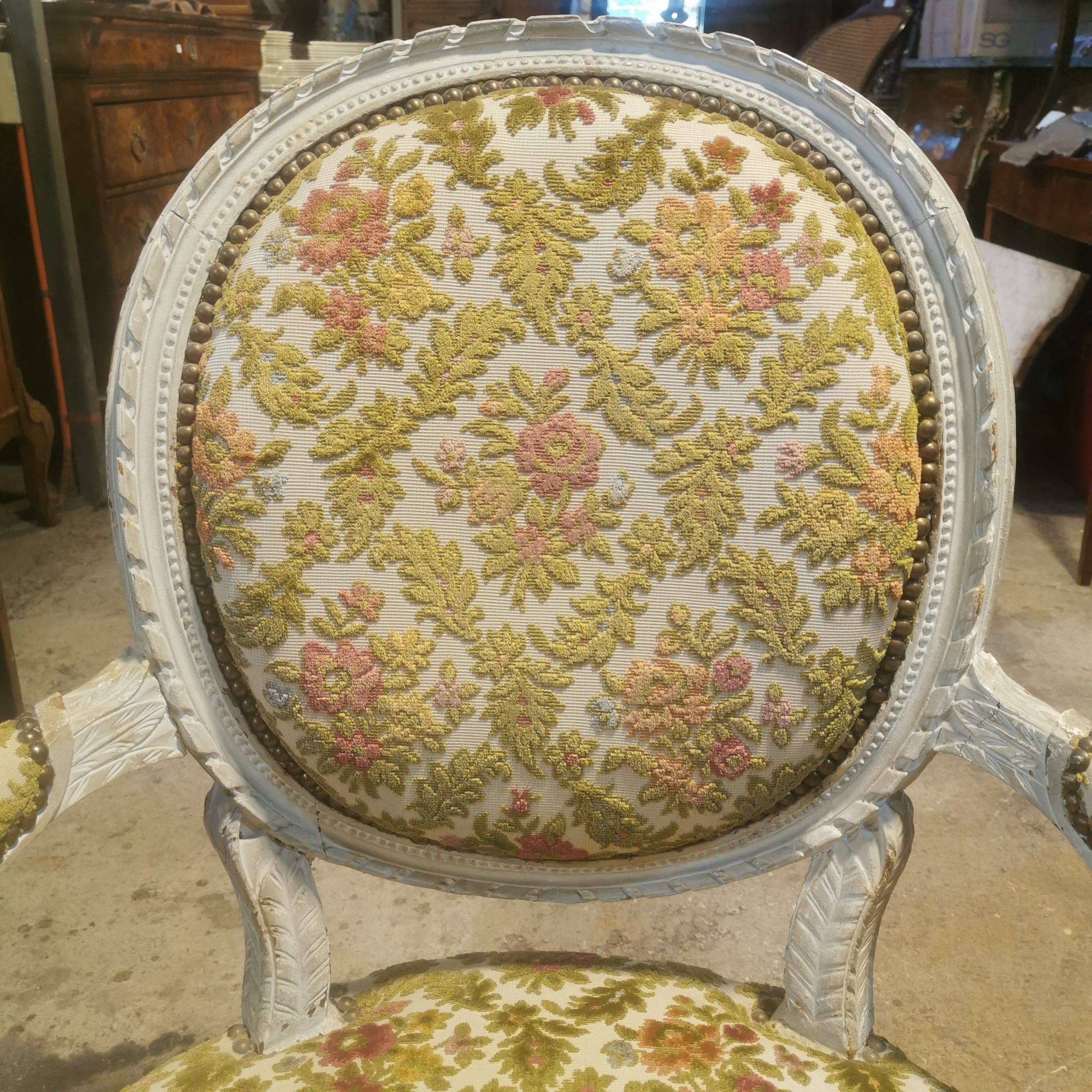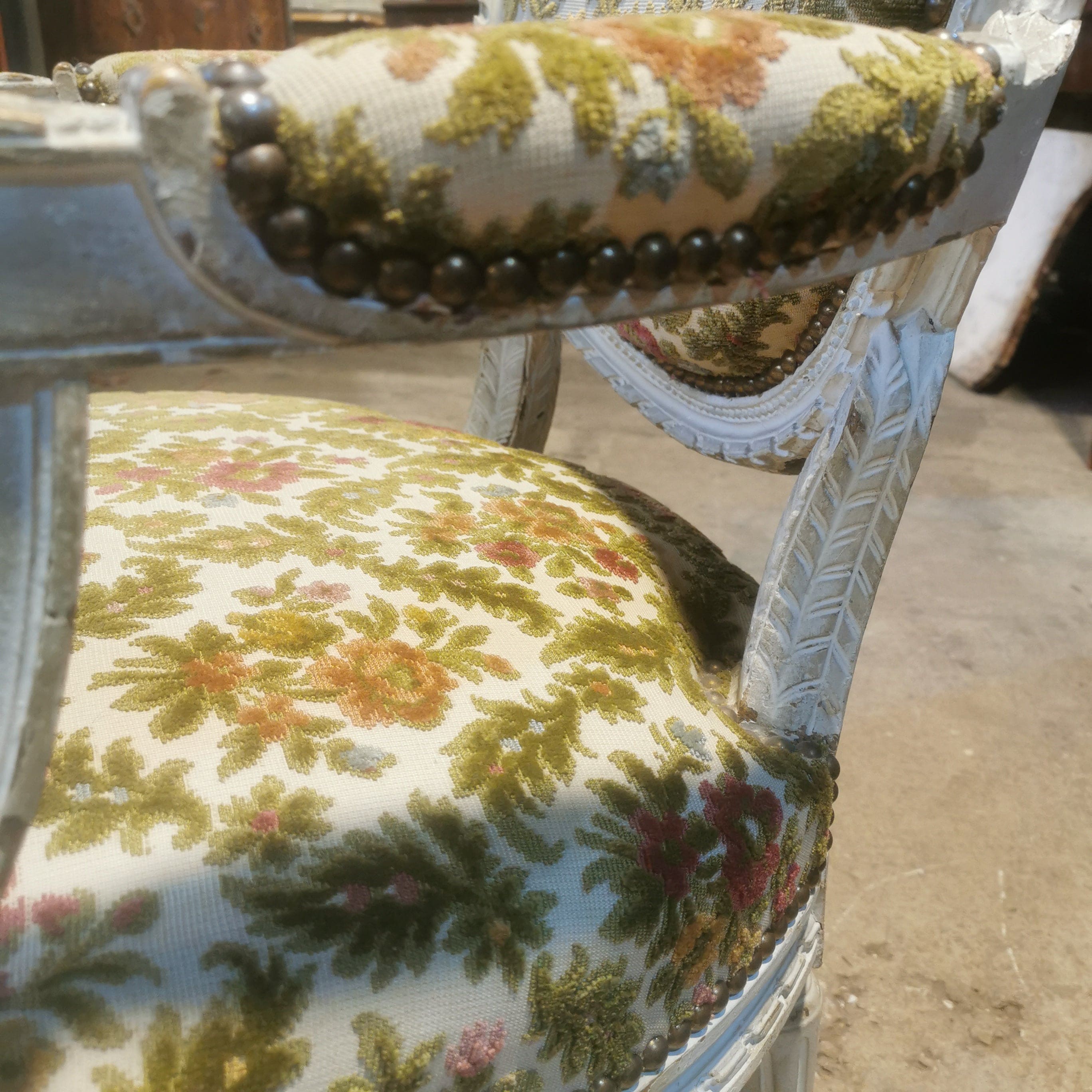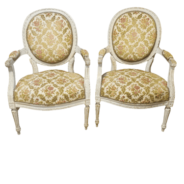 Par de sillones franceses Luis XVI de medallon con tapiz floreado bordado