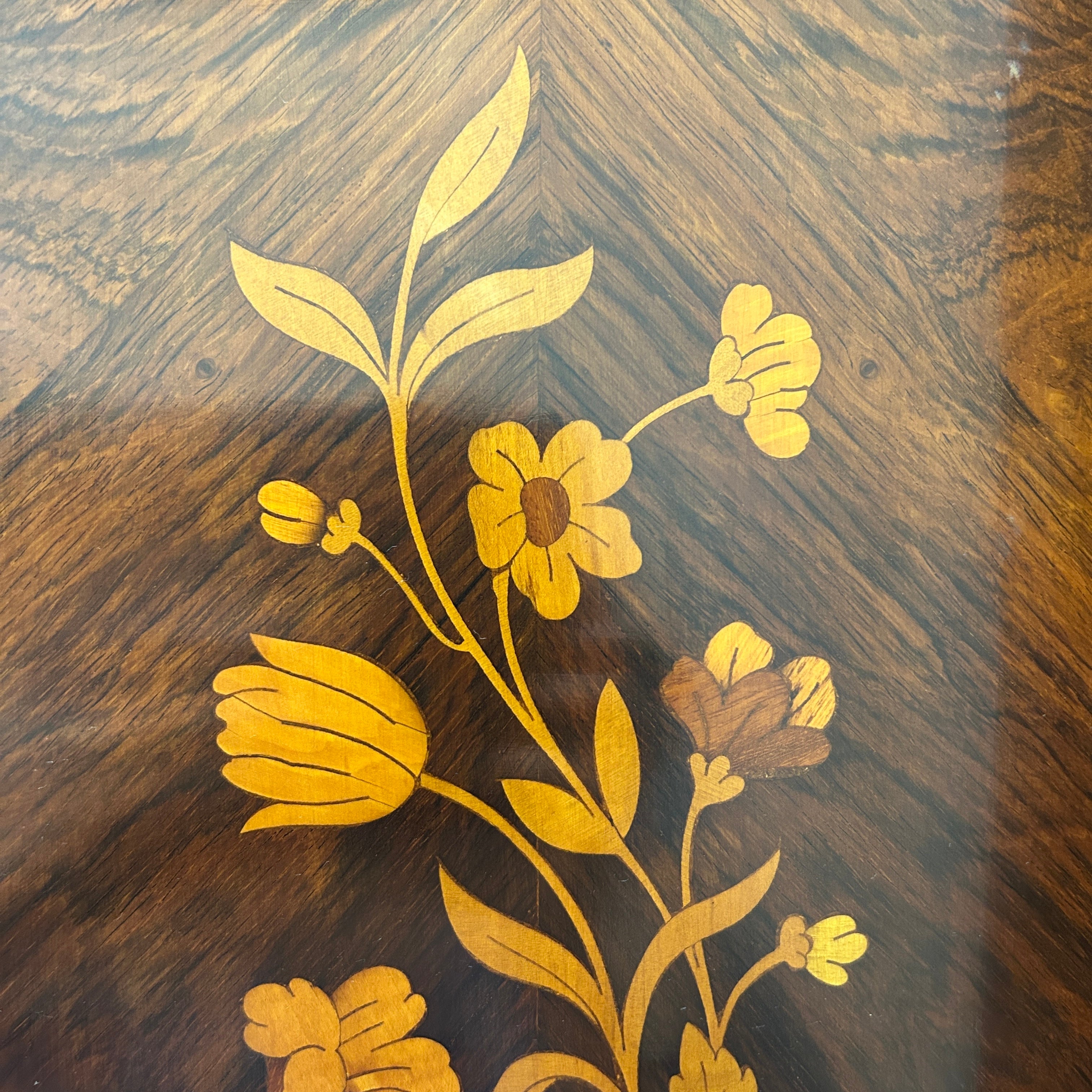 Chiffonier estilo Luis XVI, alto y estrecho. Contiene cuatro cajones, una mesa plegable con superficie de cuero con dos cajones pequeños en su interior y cubierta superior de mármol. Detallado diseño central en marquetería y detalles en bronce. Viene con el mármol original restaurado.