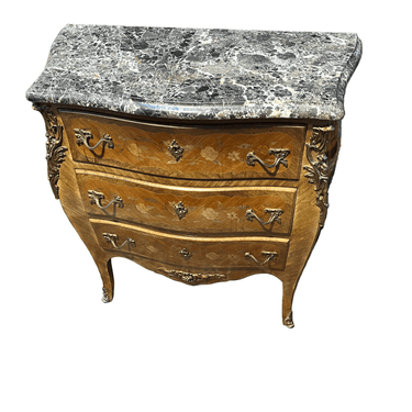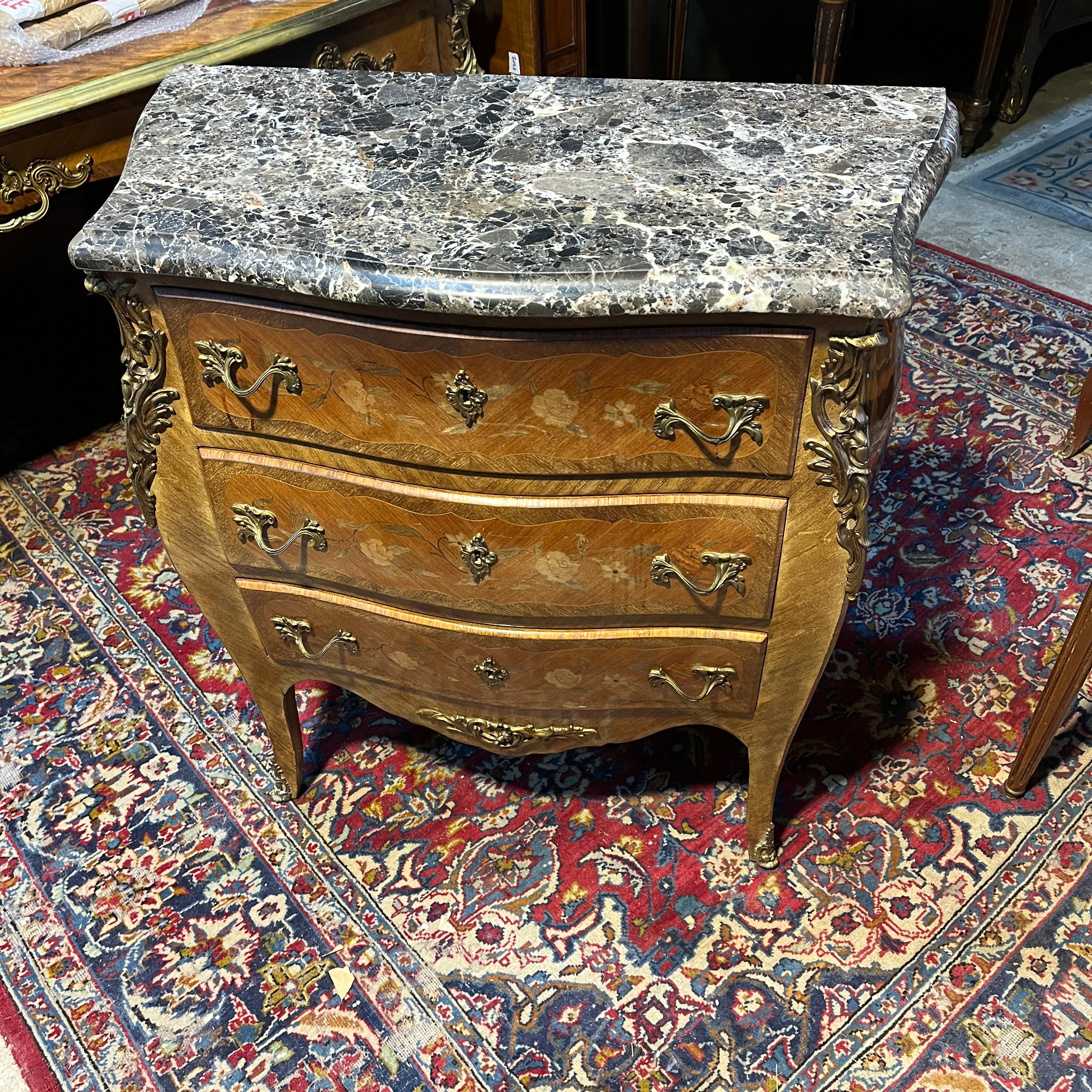Elegante cómoda francesa estilo Luis XV con tres cajones y cubierta de mármol. Cuenta con aplicaciones y tiradores de bronce y con un diseño floral de marquetería.