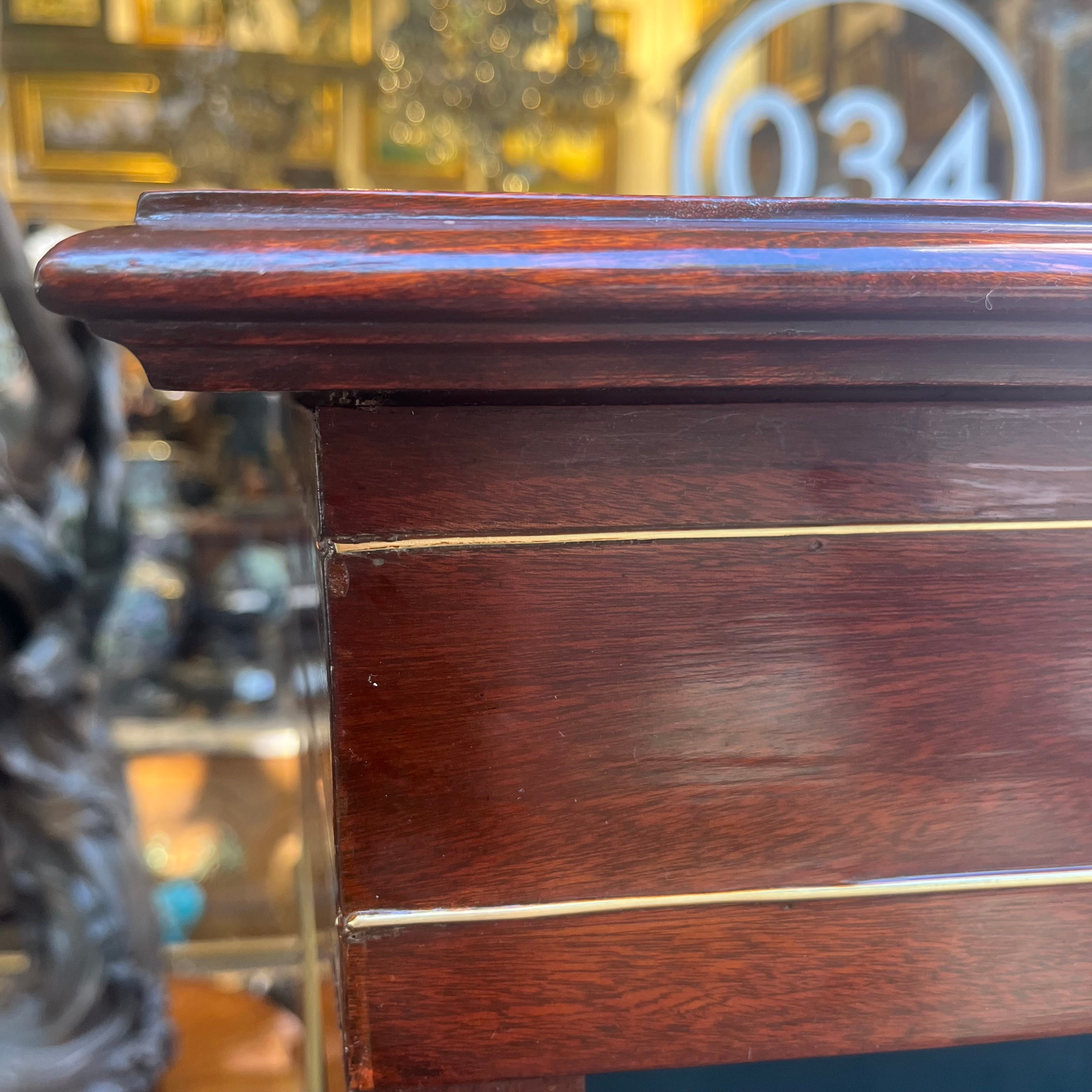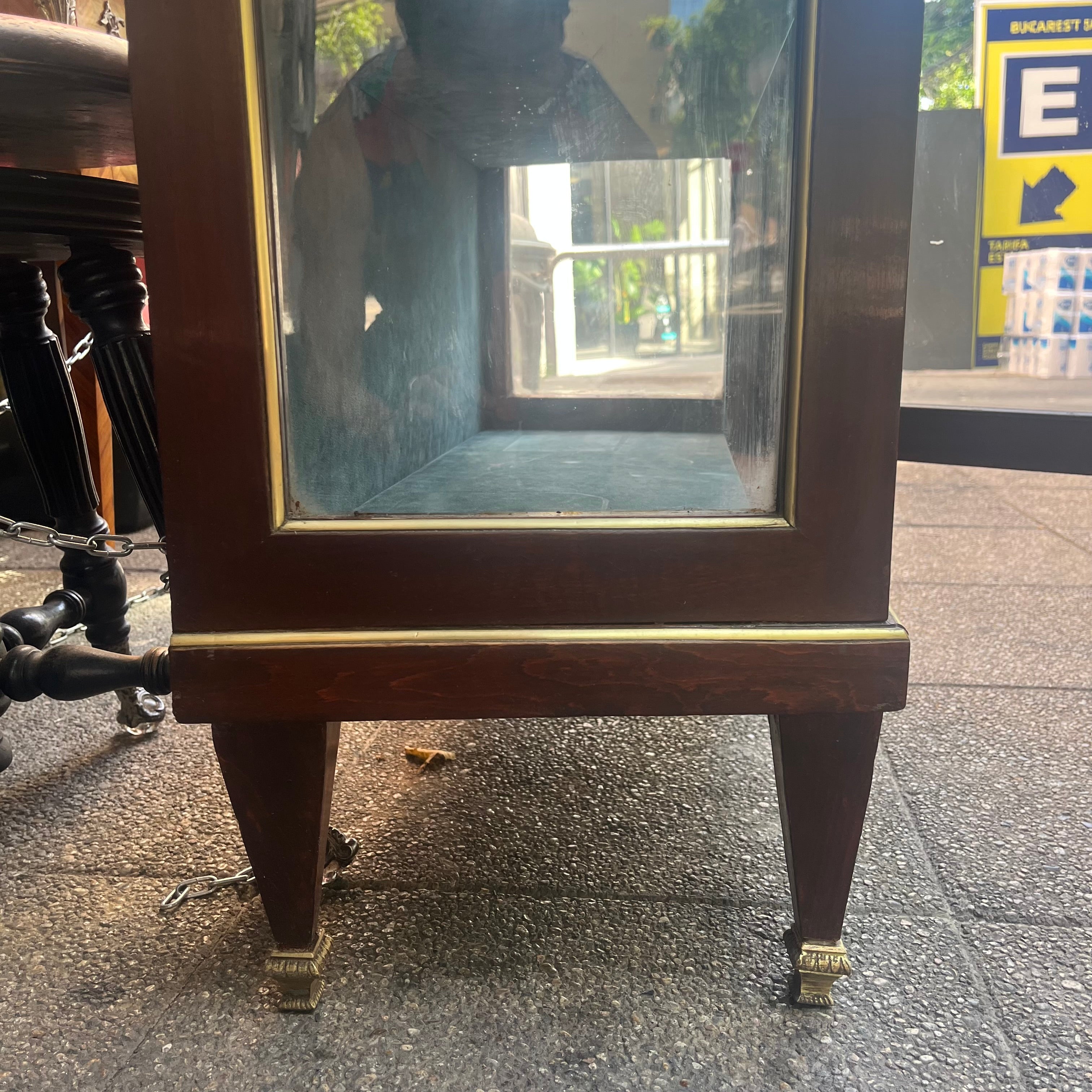 Preciosa vitrina Luís XVI caoba con vidrio frontal y laterales con decoraciones en bronce en su exterior. El interior se encuentra tapizado en azul acero aterciopelado y tres cuenta con tres repisas.