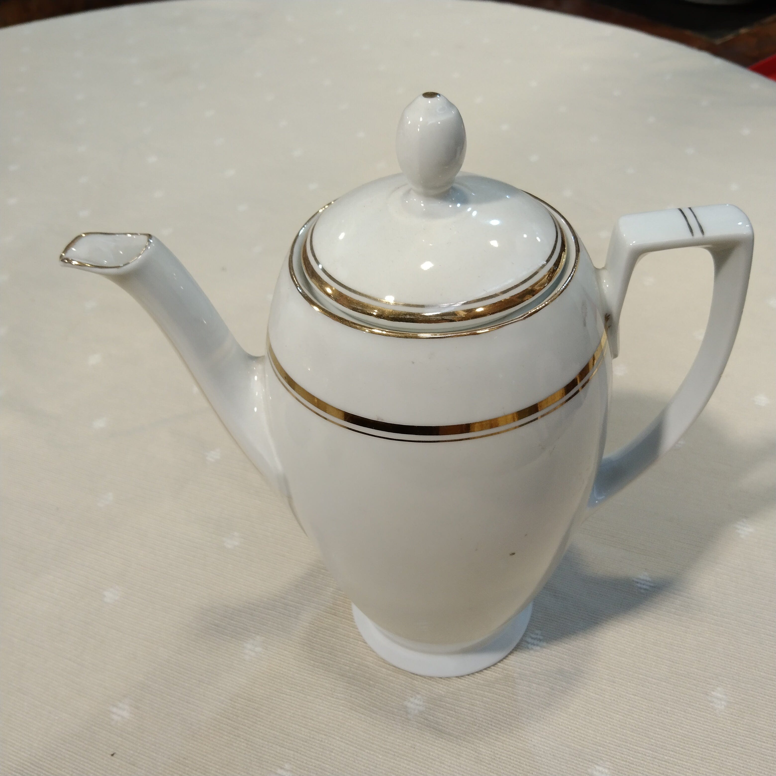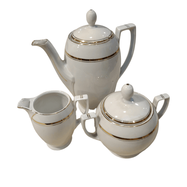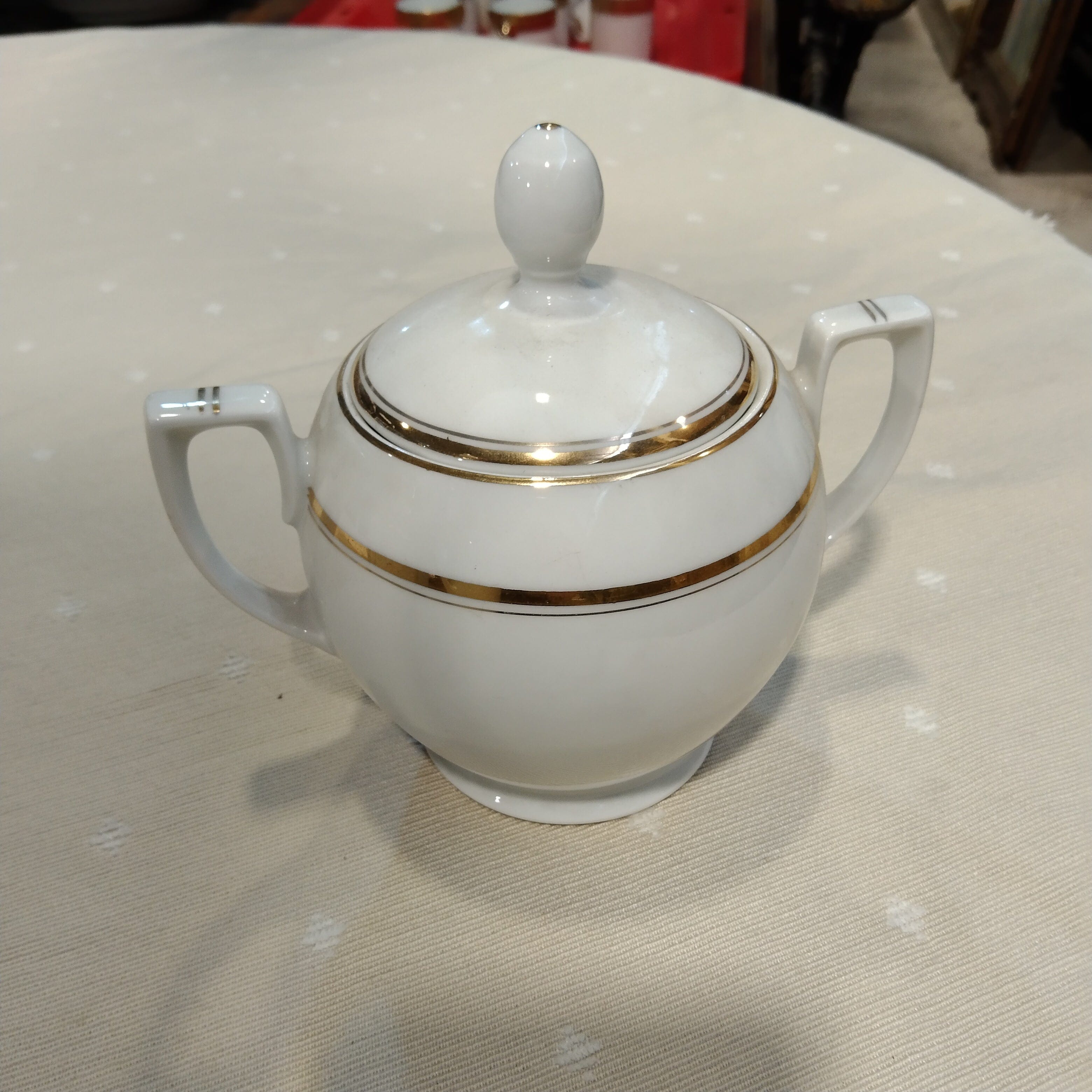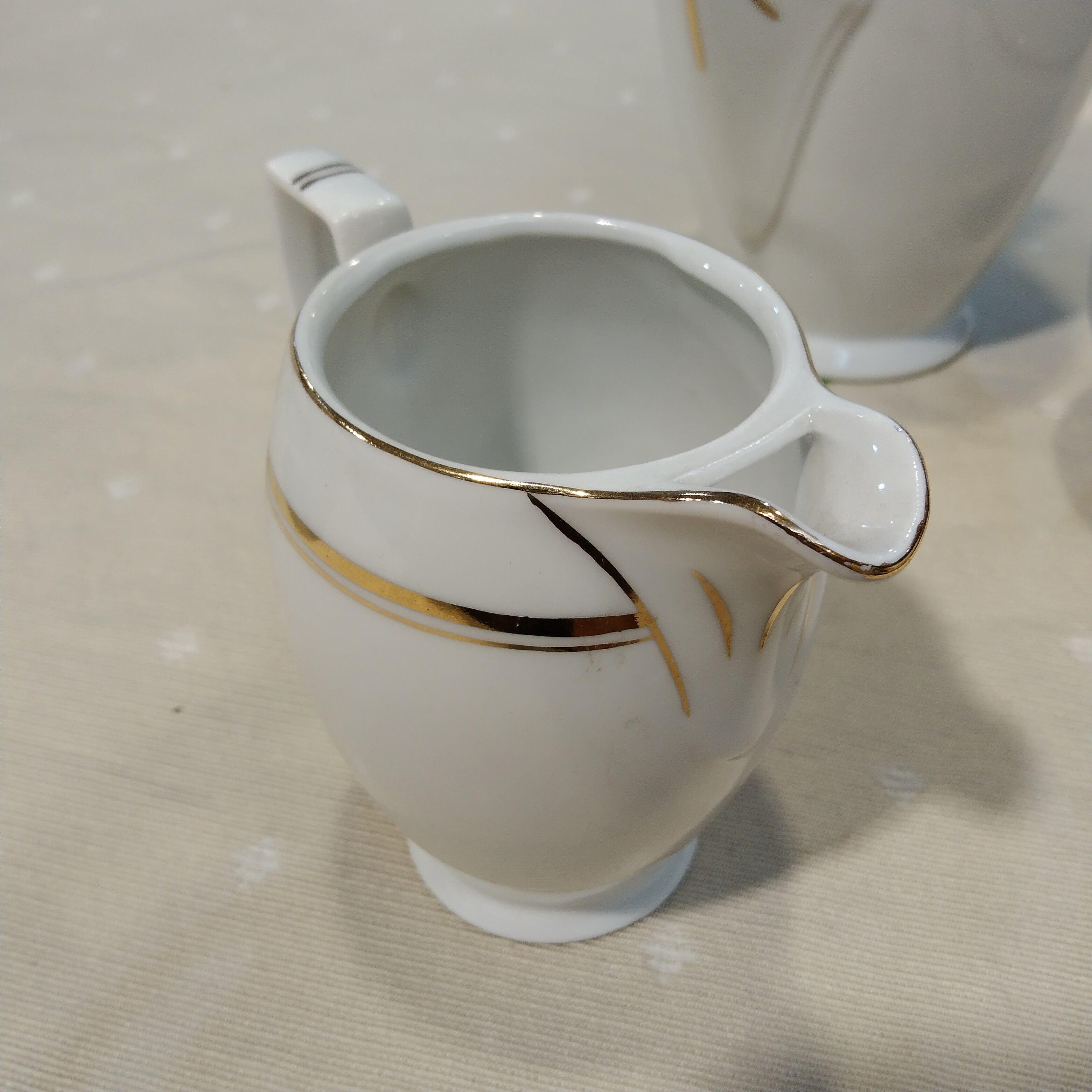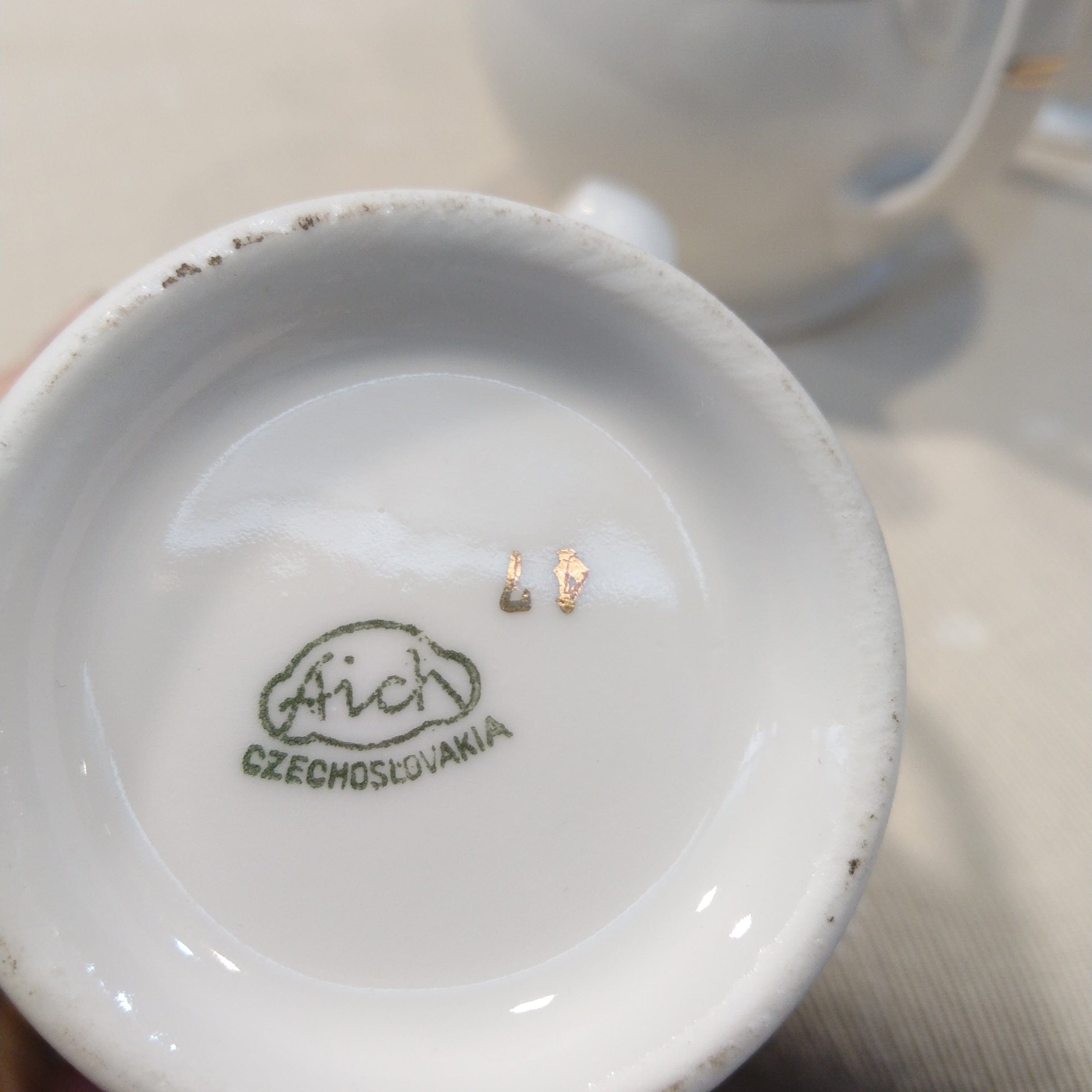 Bello juego de servir de porcelana de orígen checo de la marca Aich, con un elegante diseño de líneas doradas.