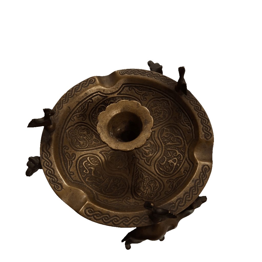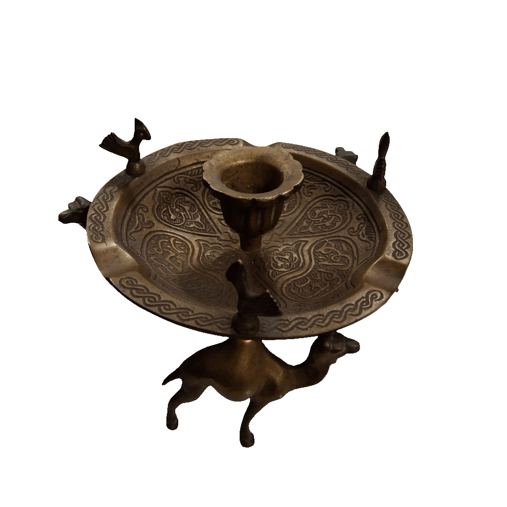 Llamativa palmatoria de bronce con un bello diseño de patrones. Sus patas tienen la forma de tres camellos coronados con un ave en su joroba.