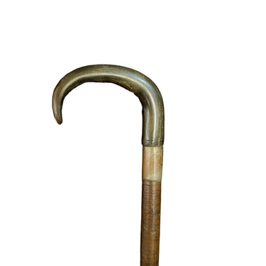Elegante bastón en madera de suela y mango de cornamenta animal oscura con aplicación metálica.
