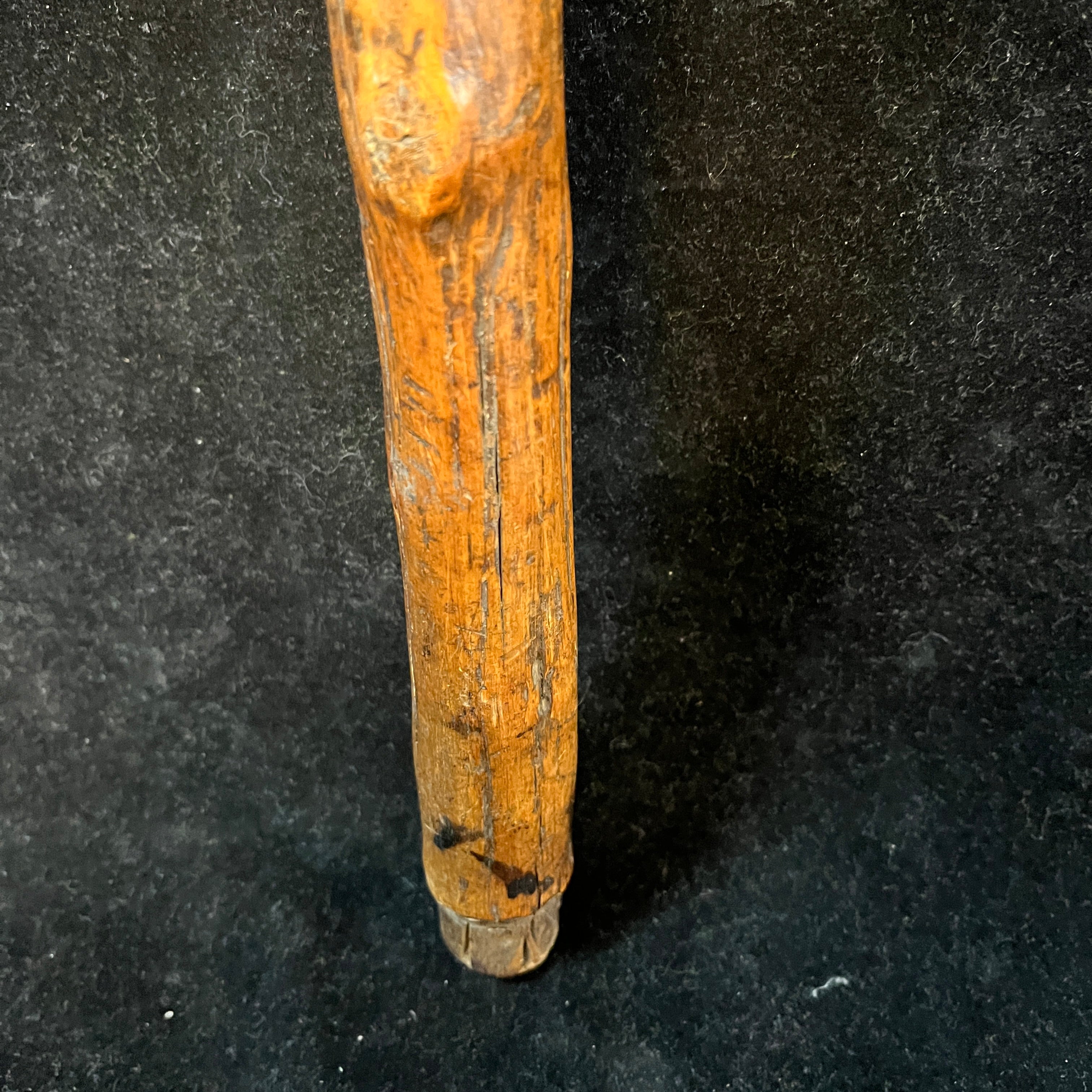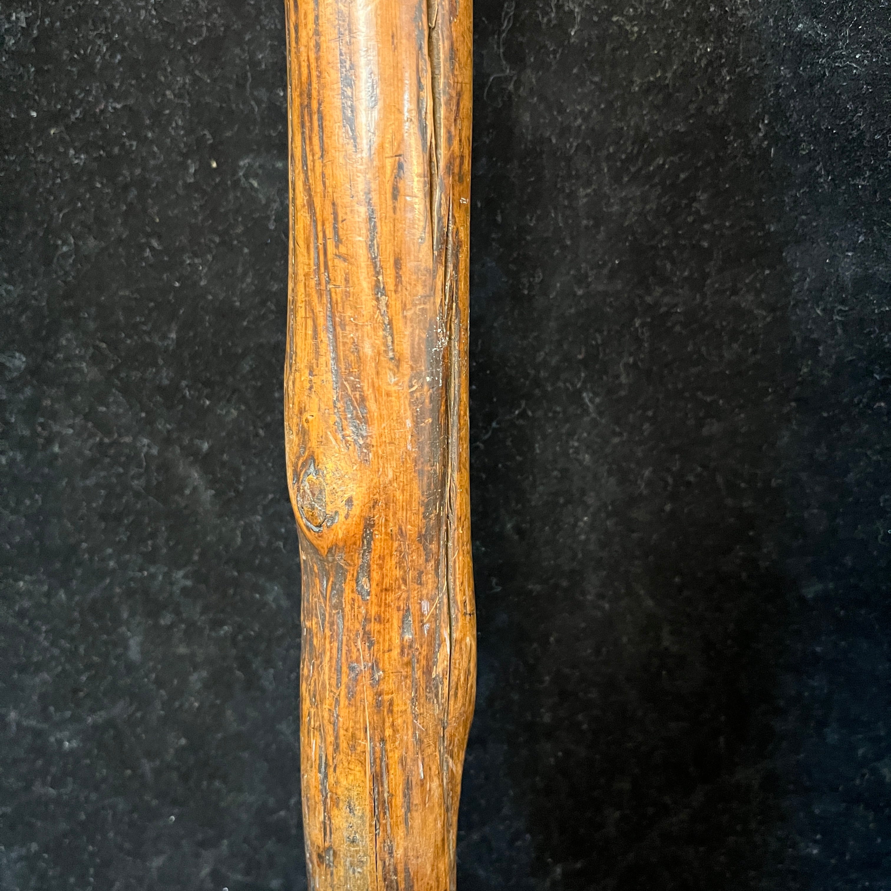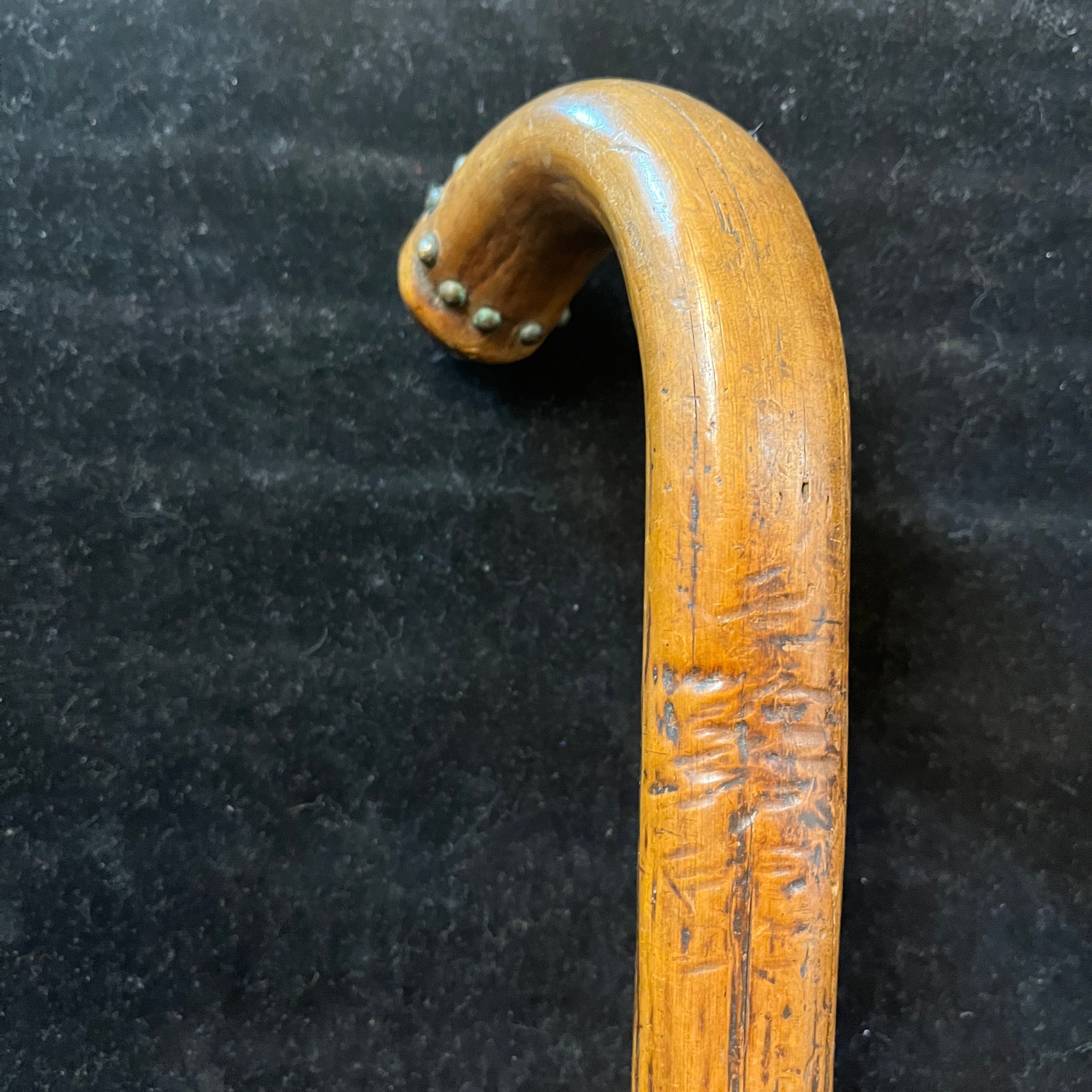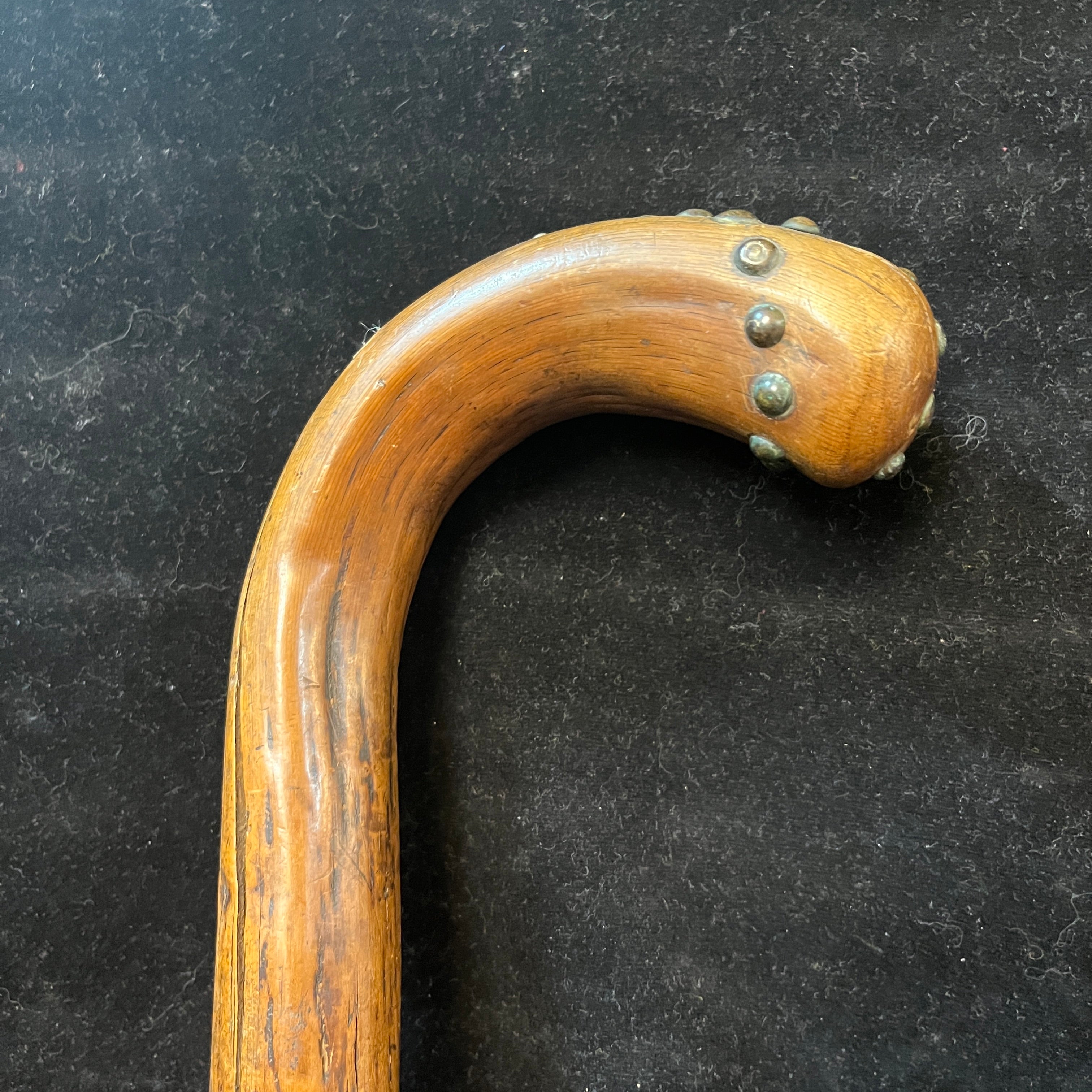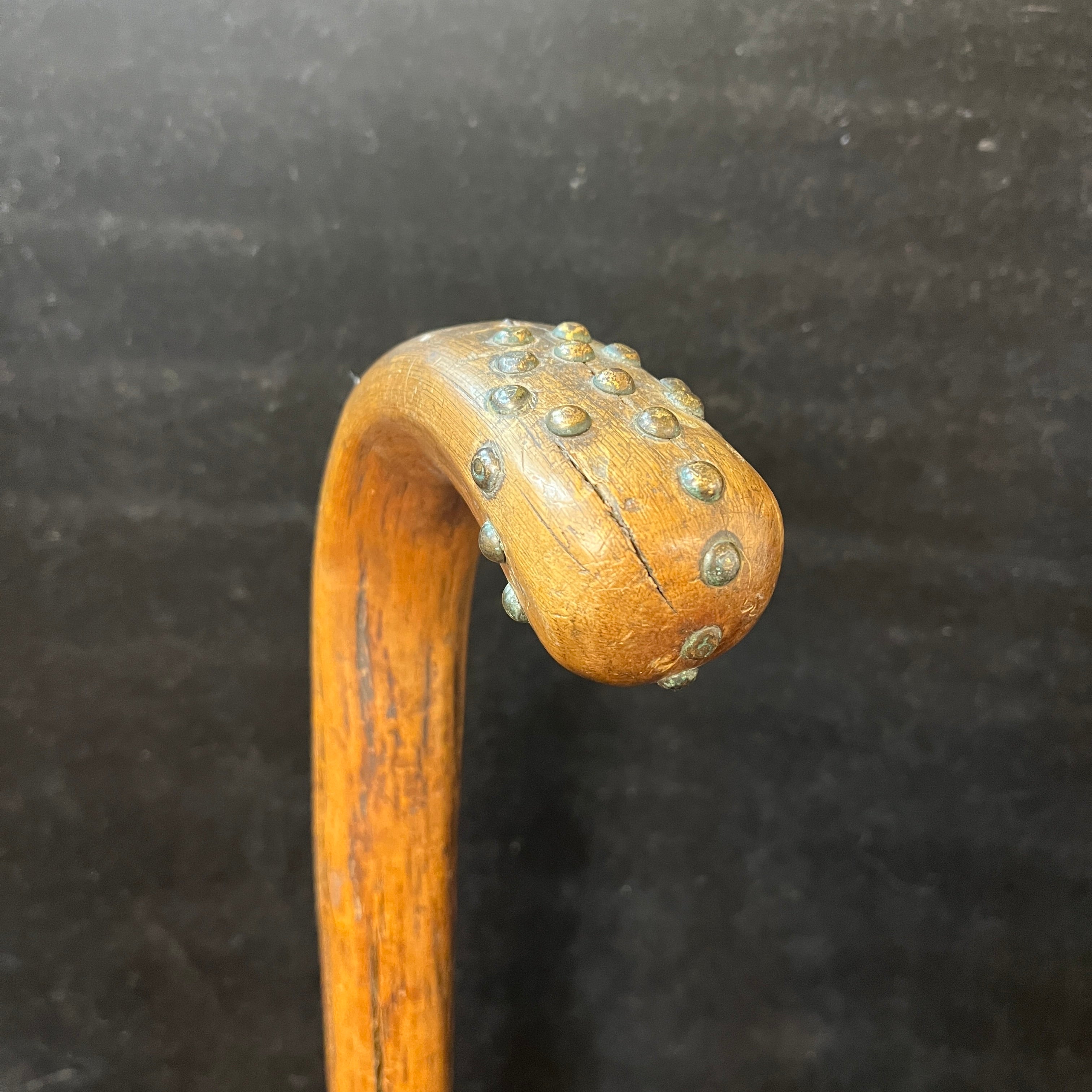 Imponente bastón de madera antiguo con acabo rústico que deja ver sus vetas gruesas y mango curvo. La pieza tiene tacha metálicas en su mango.