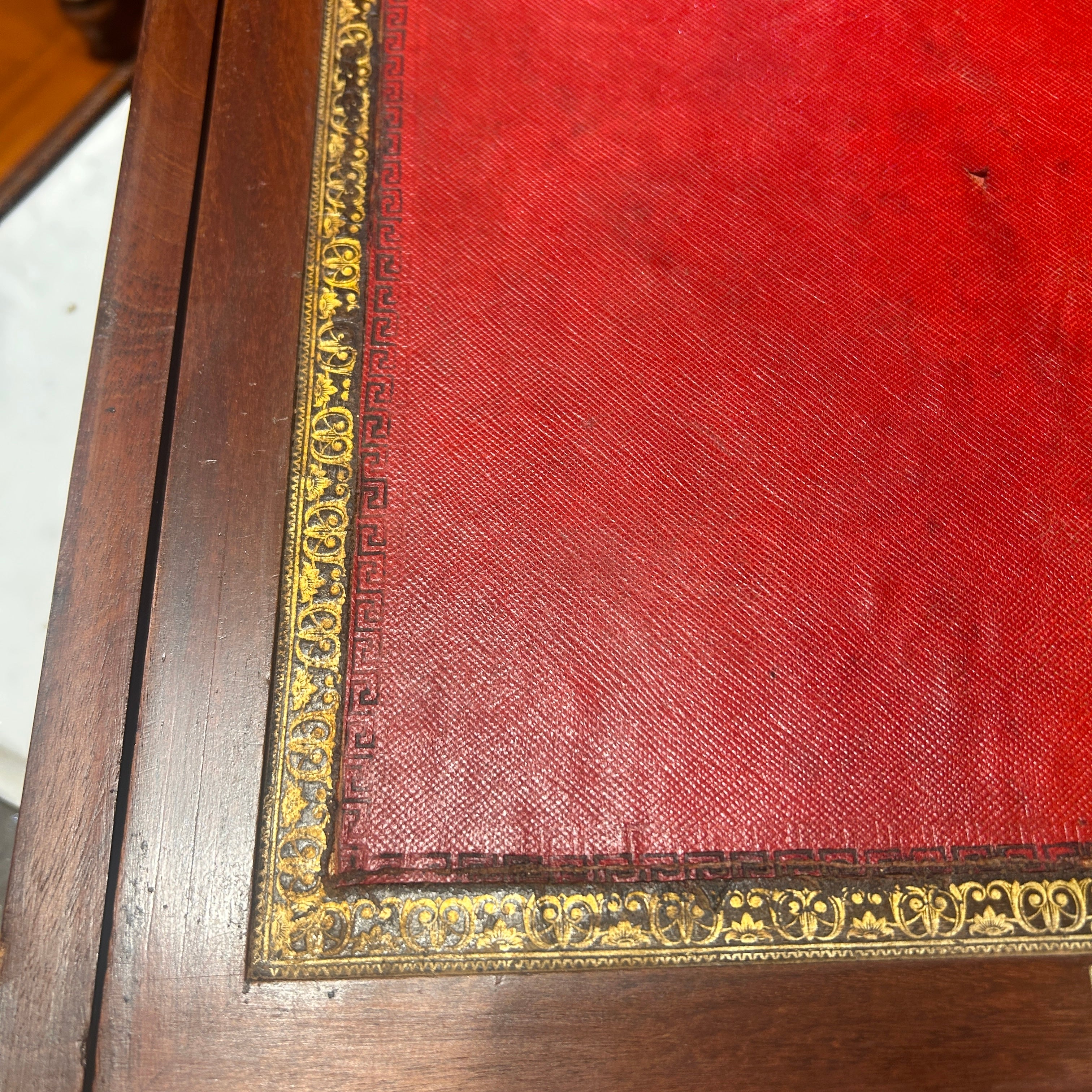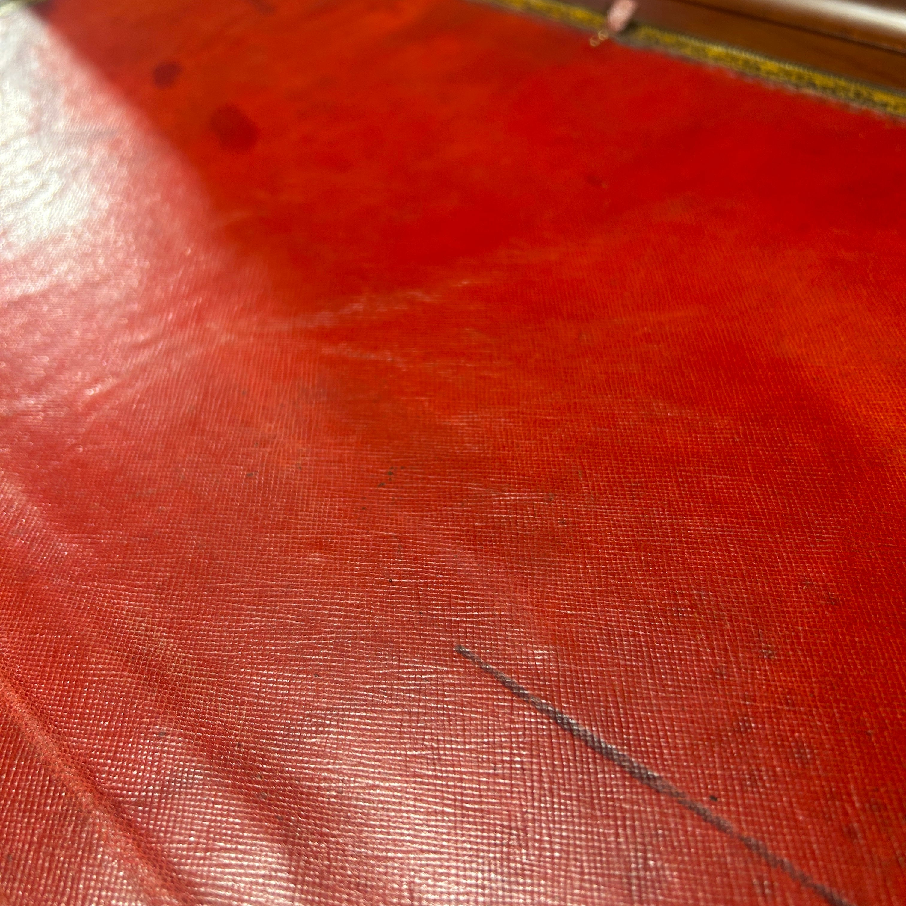 Gran escritorio de viaje o escribanía de origen inglés de fines del s. XIX, en caoba maciza con refuerzos de bronce dorado y latón. Bellísimo atril interior forrado en cuero de color rojo releyendo al oro y espacios para almacenar tintero y pluma, finamente tallados a mano.