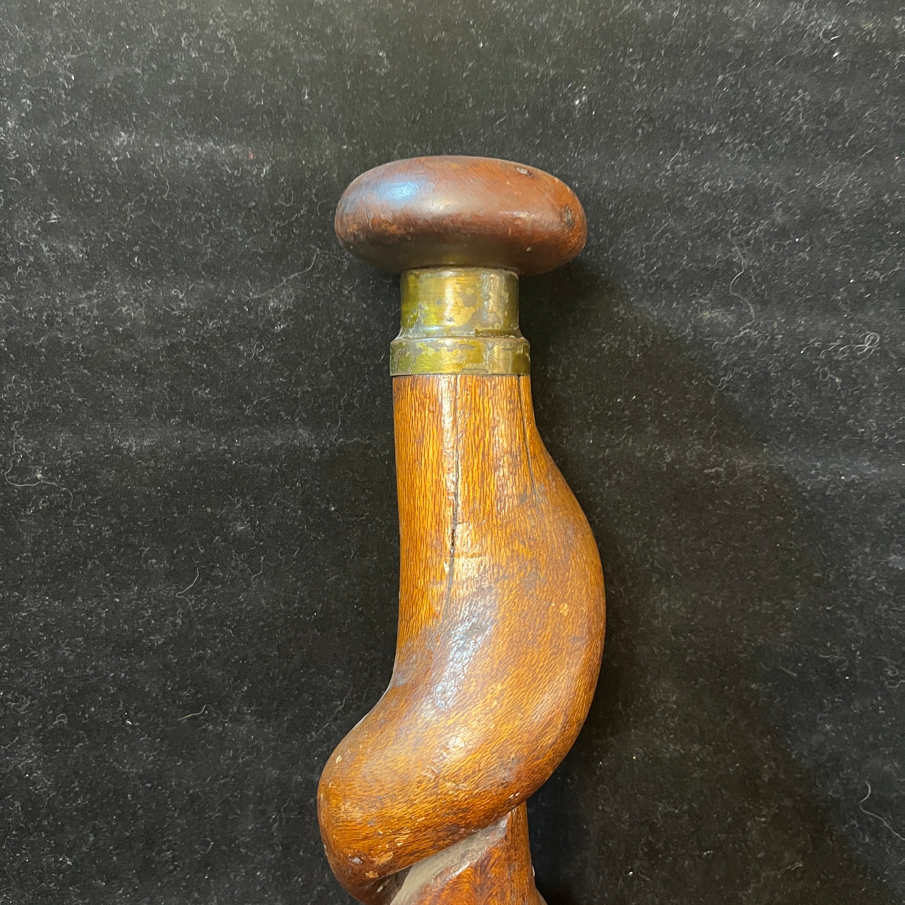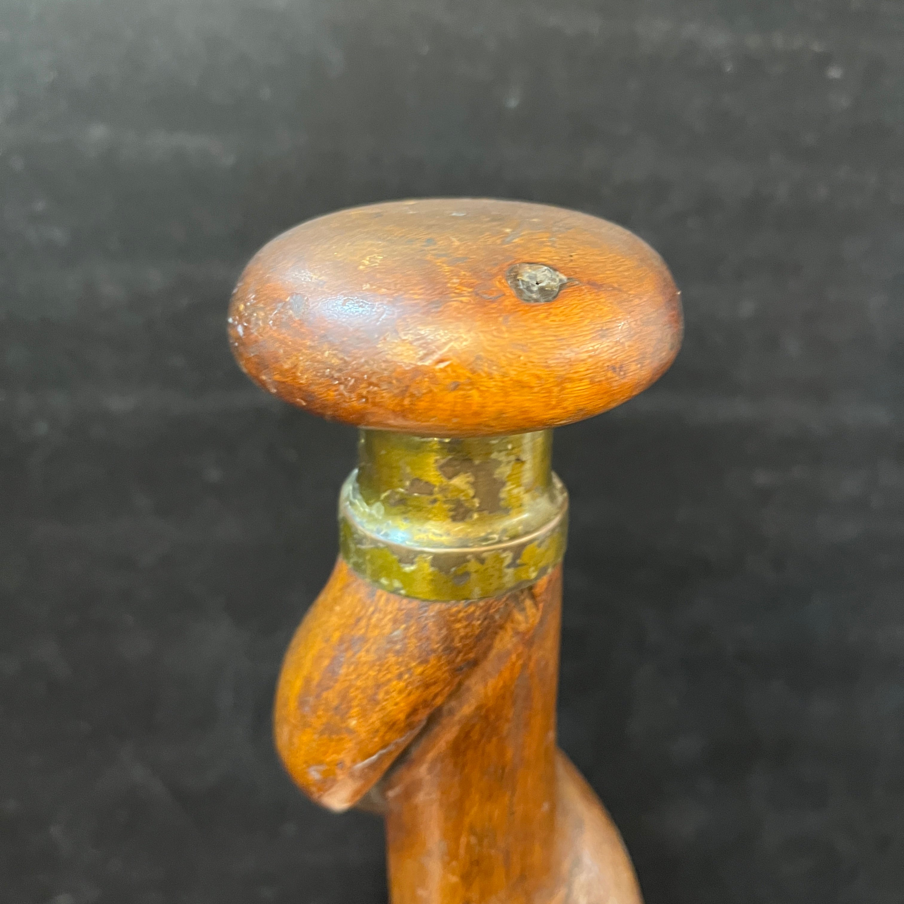 Bastón madera tallada en curva mango redondo y bronce