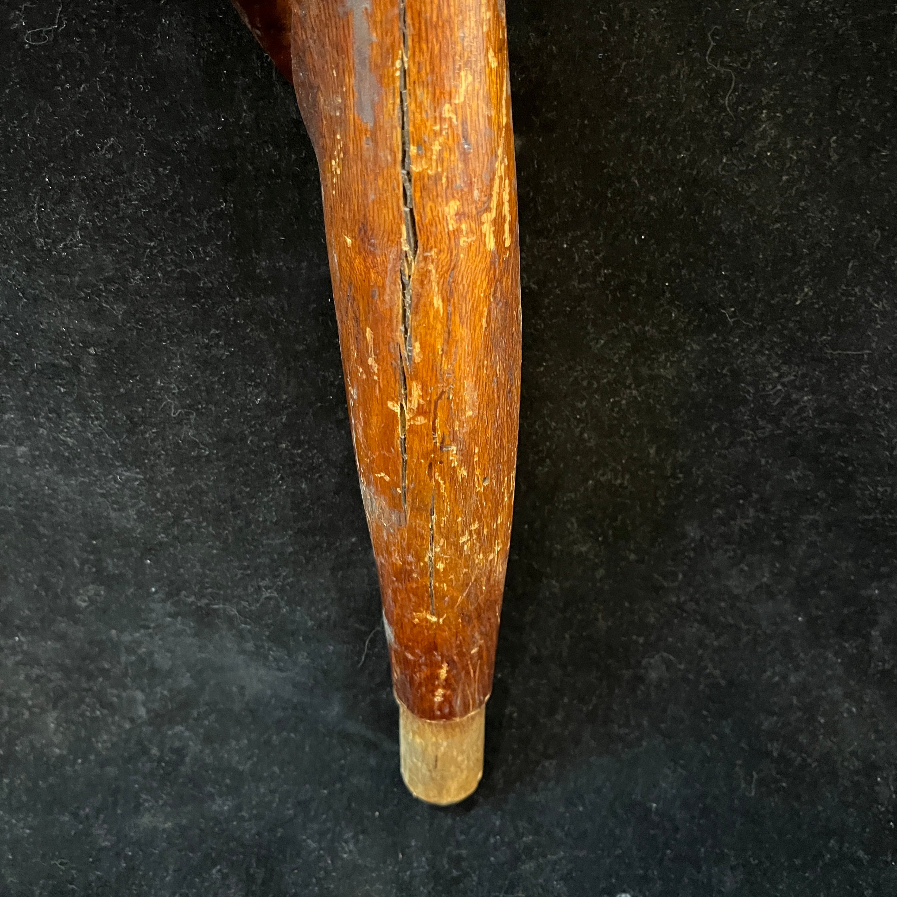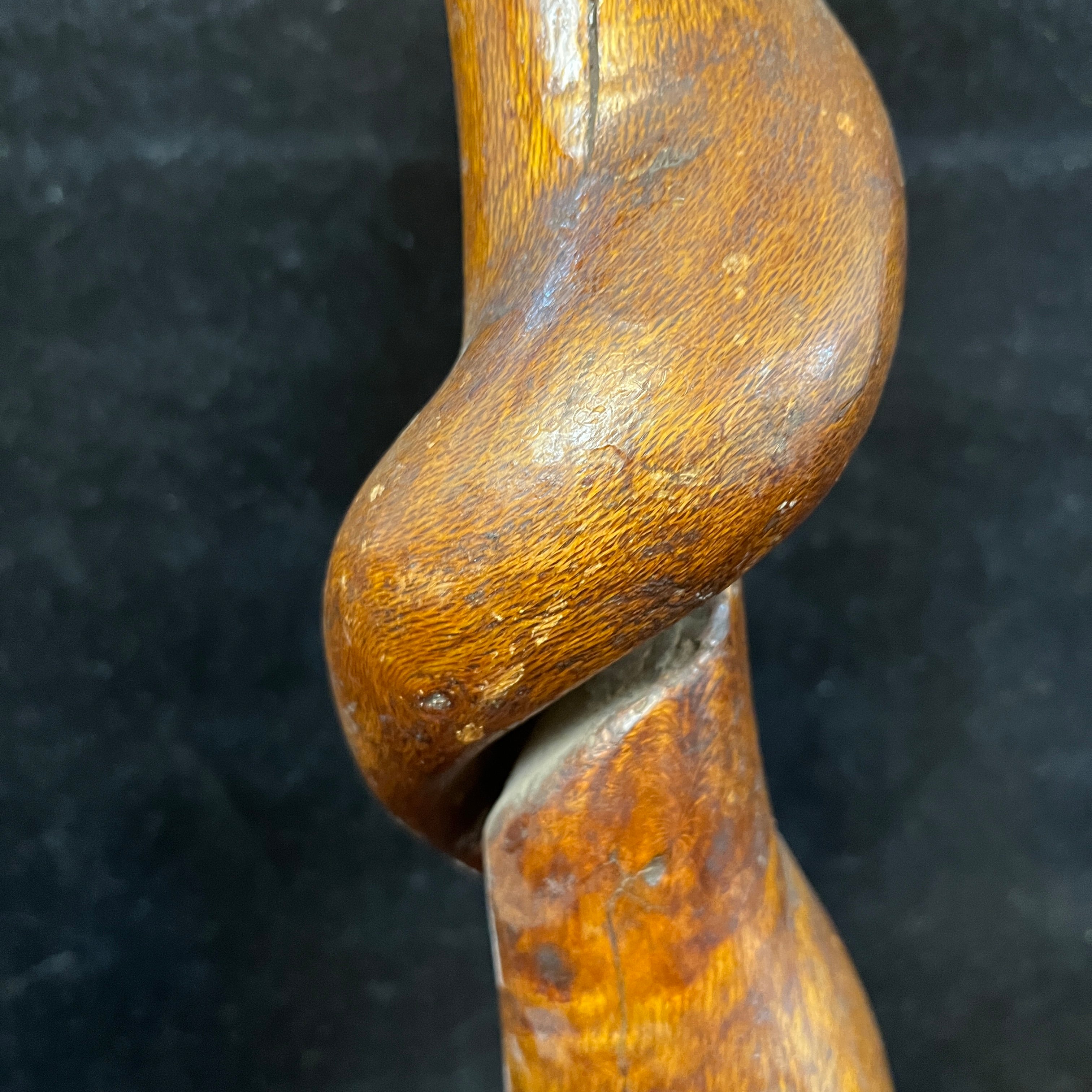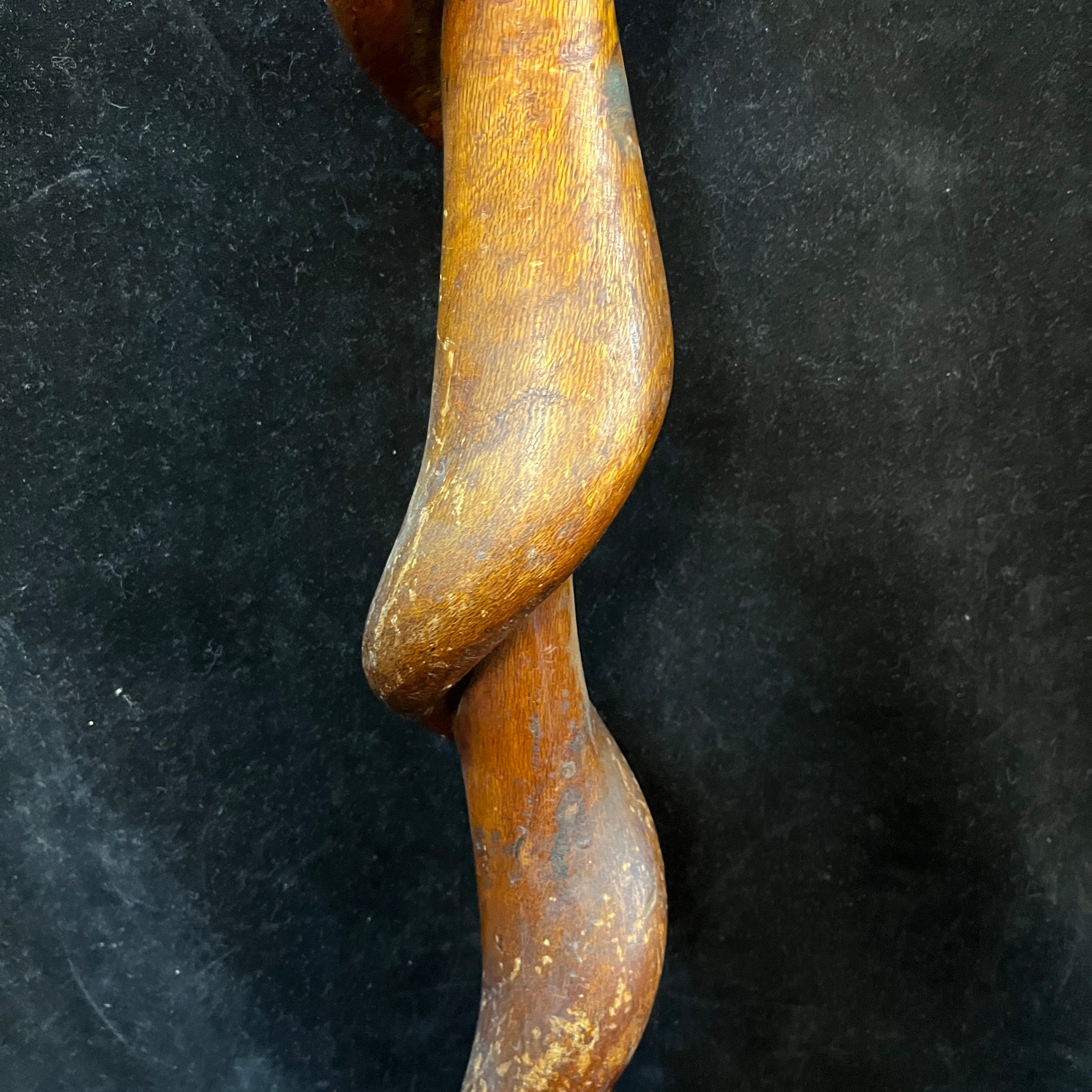 Llamativo bastón de madera tallada en una sola pieza, con diseño curvo y grueso, con vetas notorias, dándole un acabado rústico. El mango redondo tiene una pieza de bronce que lo separa del resto del bastón. Se trata de una pieza que mezcla lo funcional y lo escultórico. Su taco es de plomo.