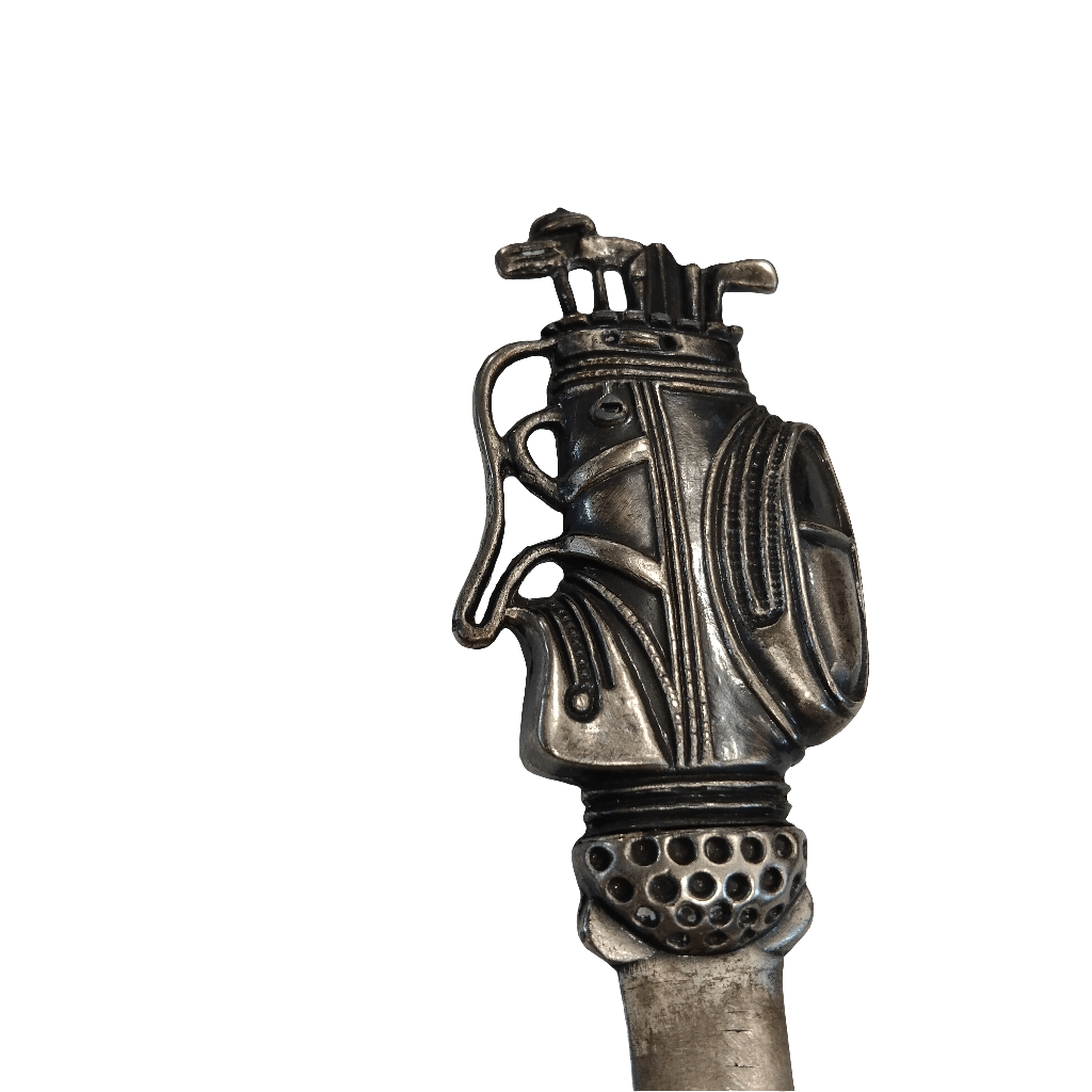 Llamativo abrecartas de metal plateado con el mango tallado en forma de bolso de golf, son los diferentes palos asomándose.