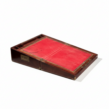 Gran escritorio de viaje o escribanía en caoba con refuerzos de latón; interior forrado en cuero; fabricación inglesa fin XIX;
