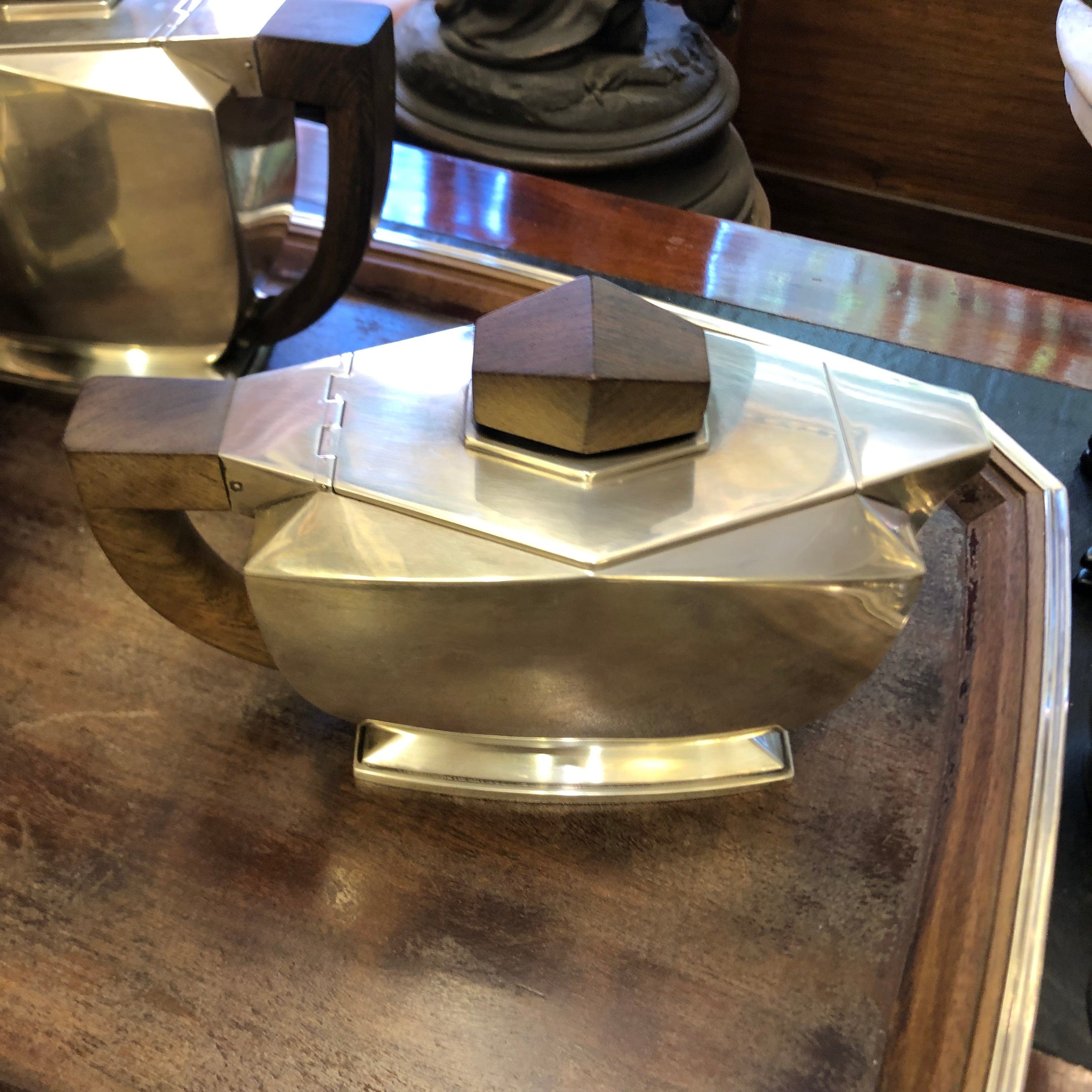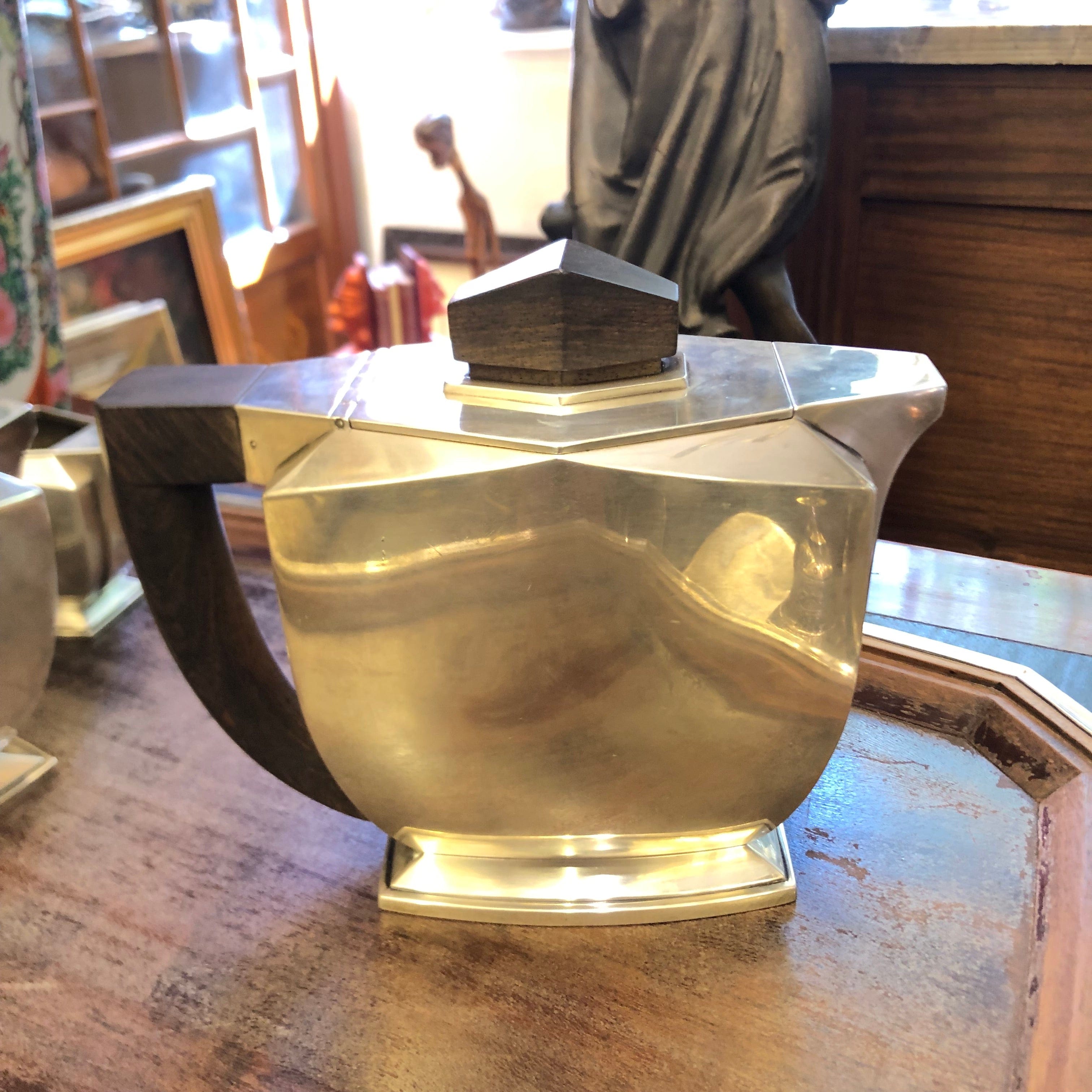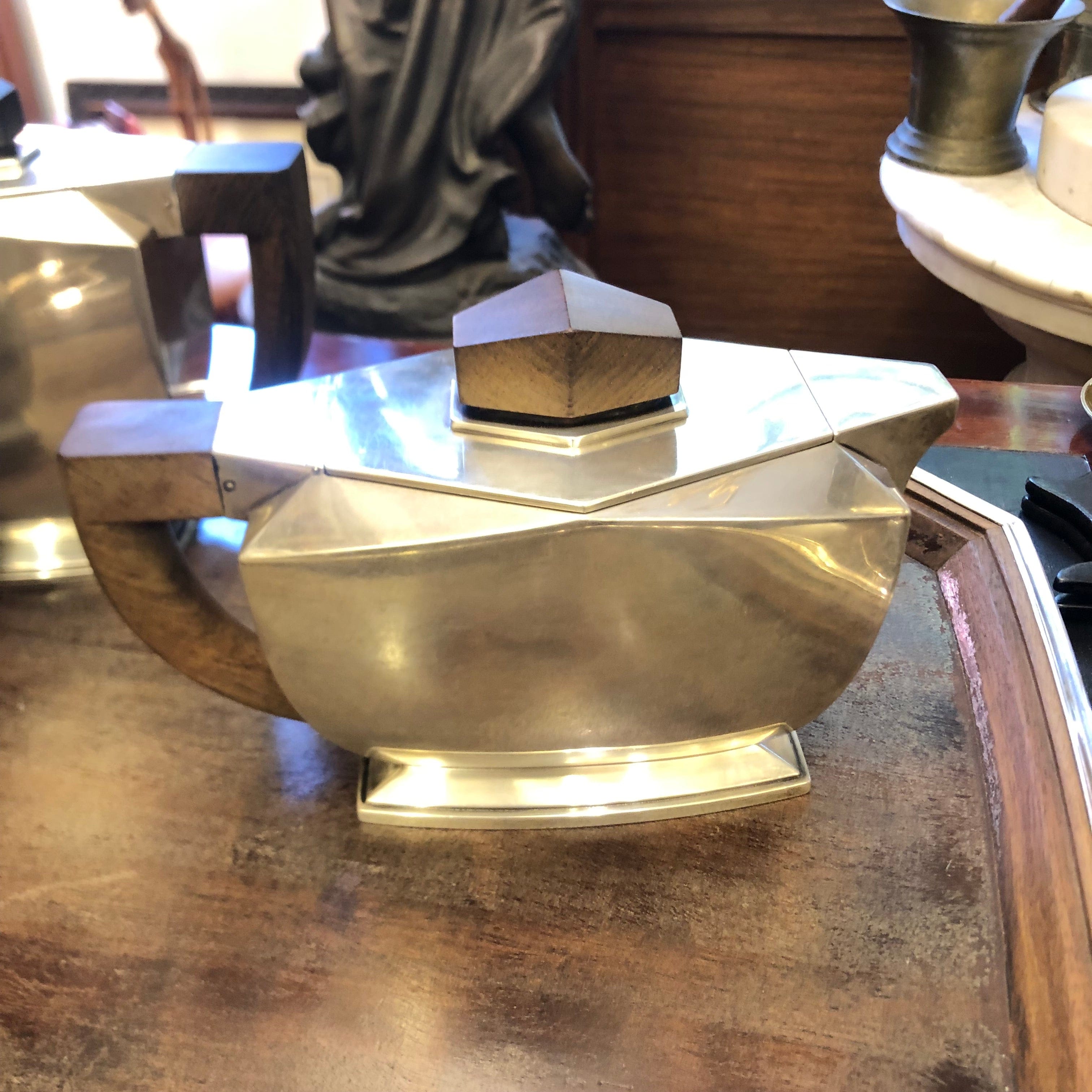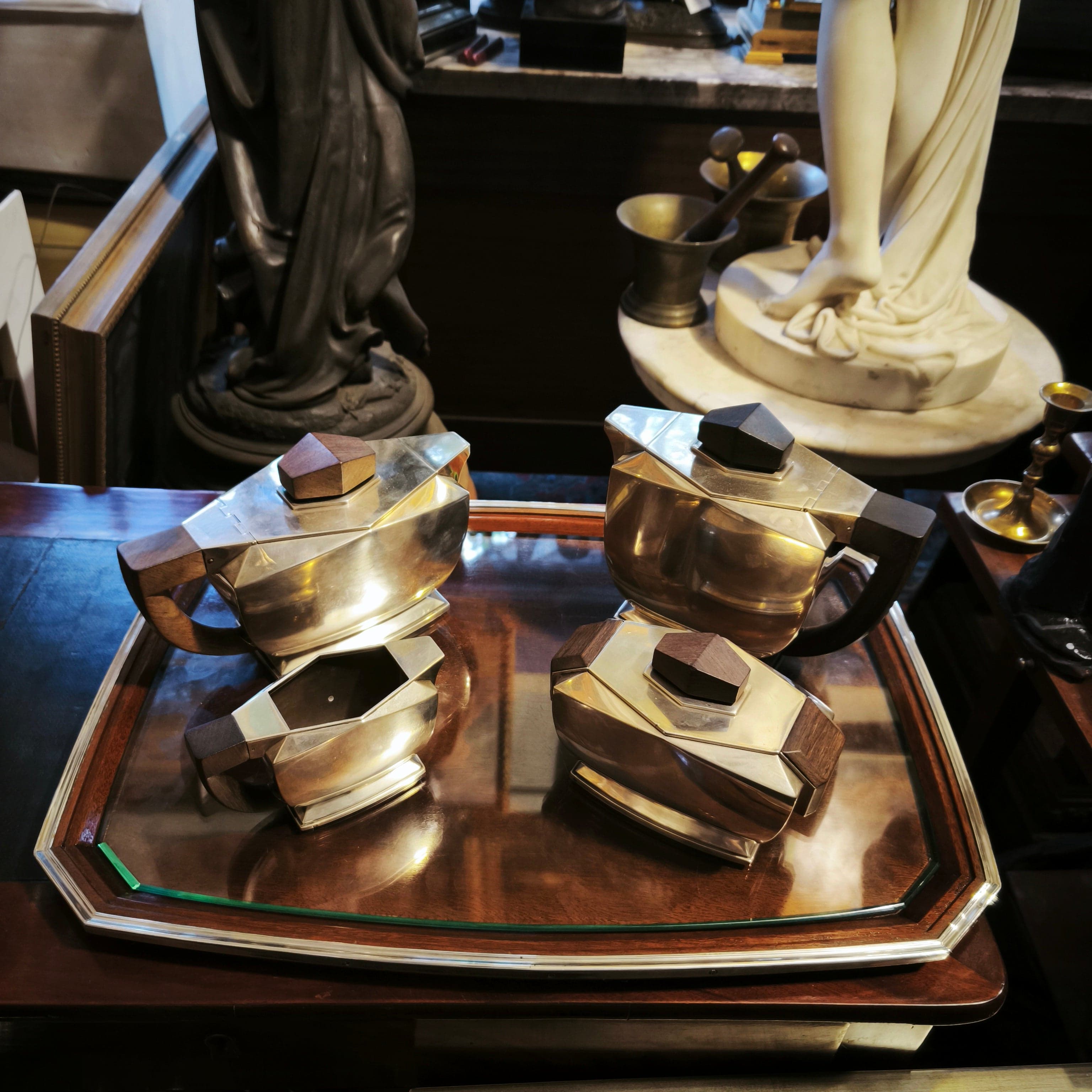 Juego de te en plata y madera de la prestigiosa marca francesa Tétard Frères, son cinco piezas: una bandeja, lechero, azucarero, cafetera y tetera de té, diseño Art Deco.