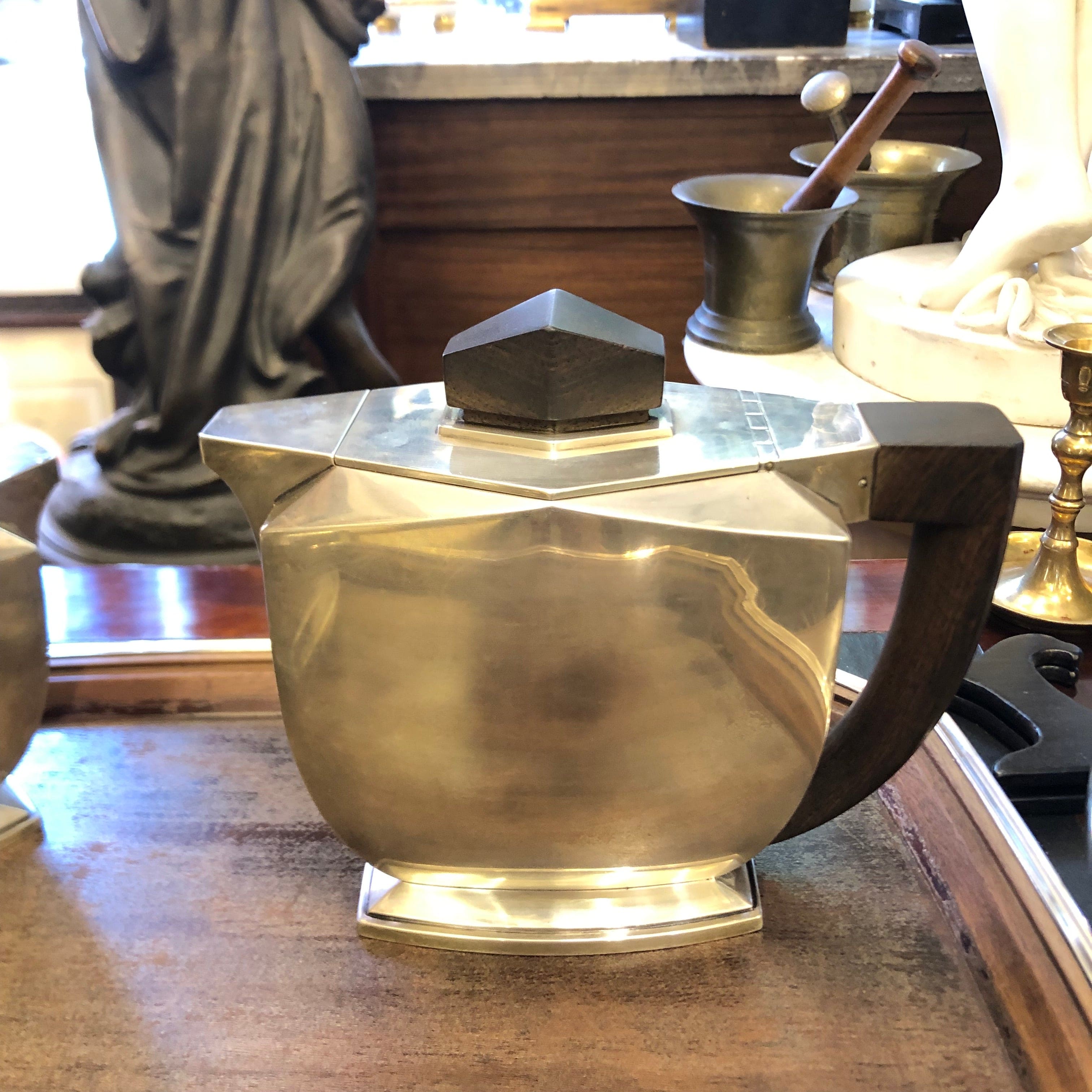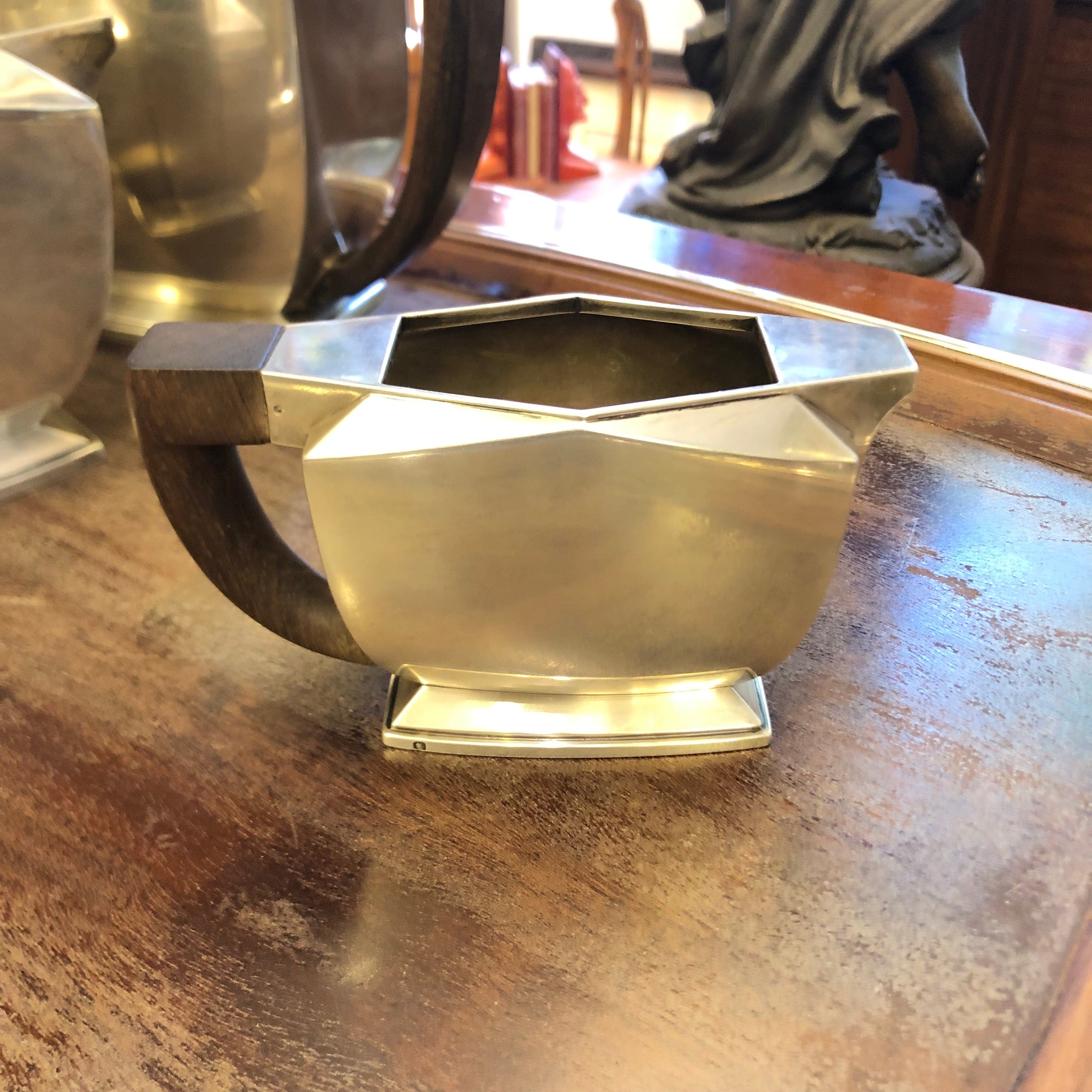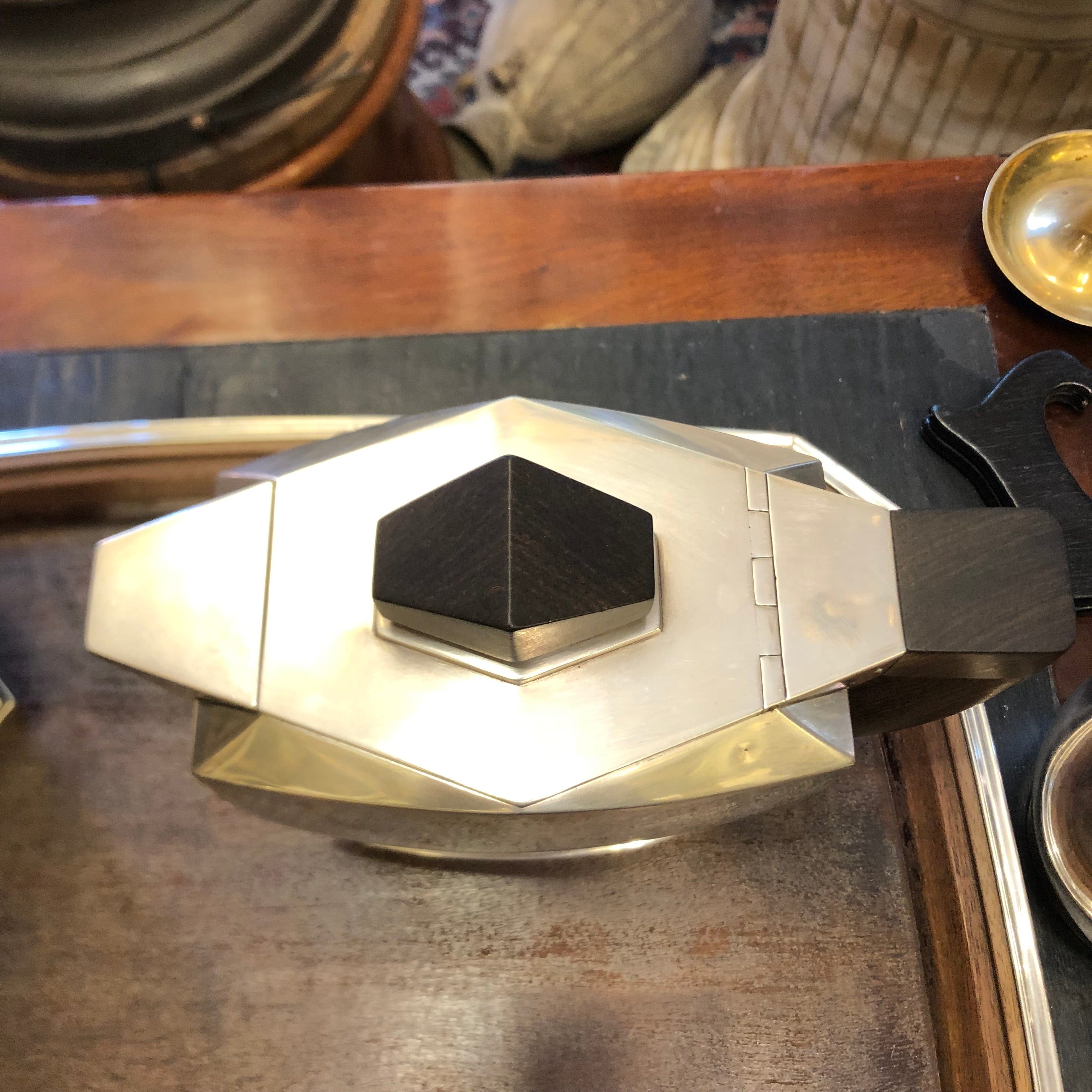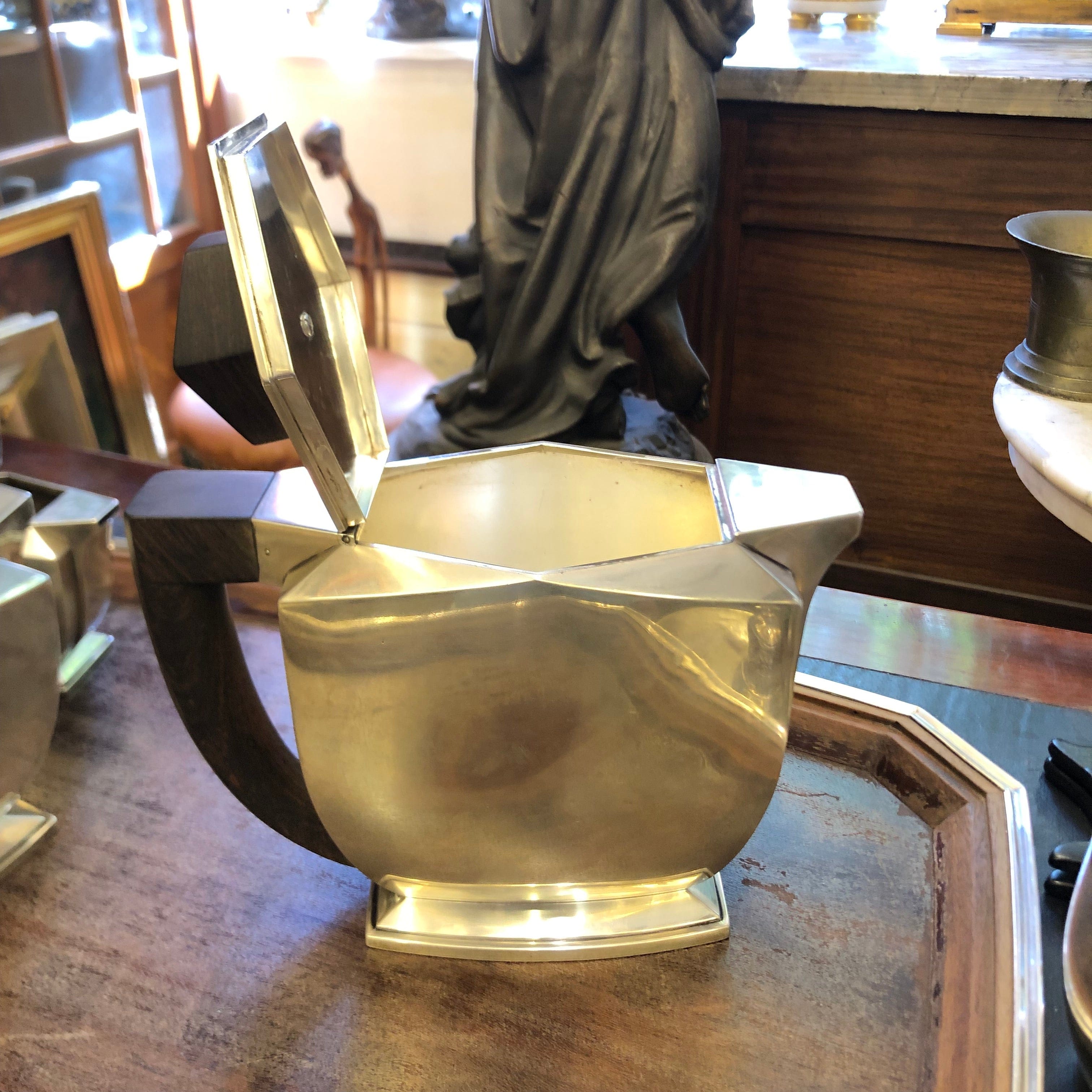 Juego de te en plata y madera de la prestigiosa marca francesa Tétard Frères, son cinco piezas: una bandeja, lechero, azucarero, cafetera y tetera de té, diseño Art Deco.