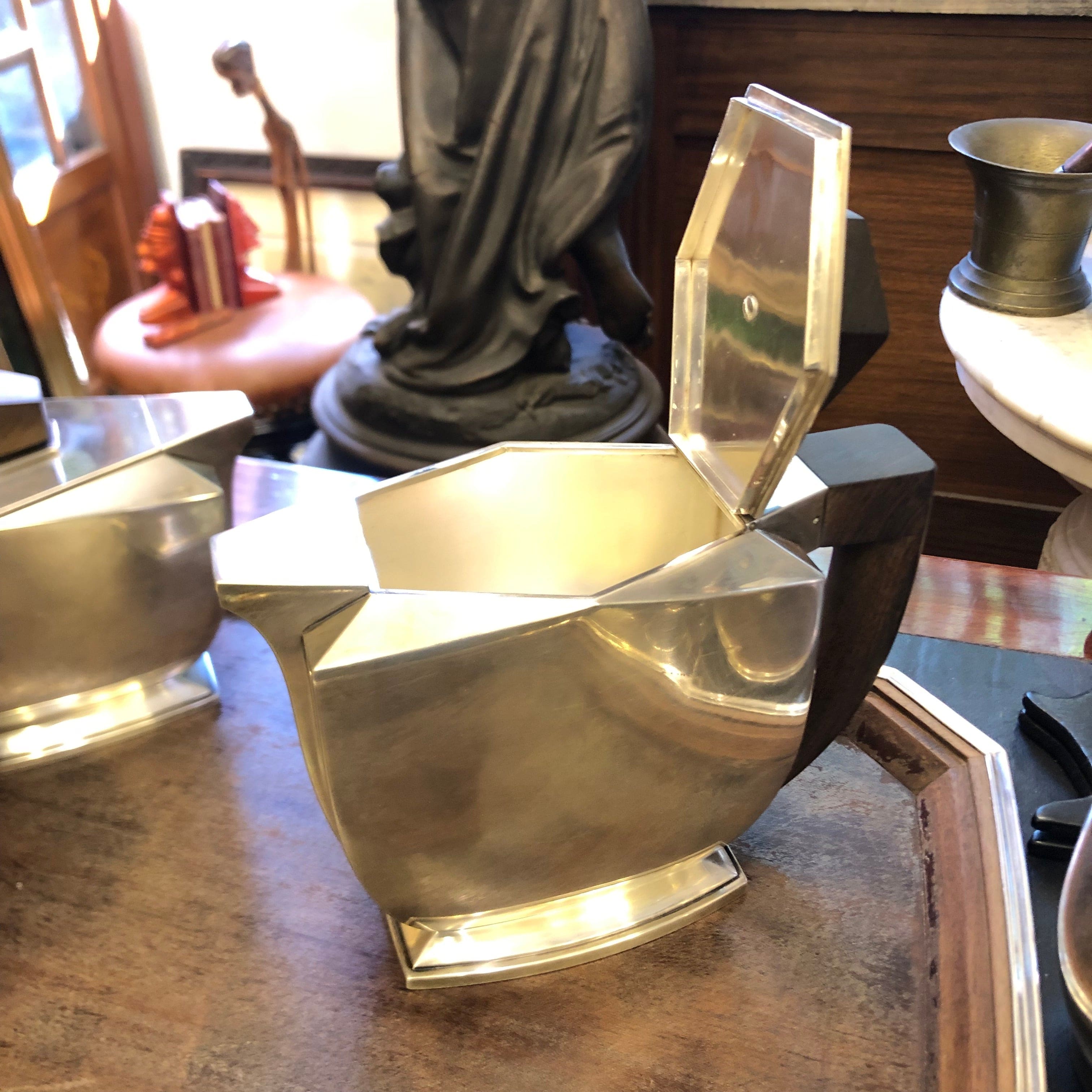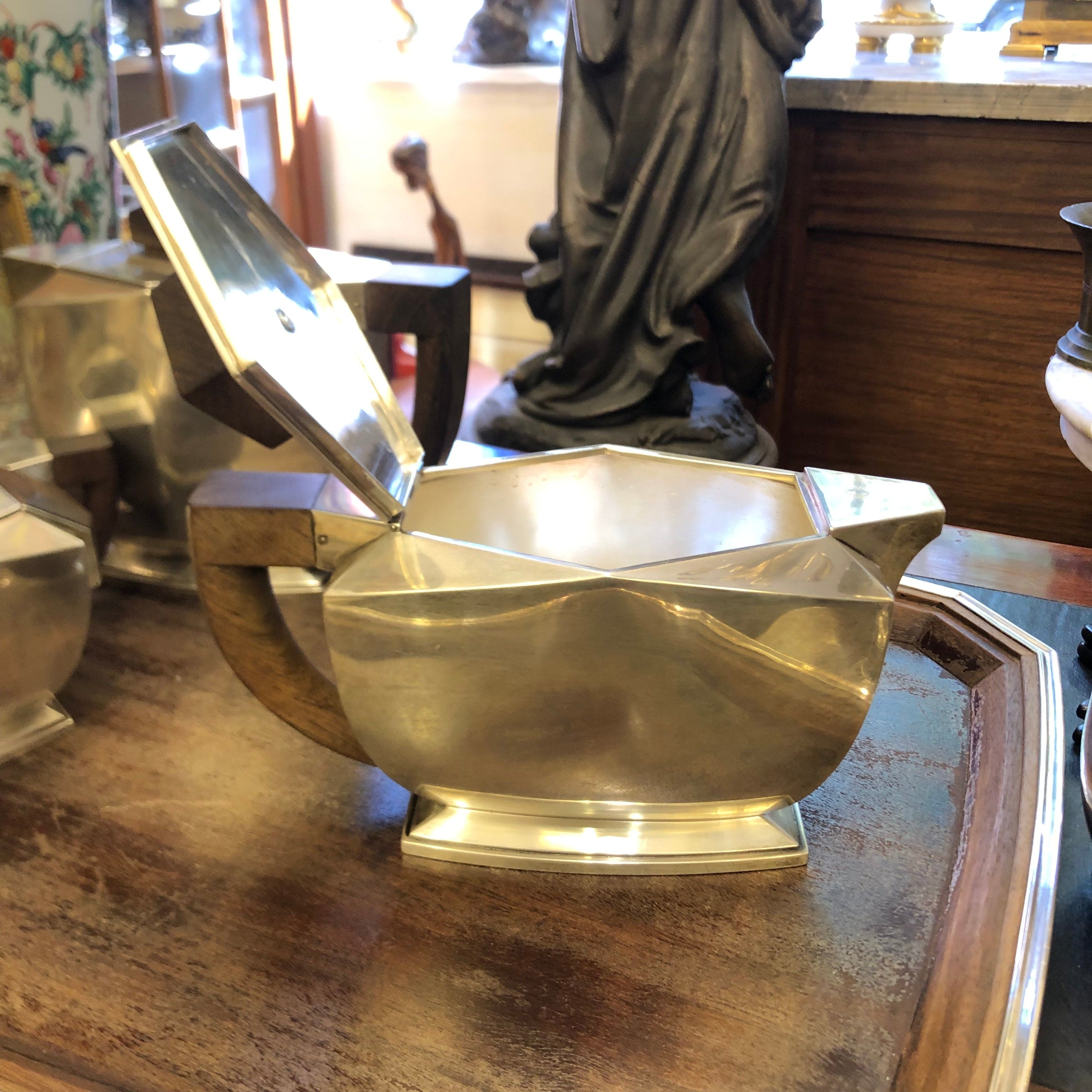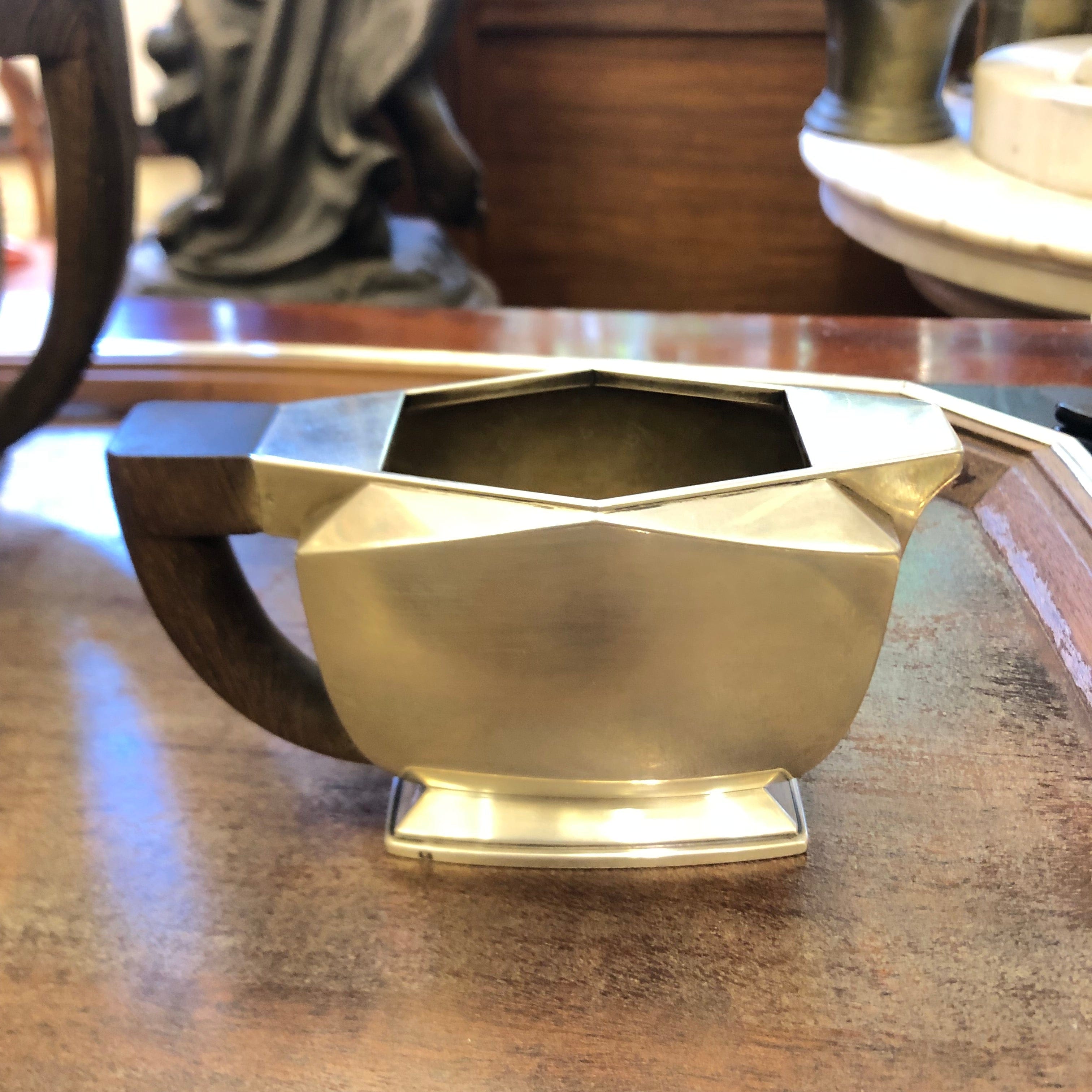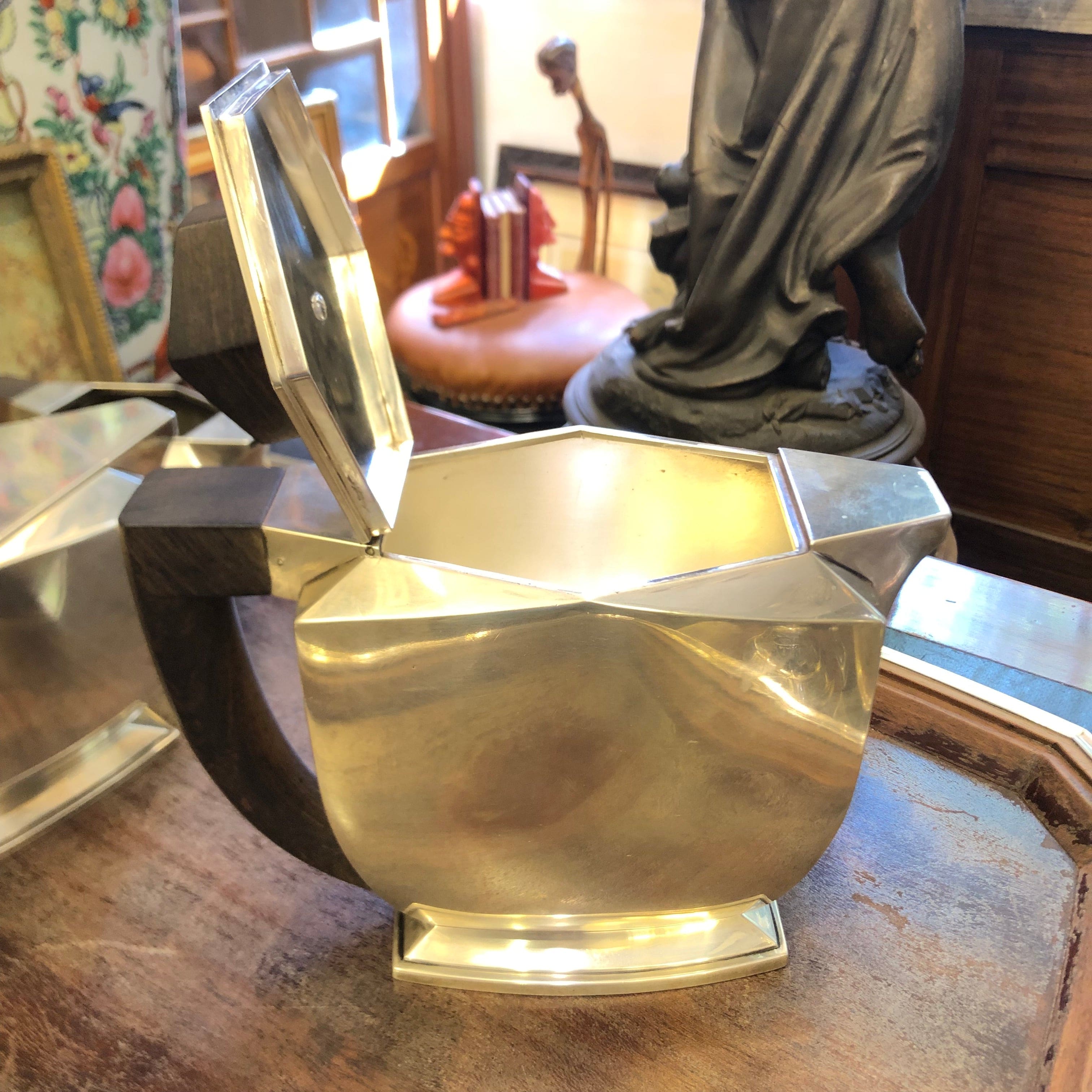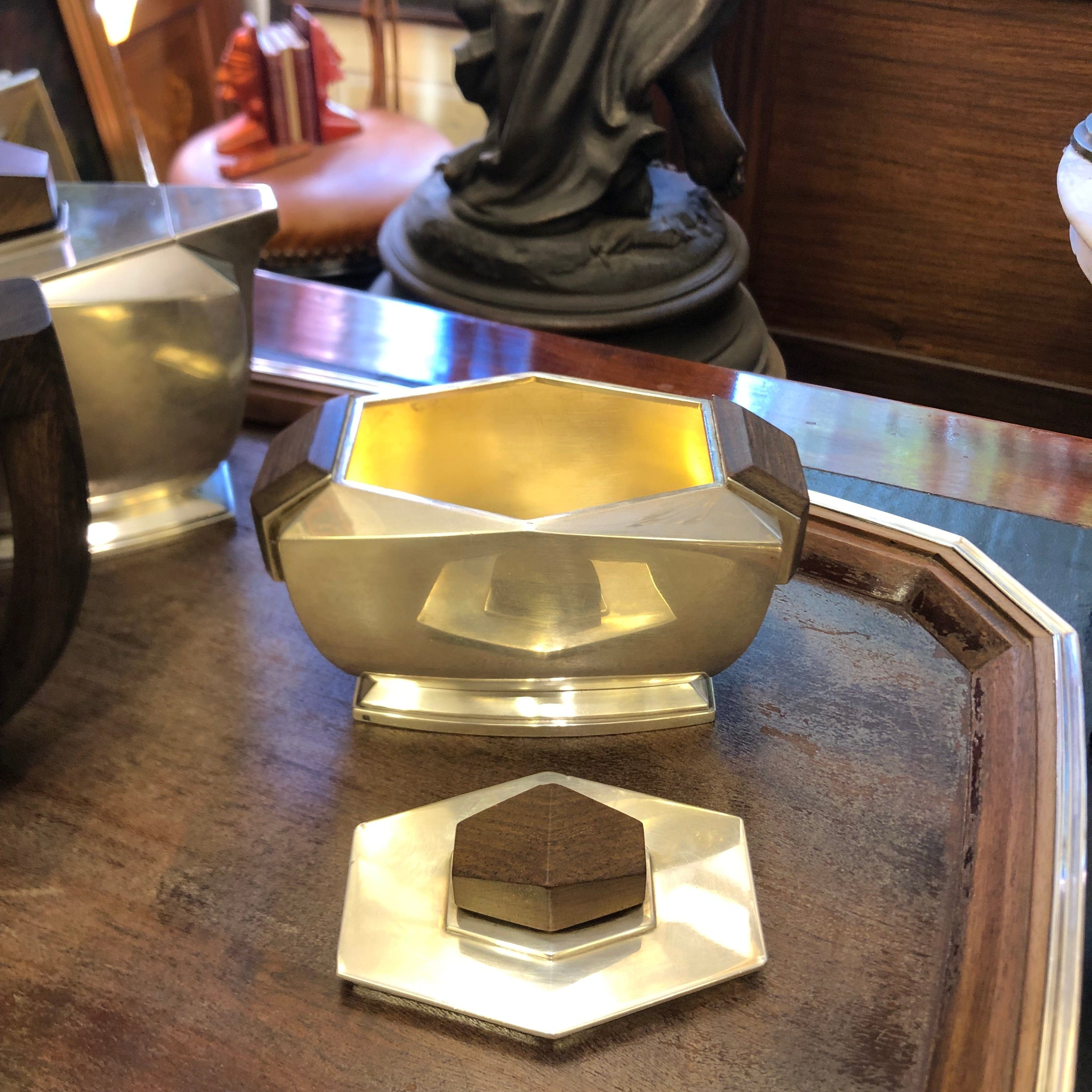 Juego de te en plata y madera de la prestigiosa marca francesa Tétard Frères, son cinco piezas: una bandeja, lechero, azucarero, cafetera y tetera de té, diseño Art Deco.