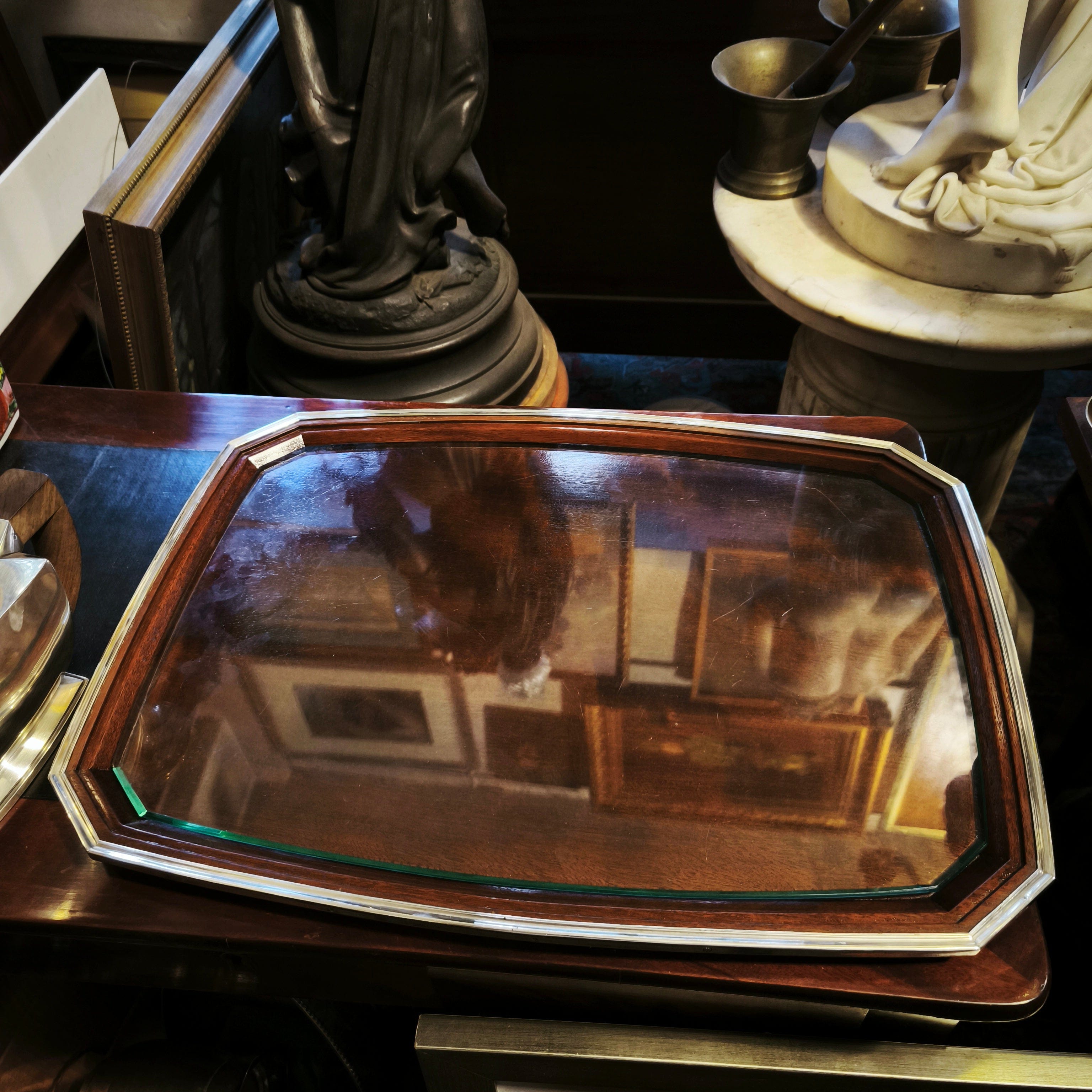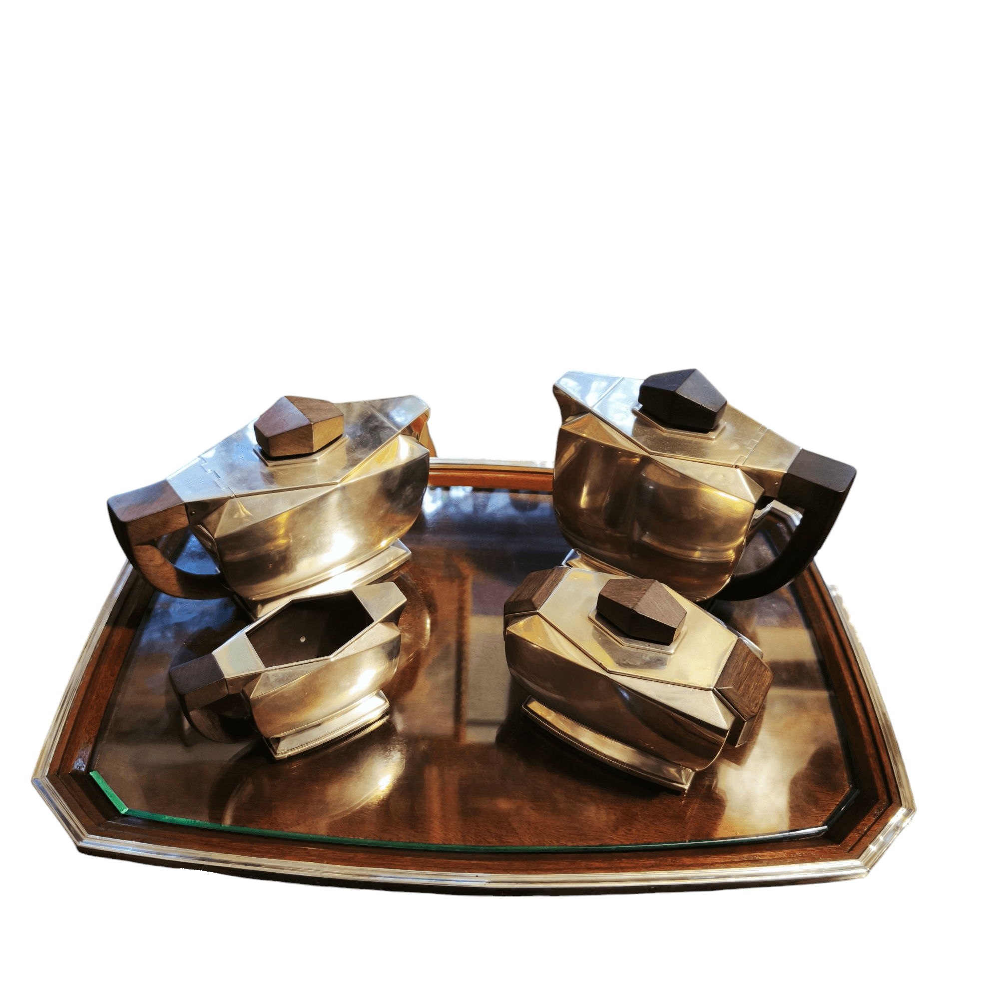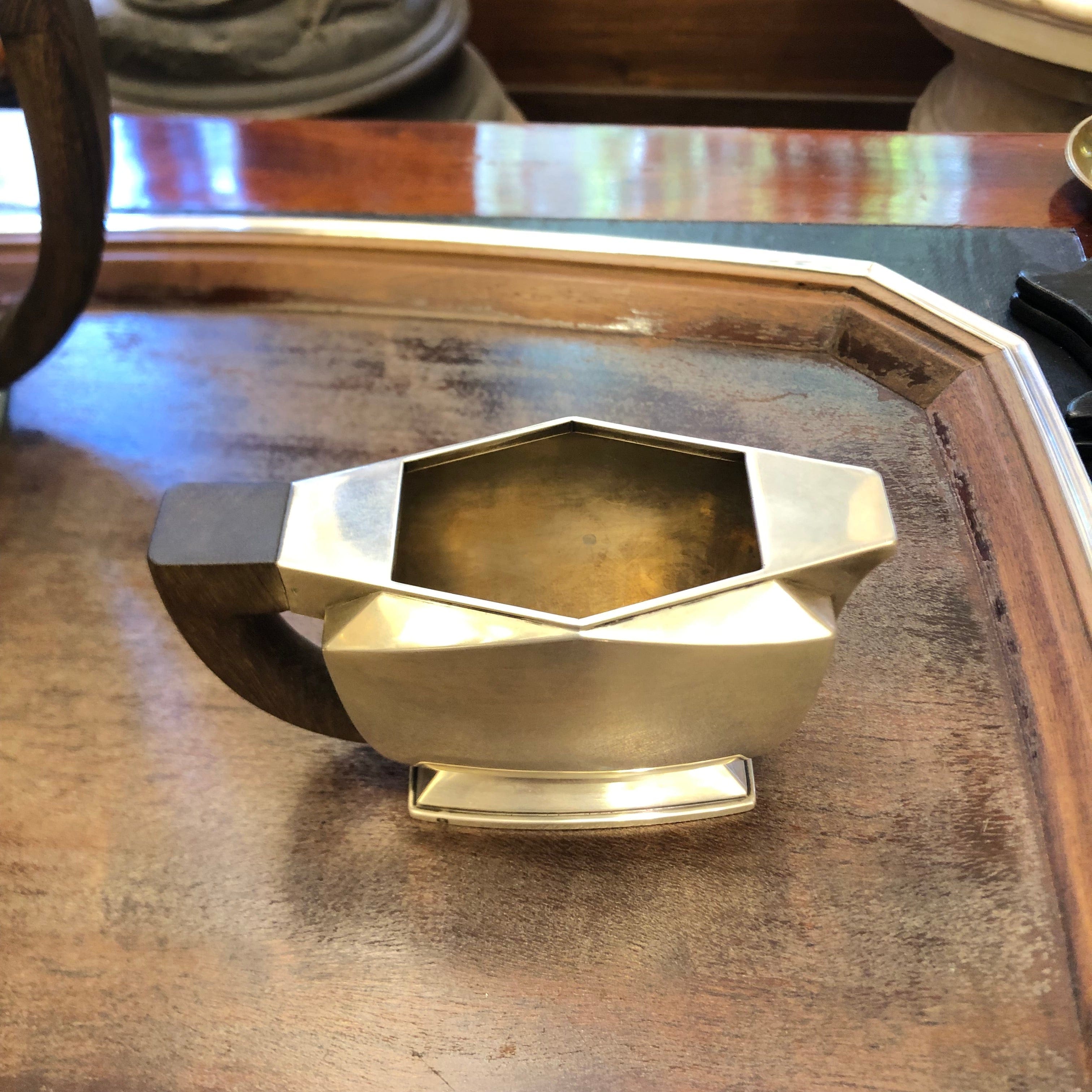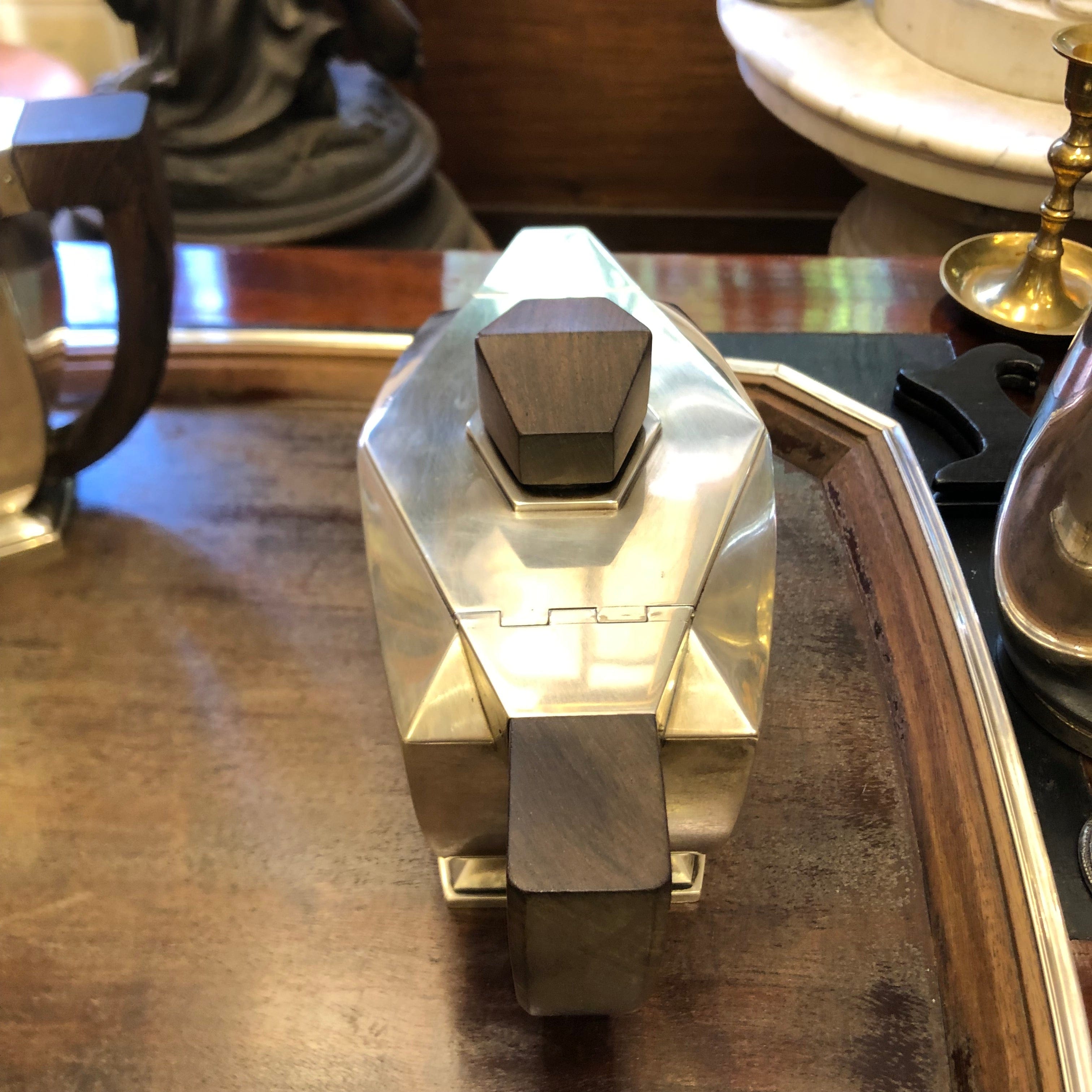 Juego de te en plata y madera de la prestigiosa marca francesa Tétard Frères, son cinco piezas: una bandeja, lechero, azucarero, cafetera y tetera de té, diseño Art Deco.