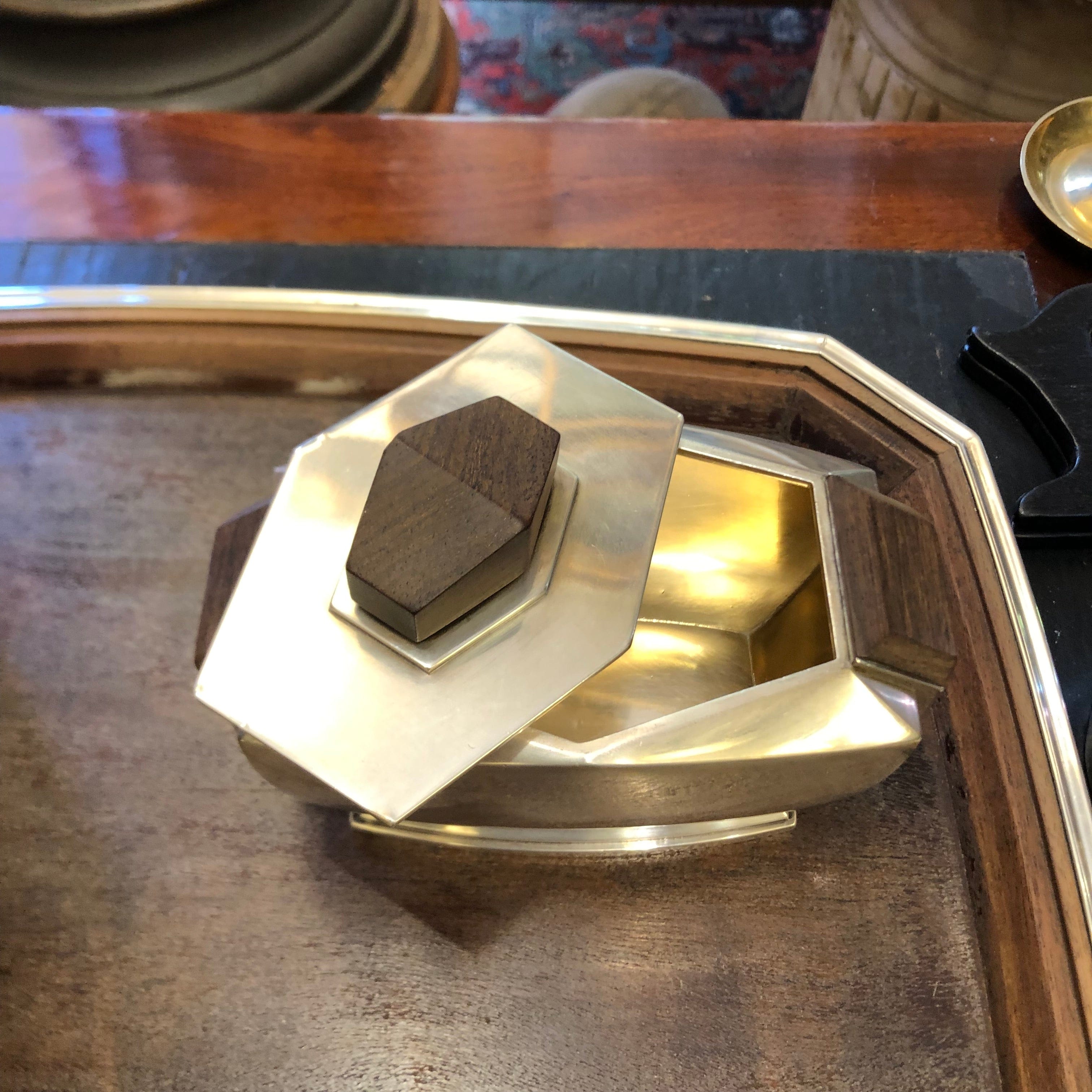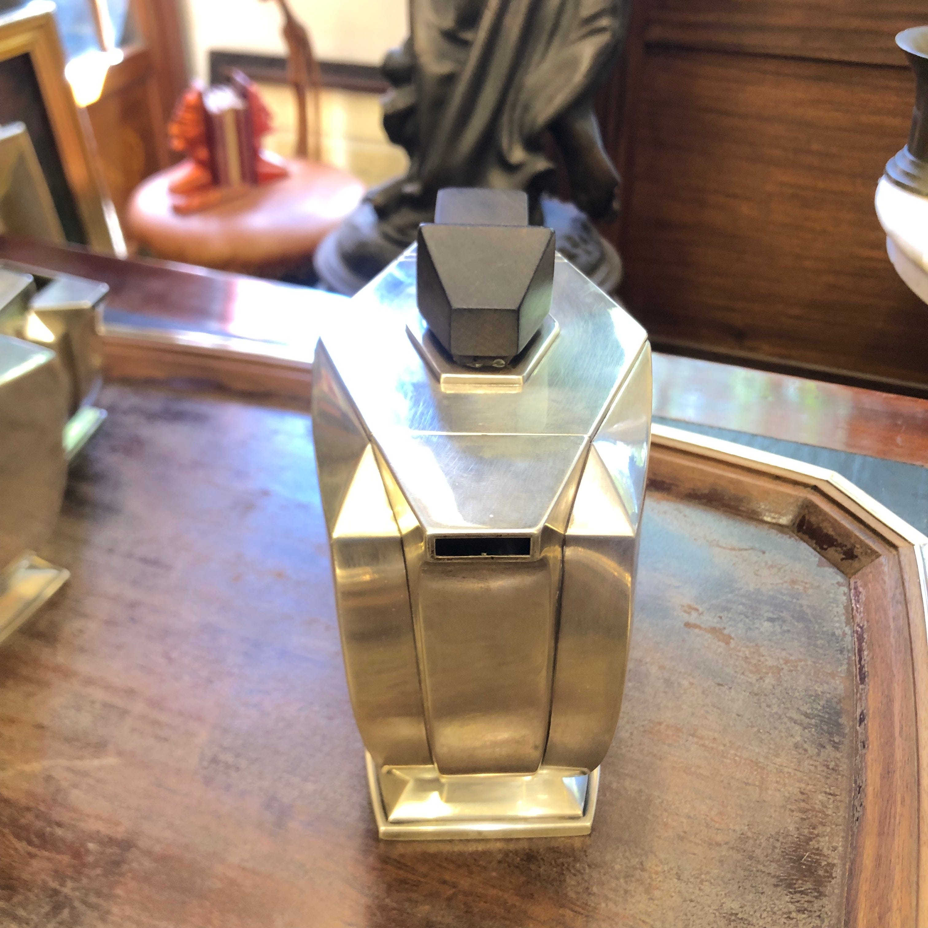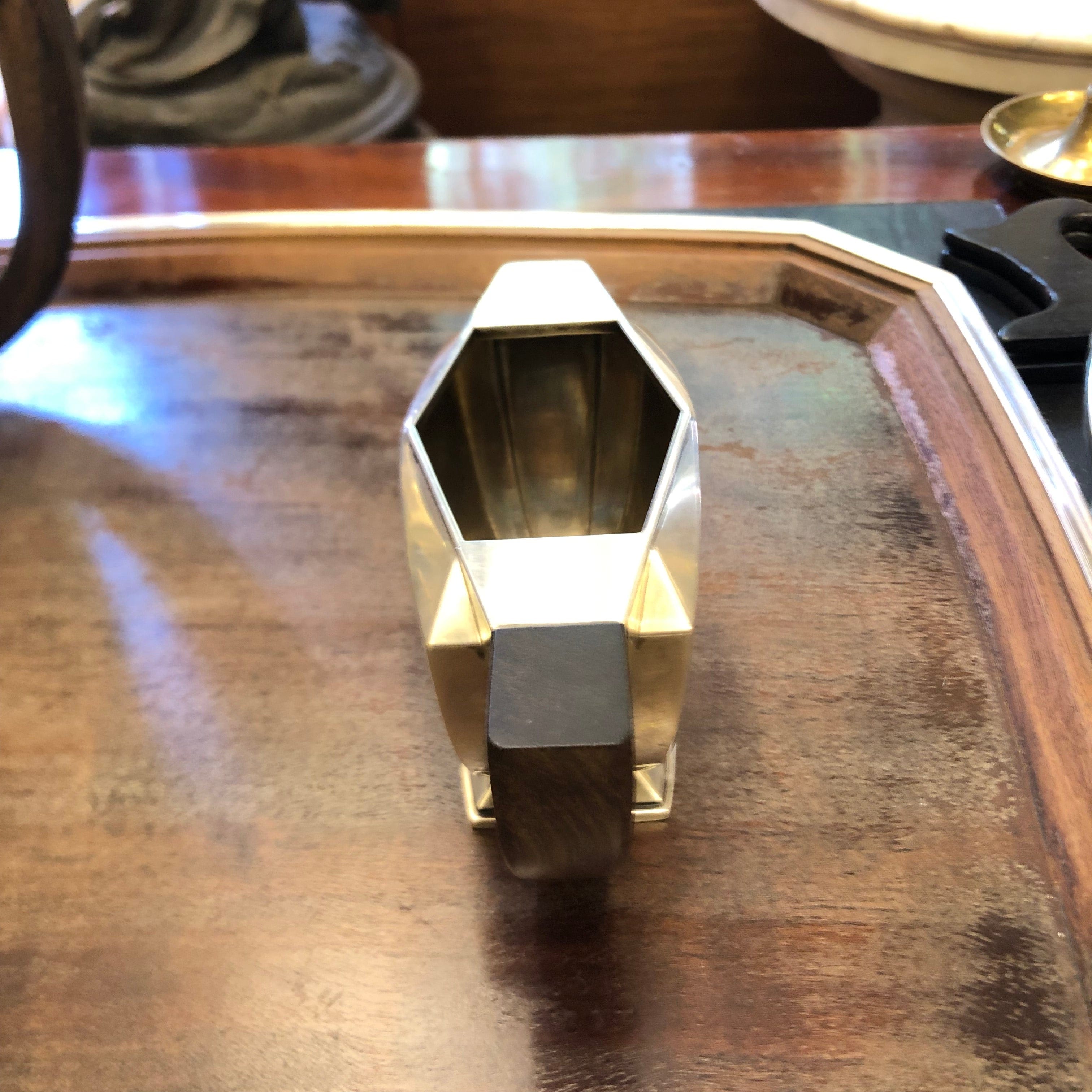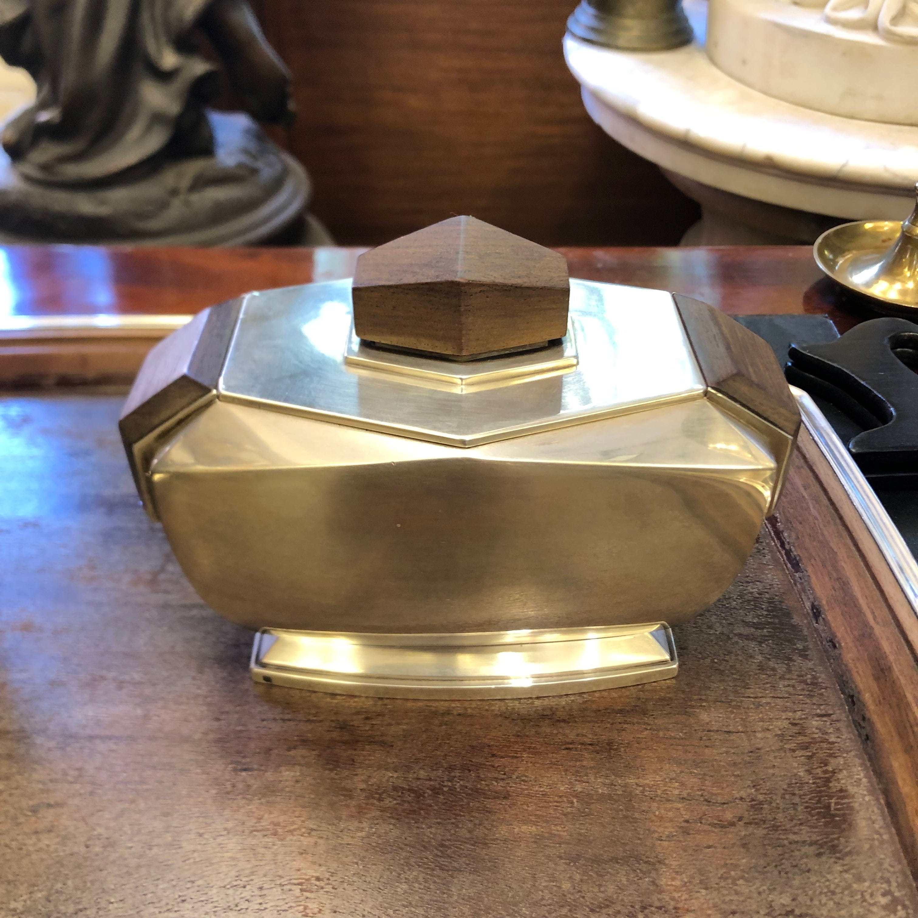 Juego de te en plata y madera de la prestigiosa marca francesa Tétard Frères, son cinco piezas: una bandeja, lechero, azucarero, cafetera y tetera de té, diseño Art Deco.
