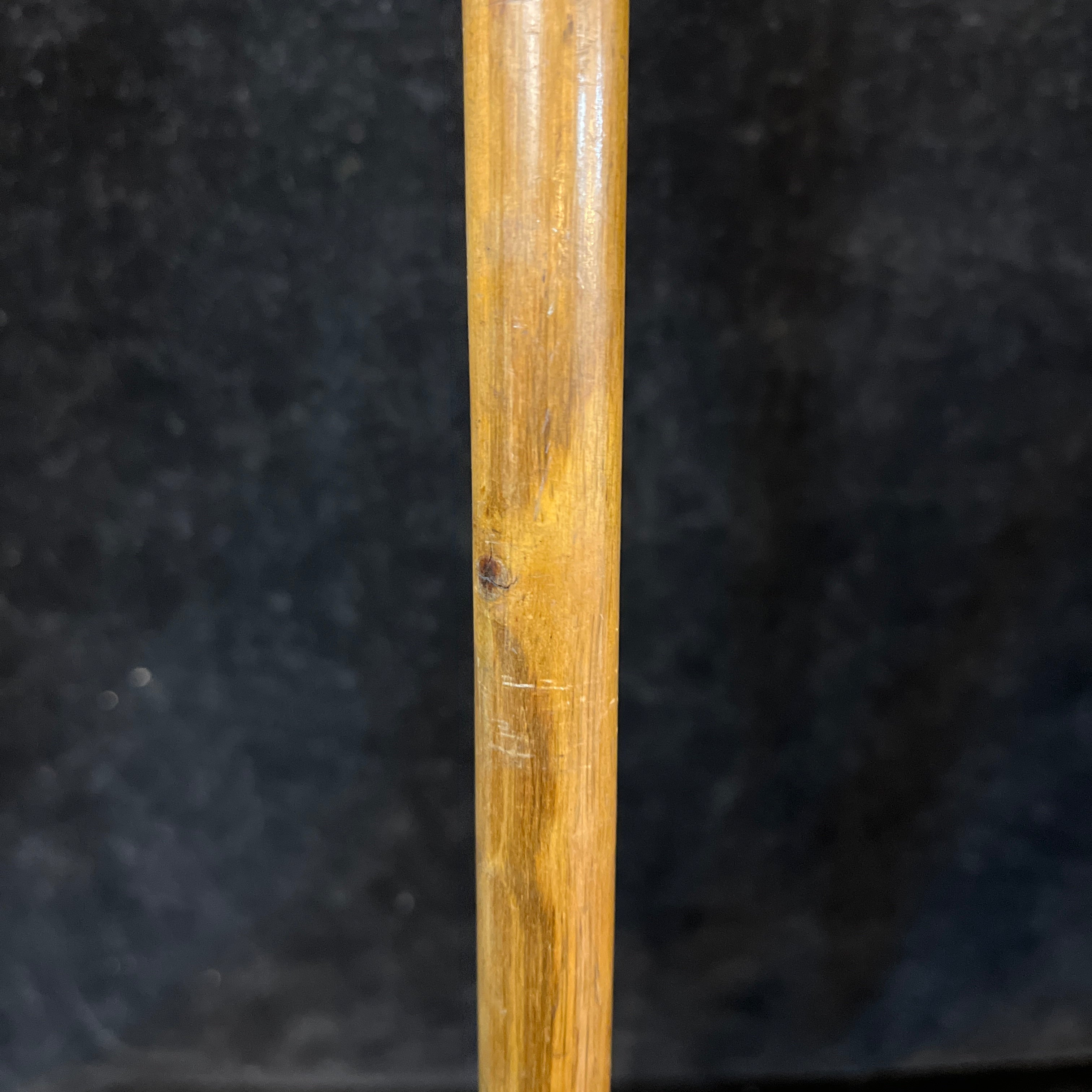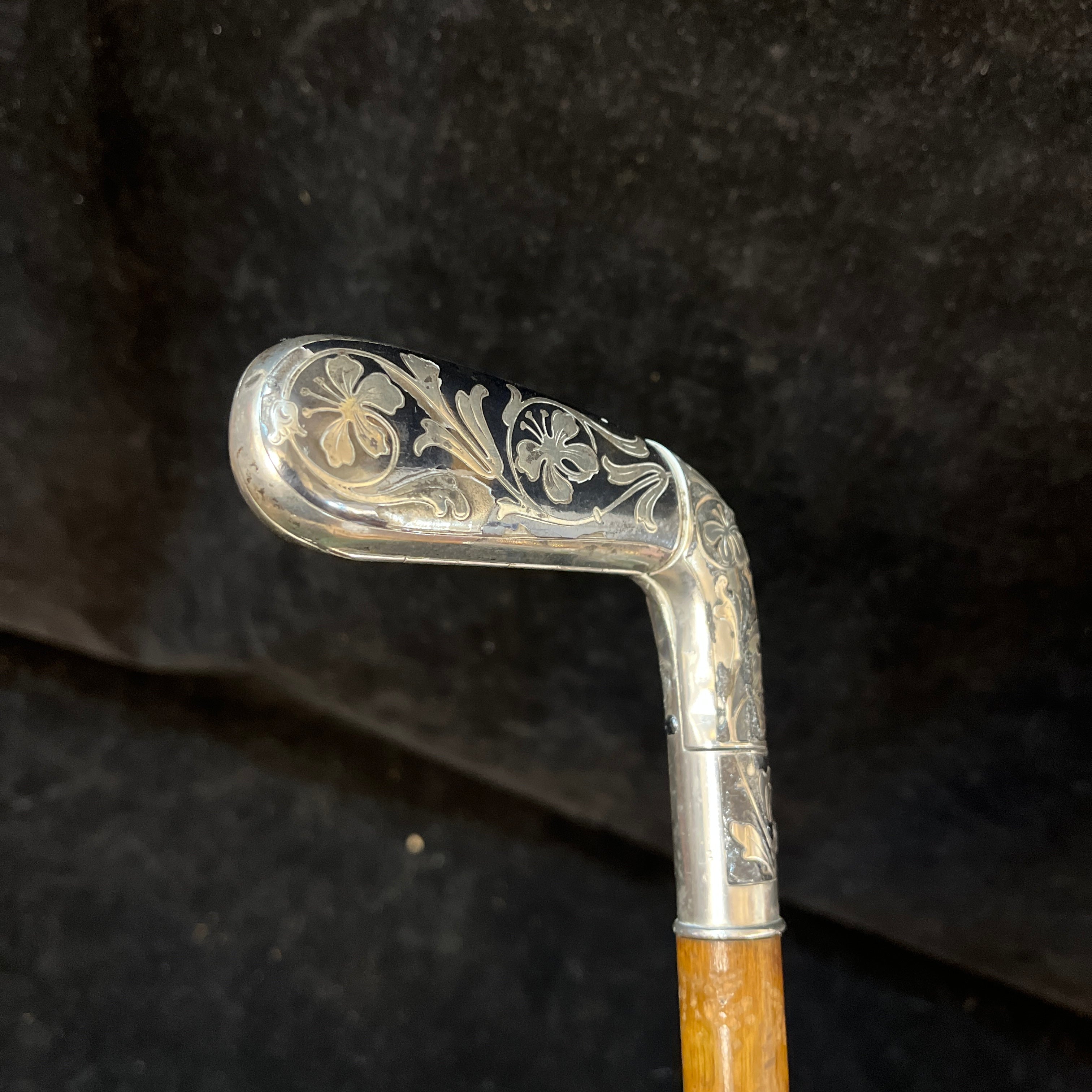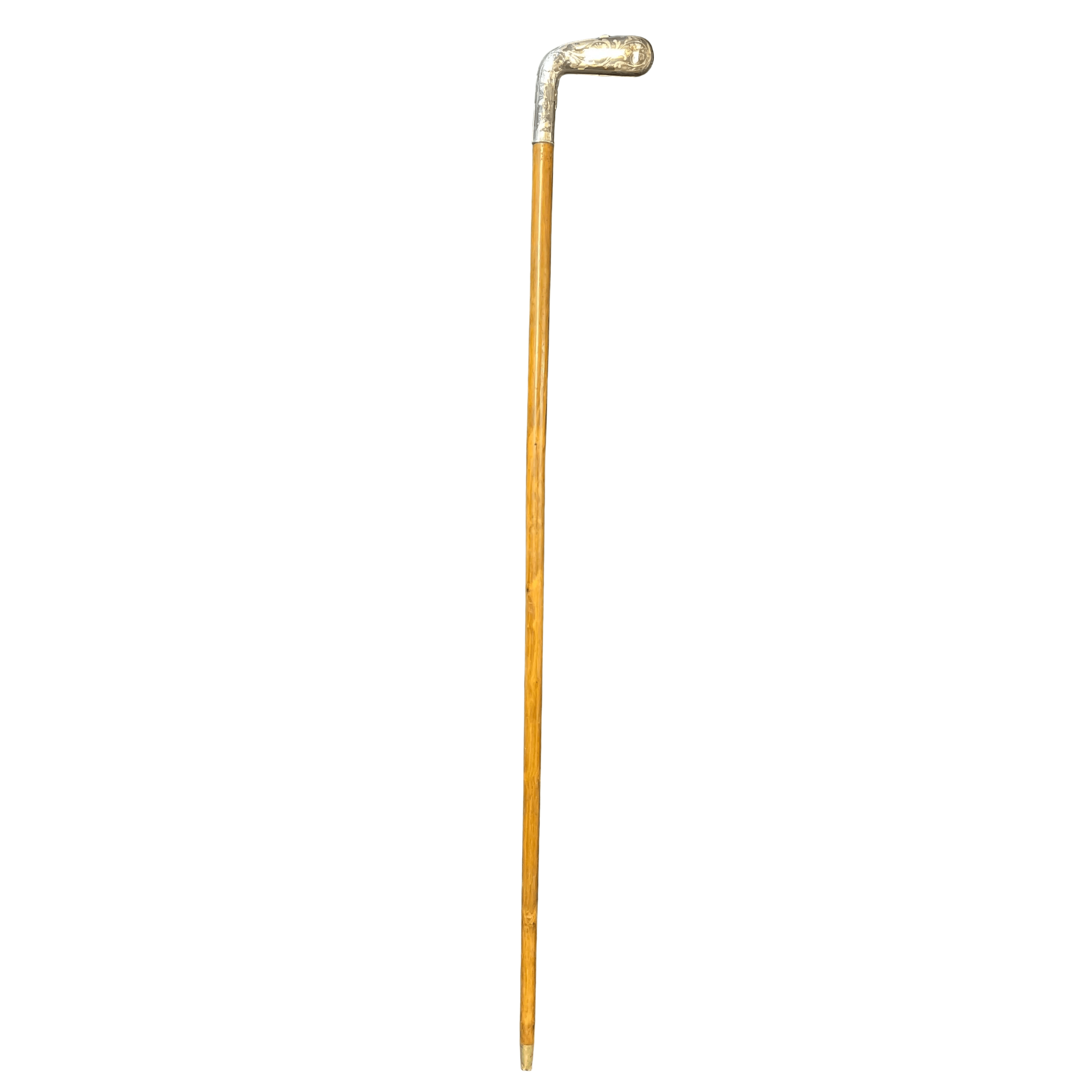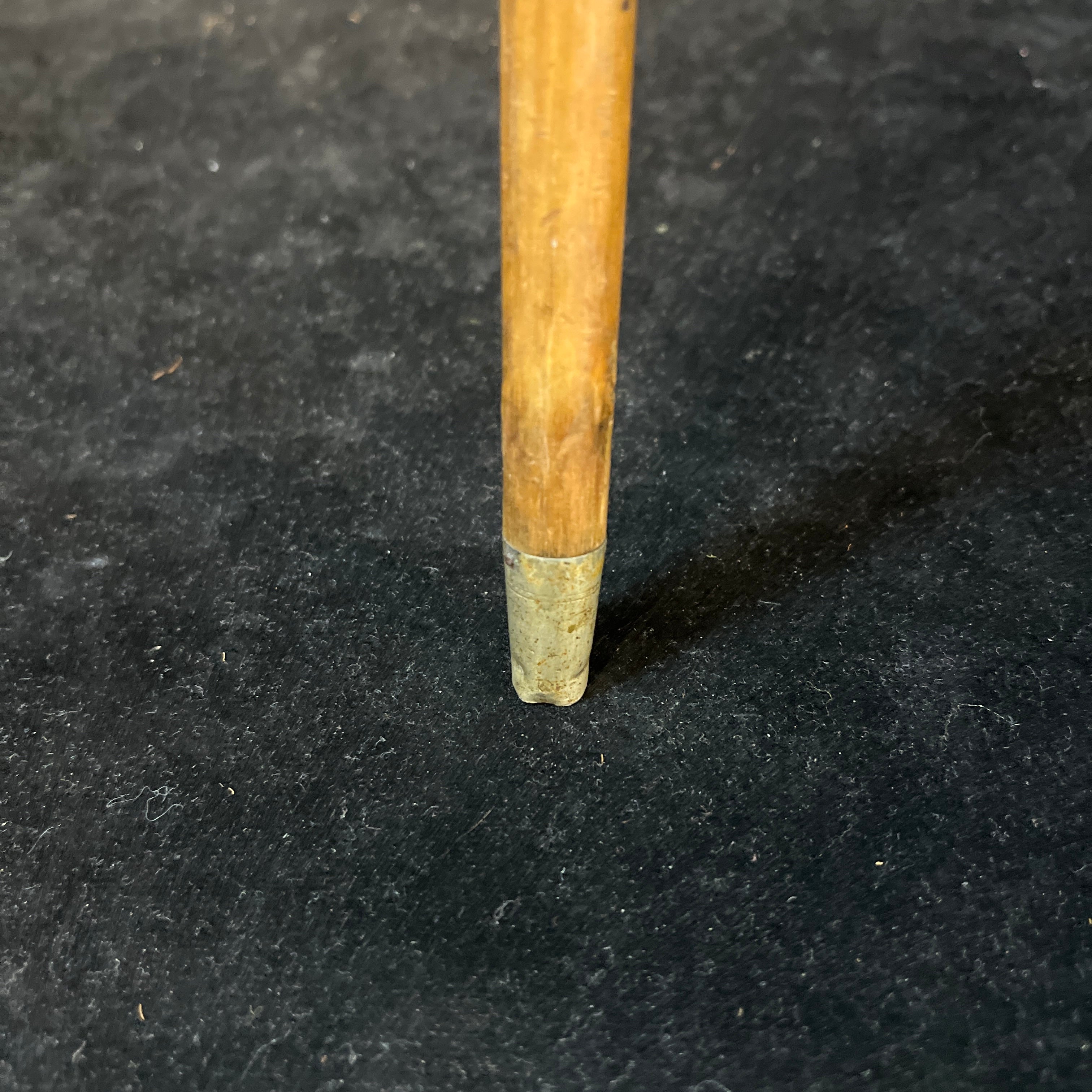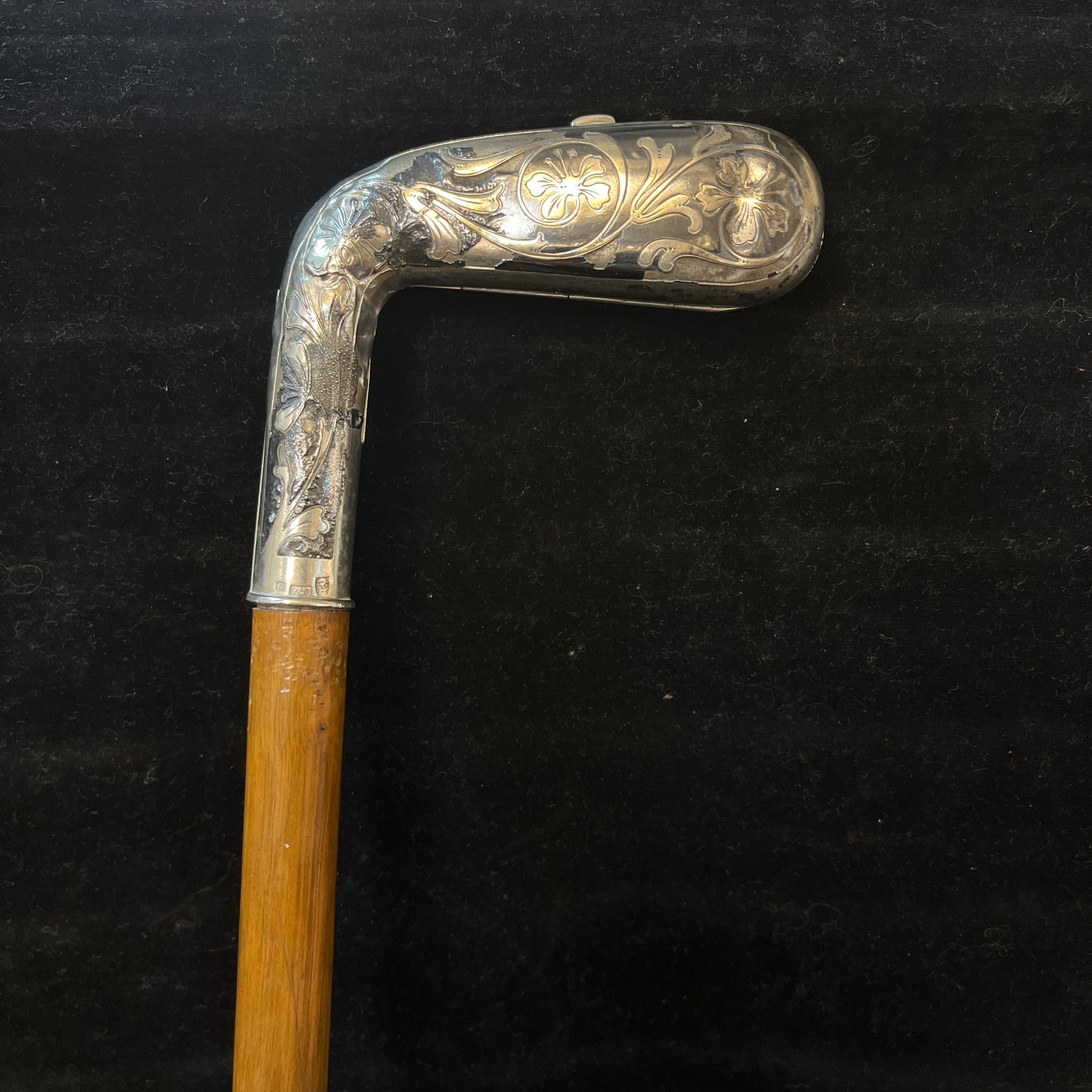 Elegante bastón de caballero, de origen inglés, en madera con mango de plata 925 tallado en relieves decorados. La pieza tiene una cigarrera en su mango, que se acciona mediante un botón, accediendo a un compartimento interior en donde guardar los cigarrillos. El taco es de plomo.