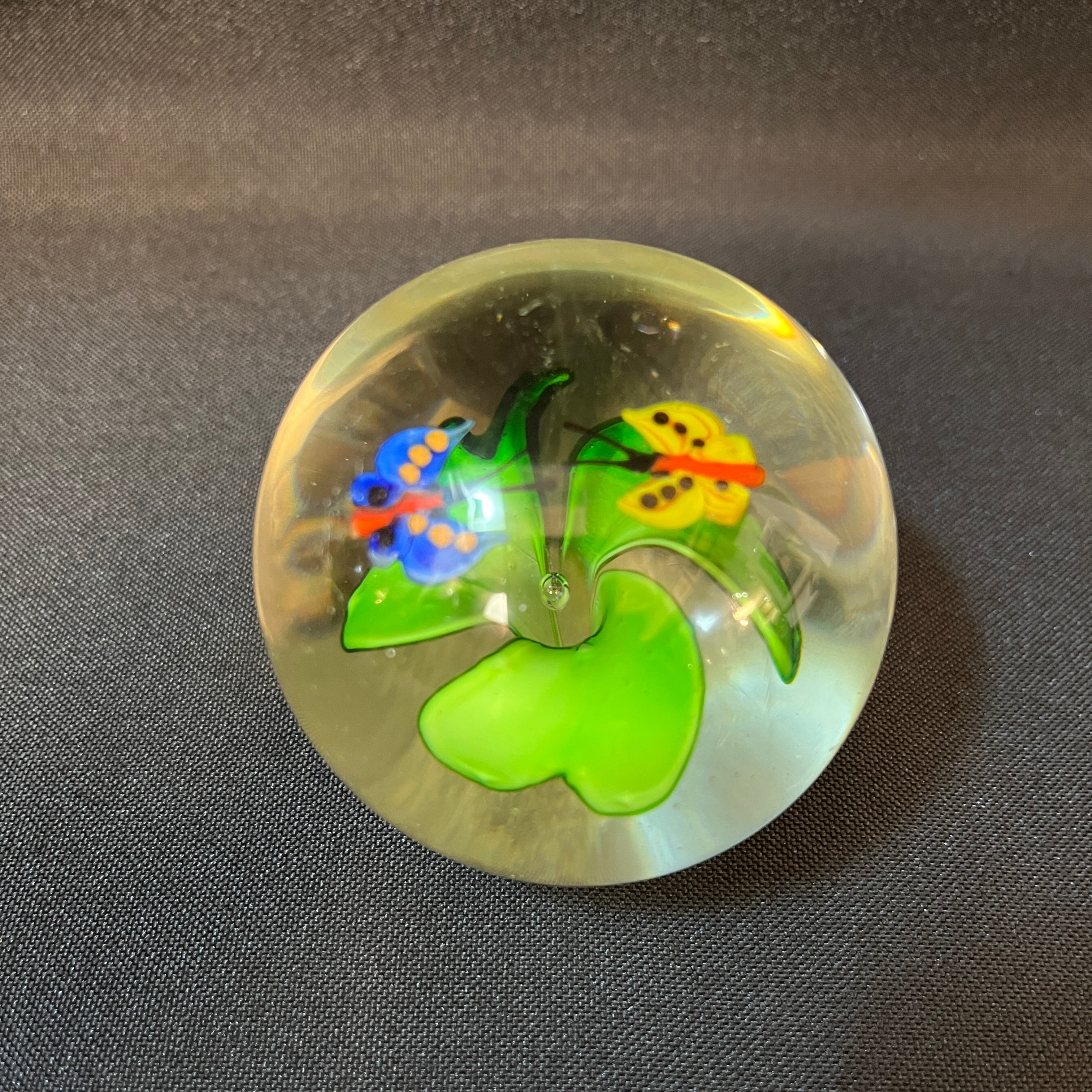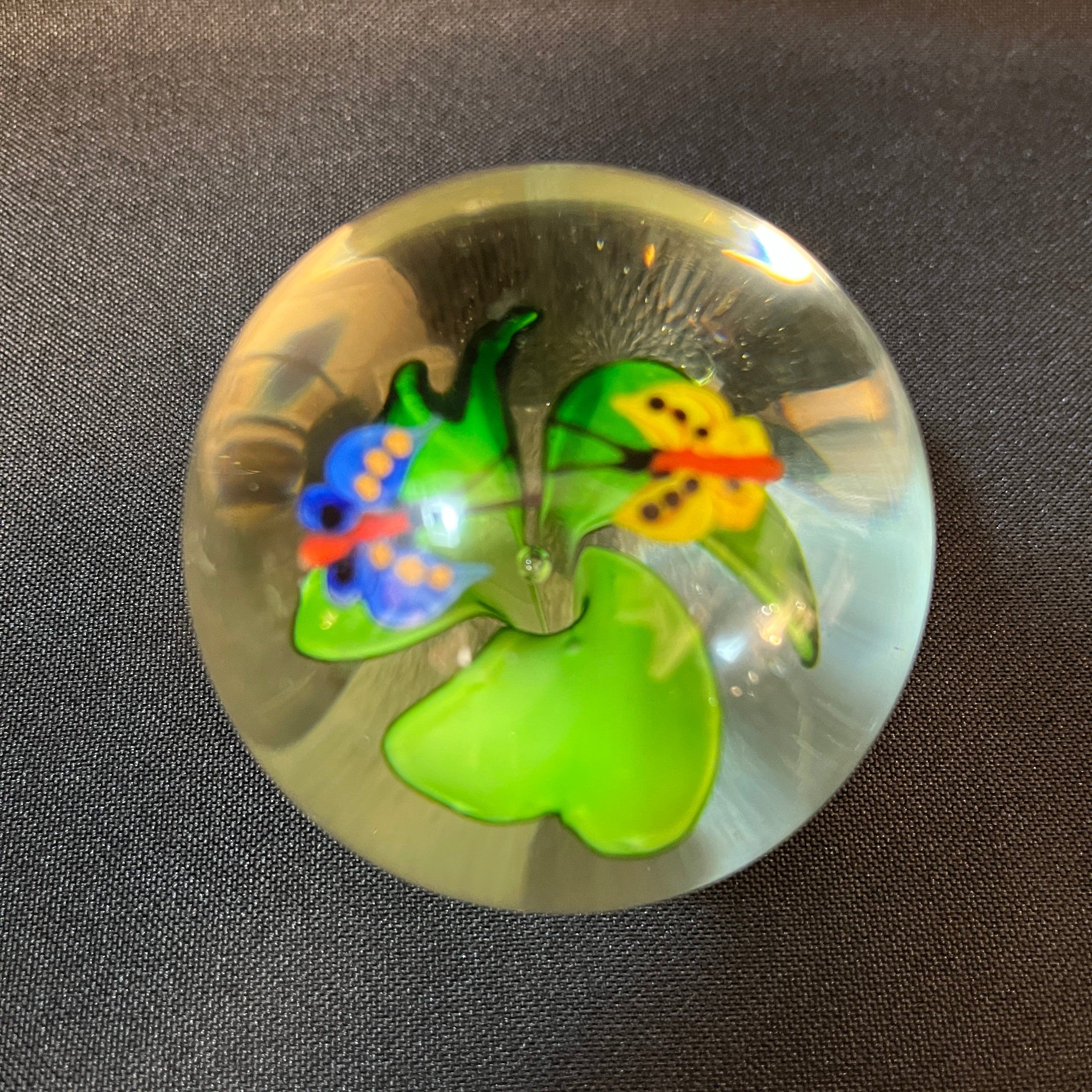 Hermoso pisapapel de miniatura de técnica Murano con dos mariposas posadas sobre un trébol. Su tamaño es ideal para espacios más acotados.
