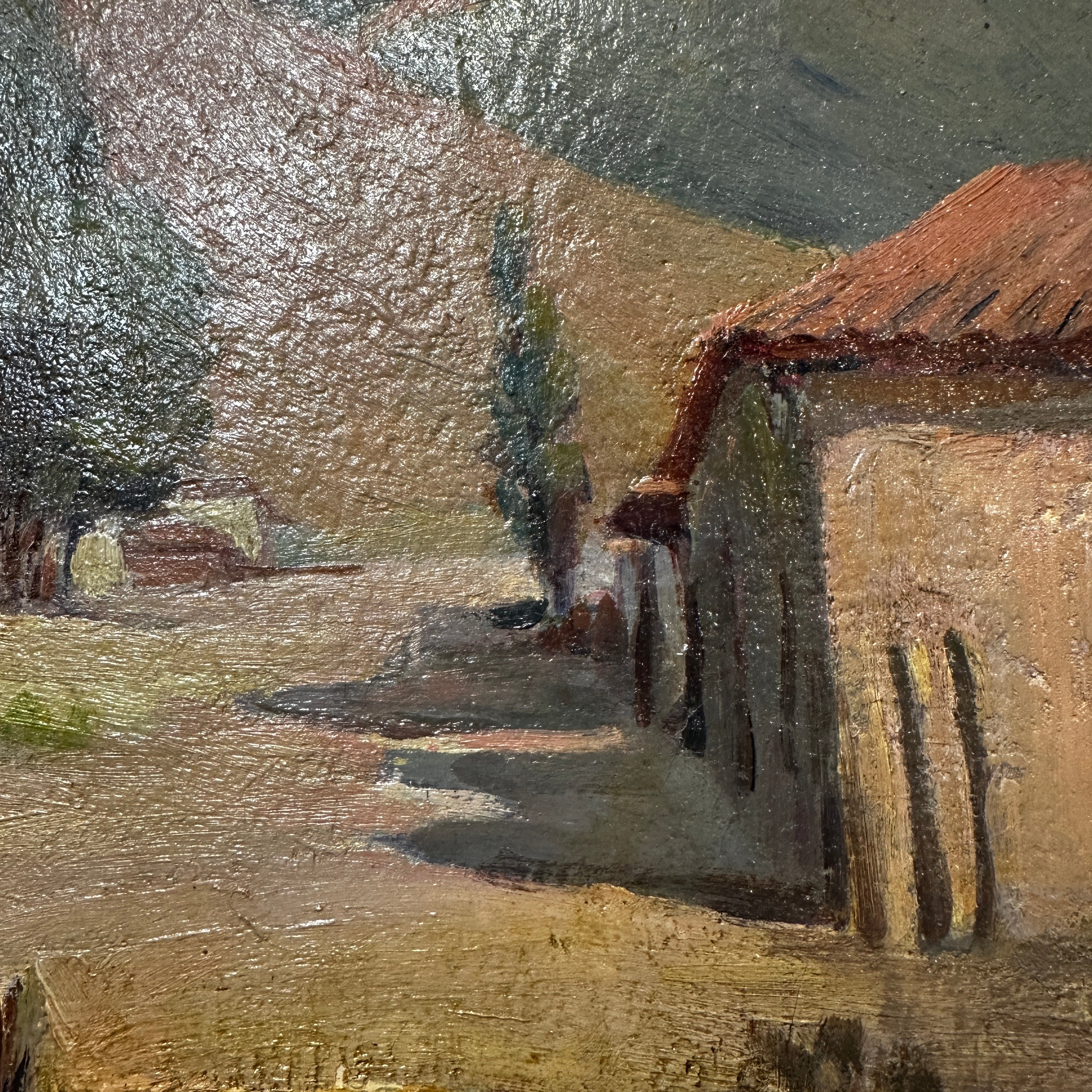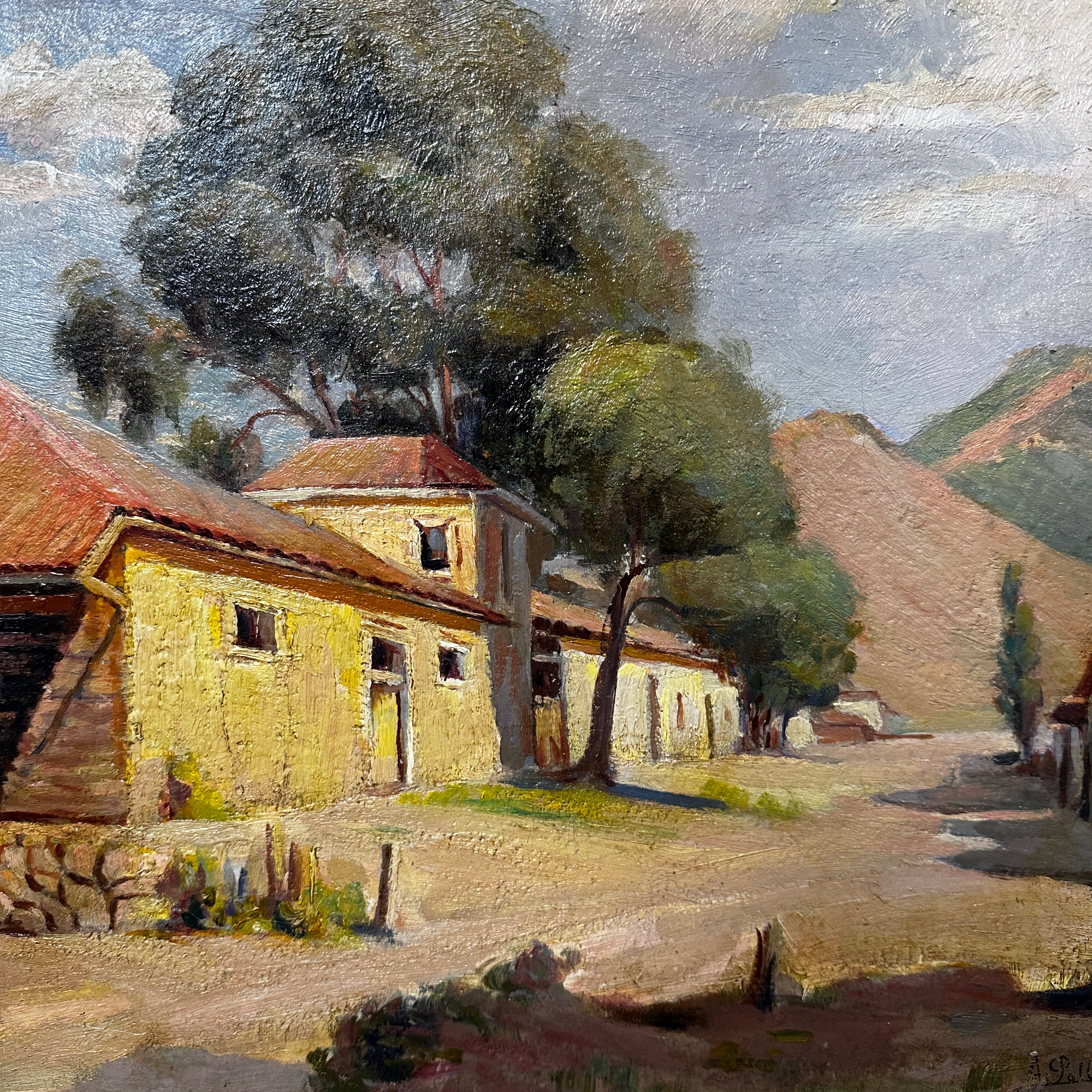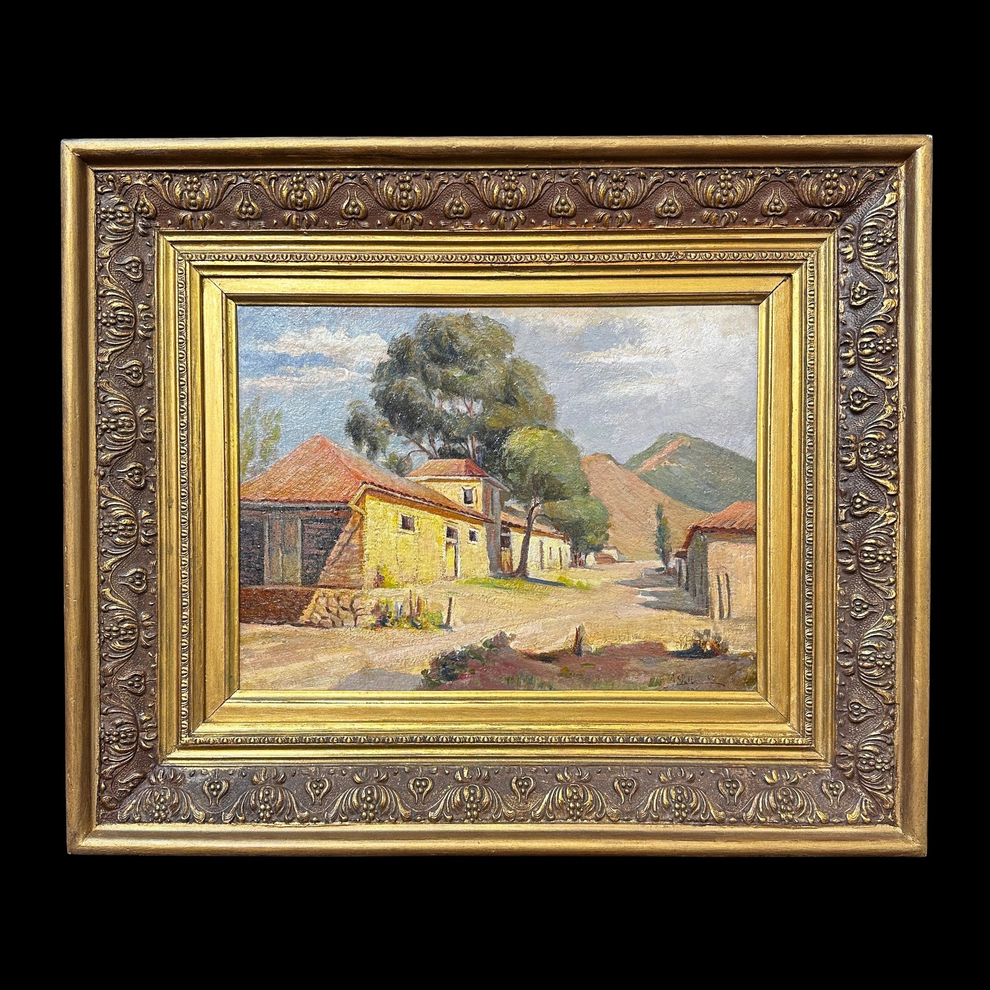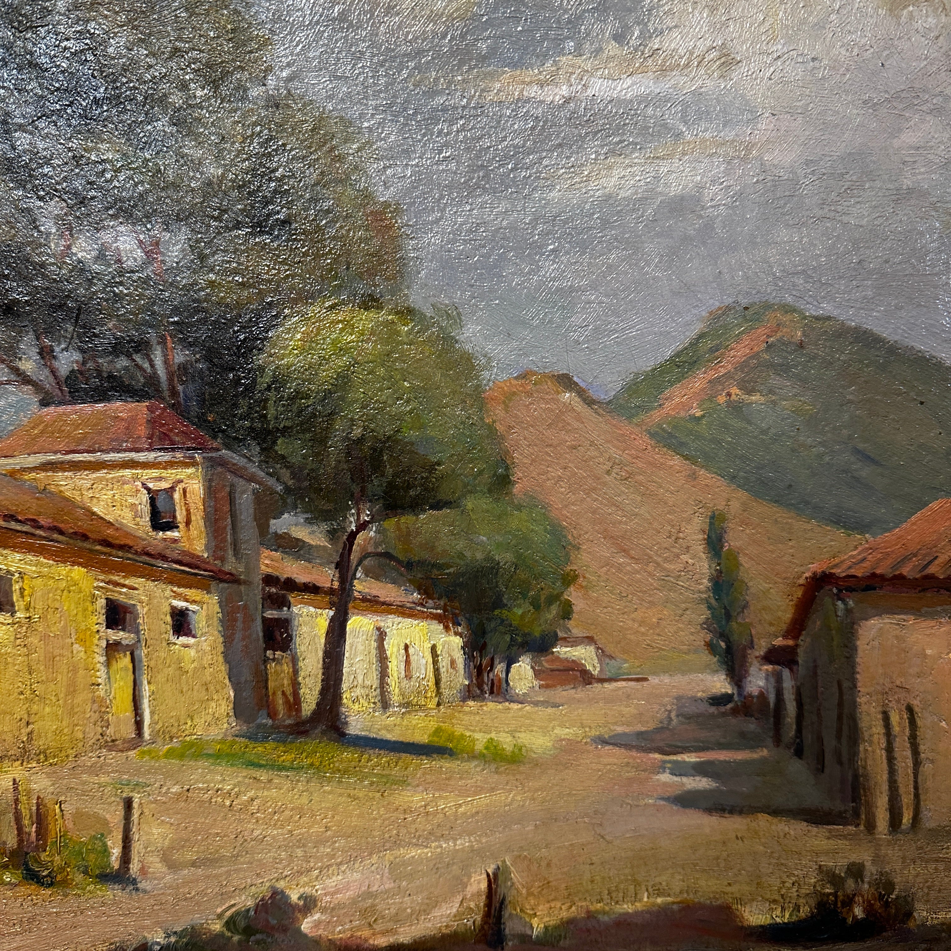 Óleo sobre cartón, representando un paisaje de Limarí, pueblo chileno ubicado en la IV Región de coquimbo. La obra retrata bellamente los colores cálidos de este paisaje desértico, además de unas casitas de adobe y algunos árboles, con cerros de fondo. Presenta un marco de madera tallada en relieves y terminada en pintura dorada.