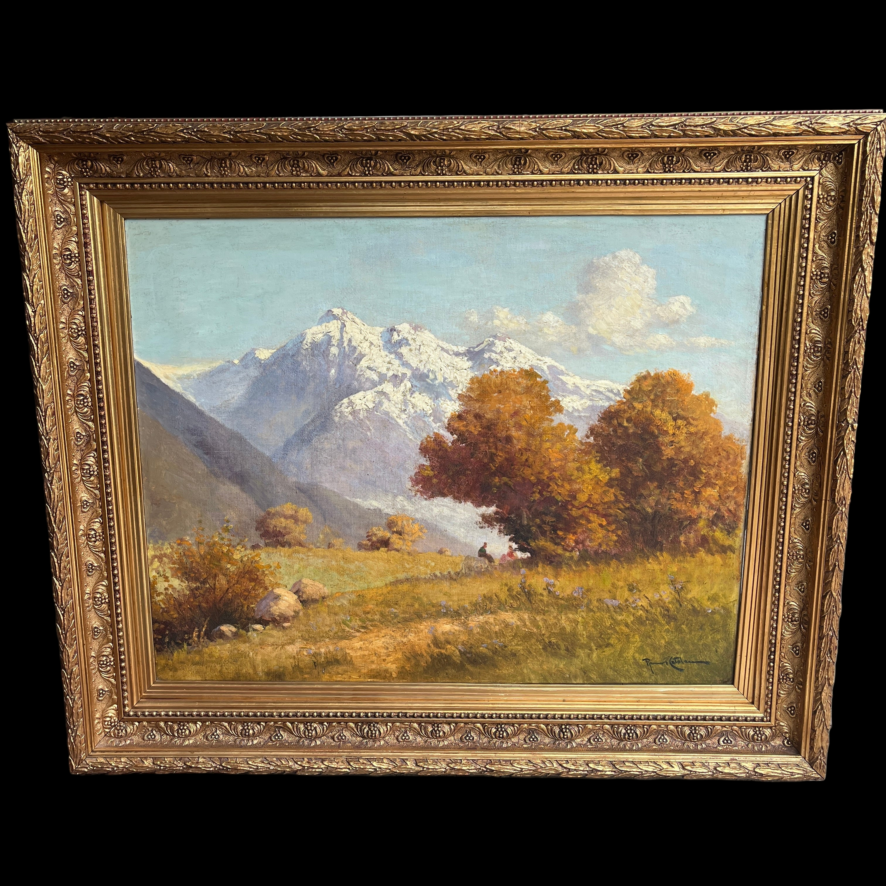 Óleo sobre tela del reconocido artista chileno Benito Ramos Catalán, representando un majestuoso paisaje otoñal, cargado de naranjo y texturas en el pasto y follaje, con la imponente cordillera de fondo. Al centro, a lo lejos, una pareja se sienta en medio de la naturaleza, haciendo notar la dimensión del paisaje. La obra está enmarcada en un elegante marco de madera tallada en relieves y terminada en dorado.