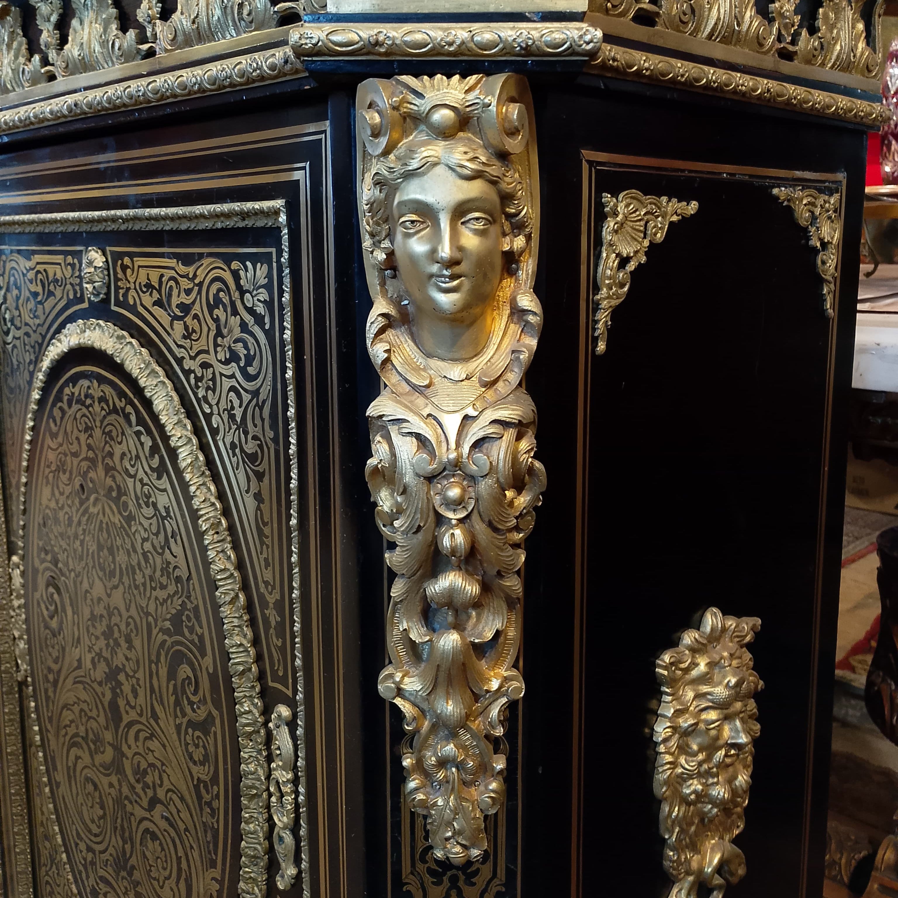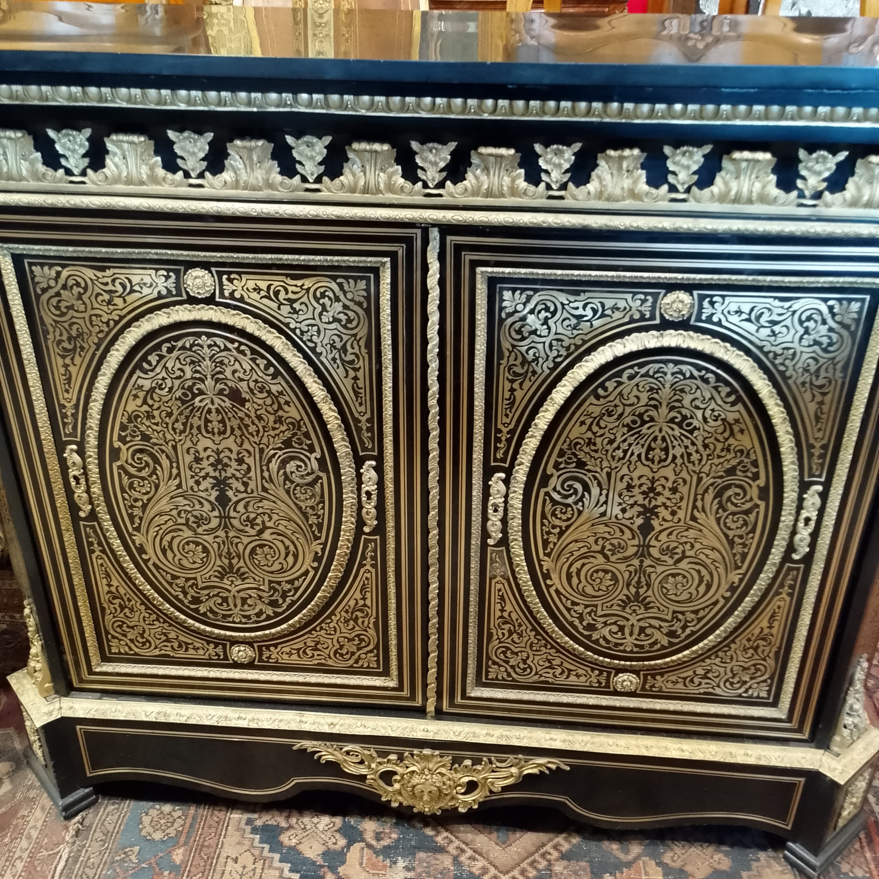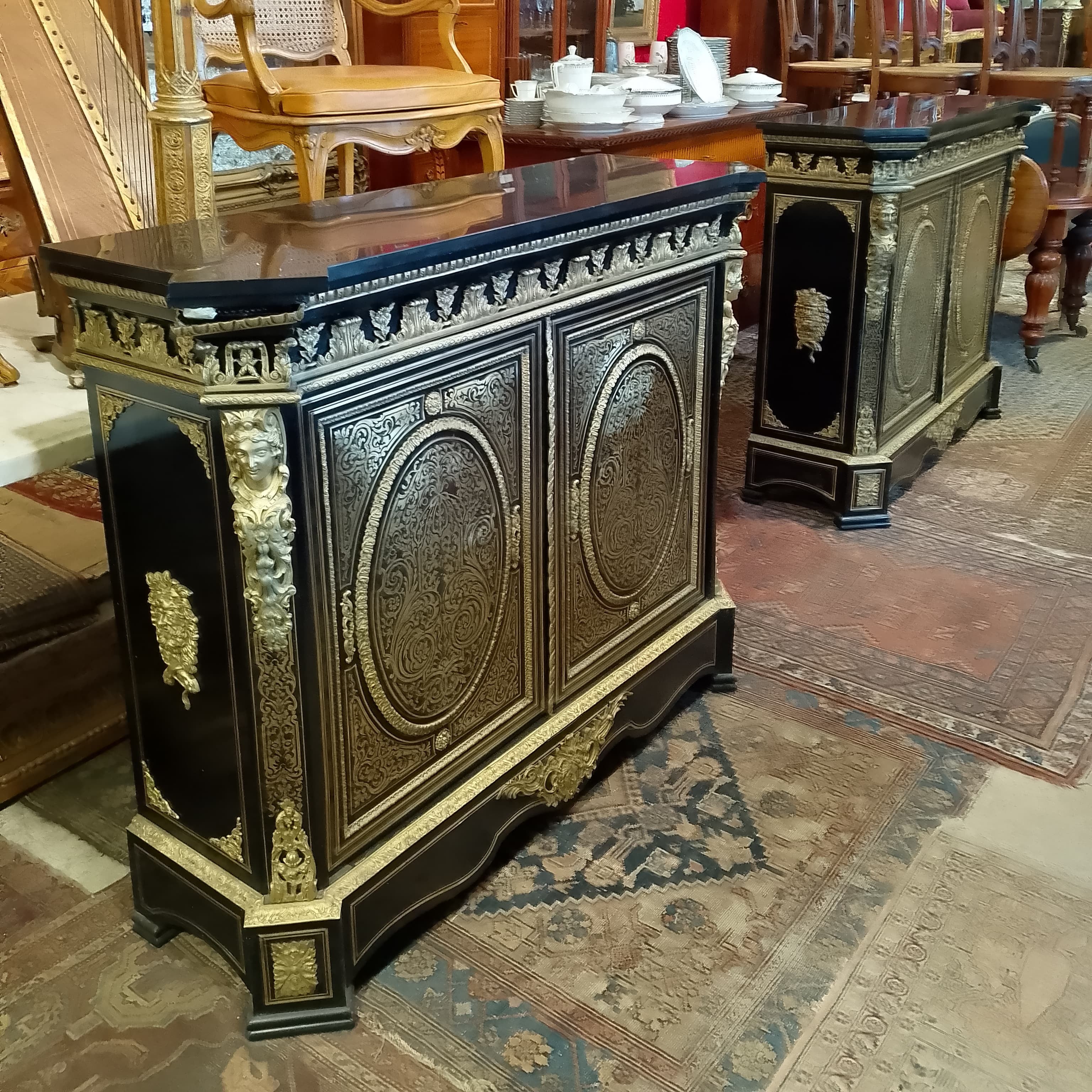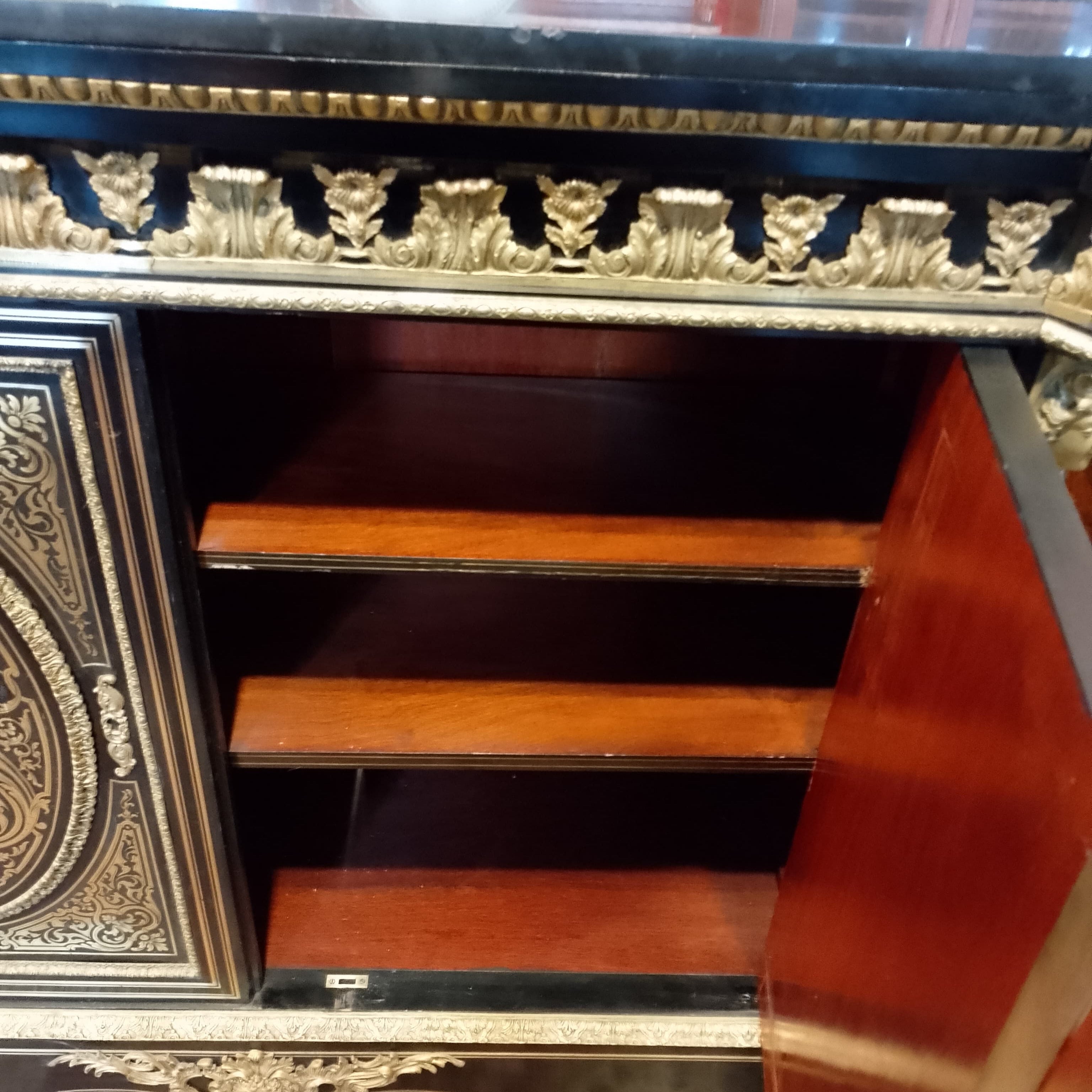 Bellísimo y elegante par de Boulles franceses de dos puertas estilo Napoleón III. Su diseño cuenta con una cubierta de mármol negra, bronce ormolu, aplicaciones de bronce y delicadas incrustaciones de nácar y marfil en un diseño de marquetería muy elaborado. Contiene tres niveles en su interior.