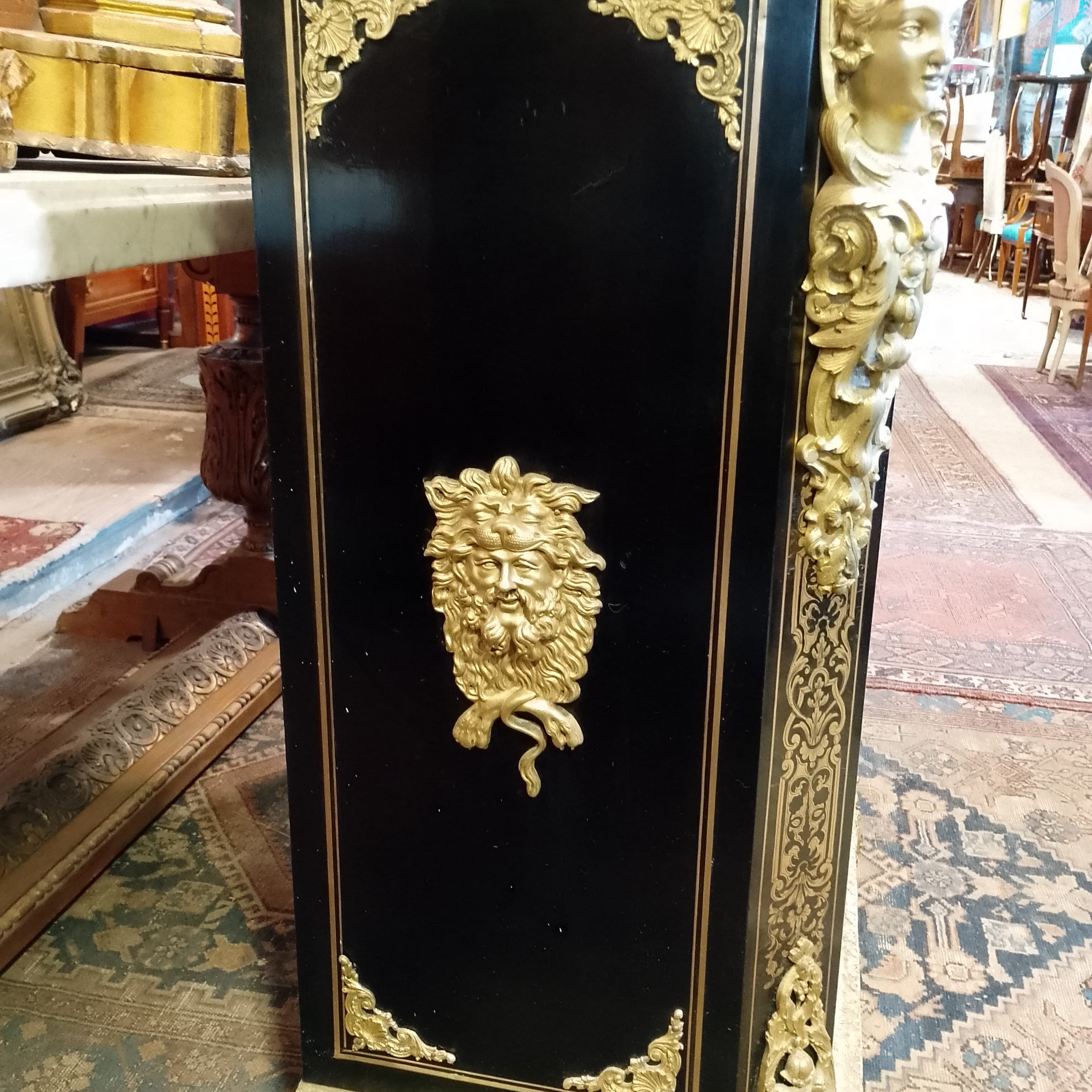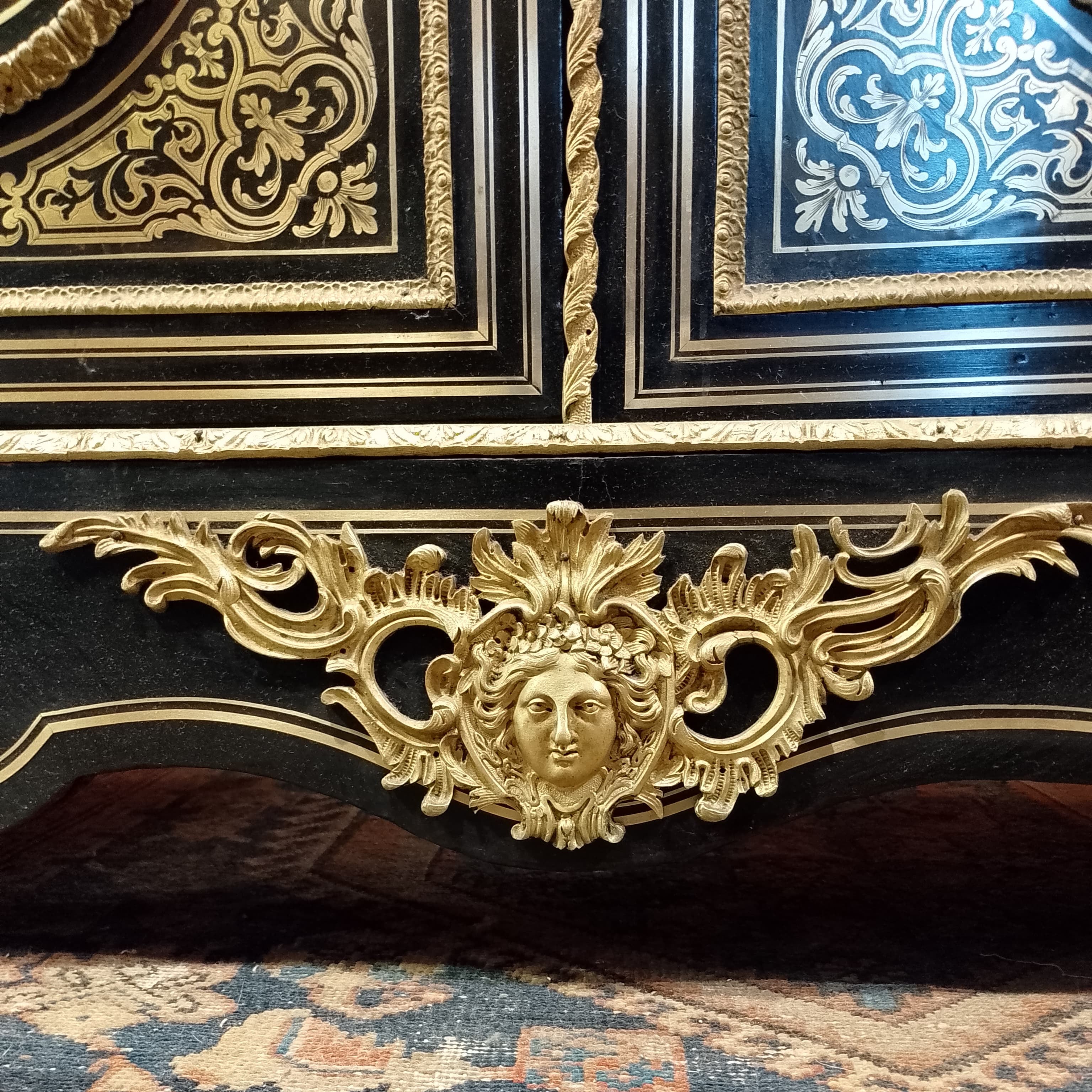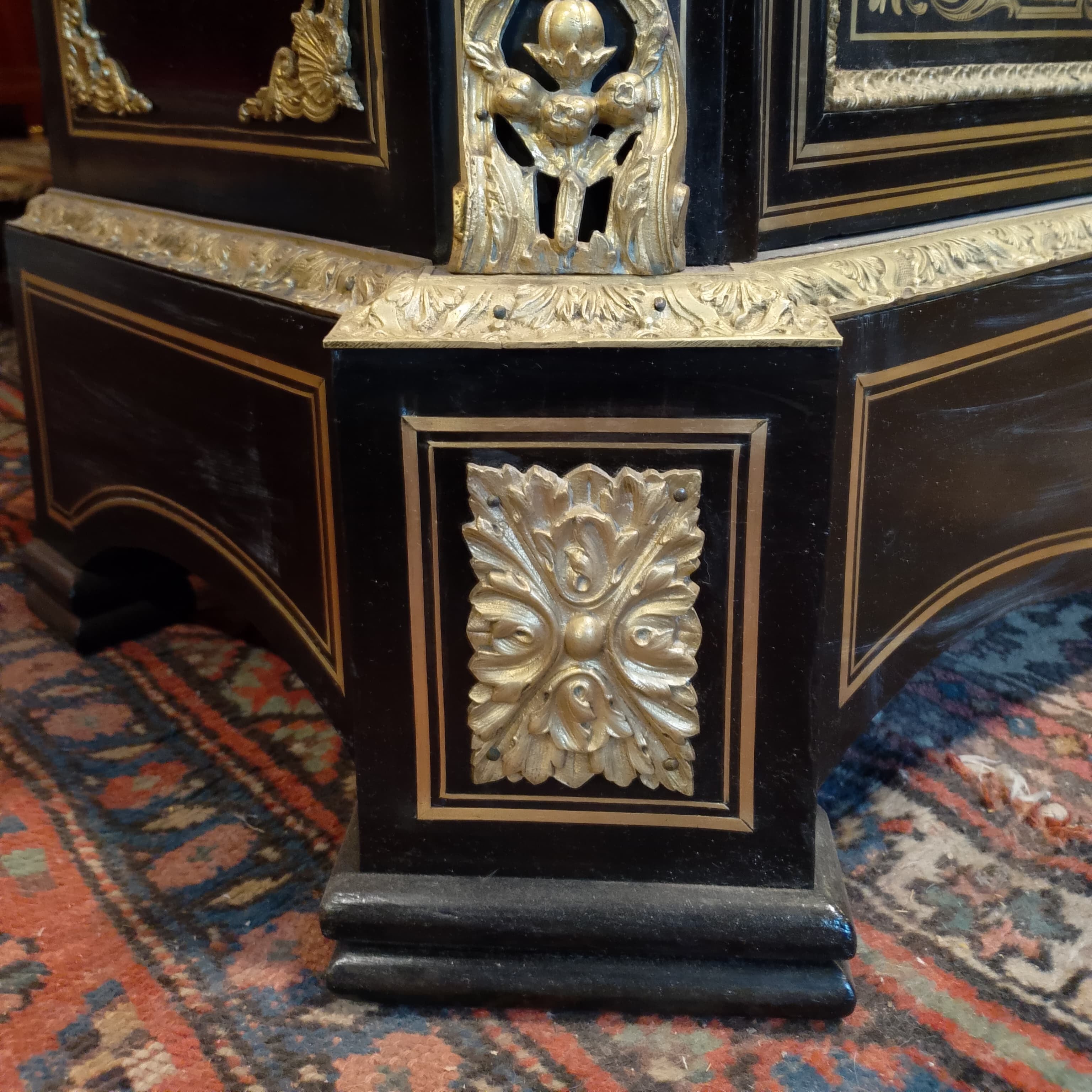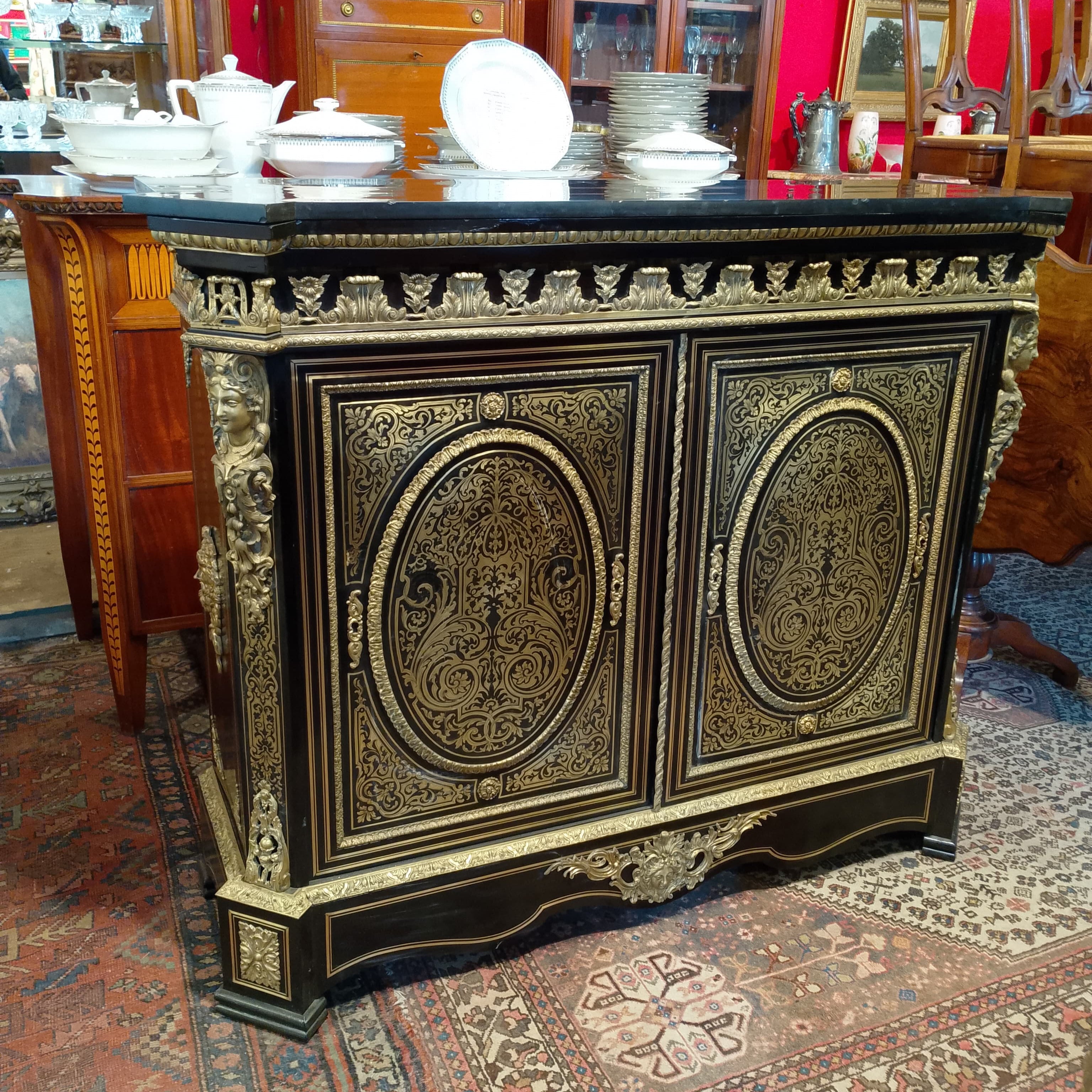 Bellísimo y elegante par de Boulles franceses de dos puertas estilo Napoleón III. Su diseño cuenta con una cubierta de mármol negra, bronce ormolu, aplicaciones de bronce y delicadas incrustaciones de nácar y marfil en un diseño de marquetería muy elaborado. Contiene tres niveles en su interior.