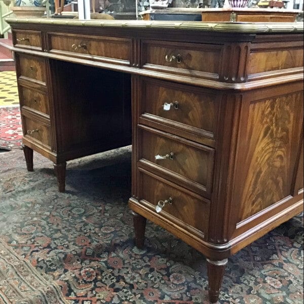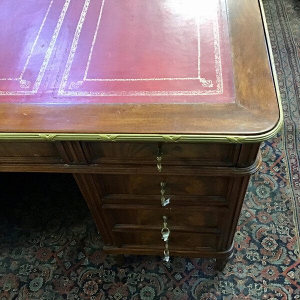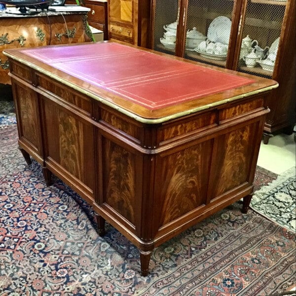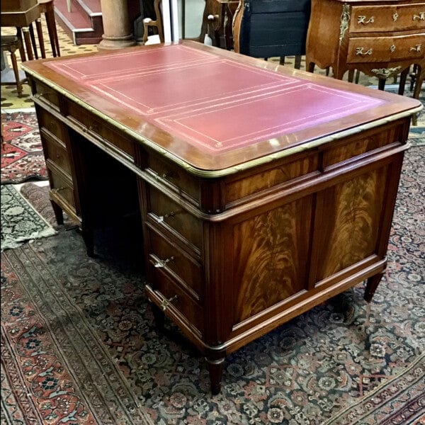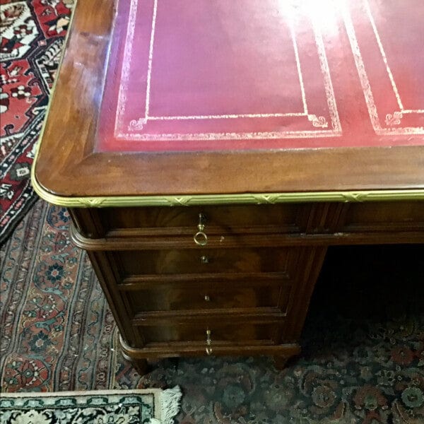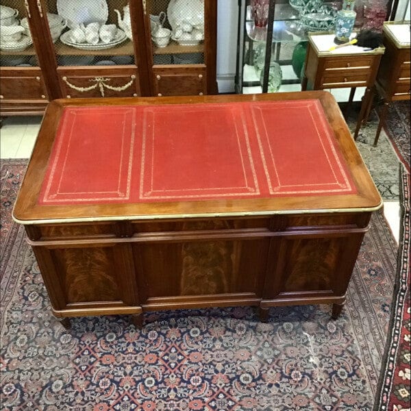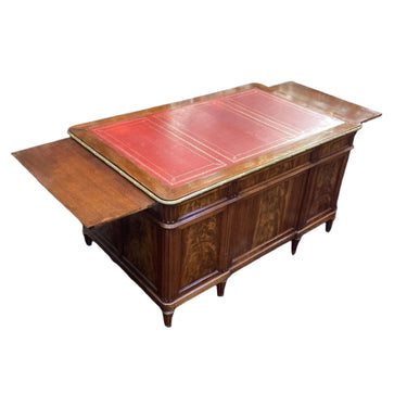 Amplio escritorio ministro en madera de caoba, estilo Luis XVI. Cubierta de cuero ruleteado, cuenta con nueve cajones y dos bandejas que se extienden a cada costado, otorgando mayor superficie. Tiradores y aplicaciones de bronce en el borde.