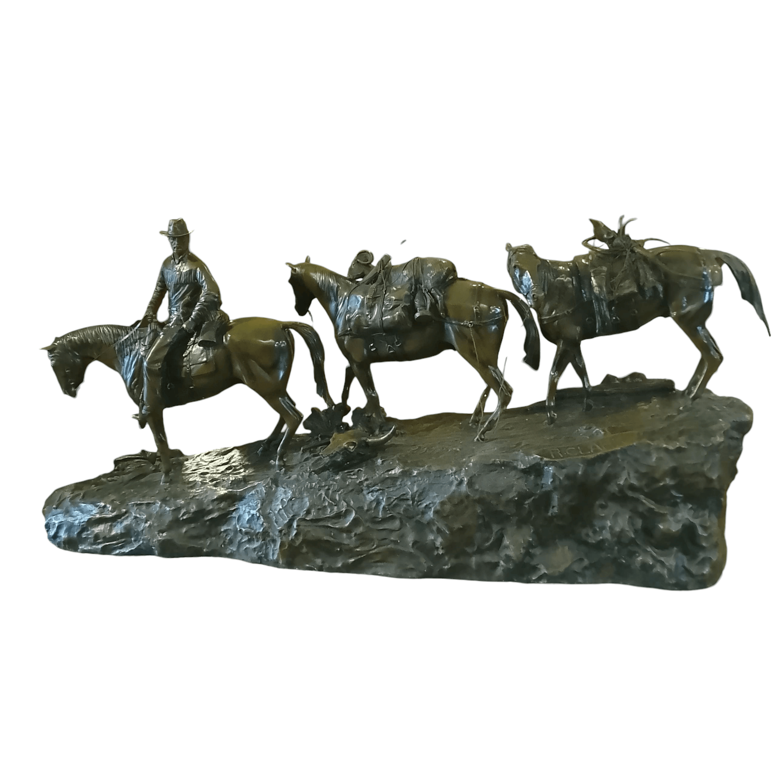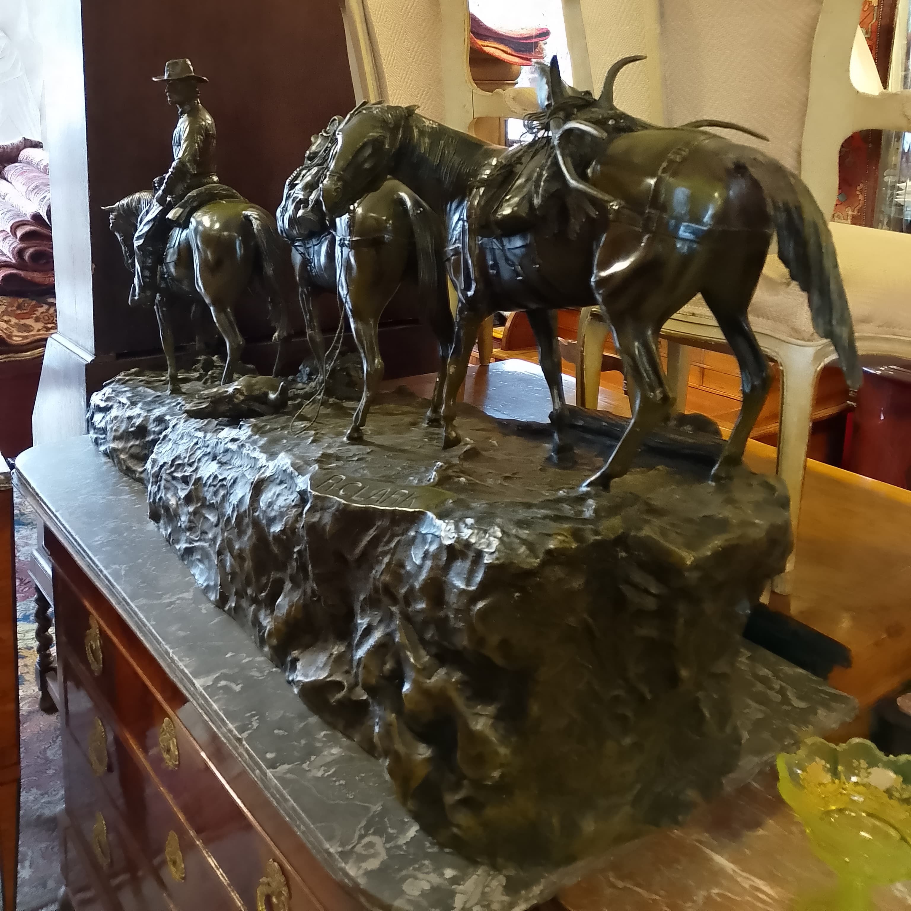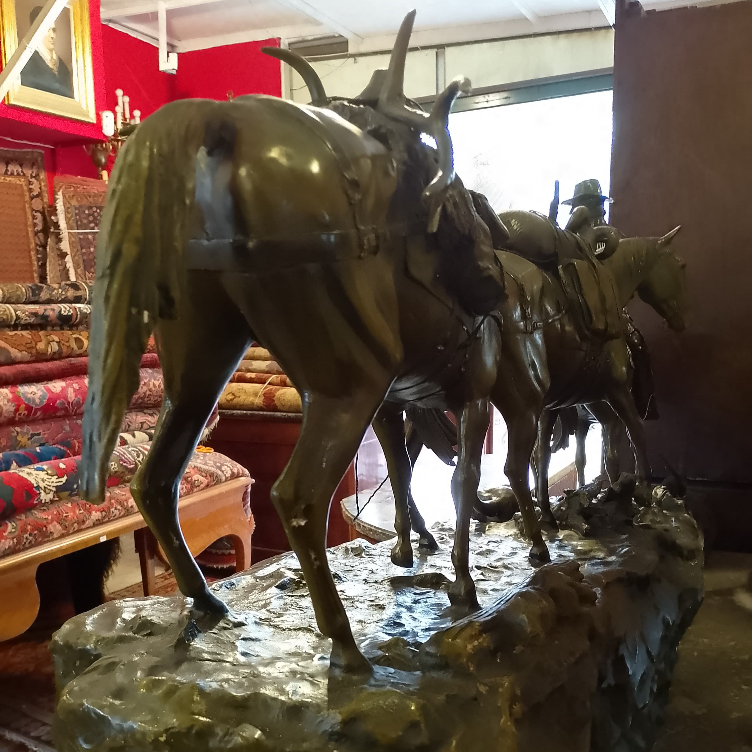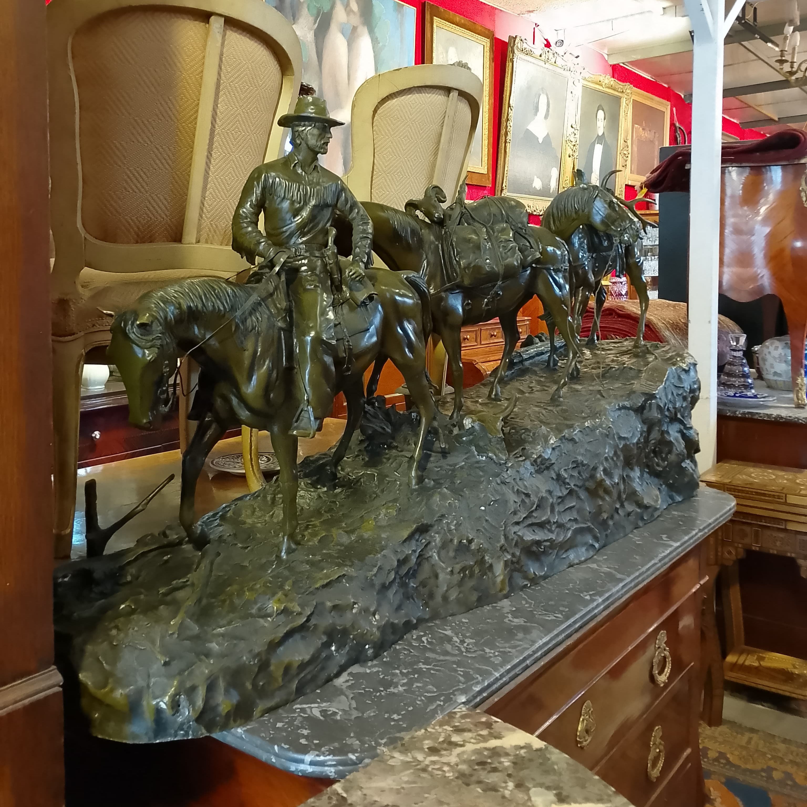 Imponente escultura en bronce del artista R. Clark, que representa un vaquero norteamericano y sus caballos de carga avanzando por un sendero montañoso. La gran base presenta una inclinación que le da movimiento y dirección a la pieza y el conjunto general está lleno de detalles trabajados en bronce como las riendas, una calavera, etc.