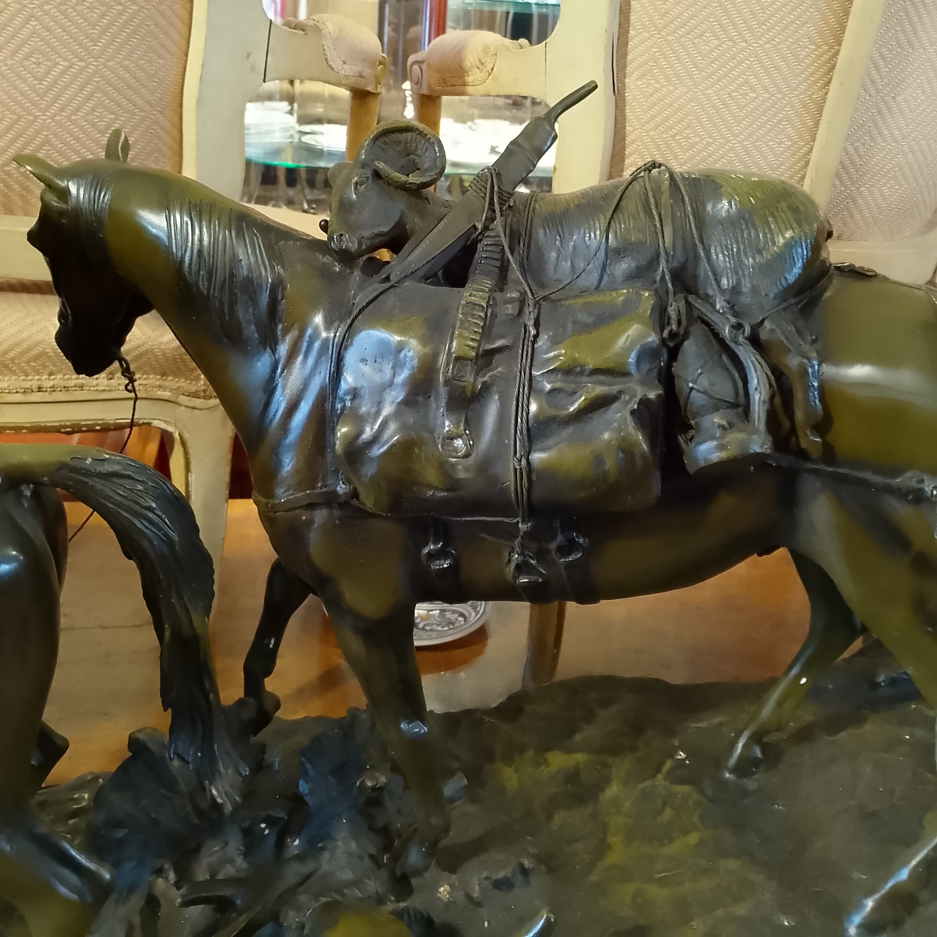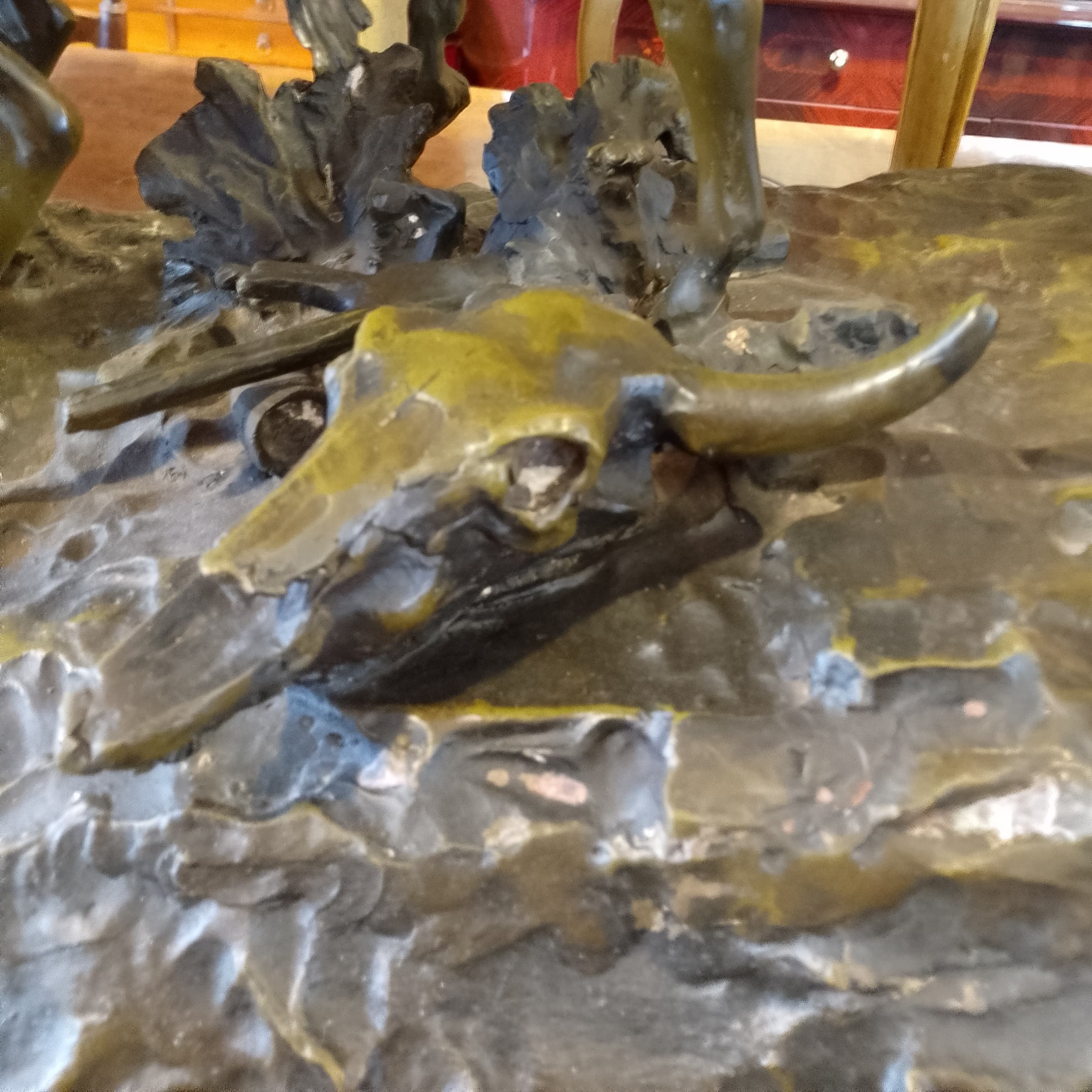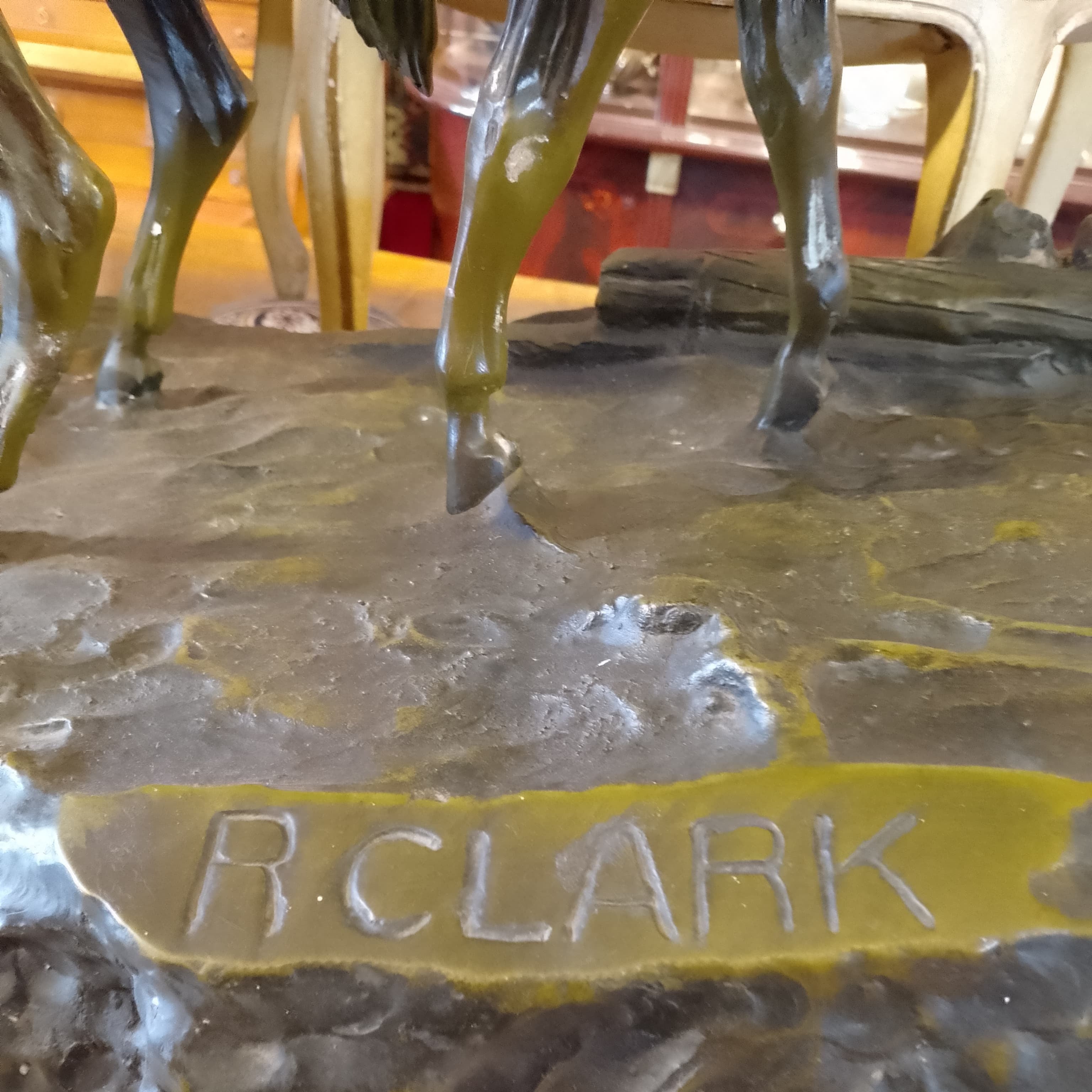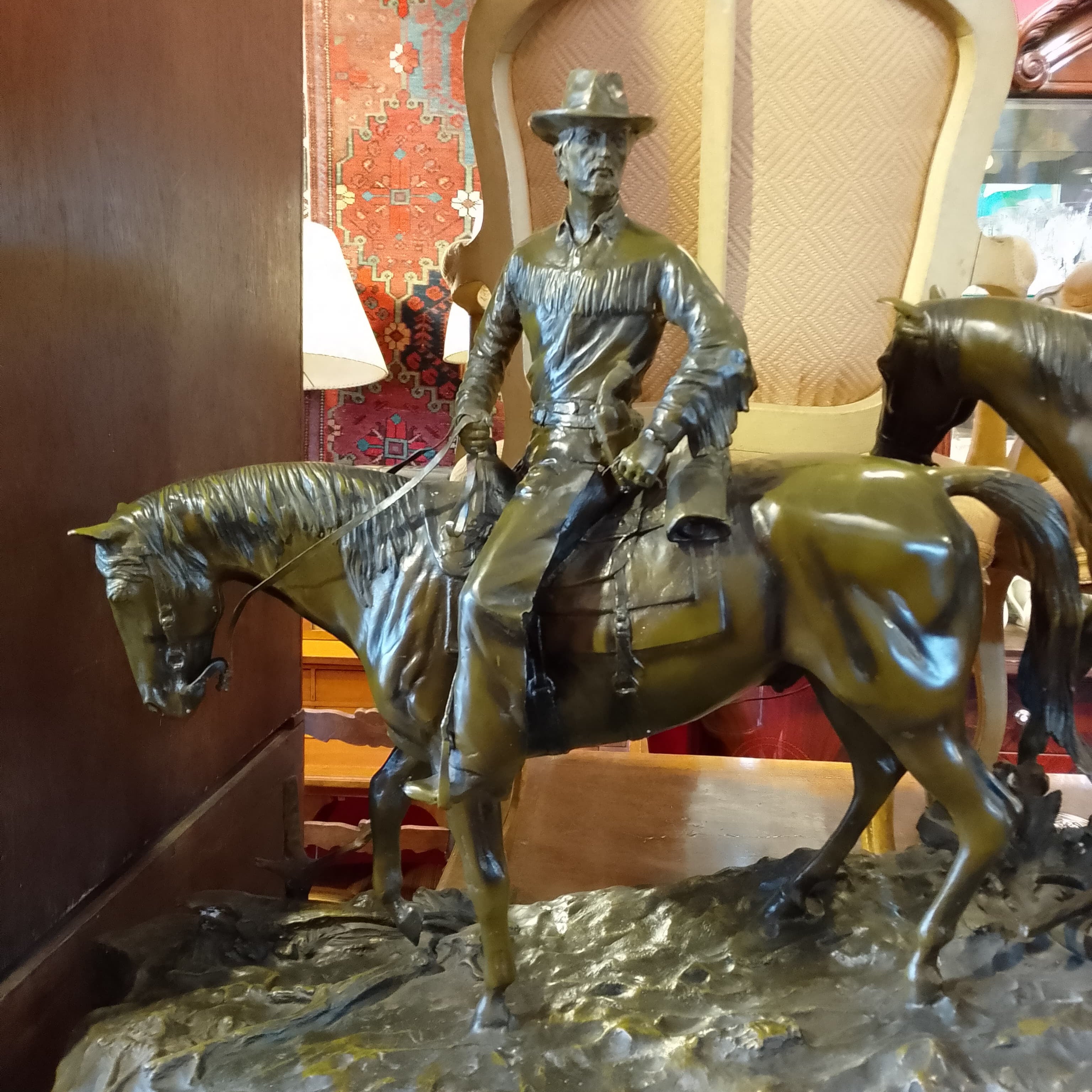 Imponente escultura en bronce del artista R. Clark, que representa un vaquero norteamericano y sus caballos de carga avanzando por un sendero montañoso. La gran base presenta una inclinación que le da movimiento y dirección a la pieza y el conjunto general está lleno de detalles trabajados en bronce como las riendas, una calavera, etc.