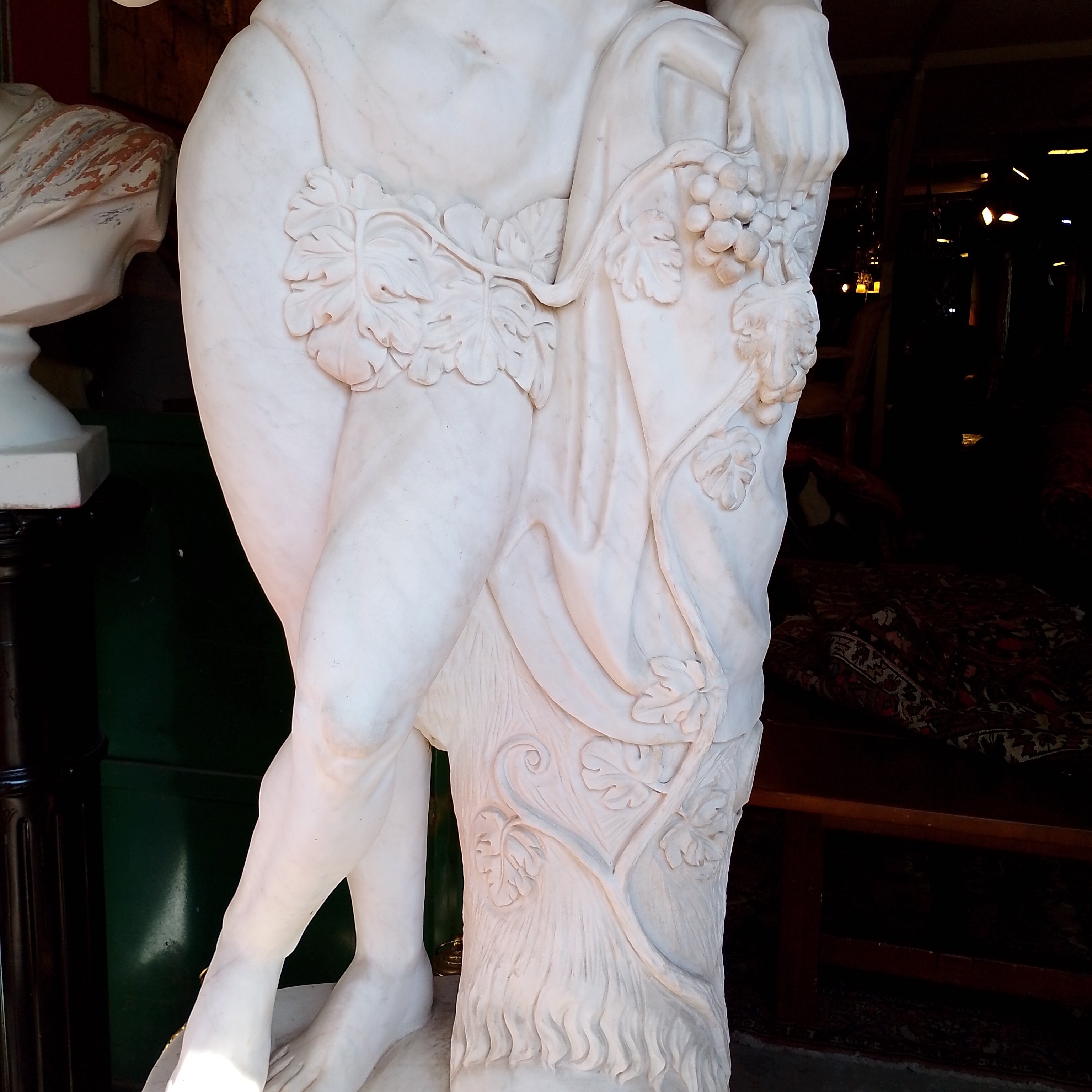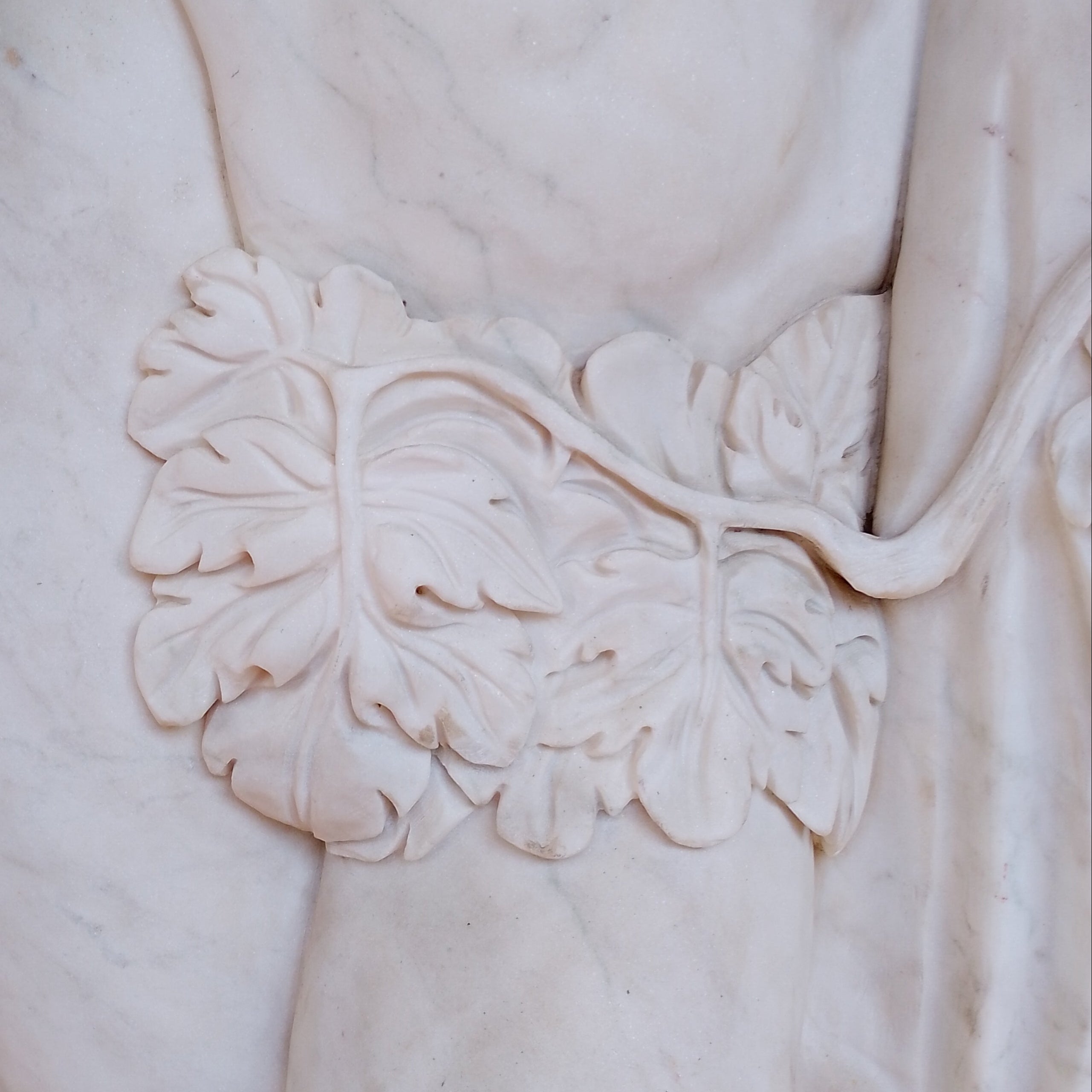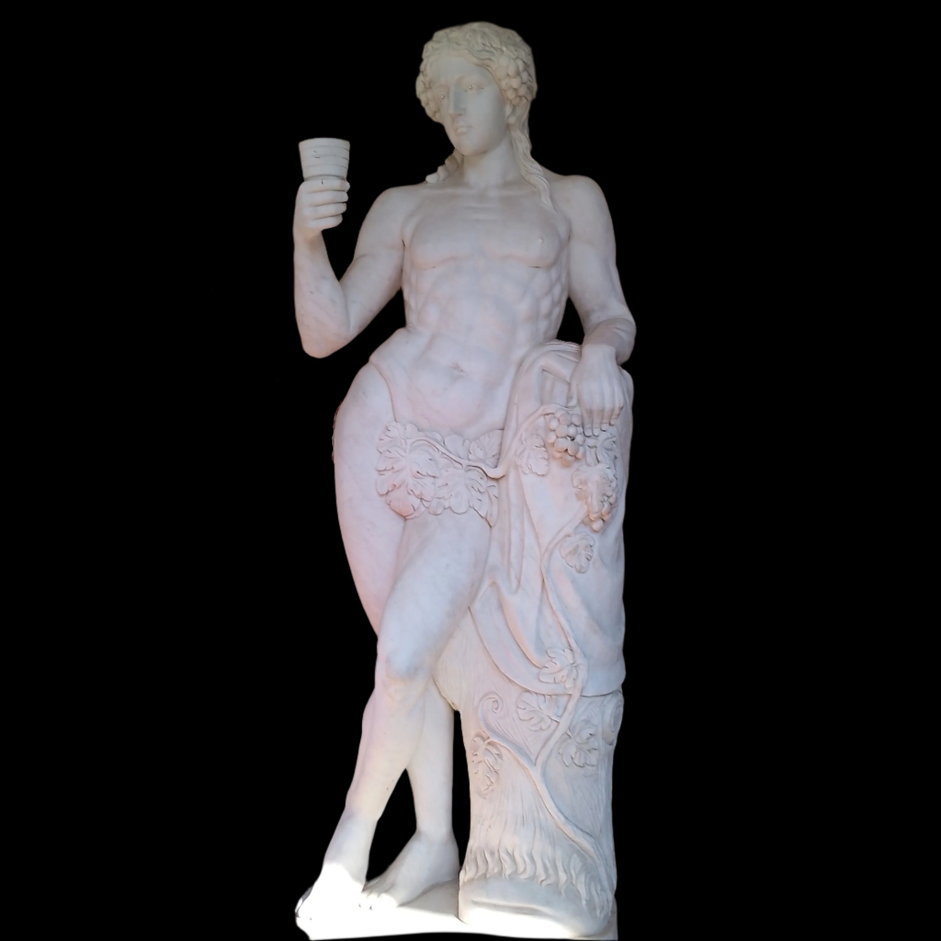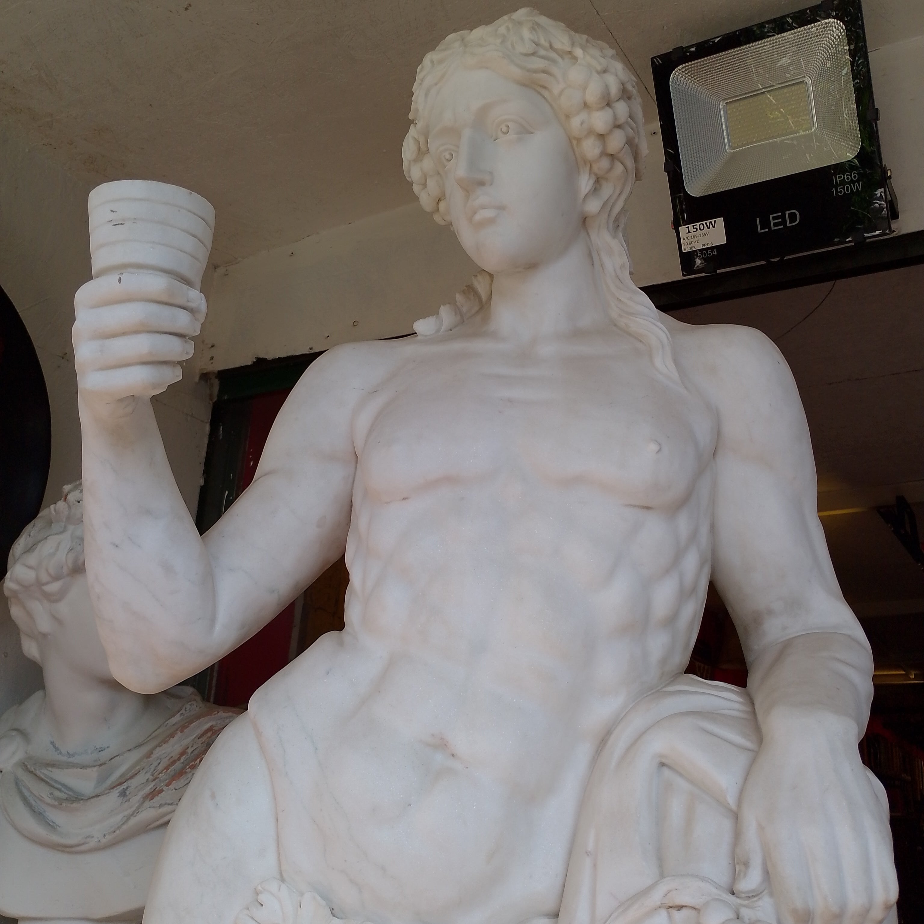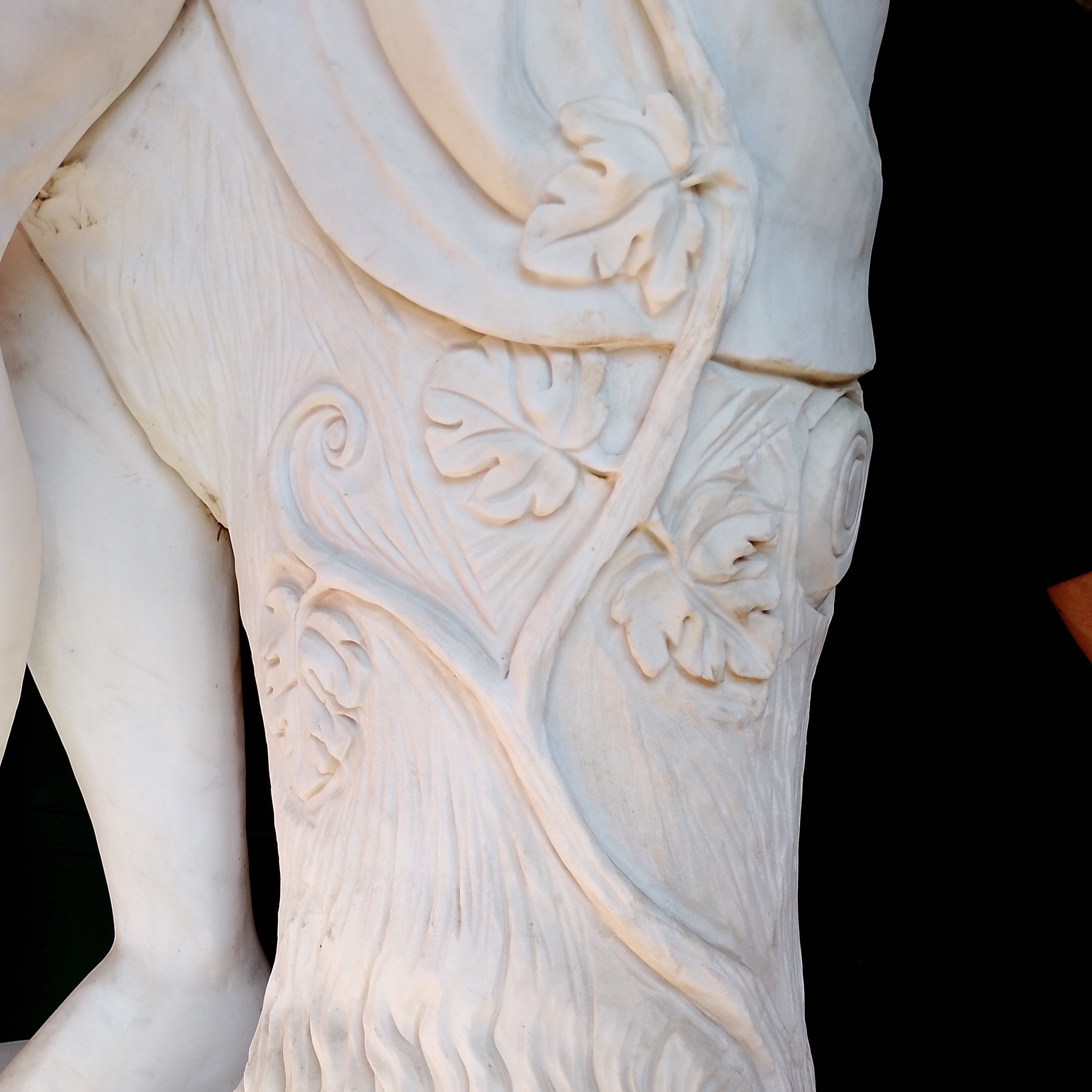Hermosa y elegante escutura en mármol representando a Dionisio, dios griego de la fiesta y el vino.