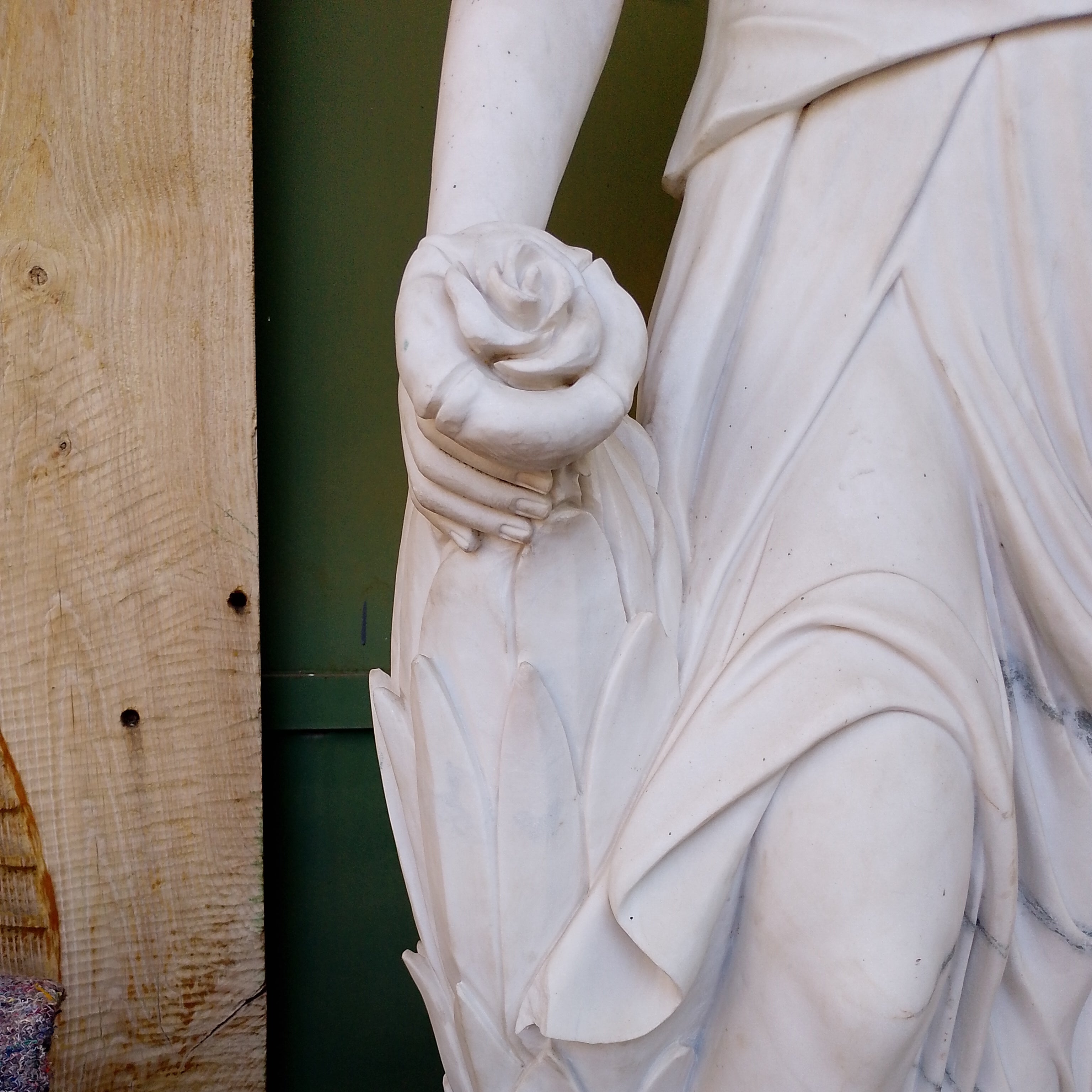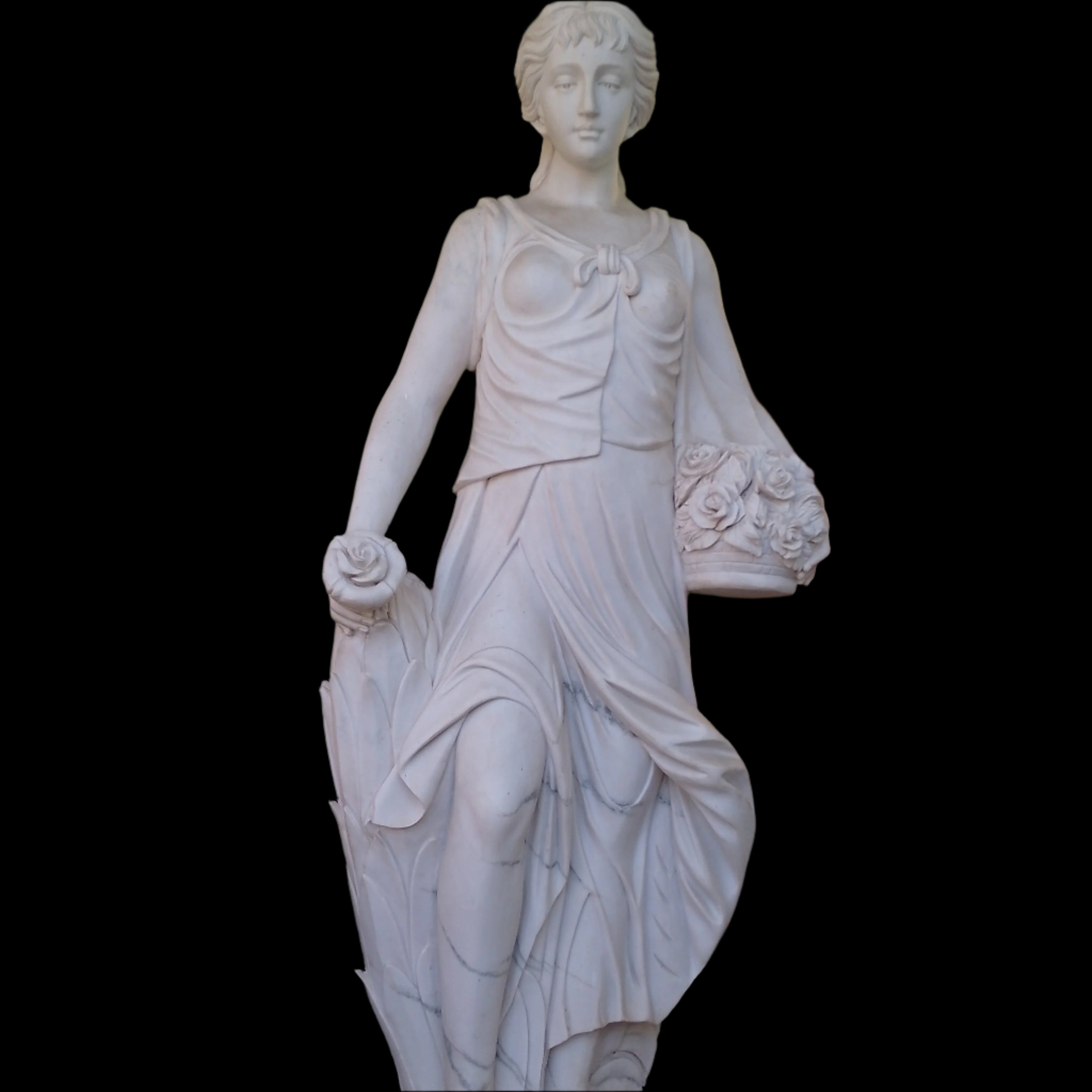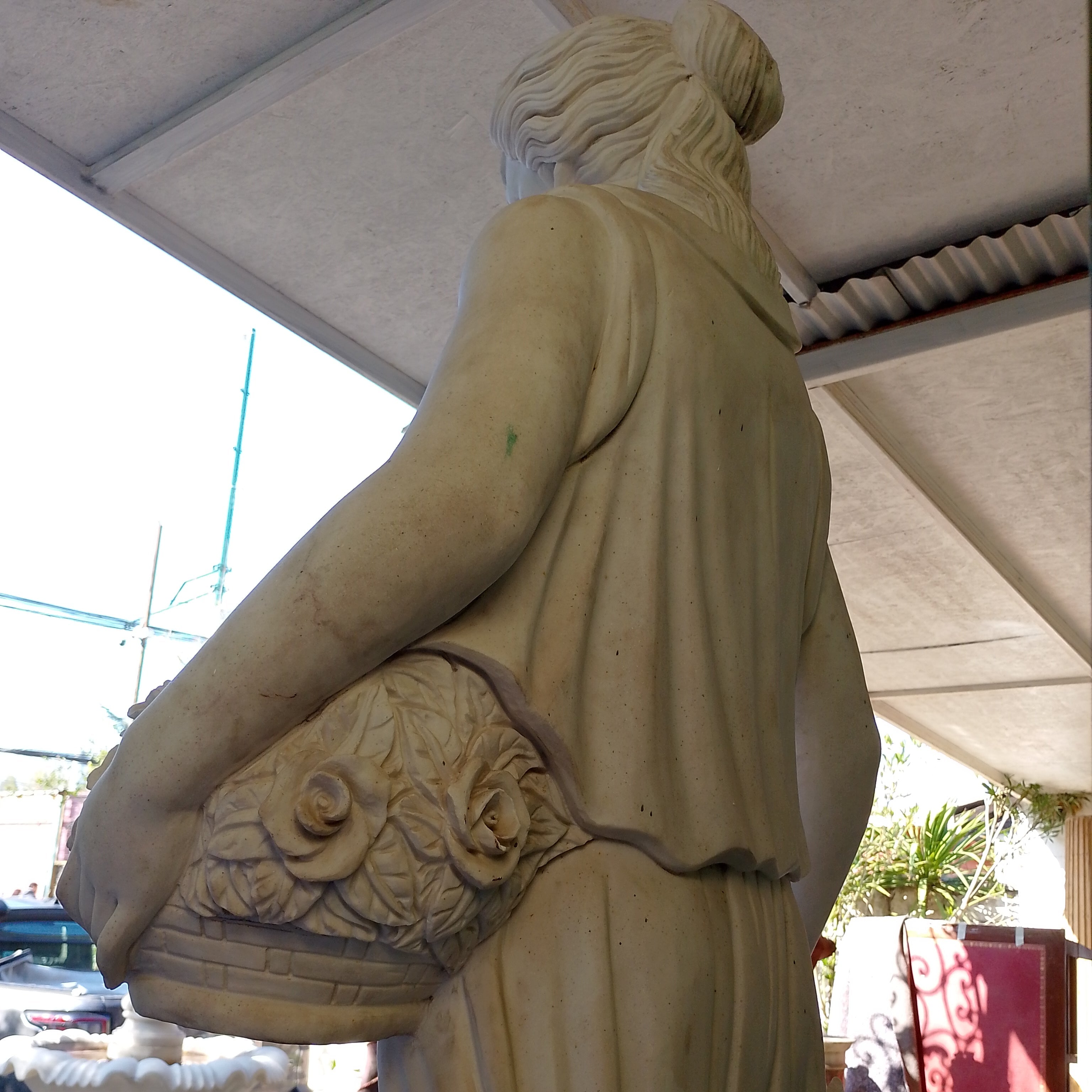 Bellísima escultura de mármol de una mujer con espigas y canasto de flores, representación clásica de la primavera.