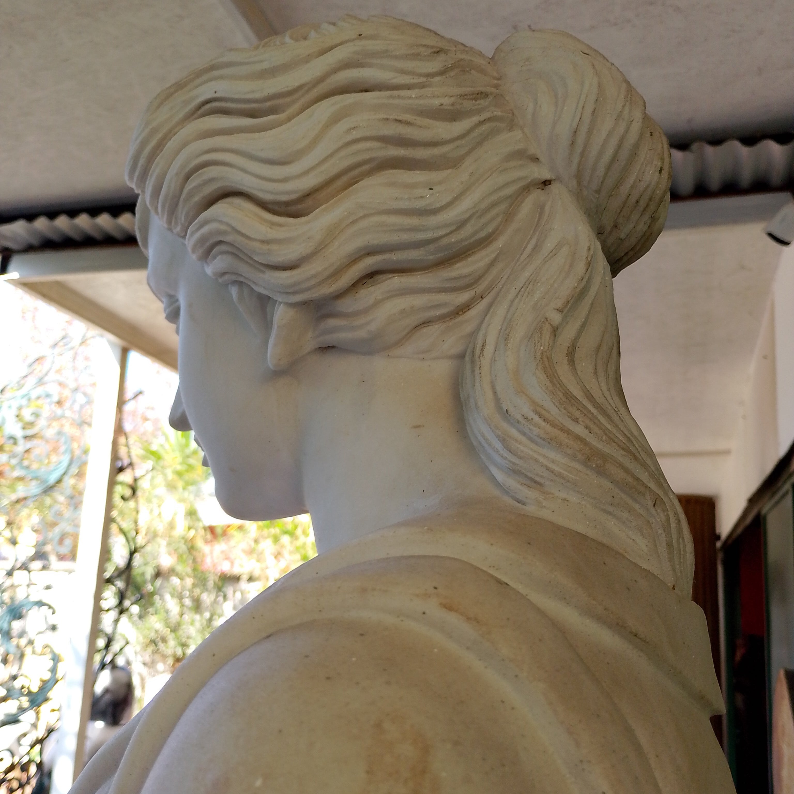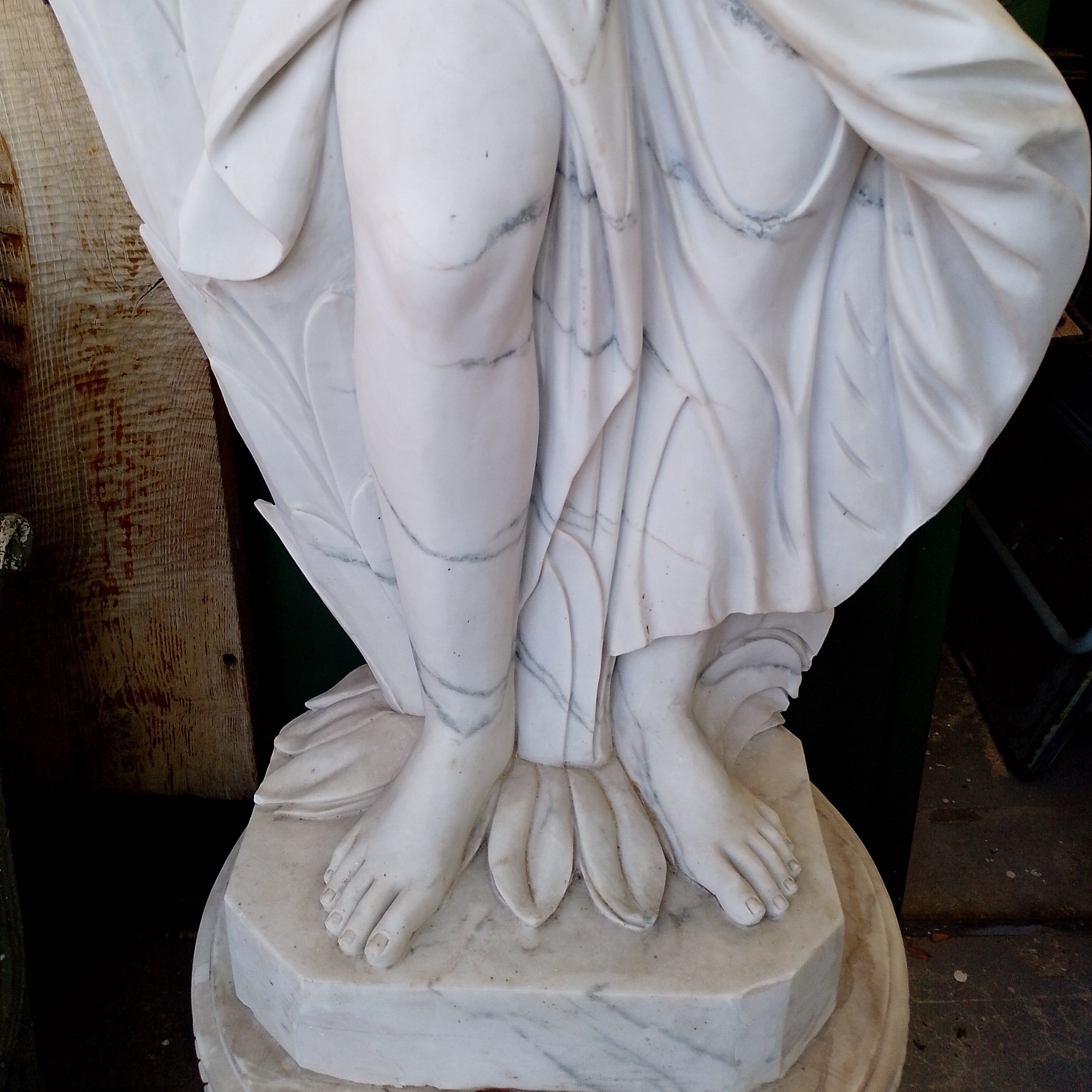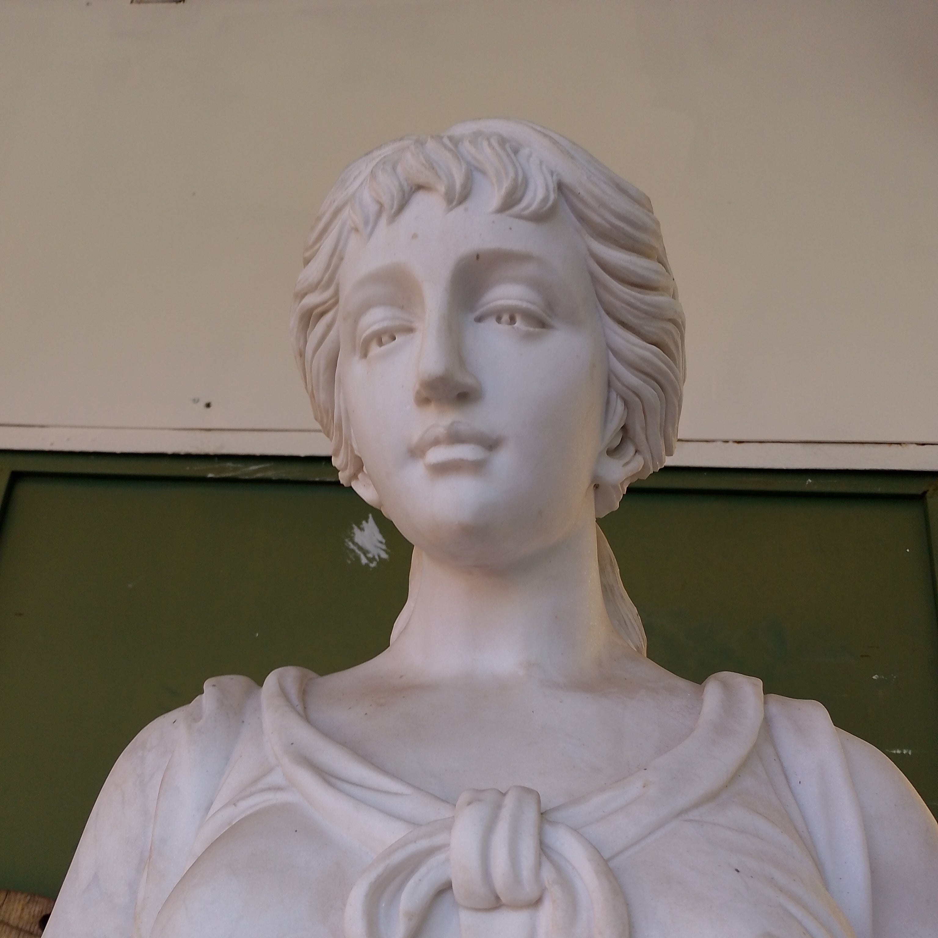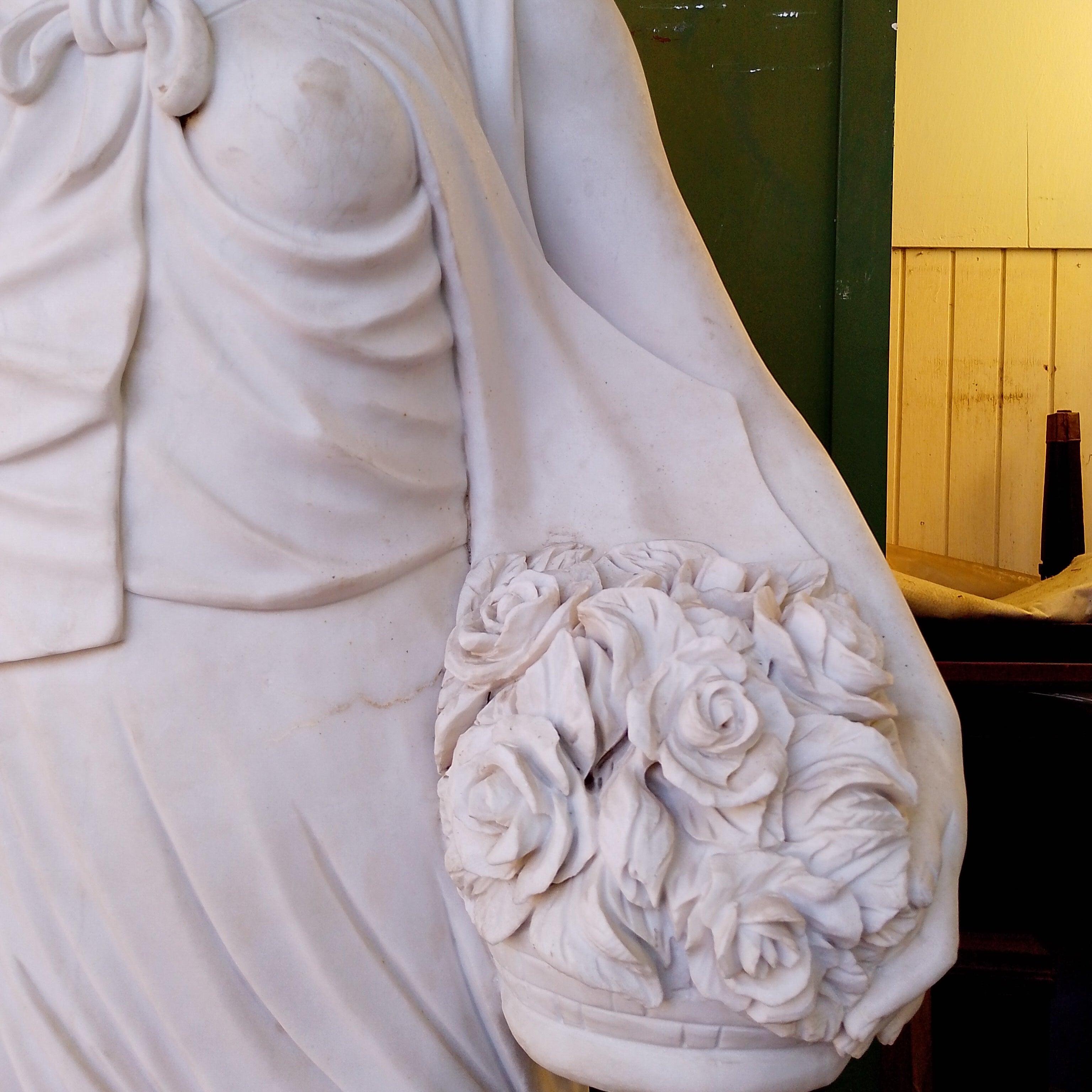Bellísima escultura de mármol de una mujer con espigas y canasto de flores, representación clásica de la primavera.
