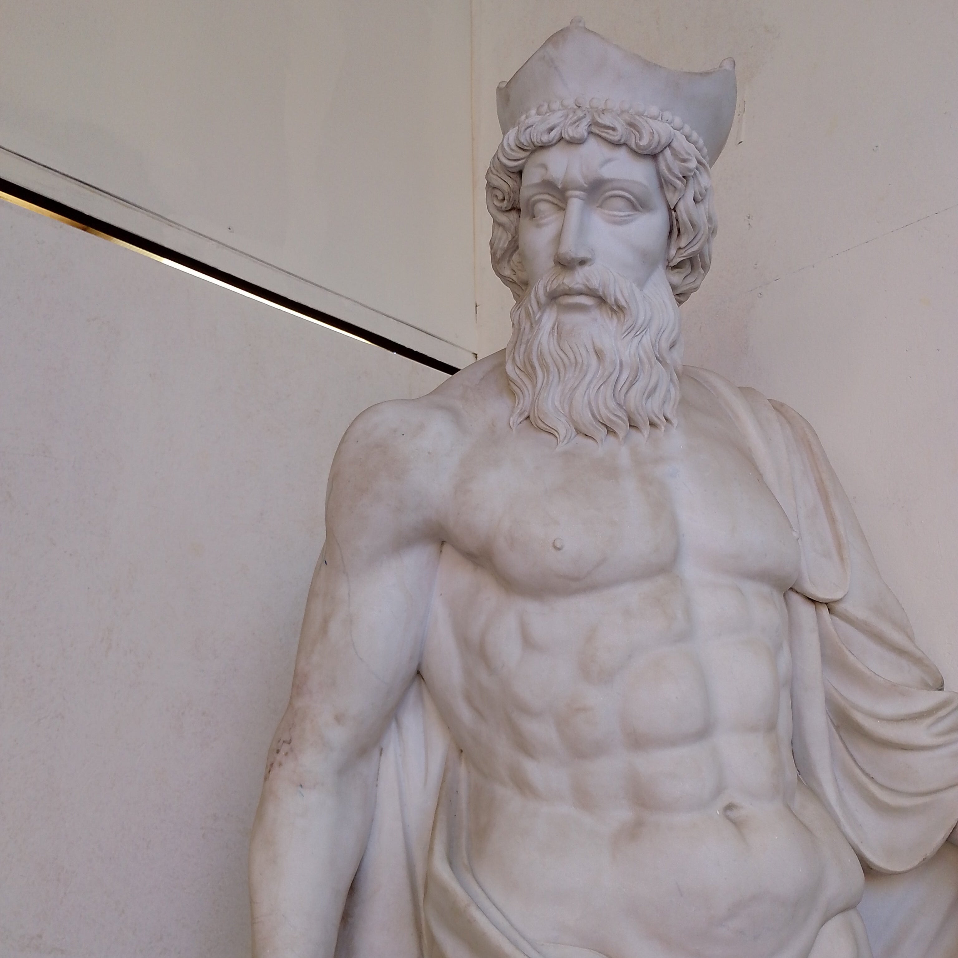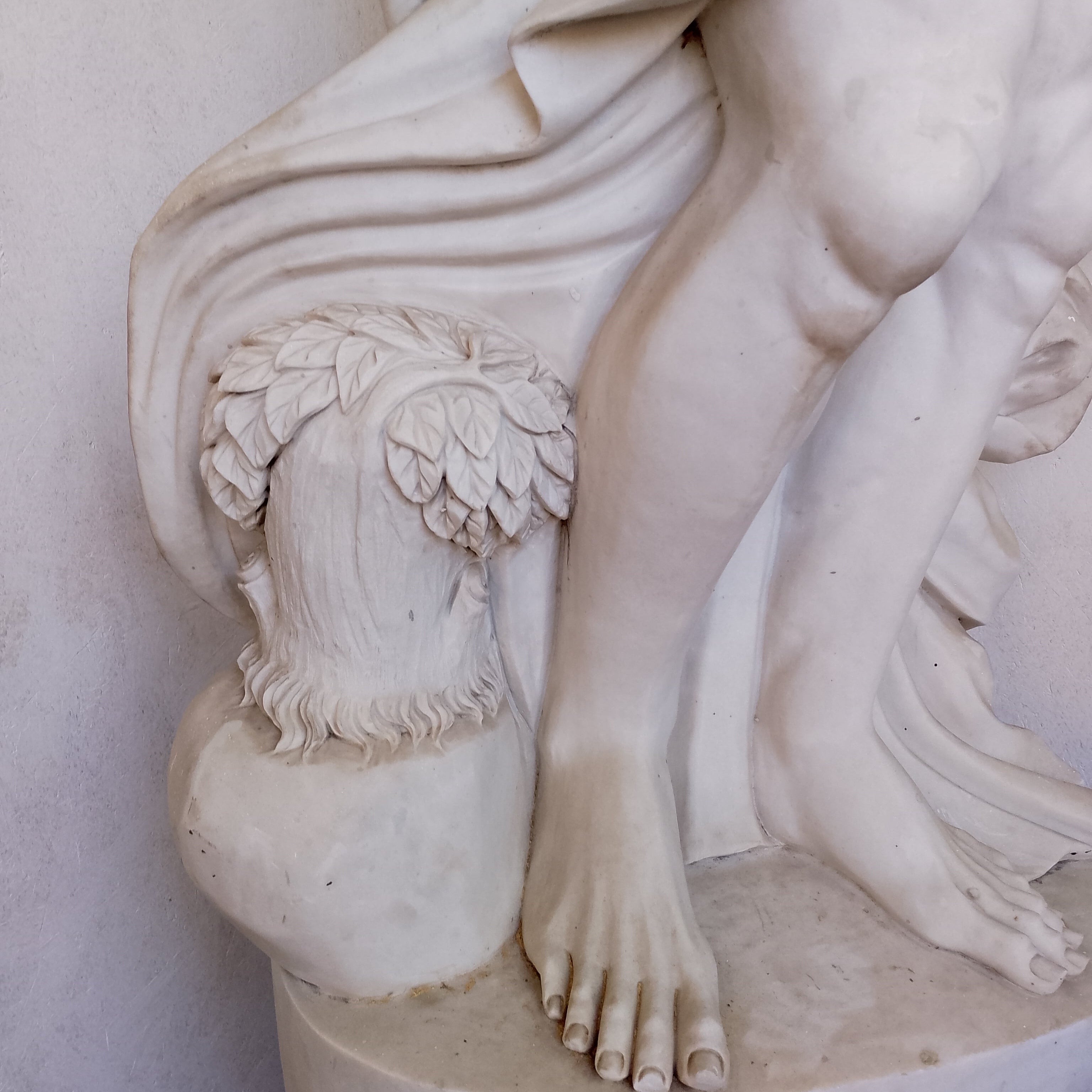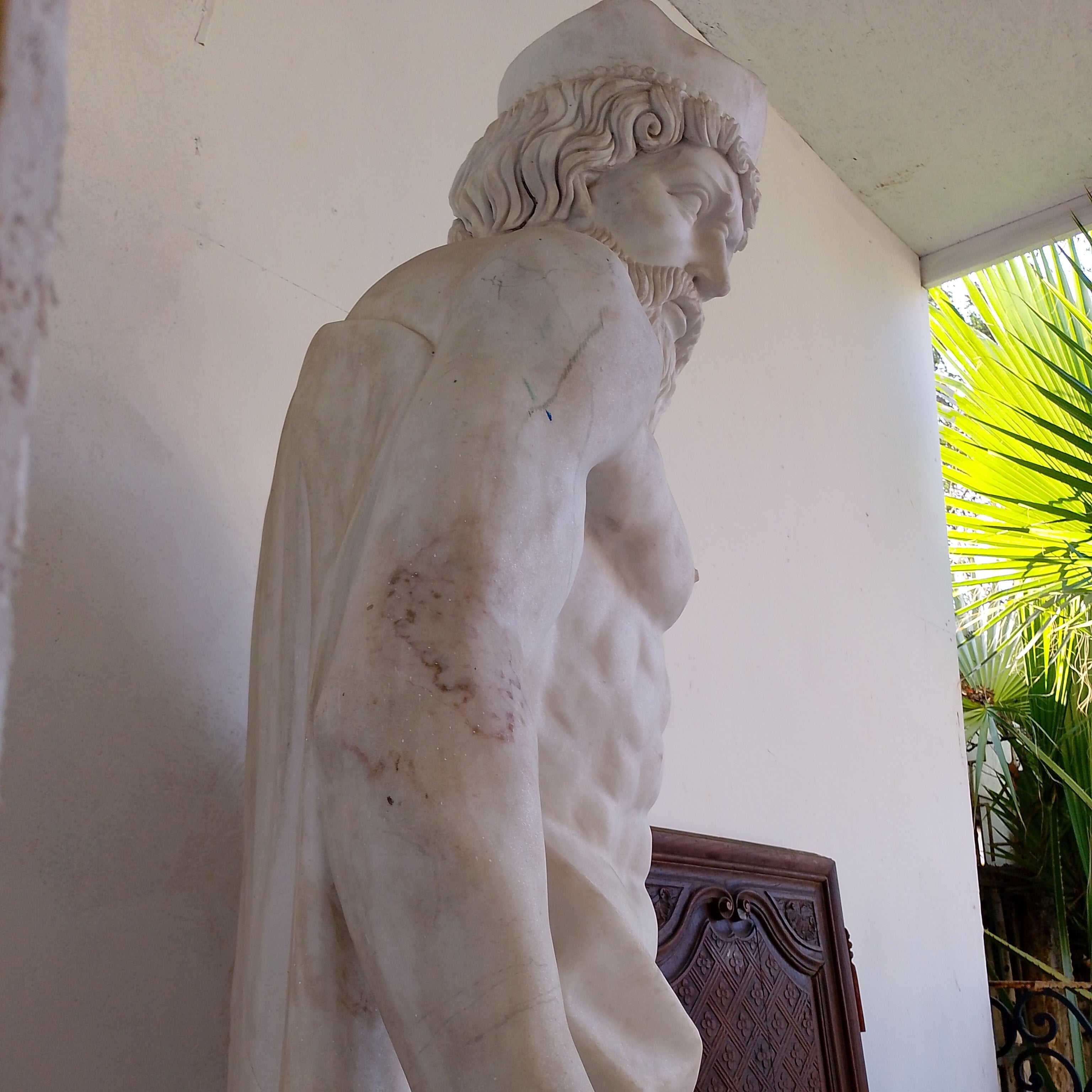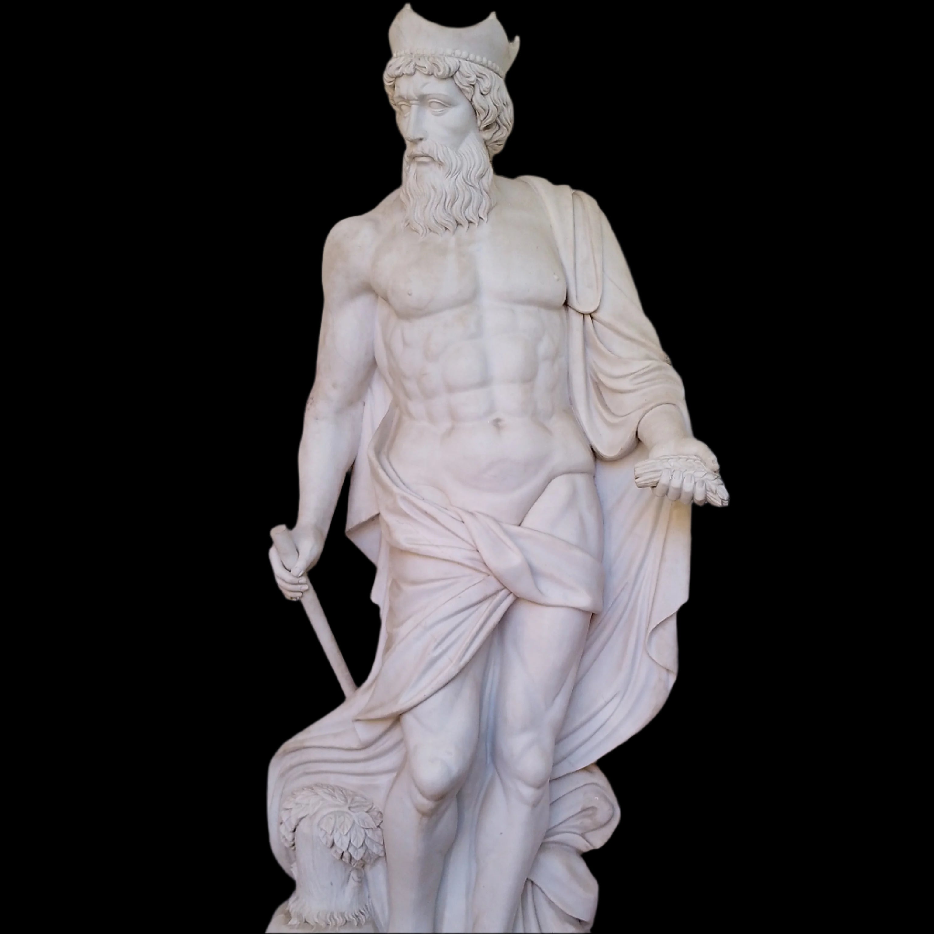 Bella e imponente escutura en mármol representando a Neptuno, dios romano de los mares.