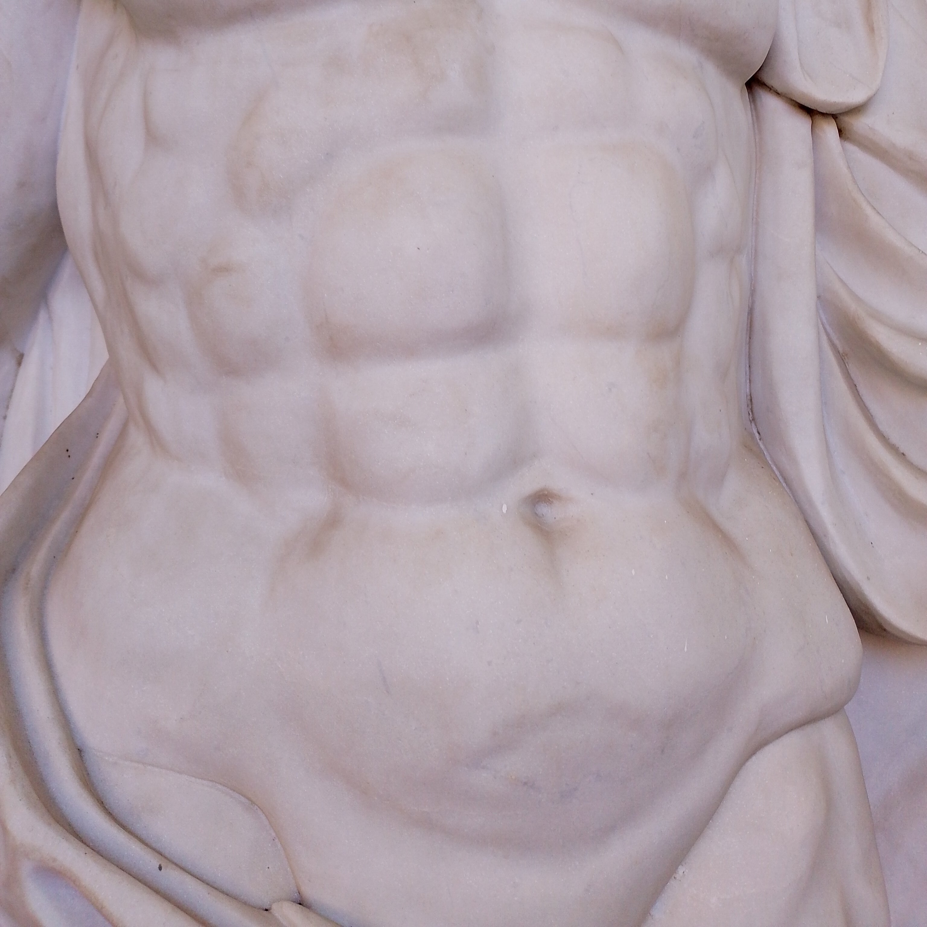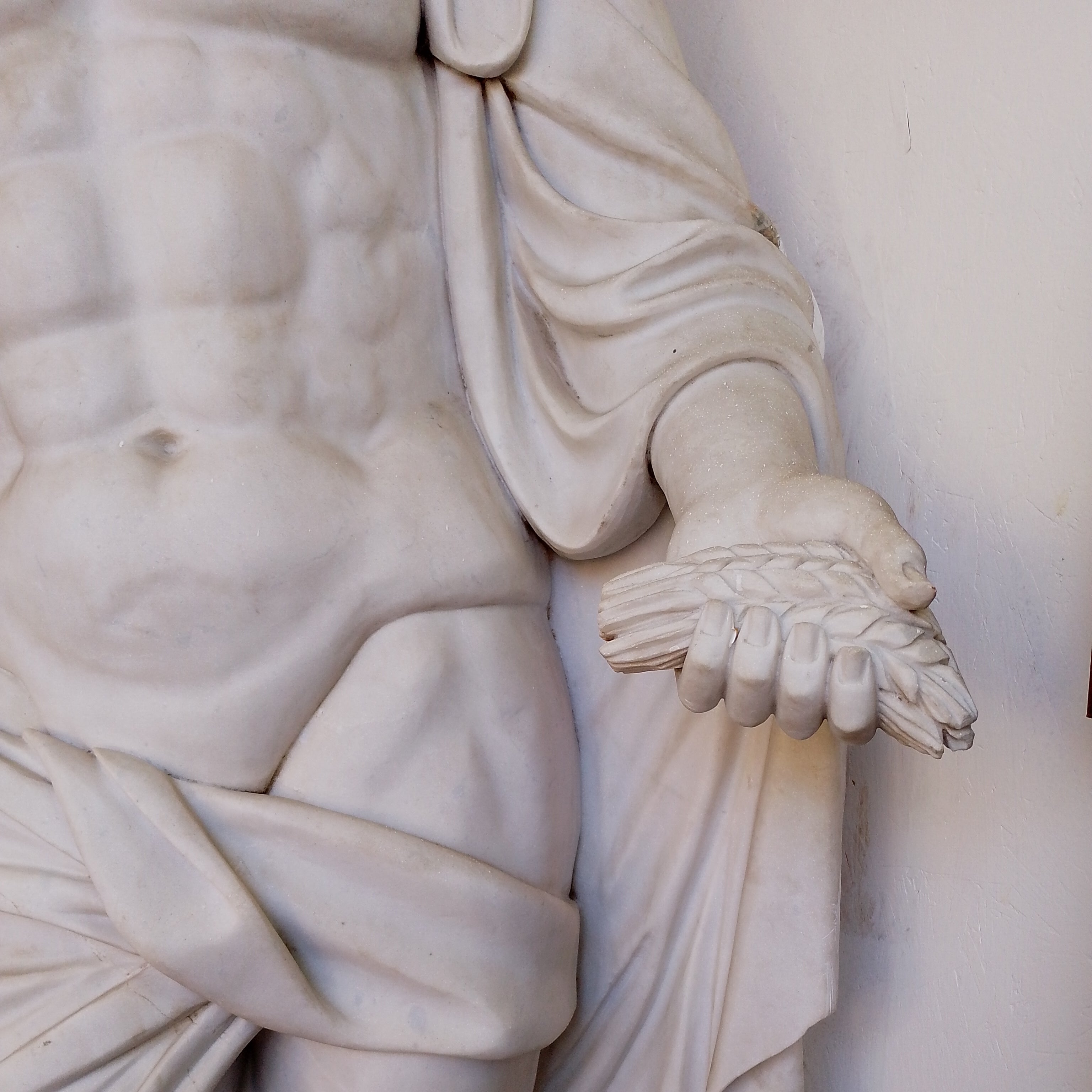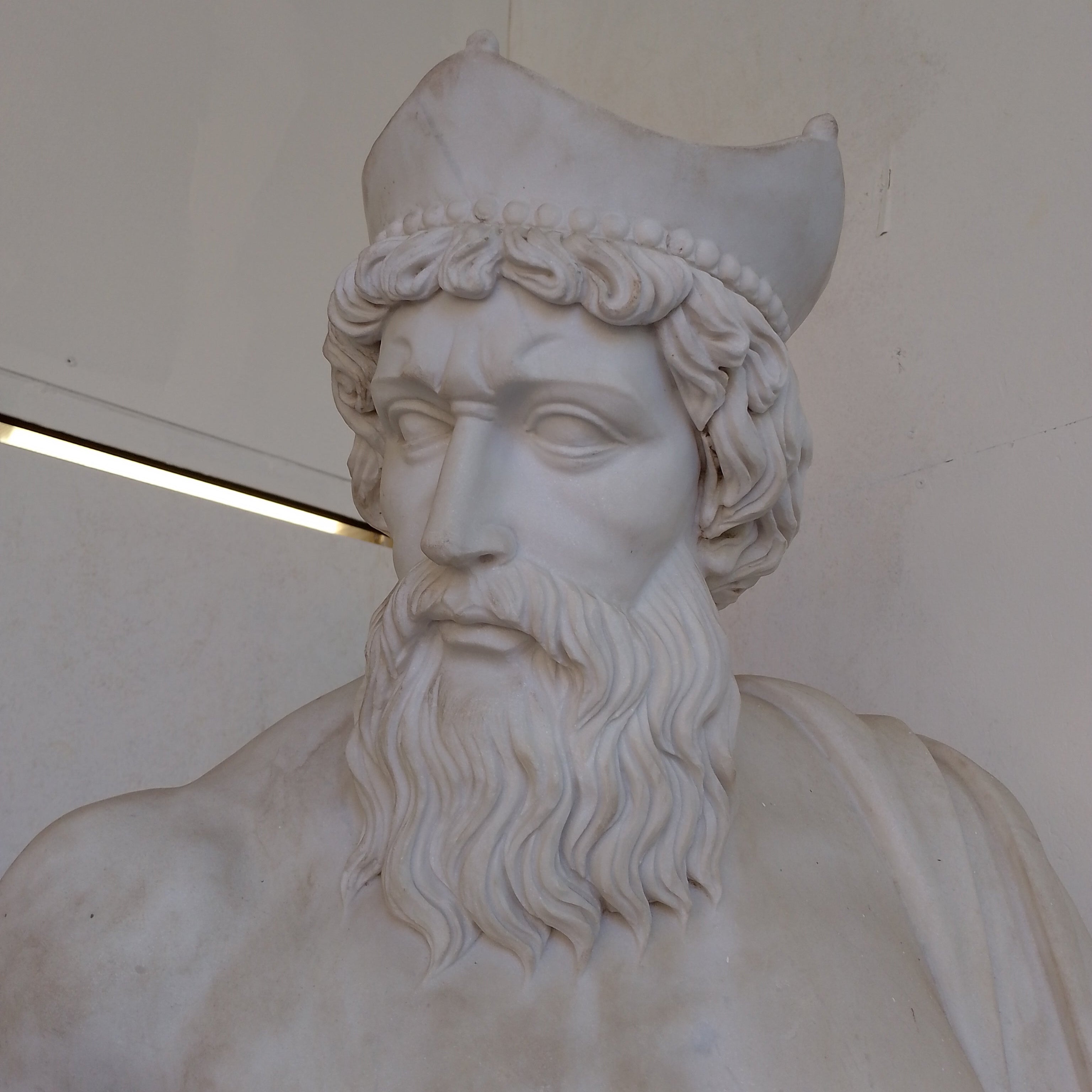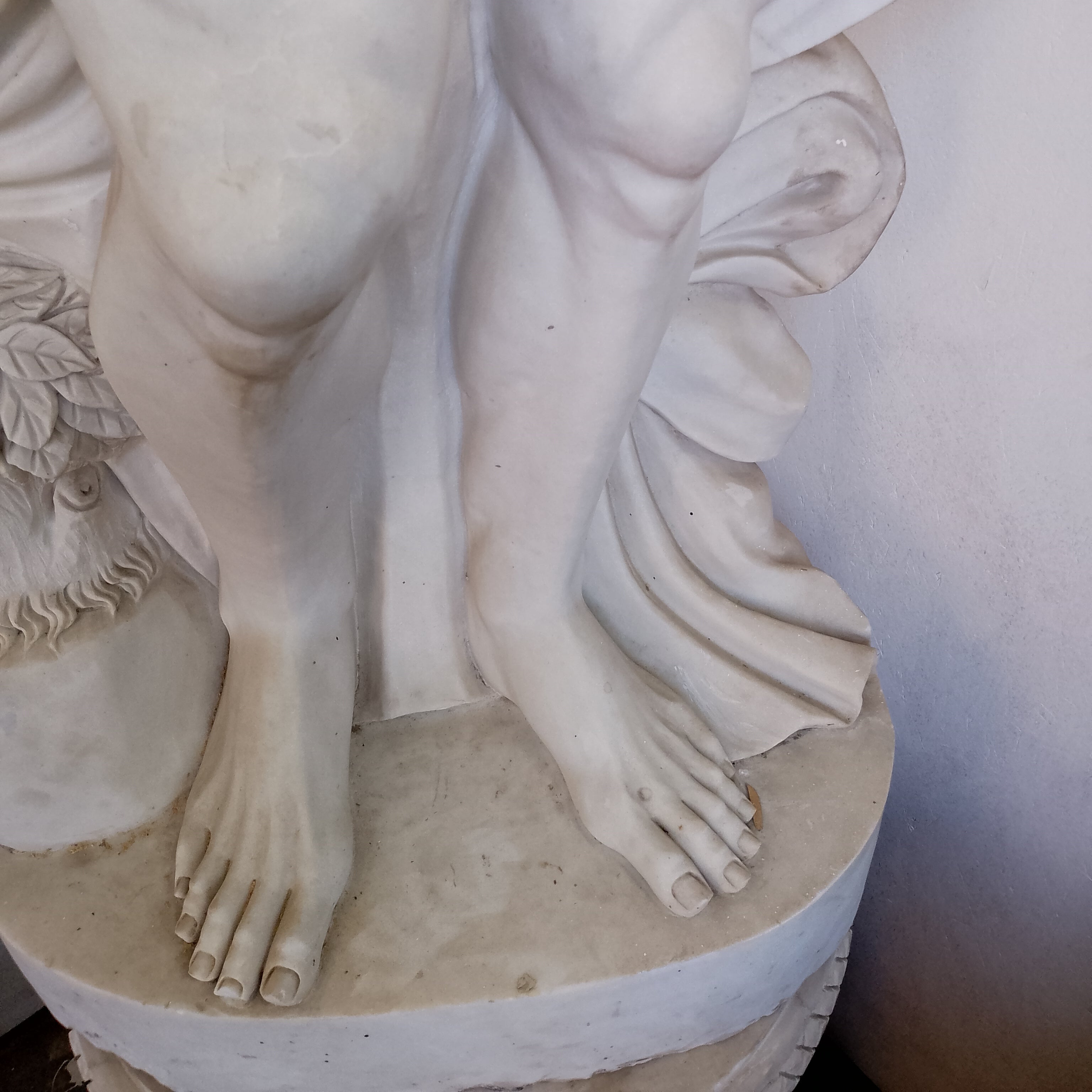 Bella e imponente escutura en mármol representando a Neptuno, dios romano de los mares.
