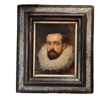 Óleo sobre tela del artista español Vicente Palmaroli retratando a un caballero con cuello isabelino. La obra está enmarcada en una bellísima madera tallada ay pintada a mano.
