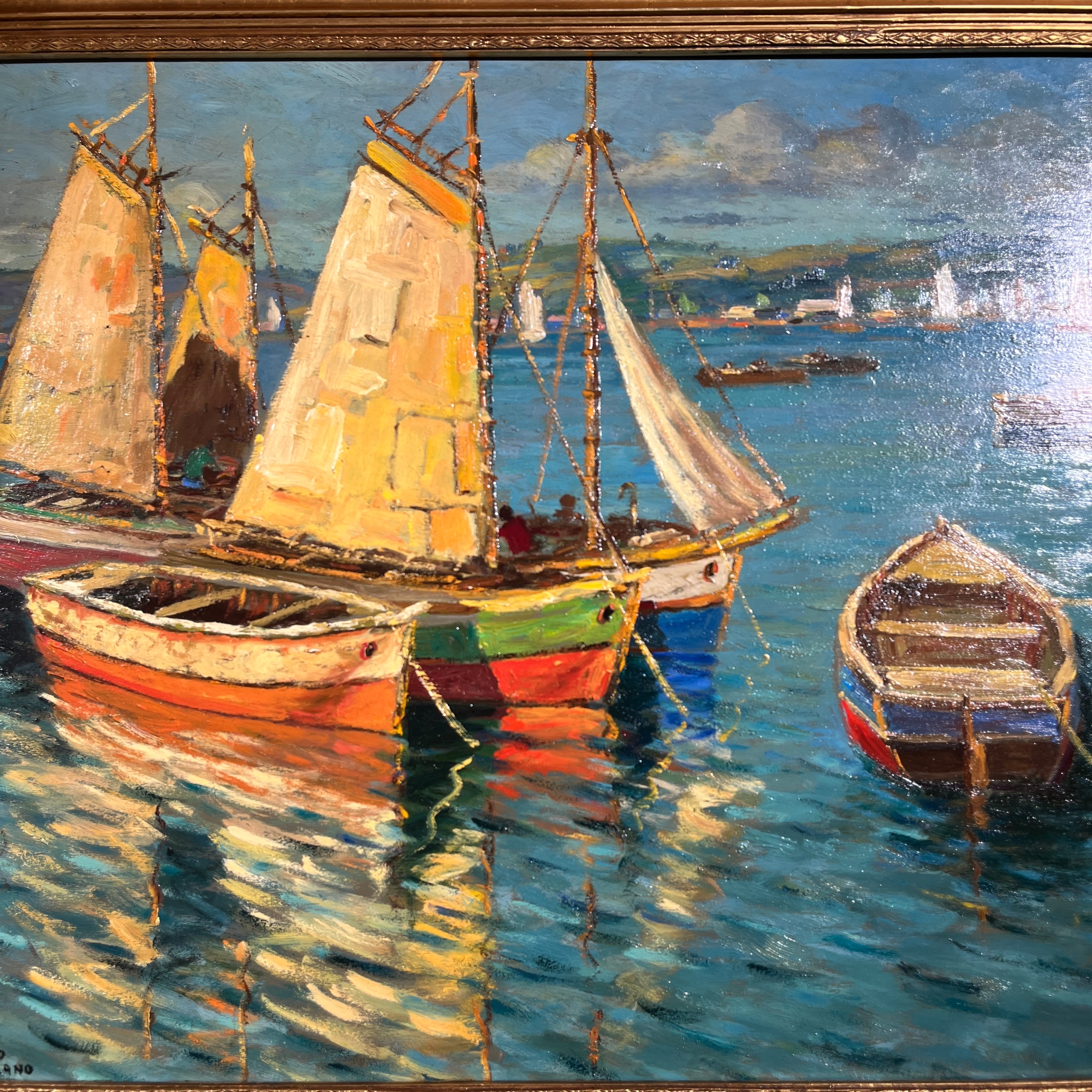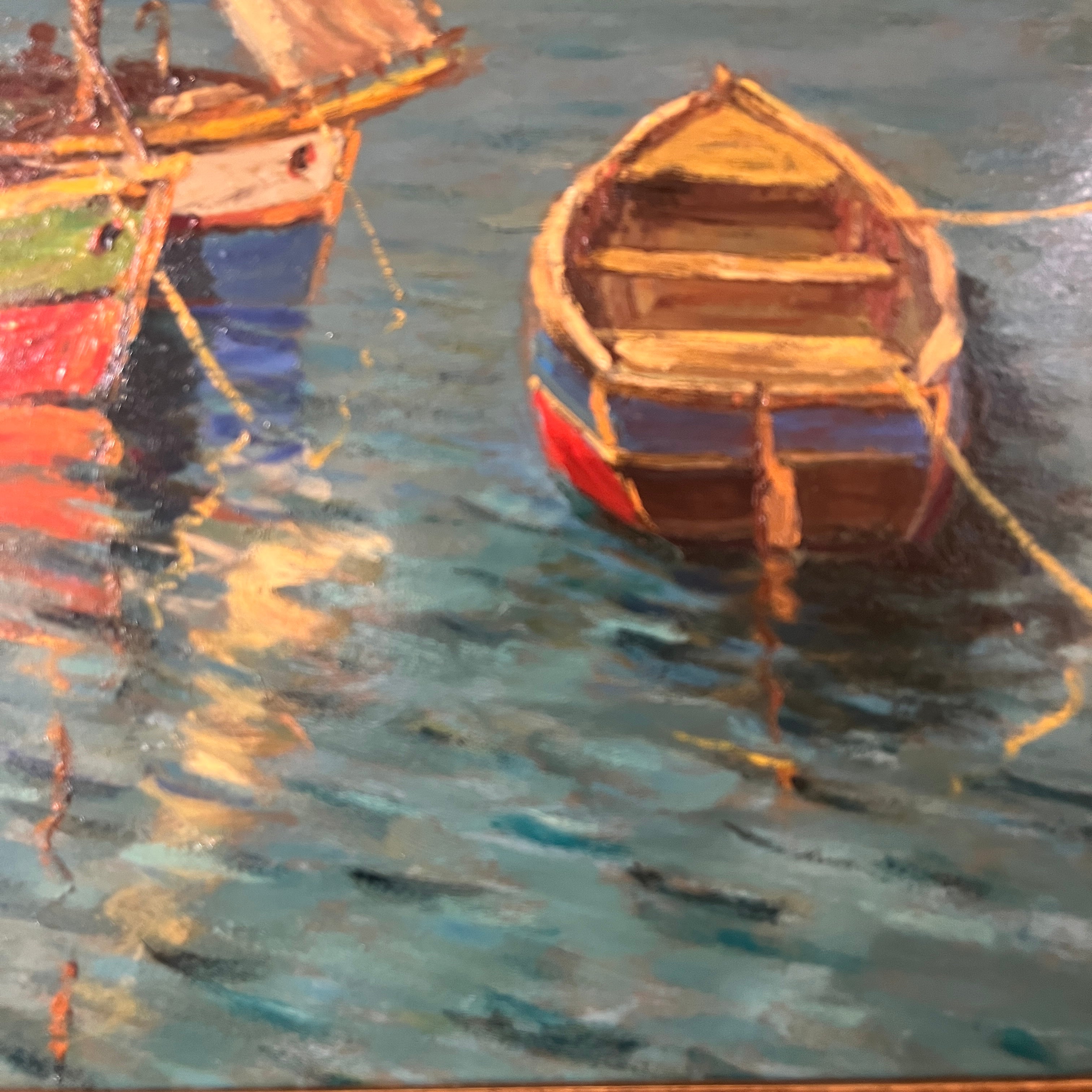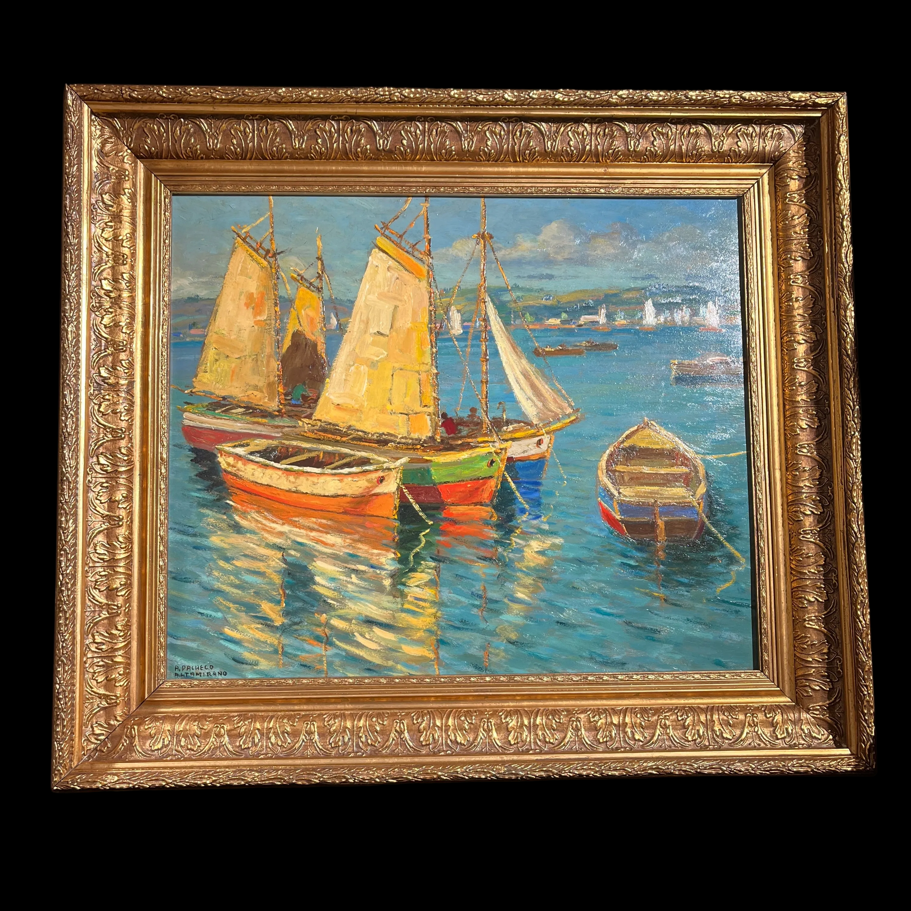 Hermoso óleo del talentoso pintor chileno Pacheco Altamirano (1905-1978) nos presenta tres veleros y dos botes aparcados en el mar, algunos con tripulantes y otros vacíos. En el horizonte se aprecia una ciudad. La obra destaca por sus colores y el característico trazo marcado de Altamirano.